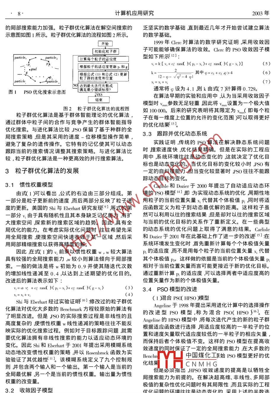 第12期周馳等粒子群優(yōu)化算法粒子群優(yōu)化算法*周馳,高海兵,高亮,章萬(wàn)國(guó)(華中科技大學(xué)機(jī)械科學(xué)與工程學(xué)院教育部智能制造開放實(shí)驗(yàn)室,湖北武漢430074 )摘要:系統(tǒng)地介紹了粒子群優(yōu)化算法歸納了其發(fā)展過(guò)程中的各種改進(jìn)如慣性權(quán)重、收斂因子、跟蹤并優(yōu)化動(dòng)態(tài)目標(biāo)等模型。闡述了算法在目標(biāo)函數(shù)優(yōu)化、神經(jīng)網(wǎng)絡(luò)訓(xùn)練、模糊控制系統(tǒng)等基本領(lǐng)域的應(yīng)用并給出其在工程領(lǐng)域的應(yīng)用進(jìn)展最后對(duì)粒子群優(yōu)化算法的研究和應(yīng)用進(jìn)行了總結(jié)和展望指出其在計(jì)算機(jī)輔助工藝規(guī)劃領(lǐng)域的應(yīng)用前景。關(guān)鍵詞:粒子群優(yōu)化算法;遺傳算法;神經(jīng)網(wǎng)絡(luò);模糊系統(tǒng)中圖法分類號(hào): TP301.6文獻(xiàn)標(biāo)識(shí)碼: A文章編號(hào): 1001-3695 2003 )12-0007-05Particle Swarm Optimizatior( PSO ) AlgorithmZHOU Chi , GAO Hai-bing, GAO Liang , ZHANG Wan- guo( Laboratory of Inelligent Manfacuring ,School of Mechanical Science & Engineering ,Huazhong Uninersity of Science & Technology ,Wuhan Hubei430074 ,China )Abstract: A new optimizer-Particle Swarm Optimization( PSO ) is introduced. Developments in the PSO such as inertia weight ,constriction factor ,tracking and optimizing dynamic systems etc are reviewed. Then ,its applications in some basic areas :functionoptimization ,neural network training and fuzy control system are summarized. Fllowing this ,several important engineering applicationexamples are given. Fnally ,the research and application of PSO in the future are pointed out and its potential application in computeraided process planning is proposed.Key words : Particle Swam Optimization Algorithm ; Genetic Algorithm ; Neural Network ; Fuzzy Control研究并解釋復(fù)雜的社會(huì)行為后來(lái)發(fā)現(xiàn)粒子群優(yōu)化算法可以用于復(fù)雜優(yōu)化問(wèn)題的求解4]1引言2粒子群優(yōu)化算法介紹當(dāng)前通過(guò)模擬生物群體的行為來(lái)解決計(jì)算問(wèn)題已經(jīng)成為新的研究熱點(diǎn),形成了以群體智能(Swarm如上所述粒子群優(yōu)化算法的提出受鳥群覓食行為Inelligence )為核心的理論體系并已在- -些實(shí)際應(yīng)用領(lǐng)的啟發(fā)并用于解決優(yōu)化問(wèn)題5]。算法采用速度- -位置域取得突破性進(jìn)展[。通過(guò)對(duì)生物群體的觀察和研究搜索模型。每個(gè)粒子代表解空間的一一個(gè)候選解解的優(yōu)發(fā)現(xiàn)生物群體內(nèi)個(gè)體間的合作與競(jìng)爭(zhēng)等復(fù)雜性行為產(chǎn)劣程度由適應(yīng)函數(shù)決定。速度v;=(V1 ,V以 ... Nu )決定生的群體智能往往能對(duì)某些特定的問(wèn)題提供高效的解粒子在搜索空間單位迭代次數(shù)的位移。其中適應(yīng)函數(shù)決方法[2]。例如動(dòng)物行為學(xué)家曾仔細(xì)觀察過(guò)螞蟻的覓根據(jù)優(yōu)化目標(biāo)定義。PSO 隨機(jī)初始化為一群粒子其中食行為發(fā)現(xiàn)不管初始時(shí)同--蟻巢的螞蟻從蟻巢到食物.第i個(gè)粒子在d維解空間的位置表示為x;=(xnxX2r的覓食路徑是如何的隨機(jī)隨著覓食的螞蟻往返次數(shù)的x)每一次迭代粒子通過(guò)動(dòng)態(tài)跟蹤兩個(gè)極值來(lái)更新增加蟻群總能找到最短的覓食路徑。著名的蟻群算法其速度和位置。第一個(gè)是粒子從初始到當(dāng)前迭代次數(shù)正是受蟻群覓食行為的啟發(fā)而產(chǎn)生的。實(shí)踐證明蟻群搜索產(chǎn)生的最優(yōu)解:個(gè)體極值p:=(p:1p..)第二算法在組合優(yōu)化、車間作業(yè)調(diào)度、網(wǎng)絡(luò)路由選擇等領(lǐng)域個(gè)是粒子種群目前的最優(yōu)解:全局極值g=(g1心... ,g)粒子根據(jù)以下公式來(lái)更新其速度和位置[6]:已經(jīng)取得成功的應(yīng)用3。美國(guó)的Kennedy和Eberhar受鳥群覓食行為的啟發(fā),中國(guó)煤化工于1995 年提出了粒子群優(yōu)化算法( Particle Swarm其中」YHCNMH G區(qū)間的隨機(jī)數(shù)。一般取Optimization ,PSO)最初的設(shè)想是仿真簡(jiǎn)單的社會(huì)系統(tǒng),學(xué)習(xí)因子C=c2=2'。粒千在解空間內(nèi)不斷跟蹤個(gè)體極值與全局極值進(jìn)行搜索,直到達(dá)到規(guī)定的迭代次數(shù)或收稿日期: 2002-12-22 ;修返日期: 2003-09-23滿足規(guī)定的誤差標(biāo)準(zhǔn)為止。粒子在每一維飛行的速度基金項(xiàng)目:國(guó)家863/CIMS主題資助項(xiàng)目( 2002AA413720 );不能超過(guò)算法設(shè)定的最大速度Vimuro設(shè)置較大的Vme可國(guó)家863/CIMS主題資助項(xiàng)目( 2002A411710 )以保證粒子種群的全局搜索能力Vvm 較小則粒子種群.計(jì)算機(jī)應(yīng)用研究2003年的局部搜索能力加強(qiáng)。粒子群優(yōu)化算法在解空間搜索的乏堅(jiān)實(shí)的數(shù)學(xué)基礎(chǔ),直到最近幾年才開始嘗試建立算法示意圖如圖1所示。粒子群優(yōu)化算法的流程如圖2所示。的數(shù)學(xué)基礎(chǔ)。開始]1999年Clere對(duì)算法的數(shù)學(xué)研究證明采用收斂因[ 初始化粒子群子可能能夠確保算法的收斂。Clere的PSO收斂因子模)article I[計(jì)算每個(gè)粒子的適應(yīng)度型如下所示[2]:v;=k[v;+qi ranK( )(p-x)+cz rand( )(g-x;)]l根據(jù)粒子的適應(yīng)度更新p,和e根據(jù)公式(D)和公式(2)更新k=一其中φ=q+C2 xp>4(6)12-φ-√φ-4 φl(shuí)| 粒子群