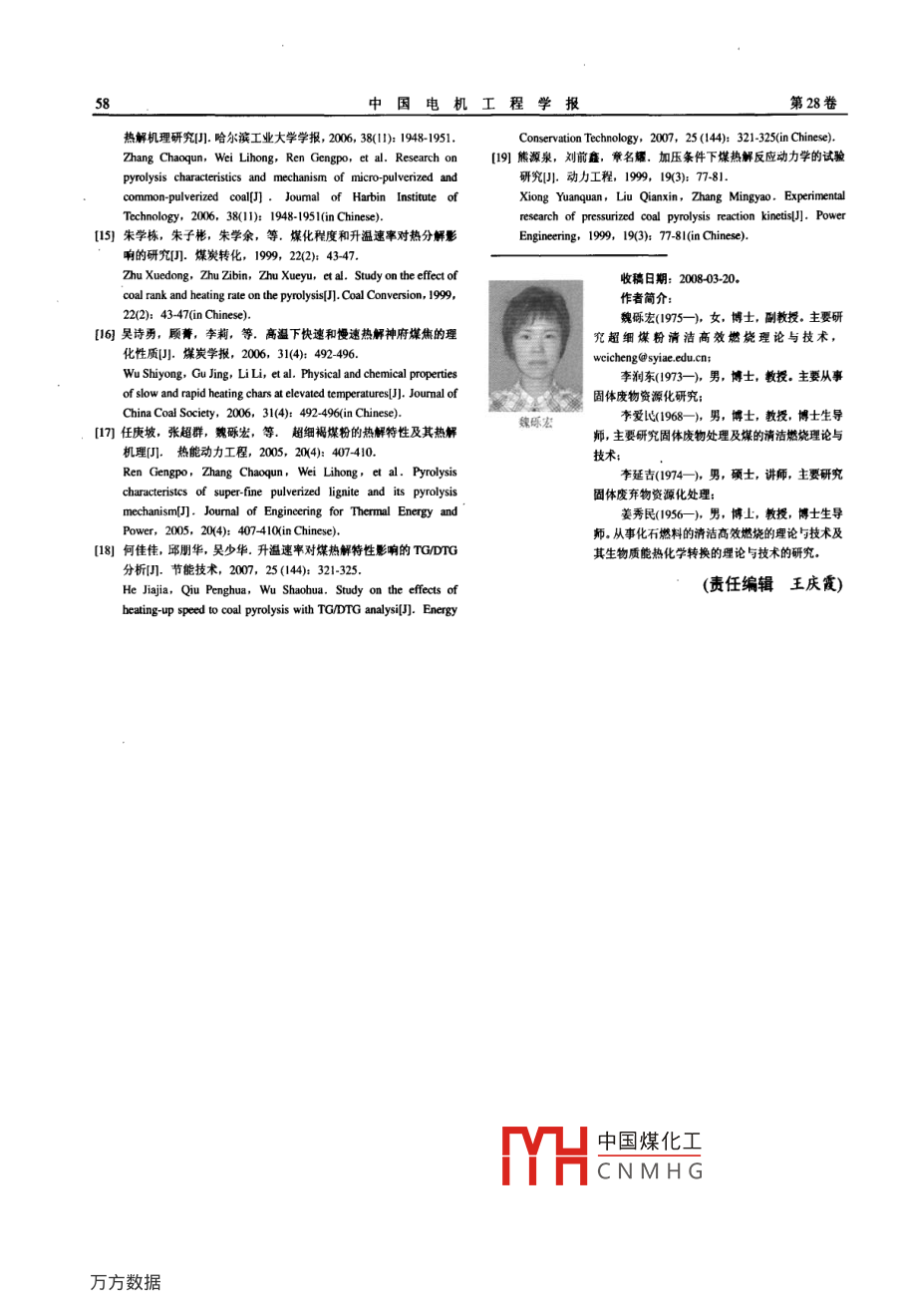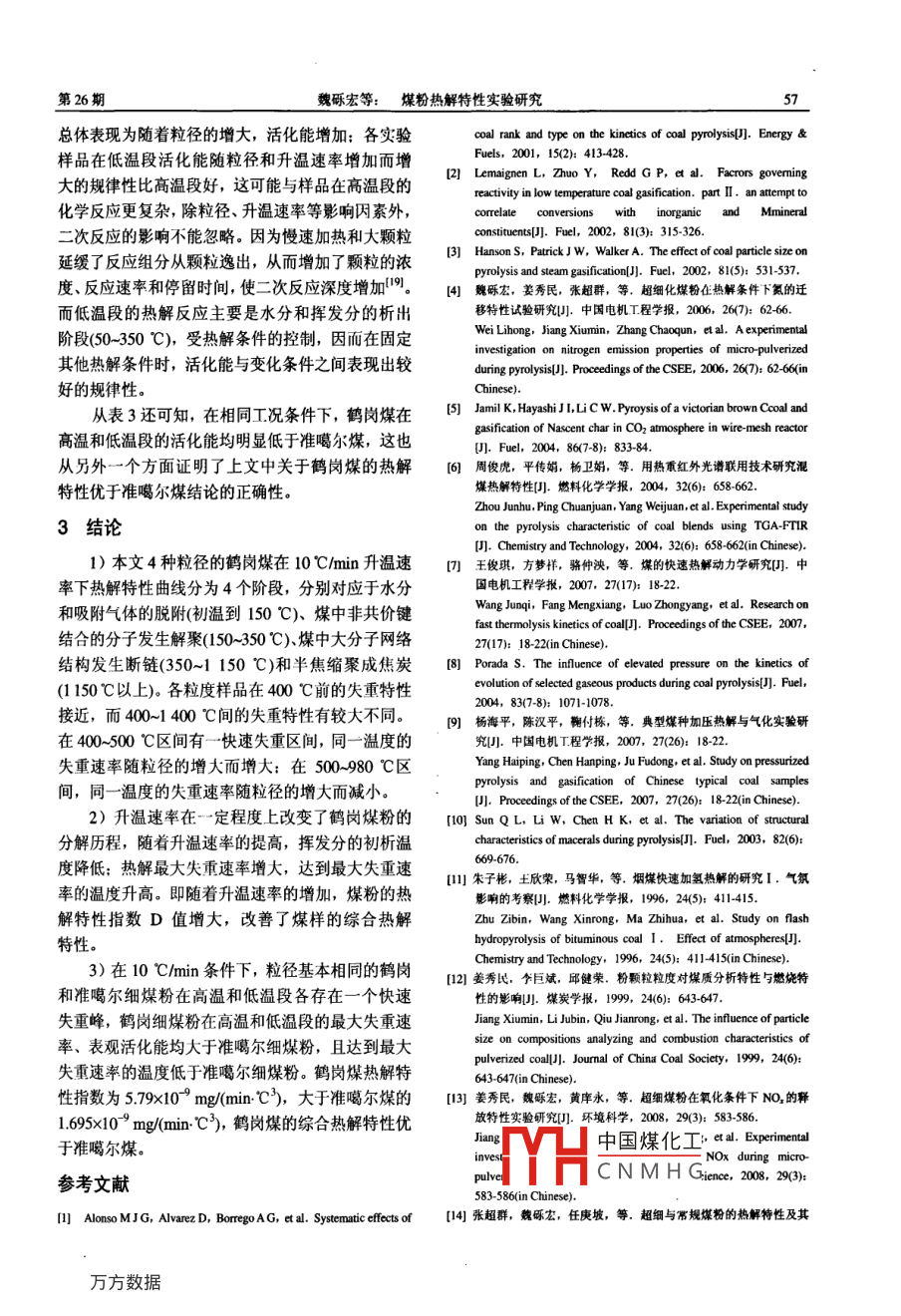 第28卷第26中國(guó)電機(jī)工程學(xué)報(bào)vL28No.26Sep.15,20082008年9月15日Proceedings of the CSEE@2008 Chin. Soc. for Elec Eng. 53文章編號(hào):0258-8013(2008)260053-06中圖分類號(hào):TQ530文獻(xiàn)標(biāo)識(shí)碼:A學(xué)科分類號(hào):470-10煤粉熱解特性實(shí)驗(yàn)硏究魏礫宏!,李潤(rùn)東,李愛民1,李延吉1,姜秀民2(1.沈陽航空工業(yè)學(xué)院清潔能源與環(huán)境工程研究所,遼寧省沈陽市110034;2.上海交通大學(xué)機(jī)械與動(dòng)力工程學(xué)院,上海市閔行區(qū)200240Thermogravimetric Analysis on the Pyrolysis Characteristics of Pulverized CoalWEI Li-hong, LI Run-dong', LI Ai-min, LI Yan-ji, JIANG Xiu-min(1. Institute of Clean energy and Environmental Engineering, Shenyang Institute of Aeronautical Engineering,Shenyang 110034, Liaoning Province China; 2. School of Mechanical Engineering, Shanghai Jiaotong UniversityMinhang District, Shanghai 200240, China)ABSTRACT: The pyrolysis characteristics of different particle解最大失重速率增大,達(dá)到最大失重速率的溫度升高,煤粉size Hegang(HG) and Zhungaer(zGE) coal were investigated的熱解特性指數(shù)D值增大,即升溫速率的增加有利于細(xì)煤by non-isothermal thermogravimetry in high purity argon.The粉的熱解。此外,在10℃/min加熱條件下,對(duì)比了平均粒results show that there are four stages( dehydration,, holding,徑基木相同的鶴崗煤和準(zhǔn)噶爾煤的熱解特性,發(fā)現(xiàn)揮發(fā)分含rapid weight-loss and slow weight-loss)during the量接近,而灰分含量較高的鶴崗煤的熱解特性明顯優(yōu)于準(zhǔn)噶non-isothermal weight loss process of different granularity coal /Khpowders, the differential thermo- gravimetry (DTG)curve has關(guān)鍵詞:煤粉;熱解特性;顆粒粒度;熱分析two weight loss peaks when temperatures lower than 1 400 CThere was no differences in the weight-loss characteristics of 0 3Ivarious samples at the temperature below 400C. For thepyrolysis characteristics of HG coal with rising heating-up rate煤的熱解作為煤燃燒過程中的一個(gè)重要的初the initial release temperature decreases, the maximum weight始過程,對(duì)煤粉著火有極大的影響,也影響到燃燒loss rate and pyrolysis index D increase. Therefore the的穩(wěn)定性及后期的燃盡問題。由于煤本身具有復(fù)雜heating-up rate increase is favorable to improving pyrolysis性、多樣性和不均一性,因此影響煤熱解的因素繁characteristics of pulverized coal. In addition, comparison多,如煤階田、礦物成分和含量、粒徑4、升溫between similar particle size HG and ZGF coal at 10 T/min速*、溫度67、停留時(shí)間、壓力9、煤的顯微ating rate shows that the pyrolytic characterstics o組分⑩、氣氛等.超細(xì)煤粉燃燒技術(shù)是目前一種with high ash and similar volatile is better than ZGE coal重要的有效控制NO排放的燃燒技術(shù)(在電站煤粉KEY WORDS: pulverized coal. pyrolysis characteristics;鍋爐燃燒方面,將超細(xì)化煤粉定義為20μm以下的particle size; thermogravimetric analysis煤粉12),美國(guó)2000年清潔煤技術(shù)項(xiàng)目中將超細(xì)煤摘要:利用熱天平,以商純氬氣為氣氛氣體,研究了細(xì)化鶴粉再燃作為降低燃煤NO2排放的主要技術(shù)之一。本崗煤和準(zhǔn)喝爾媒的熱解特性。實(shí)驗(yàn)結(jié)果表明,不同粒度的細(xì)文采用非等溫?zé)嶂胤治龇椒?研究了粒度、升溫速化和超細(xì)煤粉的熱失重過程可以分為4個(gè)階段,在1400℃率和煤種對(duì)細(xì)化和超細(xì)化煤粉的熱解特性的影響,之前熱失重微分曲線有2個(gè)失重峰。室溫400℃,各樣品的失重特性無明顯區(qū)別。400~980℃,粒度對(duì)煤粉失重速率由微分熱重曲線計(jì)算熱解反應(yīng)動(dòng)力學(xué)參數(shù)。間存在較好規(guī)律性升溫速率對(duì)鶴崗細(xì)煤粉熱解特性的影響1實(shí)驗(yàn)部分表現(xiàn)在,隨著升溫速率的提高,揮發(fā)分的初析溫度降低;熱11凵中國(guó)煤化工基金項(xiàng)目:國(guó)家高技術(shù)研究發(fā)展計(jì)劃基金項(xiàng)目(200AA527051);遼寧省教育廳A類計(jì)劃項(xiàng)日(2004D079)CNMHG(ZGE)煤,經(jīng)過碾The National High Technology Research and development of Chi磨,不進(jìn)行篩分制成細(xì)化和超細(xì)化煤粉,原煤的煤863 pros質(zhì)分析數(shù)據(jù)見表1。中國(guó)電機(jī)工程學(xué)報(bào)第28卷表1鶴崗煤、準(zhǔn)噶爾煤的工業(yè)分析與元素分析中大分子網(wǎng)絡(luò)結(jié)構(gòu)發(fā)生斷鏈(350~1150℃)和半焦Tab. 1 Ultimate and proximate analysis of testingcoal samples縮聚成焦炭(1150℃以上)由圖1和2的熱解曲線還可以看出,4種粒徑煤種元素分析/%工業(yè)分析/%的鶴崗煤粉在400℃之前的熱解特性曲線無明顯HG6825467808260487310420853253448151805區(qū)別,在400500℃區(qū)間有一快速失重區(qū)間,相同ZGE72543.3361.2181016439013.8633.3349.17364溫度下的失重速率隨粒徑的增大而增大,其順序注:根據(jù)a(C)+a(H3)+a(Nd)+a(O)+S)+以A)+a(Md)=100%計(jì)算得到為:562μm>23.3m>35.9μm>7,0μm。在5001.2熱重分析980℃區(qū)間,失重速率與粒徑的關(guān)系與前者相反,本實(shí)驗(yàn)是在囗本島津公司的60H型熱重差熱相同溫度下的失重速率隨粒徑的增大而減小,其順同時(shí)分析儀上進(jìn)行。采用5、10、20、30℃/min升序?yàn)?7.0mx359m>233mx562m。980℃溫速率,用氣(99作為氣氛氣體,氣體流量以后,70、359和562m粒徑的煤樣也較好規(guī)律:50 mU/min。試樣用量約8mg,用高純氬99在980-1200℃之間,同一溫度下的失重速率隨著氣吹掃05h以除去爐體內(nèi)