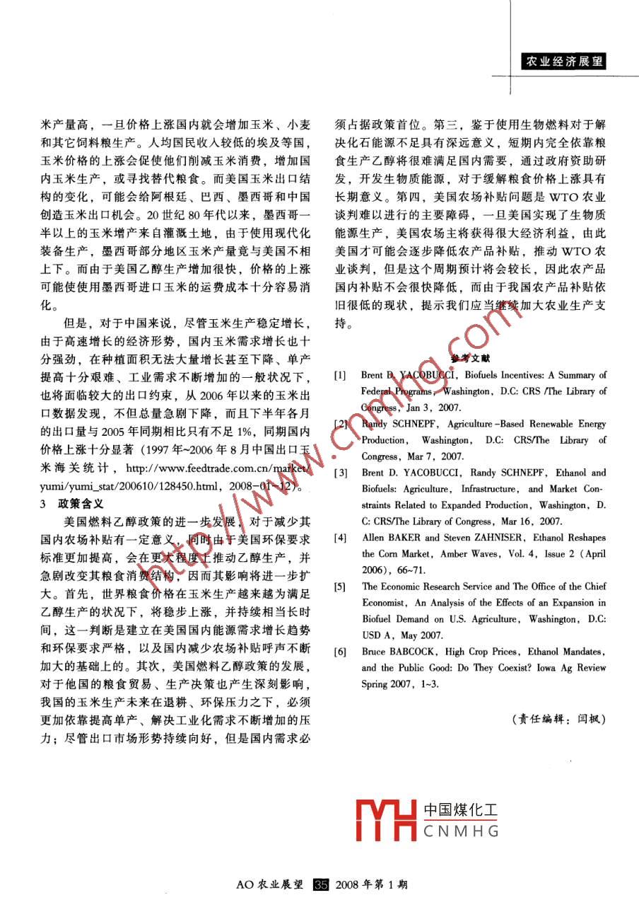 農(nóng)業(yè)經(jīng)濟(jì)展望美國燃料乙醇產(chǎn)業(yè):支持政策、糧食消費(fèi)結(jié)構(gòu)變化及其影響李超民劉芳(上海財(cái)經(jīng)大學(xué)上海200433)摘要:研究發(fā)現(xiàn),美國燃料乙醇政策不斷發(fā)展,造成糧食消費(fèi)結(jié)構(gòu)深刻變化,并影響到世界經(jīng)濟(jì)。作者認(rèn)為界糧食價(jià)格將穩(wěn)步上漲,對于糧食貿(mào)易、生產(chǎn)決策也產(chǎn)生深刻影響,我國必須更加依靠提高單產(chǎn)滿足國內(nèi)需求,農(nóng)業(yè)政策應(yīng)當(dāng)資助研發(fā)生物質(zhì)能源,緩解糧食價(jià)格上漲,還應(yīng)當(dāng)繼續(xù)加大農(nóng)業(yè)生產(chǎn)支持關(guān)鍵詞:燃料替代;經(jīng)濟(jì)穩(wěn)定;然料乙醇;政策;經(jīng)濟(jì)后果能源安全是世界各國關(guān)心的重要政治經(jīng)濟(jì)問題,加侖(1323億L),相當(dāng)于當(dāng)年美國機(jī)動油年消耗量燃料乙醇作為理想的替代能源當(dāng)前在美國正在飛速的15%,遠(yuǎn)高于《2005年能源政策法》(109-58公生產(chǎn)。但是,隨著美國燃料乙醇產(chǎn)量增加,用于燃法)設(shè)定的2012年生產(chǎn)替代燃料75億加侖(283.5料乙醇生產(chǎn)的玉米消費(fèi)量不斷擴(kuò)大,導(dǎo)致玉米消費(fèi)億L)的目標(biāo)。美國燃料乙醇政策已經(jīng)成為新的世界結(jié)構(gòu)開始發(fā)生較大變化,出口比重不斷減少,造成經(jīng)濟(jì)波動的根源。世界市場供給量大幅度下降,由此引起糧食價(jià)格產(chǎn)美國燃料乙醇主要由玉米生產(chǎn),在中西部的產(chǎn)生較大波動,并帶來一系列后果。鑒于燃料乙醇對量和消耗量最大,當(dāng)?shù)厥敲绹衩讕?用玉米生產(chǎn)解決環(huán)保冋題有較大意義,未來美國燃料乙醇產(chǎn)量乙醇成本低廉。1990年代以來,基于環(huán)保需求,美將剛性加大,對世界經(jīng)濟(jì)的影響將加劇,短期內(nèi)糧國各州相繼立法禁止汽油添加MBTE,造成對乙醇食價(jià)格問題和經(jīng)濟(jì)穩(wěn)定問題將更加突出,我們有必汽油的依賴陡然加大,玉米市場就此升溫。當(dāng)前世要積極應(yīng)對界玉米價(jià)格飛漲的原因,在于2006年中期以來美國美國燃料乙醇政策新變化與乙醇產(chǎn)業(yè)的超前發(fā)展玉米乙醇產(chǎn)業(yè)的投資擴(kuò)張,這又與國際油價(jià)上漲和美國尋找替代能源的努力帶來對燃料乙醇的關(guān)美國燃料乙醇激勵(lì)政策密切相關(guān)。美國調(diào)整生物能注,玉米由于其生物特性成為燃料乙醇的最佳原料,源產(chǎn)業(yè)的相關(guān)法律主要包括《1990年清潔空氣法》而在當(dāng)前美國能源政策中扮演重要角色。同時(shí),由(CAAA101-549公法)、《1992年能源政策法于玉米作為美國主要農(nóng)產(chǎn)品,在農(nóng)業(yè)政策中居于核( EPACT102-486公法)、《2000年生物質(zhì)研發(fā)法》心地位,燃料乙醇生產(chǎn)也得到農(nóng)產(chǎn)品利益集團(tuán)的強(qiáng)106-224公法)、《2002年農(nóng)場法》(107-171公力支持。2007年1月23日,美國總統(tǒng)布什提出了美法)、《2003年健康森林恢復(fù)法》(108-148公法)國“20-10”能源新戰(zhàn)略,即在未來10年內(nèi),通過《2004年美國崗位創(chuàng)造法》(108-357公法)、《2005開發(fā)替代能源和提高能效,將汽油消耗量壓縮20%。年能源法》( EPACT109-58公法)、《2006年降低美國能源新戰(zhàn)略的核心部分是加大對替代能源的開稅負(fù)和保健法》(109-432公法)等,與《全國綜合發(fā)力度,計(jì)劃到2017年,替代燃料產(chǎn)量達(dá)到350億能源戰(zhàn)略》的能源替代思路一脈相承,并通過政策收稿日期:2007-12-08作者簡介:李超民(1963~),男,河南偃師人,上海財(cái)經(jīng)大學(xué)財(cái)經(jīng)研究學(xué)富布萊特研究學(xué)者。研究方向:經(jīng)濟(jì)思想史、美國經(jīng)濟(jì)政策H中國煤化工CNMHG07年美國衣阿華州立大AO農(nóng)業(yè)展望B22008年第1期業(yè)經(jīng)濟(jì)展手份二或102乙“圈x(02可再生物億加侖54.0061.007400最低含量折合億L151217766230.58257.04279.72283.5支持生物能源,尤其是燃料乙醇的生產(chǎn)和開發(fā)。示(圖1),美國現(xiàn)有燃料乙醇年生產(chǎn)能力21168億美國聯(lián)邦政府的乙醇補(bǔ)貼政策對于乙醇產(chǎn)業(yè)發(fā)L,仍有230.58億L產(chǎn)量的生產(chǎn)廠在建,超過到2012展產(chǎn)生了很大激勵(lì),最早的立法是《1978年能源稅年燃料乙醇添加量283.5億L規(guī)定,而新建乙醇企業(yè)法》,聯(lián)邦政府減免了一部分乙醇燃料稅收,同時(shí)還將在2008年下半年陸續(xù)投入生產(chǎn)。對使用生物乙醇的汽車燃料減免所得稅,但是兩項(xiàng)優(yōu)惠政策不可兼得。此后,聯(lián)邦政府陸續(xù)出臺其他預(yù)計(jì)產(chǎn)量曲線激勵(lì)措施,主要包括:《2004年美國崗位創(chuàng)造法》在建產(chǎn)量:2007年2月底LSDA預(yù)測規(guī)定對100%純乙醇給予每加侖51美分(0.135美元/L)FAPRI預(yù)測稅收優(yōu)惠,該項(xiàng)措施執(zhí)行直至2010年。對于年產(chǎn)低于6千萬加侖的小型乙醇生產(chǎn)企業(yè),對最初生產(chǎn)的可再生燃料標(biāo)準(zhǔn)500萬加侖乙醇,實(shí)施每加侖10美分的企業(yè)所得稅現(xiàn)有產(chǎn)量:2007年2月底支持(26U.S.C.40)?!?005年能源政策法》規(guī)定實(shí)際產(chǎn)量了《可再生能源標(biāo)準(zhǔn)》(RFS),強(qiáng)制要求加油企業(yè)勾兌可再生燃料,保證2006年在