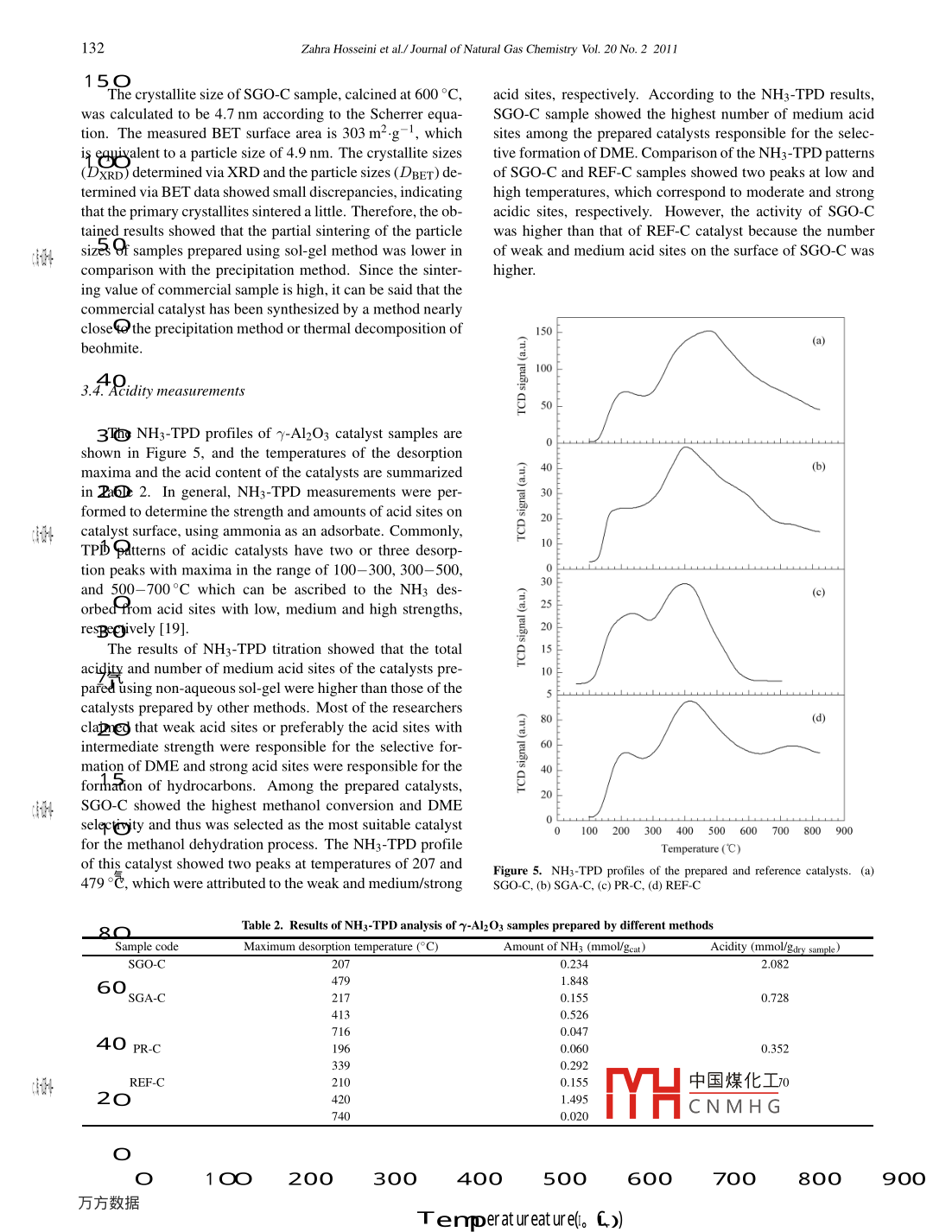 Available online at www.sciencedirect.com| Joumal ofScienceDirect7I Natural GasChemistryEL SEVIERJournal of Natural Gas Chemistry 20(201 1)128-134www.elsevier.com/locate/jngcSynthesis of nanocrystalline ry-Al2O3 by sol-gel and precipitationmethods for methanol dehydration to dimethyl etherZahra Hosseinil,Majid Taghizadeh1*,F(xiàn)ereydoon Yaripour?2I. Chemical Engineering Department, Babol University of Technology P. 0. Box 484, 4714871167 Babol, Iran;2. Catalyst Research Group, Petrochemical Research and Technology Company NPC, Tehran, Iran[ Manuscript received October 20, 2010; revised December 5, 2010 ]JoadAbstractThe capability of sol-gel and conventional precipitation techniques for the synthesis of nanocrystalline y-alumina was investigated. Thesecatalysts were used for vapor-phase dehydration of methanol to dimethyl ether in a fixed-bed reactor under the same operating conditions(T= 300°C, P= 1 bar, LHSV=2.8, 11.7, 26.1 h-'y nd charagteriped by meats of N2 adsorption-desorption, NHg-TPD, XRD, TGA andSEM techniques. According to the experimental reqlts, the caplysts prelsing sol-gel method in non-aqueous medium showed betterperformance compared with those prepared by other mhethods.Key words7~Al2O3; sol-gel; precipitation; methanol dehyd rationg dimnethylMurd Cs1. Introductionlays,vot phosphates such as aluminium phosphatesVI VIiwywT mentoned. Meanwhile, y-alumina is a very efecivceDemethyl ether (DME) has potential appitcations as acatalyst for this reaction, and it is believed that most of the acidchemical building block. In addition, since the characteris-sites on this catalyst are of the Lewis type. However, there istics of DME are similar to those of liquefied petroleum gasno consensus in the scientific community as to whether the(LPG) and given its high heating value, it has been speculatedLewis sites can be converted to Bronsted sites in the pres-that DME could be used in large scale power production, inence of water [8- 10]. Special interest for catalysis applica-home heating, in replacement of LPG for automobiles, and astions of nanoparticles is due to their unique properties. Ra diesel fuel substitute or combustion supplement. In thesecently, many different methods have been investigated in (applications, the specification for the purity of DME has beender to synthesize mesoporous nanocrystalline 7-Al2O3 withreported to be lower than 99 wt% requirement for curent uses higher specific surface area [11- 15]. Chemical routes for the(DME fuel grade is 88.9%)[1-5].production of these materials include sol-gel method, and con-There are three routes for DME production. Nowadays,trolled precipitation of boehmite obtained from alkoxides andthe DME world's production is performed with one of thealuminum salts [16,17]. The advantage of the sol gel methodfollowing routes: methanol dehydration, methanol/DME CO-includes the ability of maintaining a high degree of purity,production and direct synthesis [6,7].changing physical characteristics such as pore size distribu-Several catalysts having activity for the catalytic conver-tion and pore volume, and preparing samples at low temper-atures. The main factors which influence the structural prop-dehydration catalysts. It is generally accepted that acid cata-erties of the final r-alumina samples in the sol-gel techniquelysts are the best materials for the dehydration of methanol to are the hydrolysis ratio (moles of water per mole of aluminumdimethyl ether and that Bronsted or Lewis acids are capableprecursor), acidity of the precursor solution and the molarof performing this reaction. As examples of known acidic de-ratio of template to aluminum precursor. Combining a highhydration catalysts alumina, e.g. y-alumina, silica, alumina-porosity with high surface area improves the overall physicalsilica mixtures, crystalline aluminosilicates, crystalline zeo-properties and consequently increases the catalyst life [11,18].“Corresponding author. Tel: +98-111-3234204; Fax: +98-111-3234201; E-mail: m. taghizadehfr@y中國(guó)煤化工This work was financially supprted by Iranian Nanotechnology Initiative Council.YHCNM HGCopyrightO201 1, Dalian Institute of Chemical Pnese Academy of Sciences. All rights reserved.doi: 10.1016/S 10039953(10)60172-7Journal of Natural Gas Chemistry Vol. 20 No.2 2011129In this work, the effects of different preparation meth-ful pH adjustment to 7.5. Thetemperature was maintaods on catalytic properties and physical structure of nanocrys- 60 °C during precipitation step. The precipitate was digestedtalline 7/-Al2O3 as a solid-acid catalyst have been investigated. at 60 °C for 3 h. Then, the precipitate was filtered and dried atThe solid-acid catalyst has been tested in a fixed-bed reactor120。C for 24 h. The final solid was then calcined at 600 °Cand characterized by TGA, N2 adsorption- desorption, XRD,for 6 h at a heating rate of 2 °C/min and named as PR-C.SEM and NH3-TPD.2.2.4. Commercial reference sample2. ExperimentalFor comparison, a commercially available 7-alumina2.1. Materialssample was used as a reference catalyst. This sample wassupplied from BASF company and named REF-C.Aluminium iso-propoxide (AIP, 99 wt%), 2-propanol(IPA), propionic acid (AP), nitric acid (65 wt%), aluminum2.3. Characterizationnitrate nonahydrate (ANN, 98.5 wt%) and potassium bicar-bonate purchased from Merck Company were used as startingThe surface area, pore size distribution and pore vol-chemicals in different methods.ume were determined using a nitrogen adsorption-desorptionisotherm at the liquid-nitrogen temperature (- 196°C) by a2.2. Catalyst preparationNOVA 2200 instrument (Quantachrome, Boynton Beach, FL).Prior to the adsorption-desorption measurements, all the sam-2.2.1. Sol-gel method in a non-aqueous mediumples were degassed at 200 °C in a N2 flow for 16 h to removethe moisture and other impurities.Aluminum iso-propoxide, 2-propanol and propionic acidThe X-ray diffraction (XRD) patterns of all the cal-were used as alumin