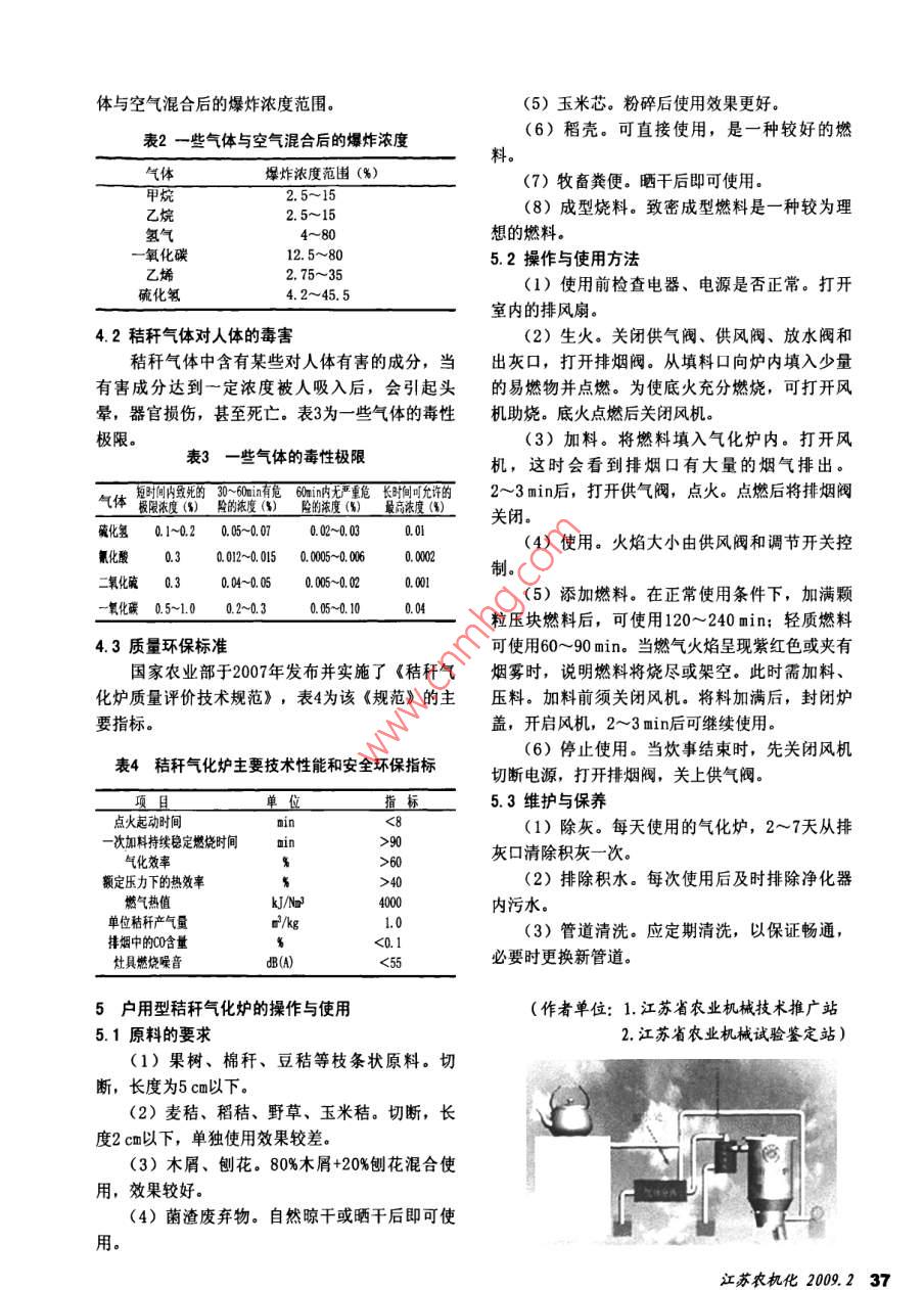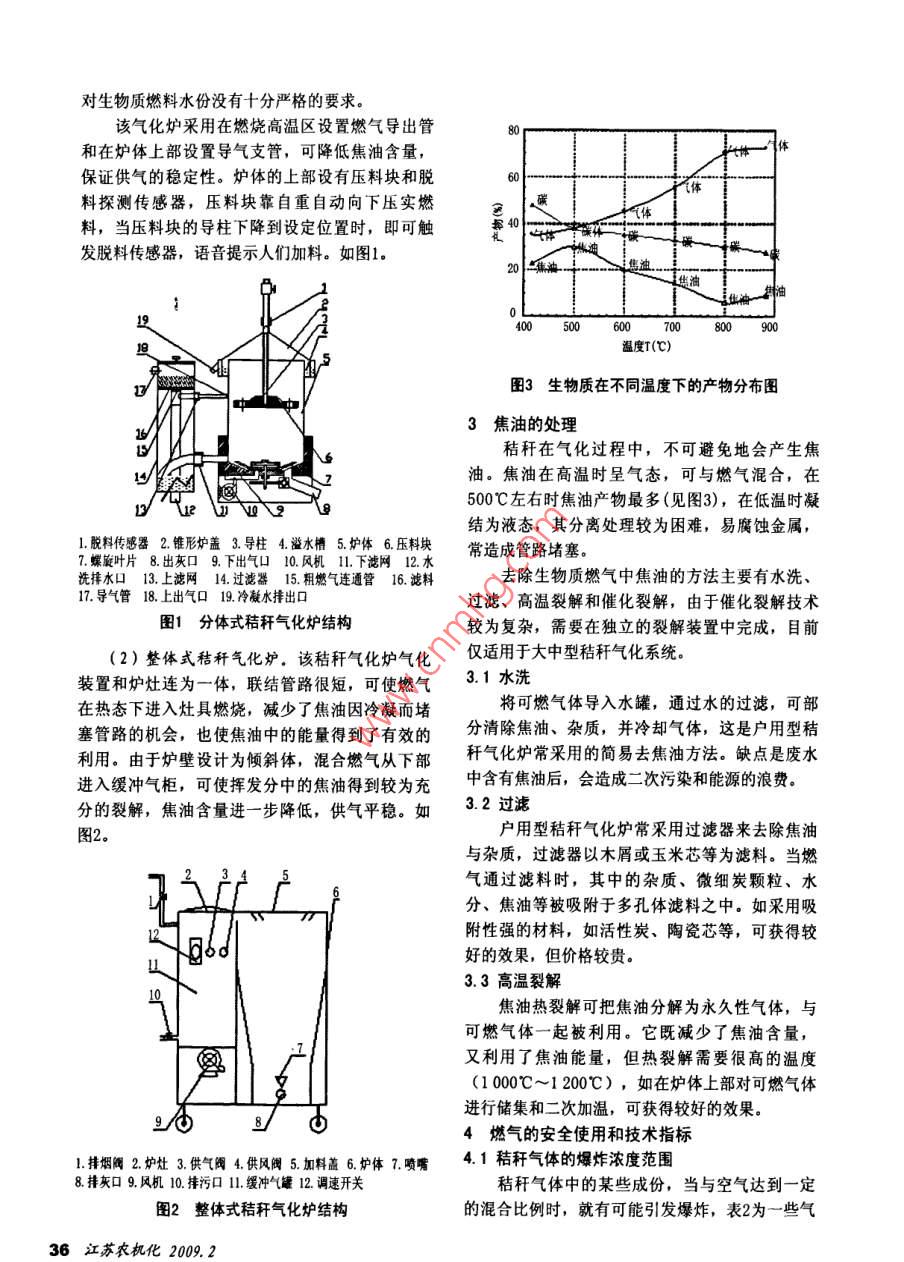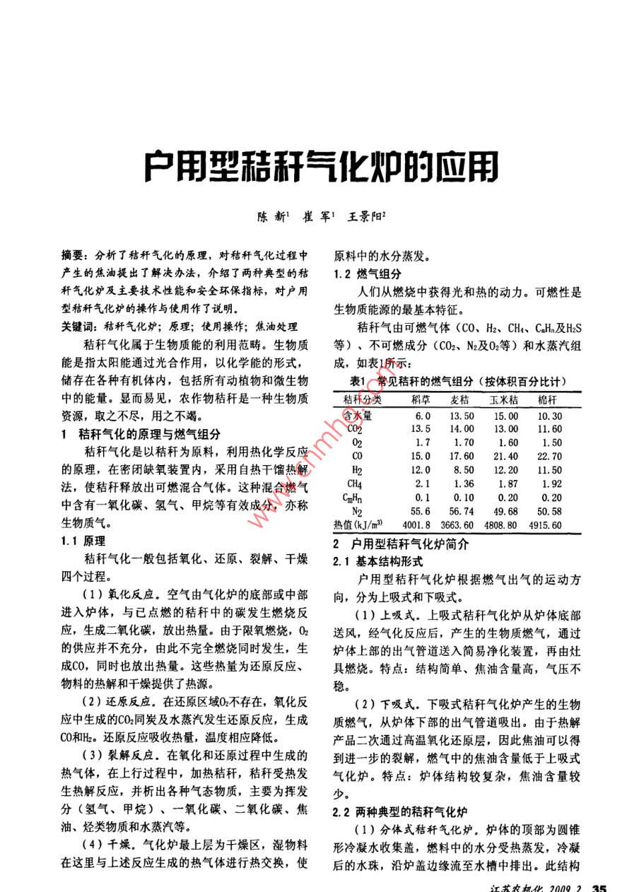 戶(hù)用型秸稈氣化爐的應(yīng)用陳新崔軍!王景陽(yáng)2摘要:分析了秸稈氣化的原理,對(duì)秸稈氣化過(guò)程中原料中的水分蒸發(fā)。產(chǎn)生的焦油提出了解決辦法,介紹了兩種典型的秸1.2燃?xì)饨M分稈氣化爐及主要技術(shù)性能和安全環(huán)保指標(biāo),對(duì)戶(hù)用人們從燃燒中獲得光和熱的動(dòng)力。可燃性是型秸稈氣化爐的操作與使用作了說(shuō)明。生物質(zhì)能源的最基本特征。關(guān)鍵詞:秸稈氣化爐;原理;使用操作;焦油處理秸稈氣由可燃?xì)怏w(CO、Hz、CH、CaH.及HsS秸稈氣化屬于生物質(zhì)能的利用范疇。生物質(zhì)等)、不可燃成分(CO2、 N2及02等) 和水蒸汽組能是指太陽(yáng)能通過(guò)光合作用,以化學(xué)能的形式,成,如表l所示:儲(chǔ)存在各種有機(jī)體內(nèi),包括所有動(dòng)植物和微生物表1常見(jiàn)秸稈的燃?xì)饨M分 (按體積百分比計(jì))中的能量。顯而易見(jiàn),農(nóng)作物秸稈是一種生物質(zhì)秸稈分類(lèi)稻草支秸玉米秸棉稈資源,取之不盡,用之不竭。含水量6.013.50 15.0010. 30C0213.514.00 13. 0011. 601秸稈氣化的原理與燃?xì)饨M分)21.71. 701.601.50秸稈氣化是以秸稈為原料,利用熱化學(xué)反應(yīng)15.017. 6022. 70的原理,在密閉缺氧裝置內(nèi),采用自熱干餾熱解H212.0 8.50 12. 2011.50法,使秸稈釋放出可燃混合氣體。這種混合燃?xì)釮42.11. 361.871.92CmHn0.10. 20中含有一氧化碳、氫氣、甲烷等有效成分,亦稱(chēng)N255.6 56.74 49.68 50. 58生物質(zhì)氣。熱值(k.J/m”4001.83663. 604808. 804915. 601.1原理2戶(hù)用型秸稈氣化爐簡(jiǎn)介秸稈氣化-般包括氧化、還原、裂解、干燥2. 1基本結(jié)構(gòu)形式四個(gè)過(guò)程。戶(hù)用型秸稈氣化爐根據(jù)燃?xì)獬鰵獾倪\(yùn)動(dòng)方(1)氧化反應(yīng)。空氣由氣化爐的底部或中部向,分為上吸式和下吸式。進(jìn)入爐體,與已點(diǎn)燃的秸稈中的碳發(fā)生燃燒反(1)上吸式。上吸式秸稈氣化爐從爐體底部應(yīng),生成二氧化碳,放出熱量。由于限氧燃燒,02送風(fēng),經(jīng)氣化反應(yīng)后,產(chǎn)生的生物質(zhì)燃?xì)?,通過(guò)的供應(yīng)并不充分,由此不完全燃燒同時(shí)發(fā)生,生爐體上部的出氣管道送入簡(jiǎn)易凈化裝置,再由灶成C0,同時(shí)也放出熱量。這些熱量為還原反應(yīng)、具燃燒。特點(diǎn):結(jié)構(gòu)簡(jiǎn)單、焦油含量高,氣壓不物料的熱解和千燥提供了熱源。穩(wěn)。(2)還原反應(yīng)。在還原區(qū)域02不存在,氧化反(2)下吸式。下吸式秸稈氣化爐產(chǎn)生的生物應(yīng)中生成的CO2同炭及水蒸汽發(fā)生還原反應(yīng),生成質(zhì)燃?xì)?,從爐體下部的出氣管道吸出。由于熱解C0和H。還原反應(yīng)吸收熱量,溫度相應(yīng)降低。產(chǎn)品二次通過(guò)高溫氧化還原層,因此焦油可以得(3)裂解反應(yīng)。在氧化和還原過(guò)程中生成的到進(jìn)一步的裂解,燃?xì)庵械慕褂秃康陀谏衔綗釟怏w,在上行過(guò)程中,加熱秸稈,秸稈受熱發(fā)氣化爐。特點(diǎn):爐體結(jié)構(gòu)較復(fù)雜,焦油含量較生熱解反應(yīng),并析出各種氣態(tài)物質(zhì),主要為揮發(fā)少。分(氫氣、甲烷)、一氧化碳、二氧化碳、焦2.2兩種典型的秸稈氣化爐油、烴類(lèi)物質(zhì)和水蒸汽等。(1)分體式秸稈氣化爐。爐體的頂部為圓錐(4)干燥。氣化爐最上層為千燥區(qū),濕物料形冷凝水收集蓋,燃料中的水分受熱蒸發(fā),冷凝在這里與上述反應(yīng)生成的熱氣體進(jìn)行熱交換,使后的水珠,沿爐蓋邊緣流至水槽中排出。此結(jié)構(gòu);江蘇農(nóng)與兒2009235對(duì)生物質(zhì)燃料水份沒(méi)有十分嚴(yán)格的要求。該氣化爐采用在燃燒高溫區(qū)設(shè)置燃?xì)鈱?dǎo)出管8(體和在爐體上部設(shè)置導(dǎo)氣支管,可降低焦油含量,保證供氣的穩(wěn)定性。爐體的上部設(shè)有壓料塊和脫6(氣體料探測(cè)傳感器,壓料塊靠自重自動(dòng)向下壓實(shí)燃碳料,當(dāng)壓料塊的導(dǎo)柱下降到設(shè)定位置時(shí),即可觸640發(fā)脫料傳感器,語(yǔ)音提示人們加料。如圖1。20二年油只194005060070800900溫度T(C)邊5圖3 生物質(zhì)在不同溫度下的產(chǎn)物分布圖3焦油的處理秸稈在氣化過(guò)程中,不可避免地會(huì)產(chǎn)生焦油。焦油在高溫時(shí)呈氣態(tài),可與燃?xì)饣旌?,?00C左右時(shí)焦油產(chǎn)物最多(見(jiàn)圖3),在低溫時(shí)凝1.脫料傳感器2. 錐形爐蓋3.導(dǎo)柱4.溢水槽5.爐體6. 壓料塊結(jié)為液態(tài),其分離處理較為困難,易腐蝕金屬, .7.蝶旋葉片8.出灰口 9. 下出氣口10.風(fēng)機(jī) 11.下濾網(wǎng) 12.水常造成管路堵塞。洗排水口13.上濾網(wǎng) 14.過(guò)濾器 15. 粗燃?xì)膺B通管16. 濾料去除生物質(zhì)燃?xì)庵薪褂偷姆椒ㄖ饕兴础?7.導(dǎo)氣管18. 上出氣口19.冷凝水捧出口過(guò)濾、高溫裂解和催化裂解,由于催化裂解技術(shù)圖1分體式秸稈 氣化爐結(jié)構(gòu)較為復(fù)雜,需要在獨(dú)立的裂解裝置中完成,目前(2)整體式秸稈氣化爐。該秸稈氣化爐氣化僅適用于大中型秸稈氣化系統(tǒng)。裝置和爐灶連為- -體,聯(lián)結(jié)管路很短,可使燃?xì)?.1水洗在熱態(tài)下進(jìn)入灶具燃燒,減少了焦油因冷凝而堵將可燃?xì)怏w導(dǎo)入水罐,通過(guò)水的過(guò)濾,可部塞管路的機(jī)會(huì),也使焦油中的能量得到了有效的分清除焦油、雜質(zhì),并冷卻氣體,這是戶(h