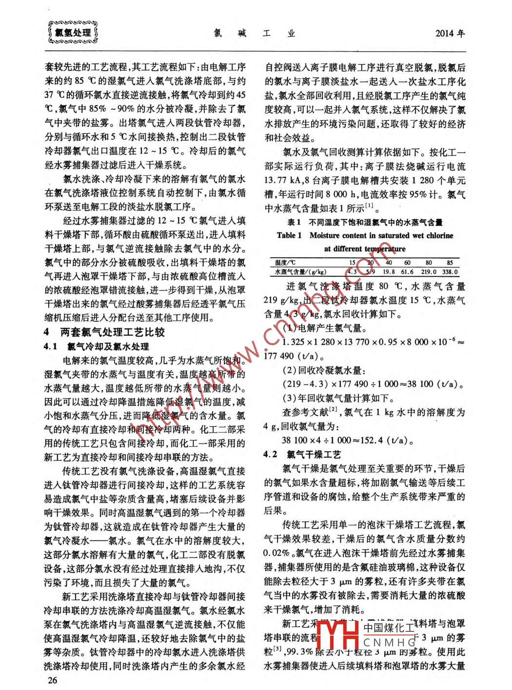 第50卷第7期氯堿工業(yè)Vol 50. No. 72014年7月Chlor- Alkali IndustryJul.,2014【氯氫處理】氯氣處理工藝總結(jié)陳馬亮·,劉芳(內(nèi)蒙古君正化工有限責(zé)任公司,內(nèi)蒙古烏海016000)[關(guān)鍵詞]氯氣;干燥;工藝流程[摘要]簡(jiǎn)要介紹了2種氯氣處理工藝:①傳統(tǒng)的泡沫篩板塔干燥及納氏泵輸送工藝;②洗滌塔捕集器、填料塔、泡罩塔相串聯(lián)及透平機(jī)輸送工藝。并從工藝流程、工藝特點(diǎn)以及實(shí)踐運(yùn)行等方面進(jìn)行比較,發(fā)現(xiàn)后一種氯氣處理工藝具有工藝結(jié)構(gòu)簡(jiǎn)單、操作彈性大等優(yōu)點(diǎn)。[中圖分類號(hào)]TQ0282[文獻(xiàn)標(biāo)志碼]B[文章編號(hào)]1008-133X(2014)07-0025-03Summary on chlorine gas treatment processCHEN Maliang, LIU Fang(Inner Mongolia Junzhen Chemical Industry Co, Ltd, Wuhai 016000,ChinaKey words: chlorine gas; dryiAbstract: Two processes for treating chlorine, i.e., ( traditional foam sieve-plate drying column andash pump transportation, @2 scrubbing tower, trap, and bubble tower in series and turbinetransportation, were introduced. The two processes were compared in respects of process flow, processcharacteristics, and practical running. It was found that the latter process was simple, and had wideoperation flexibility.氯氣處理工序是氯堿生產(chǎn)中至關(guān)重要的環(huán)節(jié)之塔相串聯(lián)及透平氯壓機(jī)輸送工藝。與傳統(tǒng)工藝相,受到氯堿行業(yè)的高度重視。近年來(lái)氯堿行業(yè)在比,新工藝具有結(jié)構(gòu)簡(jiǎn)單、處理能力大維修費(fèi)用低國(guó)內(nèi)發(fā)展迅猛,氯氣處理工藝也取得了巨大的進(jìn)步等優(yōu)點(diǎn)。因此新建企業(yè)有必要選擇一套在節(jié)能降耗、操作維護(hù)性價(jià)比等方面具有優(yōu)勢(shì)且適用于本廠的氯氣干2傳統(tǒng)氯氣處理工藝流程簡(jiǎn)述燥方案。化工二部釆用的是傳統(tǒng)氯氣處理工藝,其工藝1簡(jiǎn)介流程如下:從電解來(lái)的80~90℃高溫濕氯氣進(jìn)入內(nèi)蒙古君正化工有限責(zé)任公司(以下簡(jiǎn)稱“君段鈦冷卻器,用一段循環(huán)水冷卻至40℃左右再進(jìn)正化工”)有3個(gè)分公司:化工二部、化工一部和實(shí)入二段鈦冷卻器,用5℃冷凍水冷卻至12~15℃業(yè)部?;ざ繛樵S河化工廠,于1991年投入運(yùn)冷卻后的氯氣經(jīng)水霧捕集器除去氯氣中水霧后,進(jìn)行初期具有雙6ka燒堿對(duì)應(yīng)的氯氣處理裝置經(jīng)泡沫干燥塔用濃硫酸干燥,干燥后的氯氣用氯氣擴(kuò)建改造,現(xiàn)具有5.7萬(wàn)ta燒堿對(duì)應(yīng)的氯氣處理壓縮機(jī)(納氏泵)加壓后分送液氯工序和氯化氫合裝置,采用傳統(tǒng)的泡沫篩板塔干燥及納氏泵輸送工藝;化工一部為2008年新建聚氯乙烯樹脂廠,200成工序。年一次試車成功具有2萬(wàn)∽a離子膜法燒堿對(duì)應(yīng)3氯氣處理新工藝流程簡(jiǎn)述的氯氣處理裝置,采用洗滌塔、捕集器、填料塔、泡罩化工一部為新建廠,綜合各方面因素選擇了中國(guó)煤化工·【作者簡(jiǎn)介陳馬亮(986-),男,碩士,2011年畢業(yè)于山西大學(xué)有機(jī)化學(xué)CNMHG正化工有限責(zé)任公司生產(chǎn)技術(shù)部從事PVC研究工作。[收稿日期]2013-09-03氯氫處理氯堿工業(yè)2014年套較先進(jìn)的工藝流程,其工藝流程如下:由電解工序自控閥送入離子膜電解工序進(jìn)行真空脫氯,脫氯后來(lái)的約85℃的濕氯氣進(jìn)入氯氣洗滌塔底部,與約的氯水與離子膜淡鹽水一起送入一次鹽水工序化37℃的循環(huán)氯水直接逆流接觸將氯氣冷卻到約45鹽氯水全部回收利用,且經(jīng)脫氯工序產(chǎn)生的氯氣純℃,氯氣中85%-90%的水分被冷凝并除去了氯度較高,可以一起并入氯氣系統(tǒng),這樣不僅解決了氯氣中夾帶的鹽霧。出塔氯氣進(jìn)入兩段鈦管冷卻器,水排放產(chǎn)生的環(huán)境污染問(wèn)題,還取得了較好的經(jīng)濟(jì)分別與循環(huán)水和5℃水間接換熱,控制出二段鈦管和社會(huì)效益。冷卻器氯氣出口溫度在12~15℃。冷卻后的氯氣氯水及氯氣回收測(cè)算計(jì)算依據(jù)如下。按化工經(jīng)水霧捕集器過(guò)濾后進(jìn)入干燥系統(tǒng)部實(shí)際運(yùn)行負(fù)荷,其中:離子膜法燒堿運(yùn)行電流氯水洗滌、冷卻冷凝下來(lái)的溶解有氯氣的氯水13.77kA,8臺(tái)離子膜電解槽共安裝1280個(gè)單元在氯氣洗滌塔液位控制系統(tǒng)自動(dòng)控制下,由氯水循槽,年運(yùn)行時(shí)間800h,電流效率按95%計(jì)。氯氣環(huán)泵送至電解工段的淡鹽水脫氯工序。中水蒸氣含量如表1所示經(jīng)過(guò)水霧捕集器過(guò)濾的12~15℃氯氣進(jìn)入填表1不同溫度下飽和濕氯氣中的水蒸氣含量料干燥塔下部,循環(huán)酸由硫酸循環(huán)泵送出,進(jìn)人填料Table 1 Moisture content in saturated wet chlorine干燥塔上部,與氯氣逆流接觸除去氯氣中的水分。at different temperature氯氣中的部分水分被硫酸吸收,出填料干燥塔的氯溫度℃氣再進(jìn)入泡罩干燥塔下部,與由濃硫酸高位槽流入水燕氣含量/(gkg)4.35.919360數(shù)的濃硫酸經(jīng)泡罩錯(cuò)流接觸,進(jìn)一步得到干燥,從泡罩進(jìn)氯氣洗滌塔溫度80℃,水蒸氣含量干燥塔出來(lái)的氯氣經(jīng)過(guò)酸霧捕集器后經(jīng)透平氯氣壓219gkg,出二段鈦冷卻器氯水溫度15℃,水蒸氣縮機(jī)壓縮后進(jìn)入分配臺(tái)送至其他工序使用。含量4.3g/kg,氯水回收計(jì)算如下。4兩