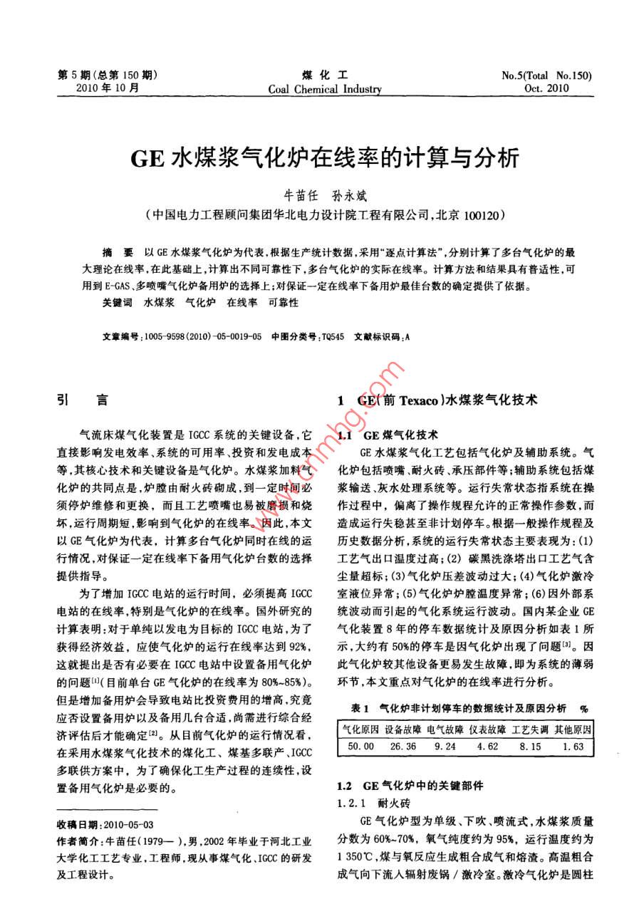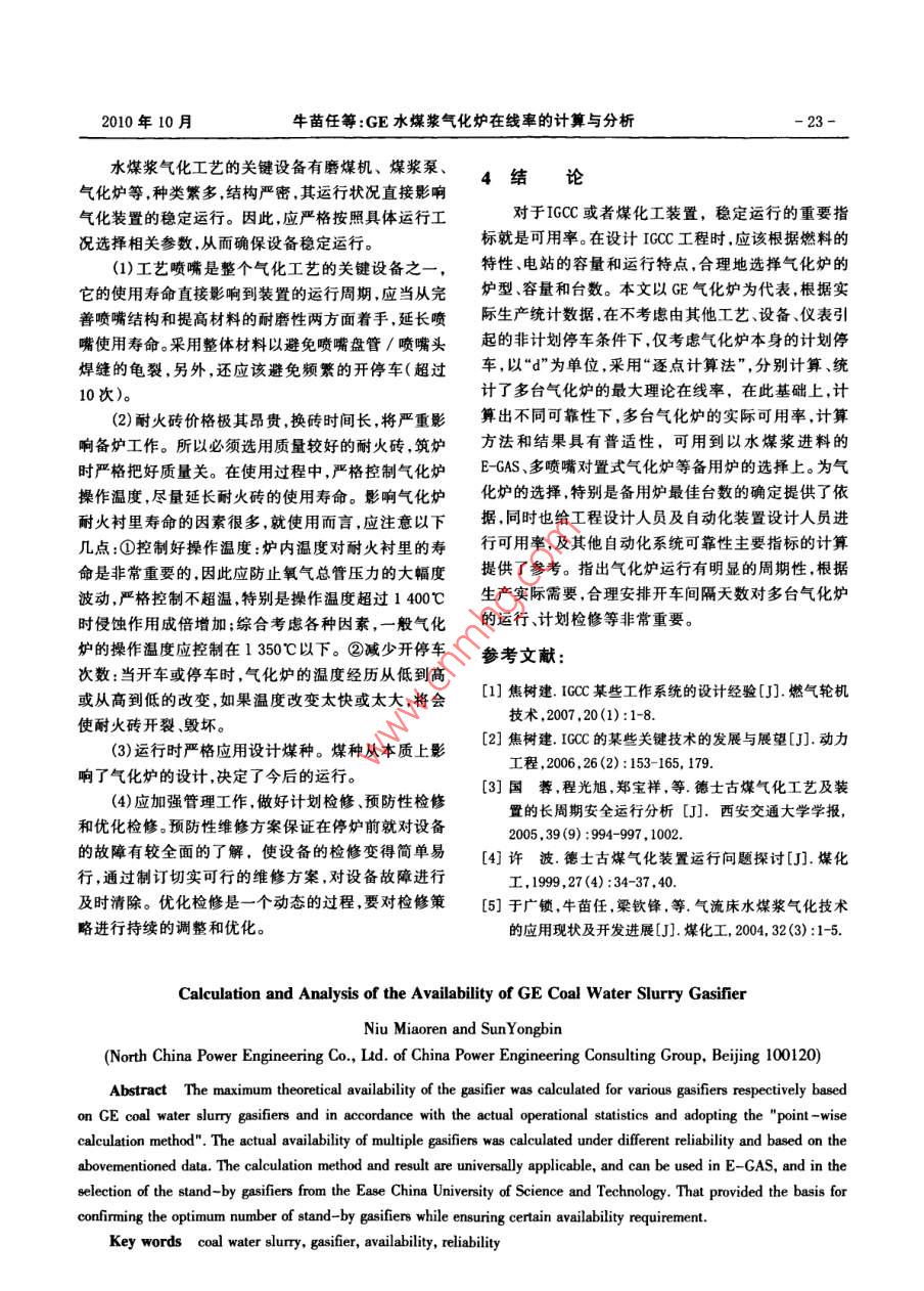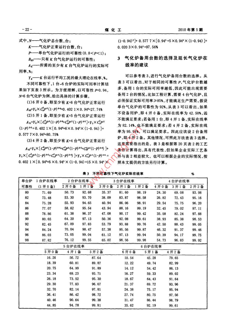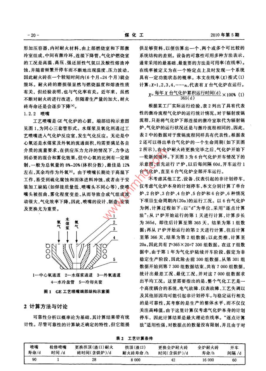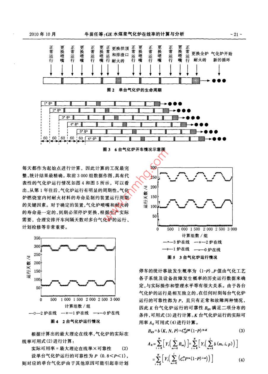 第5期(總第150期)煤化工No, 5(Total No 150)2010年10月Coal Chemical IndustryOct.2010GE水煤漿氣化爐在線率的計算與分析牛苗任孫永斌(中國電力工程顧問集團華北電力設計院工程有限公司,北京100120)摘要以GE水煤漿氣化爐為代表,根據生產統(tǒng)計數(shù)據,采用“逐點計算法”,分別計算了多臺氣化爐的最大理論在線率,在此基礎上,計算出不同可靠性下,多臺氣化爐的實際在線率。計算方法和結果具有普適性,可用到E-GAS、多噴嘴氣化爐備用爐的選擇上;對保證一定在線率下備用爐最佳臺數(shù)的確定提供了依據。關鍵詞水煤漿氣化爐在線率可靠性文章編號:10059598(2010)05-001905中圖分類號:TQ545文獻標識碼:A引言1GE(前 Texaco)水煤漿氣化技術氣流床煤氣化裝置是IGCC系統(tǒng)的關鍵設備,它1.1GE煤氣化技術直接影響發(fā)電效率、系統(tǒng)的可用率、投資和發(fā)電成本GE水煤漿氣化工藝包括氣化爐及輔助系統(tǒng)。氣等,其核心技術和關鍵設備是氣化爐。水煤漿加料氣化爐包括噴嘴、耐火磚、承壓部件等;輔助系統(tǒng)包括煤化爐的共同點是,爐膛由耐火磚砌成,到一定時間必漿輸送、灰水處理系統(tǒng)等。運行失常狀態(tài)指系統(tǒng)在操須停爐維修和更換,而且工藝噴嘴也易被磨損和燒作過程中,偏離了操作規(guī)程允許的正常操作參數(shù),而壞,運行周期短,影響到氣化爐的在線率。因此,本文造成運行失穩(wěn)甚至非計劃停車。根據一般操作規(guī)程及以GE氣化爐為代表,計算多臺氣化爐同時在線的運歷史數(shù)據分析,系統(tǒng)的運行失常狀態(tài)主要表現(xiàn)為:(1)行情況,對保證一定在線率下備用氣化爐臺數(shù)的選擇工藝氣出口溫度過高;(2)碳黑洗滌塔出口工藝氣含提供指導塵量超標;(3)氣化爐壓差波動過大;(4)氣化爐激冷為了增加IGCC電站的運行時間,必須提高IGC室液位異常;(5)氣化爐爐膛溫度異常;(6)因外部系電站的在線率,特別是氣化爐的在線率。國外研究的統(tǒng)波動而引起的氣化系統(tǒng)運行波動。國內某企業(yè)GE計算表明:對于單純以發(fā)電為目標的IGCC電站,為了氣化裝置8年的停車數(shù)據統(tǒng)計及原因分析如表1所獲得經濟效益,應使氣化爐的運行在線率達到92%,示,大約有50%的停車是因氣化爐出現(xiàn)了問題。因這就提出是否有必要在IGCC電站中設置備用氣化爐此氣化爐較其他設備更易發(fā)生故障即為系統(tǒng)的薄弱的問題叫(目前單臺GE氣化爐的在線率為80%-85%)。環(huán)節(jié),本文重點對氣化爐的在線率進行分析。但是增加備用爐會導致電站比投資費用的增高,究竟表1氣化爐非計劃停車的數(shù)據統(tǒng)計及原因分析%應否設置備用爐以及備用幾臺合適,尚需進行綜合經濟評估后才能確定2。從目前氣化爐的運行情況看,氣化原因設備故障電氣故障儀表故障工藝失調其他原因在釆用水煤漿氣化技術的煤化工、煤基多聯(lián)產、IGCC50.0026.369.244.628.151.63多聯(lián)供方案中,為了確保化工生產過程的連續(xù)性,設置備用氣化爐是必要的。12GE氣化爐中的關鍵部件1.2.1耐火磚收稿日期:201005-03GE氣化爐型為單級、下吹、噴流式,水煤漿質量作者簡介:牛苗任(1979—),男,2002年畢業(yè)于河北工業(yè)分數(shù)為60%-70%,氧氣純度約為95%,運行溫度約為大學化工工藝專業(yè),工程師,現(xiàn)從事煤氣化、GC的研發(fā)1350℃,煤與氧反應生成粗合成氣和熔渣。高溫粗合及工程設計。成氣向下流入輻射廢鍋/激冷室。激冷氣化爐是圓柱化工2010年第5期形加壓容器,內襯耐火材料,由上部燃燒室和下部激供足夠資料,以便估算出一個、兩個或多個可比較的冷室組成,中間有激冷環(huán),連接下降管。氣化爐燃燒室系統(tǒng)結構的差別。設備的可靠性可用多種方法表示,的工況是高溫、高壓、強還原性氣氛以及酸性熔渣沖通常采用的最基礎、最重要的方法是可用率(在線率)。蝕,并隨著頻繁開停車而不斷地出現(xiàn)溫度、壓力波動,在線率被定義為在一個特定點上及時發(fā)現(xiàn)一個系統(tǒng)因此耐火磚在一個較短時間內(6個月24個月)就會具有一定功能狀態(tài)的概率。本文在線率(Xx)按式(1)毀壞。耐火磚的磨損很顯然與燃燒溫度和熔渣性質計算:X=1,2,3,4,……n,代表有X臺氣化爐在運行有關,但經驗表明,也與氣化率有關。近年來,雖然X=每年X臺氣化爐累積運行時間(d)×100%(1)不斷對耐火磚進行改進,但隨著生產量的加大,耐火磚壽命還是會逐步下降1。根據某工廠實際運行經驗,表2列出了具有代表1.2.2噴嘴性的激冷流程氣化爐的運行統(tǒng)計情況。對于輻射廢鍋工藝噴嘴是GE氣化爐的心臟,端部結構示意圖流程只是將氣化爐下部連接的激冷室取代為輻射鍋見圖1,為同心三套管形式。水煤漿及氧化劑通過工爐,氣化爐的運行狀況還是與激冷流程相同的,因此,藝噴嘴進入氣化爐反應室,發(fā)生氣化反應。無論是中表2中的數(shù)據對于廢鍋流程同樣具有代表性。根據表心氧還是水煤漿及外氧的流通面積均需要滿足各自2還可以得出單臺氣化爐的一個生命周期(如下頁圖介質的流量要求,在供應壓力允許的情況下,力爭達2所示),在全爐耐火磚更換完畢之后氣化爐開始下到必要的混合和霧化效果。但中心氧的比例有一定限輪新的循環(huán)。下頁圖3為6臺氣化爐開車情況下的制,一般為總氧量的8%-20%(體積分數(shù)),最佳是12%示意圖,首先運行1爐,以后每間隔60d,開車運行1