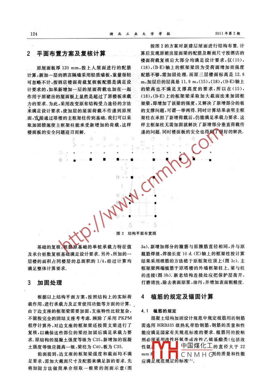 第26卷第2期2011年04月Vol 26 No. 2Journal of Hubei University of TechnologyApr.2011[文章編號]1003-4684(2011)020123-03建筑的加層改造設計耿紅湖北省機電研究設計院,湖北武漢430070)[摘要]結合漢口某大廈加層實例詳細介紹了加層改造設計的方法強調了加層改造設計中應注意結構方案的合理性,注重構造處理[關鍵詞]加層改造;植筋;加固[中圖分類號]TU375[文獻標識碼]:A在無建筑場地,擇址新建不可能,而投資資金不房,結構形式為框架一剪力墻結構,兩塔之間間距足的情況下,加層改造就成為建設方最現(xiàn)實的選擇.8.7m~10.6m,裙房屋面標高為8.4m,塔樓第三越來越多的業(yè)主提出了加層改造的要求.與新建的層面標高為12.6m,一層地下室,基礎采用靜壓管相比,加層改造設計中最大的難點就在于結構方案樁,裙房屋面按上人屋面設計該公司為了擴展經營的設計合理性以及新舊結構構件連接處的構造處范圍,欲在裙房屋面上加一層作為度假酒店,結構平理.本文通過工程實例講述了加層改造結構方案設面布置見圖1計和新舊結構構件連接處的加固方法和構造措施(BA)~(BE)軸/(15)~(18)軸的范圍和(BE)~(E)軸范圍是裙房的部分屋頂平面,在此范圍1工程概況內加一層作酒店,加層的結構形式為框架結構,其余為33層的塔樓部分漢口某大廈為33層雙塔式高層建筑,二層裙圖1原結構平面布置圖中國煤化工CNMHG[收稿日期]2010-09-13[作者簡介]耿紅(1963-),女,湖北武漢人,湖北省機電研究設計院硎高級工程師,研究方向為建筑工程湖北工業(yè)大學學報2011年第2期按圖2的方案對新建層屋面進行結構布置.計2平面布置方案及復核計算算后發(fā)現(xiàn)原裙房屋面梁的配筋及斷面尺寸按酒店的樓面荷載復核后大部分均滿足設計要求,僅(15),原屋面板厚120mm,按上人屋面進行的配筋(18),(BE)軸上的框架梁因為受荷面增加而強度計算,新加一層的酒店隔墻采用輕質墻板重量很輕配筋不夠需加固處理而原三層樓面標高是126可忽略不計,按酒店樓面荷載復核板配筋是滿足設m,加層后的層高是11.9m,(15),(18),(BE)軸上計要求的,如果新增加一層的屋面荷載也加在一起的梁高也不滿足支撐高度的要求,所以在(15),作用于原裙房的屋面板上顯然是超過了原樓板承載(18),(BE)上的框架梁采取加大截面法來加固框力的要求為此,采用改變原有結構受力途徑的方法架梁,即增加了該梁的強度,又解決了新增部分的板來滿足設計要求,使加層的屋面荷載不傳遞到原屋的支撐問題,可謂一舉兩得.同時計算結果表明主框面宜接通過塔樓的主框架柱傳到基礎我們可以采架柱在承擔了新增荷載后,仍能滿足承載力要求這取加固措施使主框架柱能承受新增加的荷載這樣樣主框架柱無需加固就解決了新增部分垂直荷載傳樓面板的安全問題迎刃而解遞的問題.同時樓面板的安全也得到了很好的解決圖2結構平面布置圖基礎的復核:根據(jù)原基礎的單樁承載力特征值3a)新增加部分的箍筋與原箍筋直徑相同,并與原及承臺樁數(shù)復核基礎滿足設計要求.另外,所加的一箍筋焊接,焊接長度10d(E)軸上的框架柱按計算層樓的面積占同樓層的總面積的1/4,經過計算均結果采用植筋的方法植于原框架柱頂上(圖3c).主滿足整體計算要求框架梁兩端植筋于原塔樓的外墻框架柱上.梁與柱的連接(圖3b).新老結構連接處應把保護層鑿開3加固處理打磨清洗,除去表面原漿,油污,并增加表面粗糙度根據(jù)以上結構平面方案按照結構上的實際荷4植筋的規(guī)定及錨固計算載作用,進行承載力及正常使用功能等方面的計算由于邊支座的框架梁需要加固,支座特性比較復雜,4.1植筋的規(guī)定不能按完全的固結支座考考慮顧除了采用PKPM混凝土結構加固設計規(guī)范中規(guī)定植筋用的鋼筋程序計算外,對邊支座的框架梁還按簡支梁進行了需選用HRB335級熱軋帶肋鋼筋,鋼筋的質量和性復核,以確保這些部位的梁經加固后滿足承載力要能應滿足國家有關規(guī)范標準的要求植筋用的膠粘求原結構的混凝土強度等級為C35,新增加的混凝劑必須采用改性環(huán)氧類或改性乙烯基酯類(包括改土強度等級應提高一級,梁柱為C40,板為C35性氨中國煤化工的直徑大于22前面提到,邊支座的框架梁強度和截面均不滿mmCNMHG劑的質量和性能足要求,需加大截面尺寸及配筋來滿足新的要求先應滿足規(guī)范規(guī)定的標準將加固方法做簡單介紹取一根梁的剖面示意(圖第26卷第2期耿紅建筑的加層改設計g52盡5果可想深5套k7:支7mr,k在深H天深一,下誤游人植出圖3節(jié)點大樣示意圖承重結構的膠粘劑必須進行各項檢驗.一是安全性05×310d/3.6=18.1d檢驗,檢驗時其粘結抗剪強度標準值應根據(jù)置信水當混凝土強度等級>C30時,g=1.0.平C=0.90,保證率為95%的要求二是其鋼一鋼考慮各種因素對植筋受拉承載力的影響而需加粘結抗剪性能必須經濕熱老化檢驗合格.經濕熱老大錨固深度的修正系數(shù)gw-psφwr=1.15×1.1化后的試件應在常溫條件下進行鋼一鋼拉伸抗剪試1.0=1.265驗,其強度降低的百分率應滿足A級膠不得大于當p≤20時,l≥gw9l=1.265×1.0×1710%,B級膠不得大于15%.三是膠粘劑必須通過22d=21.78d;毒性檢驗對完全固化的膠粘劑,其檢驗結果應符合當φ=225時,l≥gN9l,=1.265×1.0實際無毒衛(wèi)生等級的要求在承重結構用的膠粘劑18.1d=22.9d中嚴禁使用乙二胺作改性環(huán)氧樹脂固化劑表2為不同鋼筋的植筋長度4.2植筋的錨固計算表1不同銅筋的植筋長