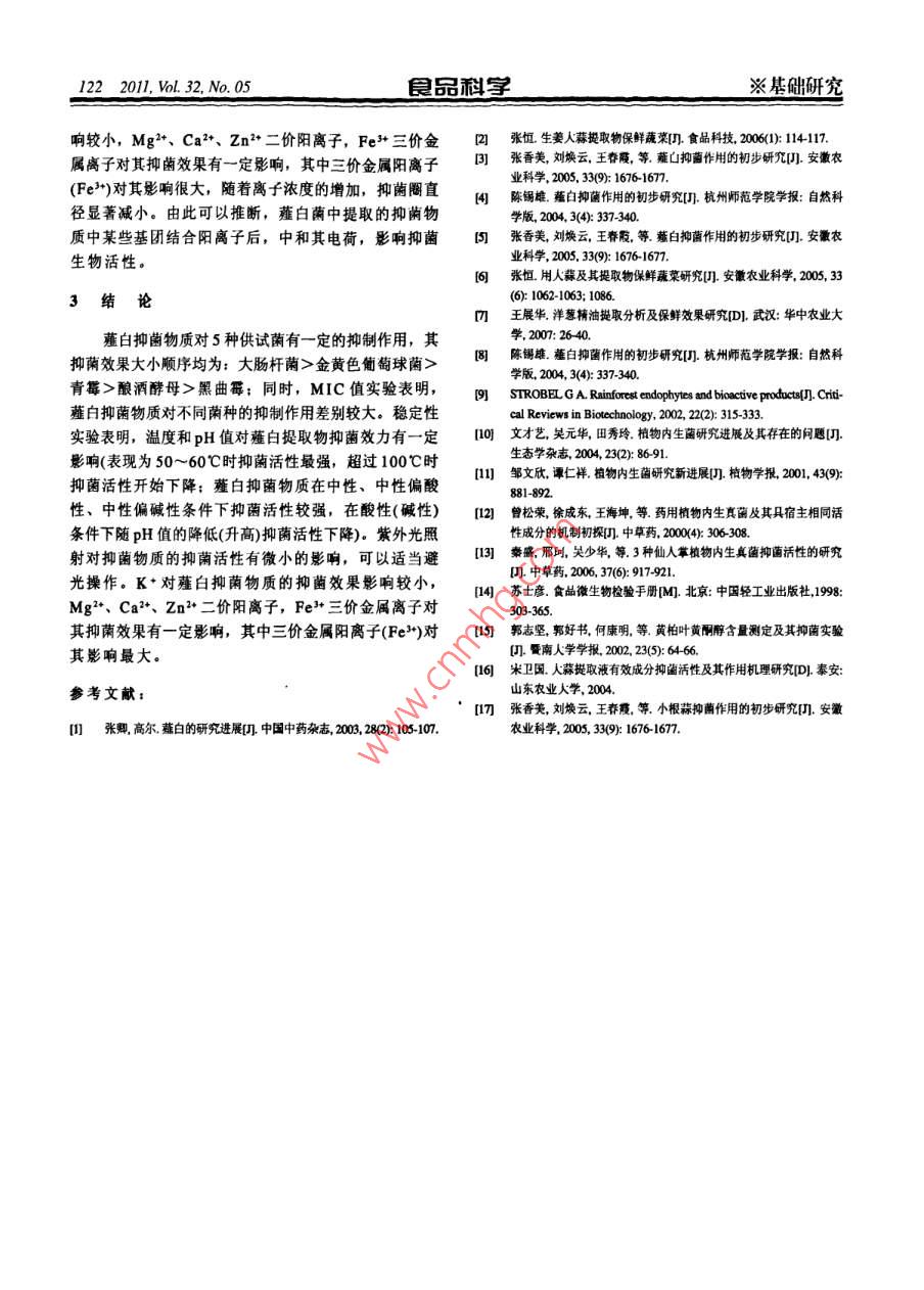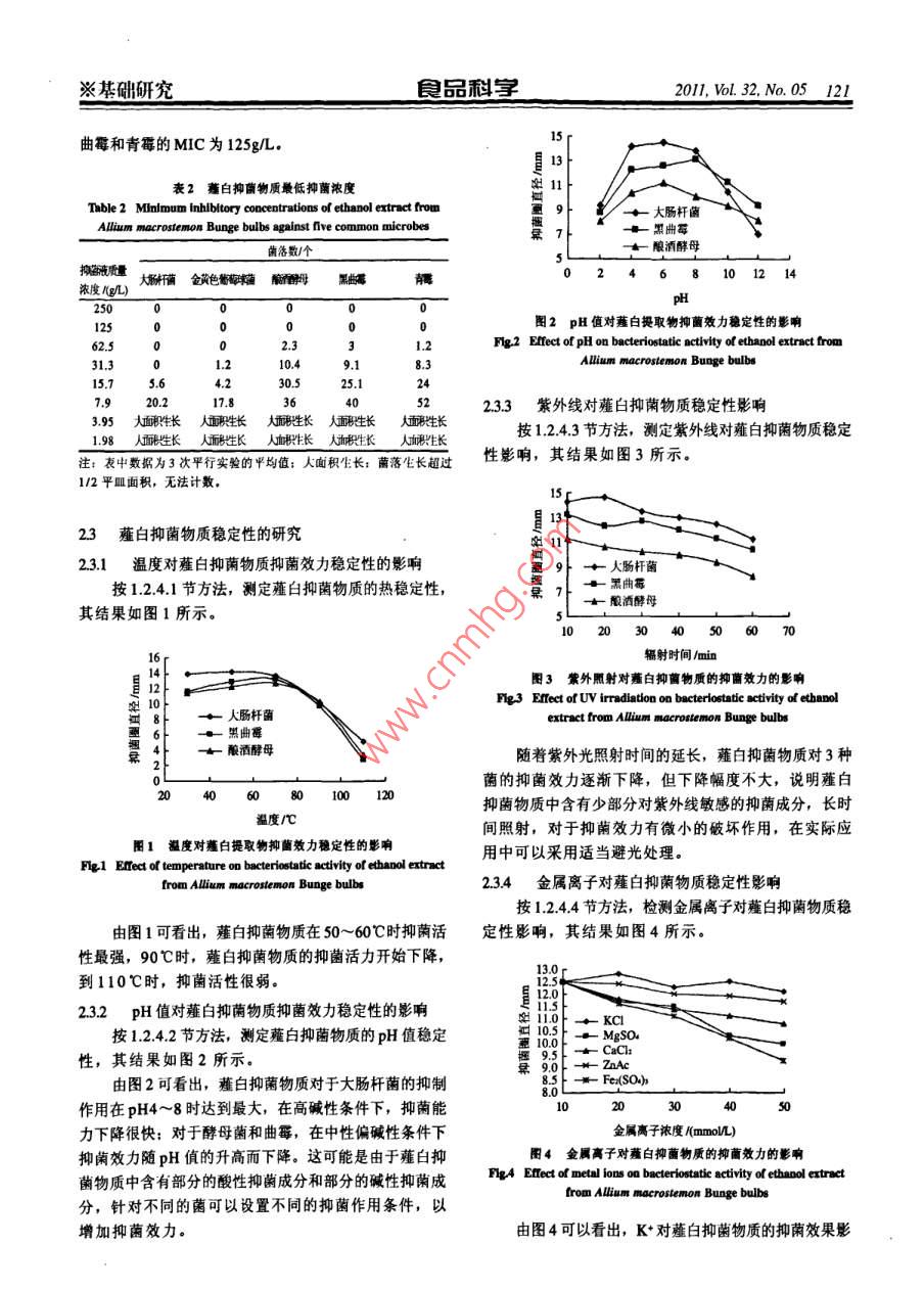 ※基礎(chǔ)研究食品科字201,vol.32,No.05119薤白乙醇提取物的抑菌特性張傳軍,劉超,姜曉坤(吉林農(nóng)業(yè)科技學(xué)院食品工程學(xué)院,吉林吉林132101)摘要:通過(guò)抑菌實(shí)驗(yàn)和穩(wěn)定性實(shí)驗(yàn),對(duì)從白中提取的白抑菌物質(zhì)的抑菌特性進(jìn)行研究。結(jié)果表明:薤白抑菌物質(zhì)對(duì)供試菌的抑菌效果大小順序?yàn)?大腸桿菌>金黃色葡萄球菌>青>酵母菌>黑曲霉穩(wěn)定性實(shí)驗(yàn)表明溫度和pH值對(duì)薤白醇提物抑菌效力有一定影響,表現(xiàn)為50~60℃時(shí)抑菌活性最強(qiáng),超過(guò)100℃時(shí)抑菌活性開(kāi)始下降:白抑菌物質(zhì)在中性、中性偏酸性、中性偏堿性條件下抑菌活性較強(qiáng),在酸性(堿性)條件下隨pH值的降低(升高)抑菌活性下降;紫外光照射對(duì)抑菌物質(zhì)的抑菌活性有微小的影響,可以適當(dāng)避光操作。K+對(duì)白抑菌物質(zhì)的抑菌效果影響較小,Mg2+、Ca2、Zn2二價(jià)陽(yáng)離子,Fe3+三價(jià)金屬離子對(duì)其抑菌效果有一定影響,其中三價(jià)金屬陽(yáng)離子(Fe3)對(duì)其影響最大。關(guān)鍵詞:白;乙醇提取物:抑菌特性 Antibacterial Effect of Ethanol Extract from Allium macrostemon Bunge Bulbs ZHANG Chuan-jun, LIU Chao, JIANG Xiao-kun (School of Food Engineering, Jilin Agricultural Science and Technology College, Jilin 132101, China) Abstract In this study, 70% ethanol extract from the bulbs of Allium macrostemon Bunge was tested for its antibacterial activities against five common microbes. Meanwhile, the stability of its inhibitory effects on. coli, Aspergillus niger and Saccharomyces cerevisiae was explored. The results showed that the extract sequentially inhibited five common microbes in the following order: E. coli >S. aureus Penic >Aspergillus niger. Stability experiments revealed that temperature and pH had strong influence on the antibacterial effect of the extract. The extract exhibited the the temperature was higher than 100 C. In addition, the al activity of the extract was strong under neutral, slightly acidic and slightly alkaline conditions, and dec ecreasing acidic pH or increasing alkaline pH, and was little affected by UV light illumination and K', but was affecte as Mg2,ca2and Zn2 as well as Fe as tervalent cation which had larger effect than these divalent cations. Key words: Allium macrostemon Bunge: ethanol extract: bacteriostatic property中圖分類(lèi)號(hào):TQ4555文獻(xiàn)標(biāo)識(shí)碼:A文章編號(hào):1002-6630(2011)05-0119-04白(Allium macrostemon Bunge),又名“小根現(xiàn)在食品工業(yè)中使用的防腐劑大多是化學(xué)防腐劑,蒜”“野蒜”、“小蒜”,是一種安全、無(wú)毒的食對(duì)人體有一定的毒副作用,開(kāi)發(fā)植物天然防腐劑是目用野菜,高30~60cm。鱗莖卵圓形或球形,直徑.8~前食品防腐研究的熱點(diǎn)1。據(jù)報(bào)道5薤白具有廣譜的抑2cm,旁側(cè)常有1~3個(gè)小鱗莖附著,鱗莖外包以白色菌活性,對(duì)金黃色葡萄球菌、大腸桿菌、普通變形桿膜質(zhì)鱗被,有時(shí)帶淡紫色山,在我國(guó)所有省份均有分菌、枯草芽孢桿菌、蠟狀芽孢桿菌、綠膿桿菌、沙布。其鱗莖上屜蒸至半熟后曬千或烘千入藥稱(chēng)作白。門(mén)氏菌等細(xì)菌及根霉、木、曲霉、酵母菌等真菌都薤白中含有多種生物活性成分,可通陽(yáng)開(kāi)痹、溫中理顯示出良好的抑制作用,而且具有較好的熱穩(wěn)定性,氣、健胃整腸,并具有抑菌消炎的作用。筆者選擇資因此可以利用白中提取的抑菌物質(zhì)進(jìn)行食品的防腐保源豐富的野生藥用植物小根蒜為材料,全面系統(tǒng)地研究鮮。本實(shí)驗(yàn)就從薤白中提取的乙醇提取物的抑菌特性薤白的抑菌活性,以期為開(kāi)發(fā)純天然、無(wú)污染的植物進(jìn)行系統(tǒng)的研究,以期為白天然抑菌素的開(kāi)發(fā)提供源防腐劑提供依據(jù)31參考收稿日期:2010-12-301202011,ol.32.no.05食品科字※基礎(chǔ)研究1材料與方法1.24抑菌特性研究11材料、試劑與儀器1.2.41溫度對(duì)抑菌物質(zhì)穩(wěn)定性影響5薤白,6月采于吉林市左家鎮(zhèn)山區(qū)。取薤白抑菌物質(zhì)若干份,分別置于30、50、70、金黃色葡萄球菌(Staphylococcus aureus)、大腸桿90、110℃水浴處理30min,以大腸桿菌、黑曲霉、酵菌(Escherichia coli)、青(Penicillium sp曲霉(A母菌為指示菌,用濾紙片法測(cè)定樣品抑菌圈直徑,進(jìn) pergillus niger)、釀酒酵母(Saccharomyces cerevisiae)行3次平行實(shí)驗(yàn)。以上菌種均由吉林農(nóng)業(yè)科技學(xué)院微生物實(shí)驗(yàn)室提供。1.2.4.2pH值對(duì)抑菌物質(zhì)穩(wěn)定性影響16細(xì)菌固體培養(yǎng)基:牛肉膏3g、蛋白陳10g、NaC取薤白抑菌液若份,用0.1 moVL HC和0.1 NaOH5g、瓊脂15~20g、水1000mL、pH7.0~7.2:菌固調(diào)節(jié)pH值,使各溶液pH值分別為2.0、4.0、6.0、8.0、體培養(yǎng)基:馬鈴薯(切碎成塊)200g、葡萄糖20g、瓊脂1.0、12.0,以大腸桿菌、黑曲霉、酵母菌為指示菌,15~20g、水1000mL;酵母菌固體培養(yǎng)基:葡萄糖20g用濾紙片法測(cè)定樣品抑菌圈直徑,進(jìn)行3次平行實(shí)驗(yàn)。蛋白陳10g、酵母膏10g、瓊脂5~20g、水10L61.2.4.3紫外線對(duì)抑菌物質(zhì)穩(wěn)定性影響DH300電熱恒溫培養(yǎng)箱常州華普達(dá)儀器制造廠取薤白抑菌物質(zhì)若千份,分別置于15W,50cm距LDX-50KBS自動(dòng)控制不銹鋼立式壓力蒸汽滅菌鍋上離的紫外燈下照射10、20、30、40、50、60min,以海茸研儀器有限公司:yCo7-R201真空旋轉(zhuǎn