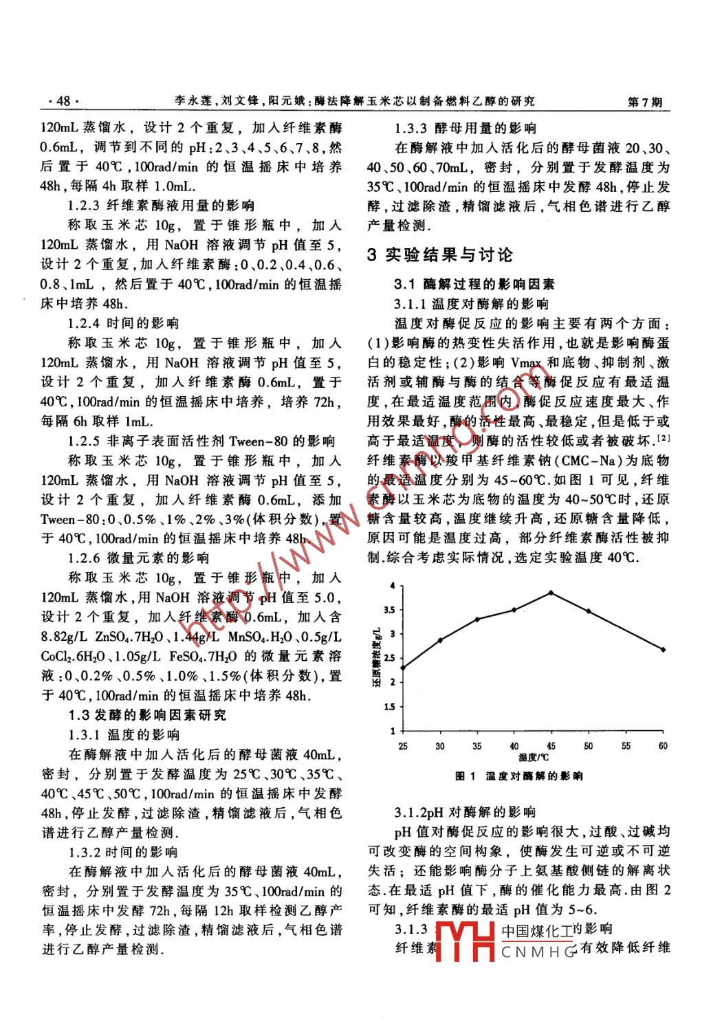 廣東技術(shù)師范學院學報(自然科學)2014年第7期Journal of Guangdong Polytechnic Normal UniversityNo7,2014酶法降解玉米芯以制備燃料乙醇的研究李永蓮1,劉文鋒2,陽元娥1(1廣東輕工職業(yè)技術(shù)學院,廣東廣州510300;2廣東工業(yè)大學,廣東廣州510006)摘要:目的:研究酶法降解玉米芯的最佳工藝和酵母菌發(fā)酵的最佳工藝.方法:采用纖維素酶對玉米芯進行酶解,采用酵母菌對酶解液進行發(fā)酵.結(jié)果:晦解條件:纖維素酶0.6nL,pH值為5~6,溫度40, Tween-80添加量為1%,微量元素的添加量為0.5%,晦解48h后還原糖濃度達到最大值;發(fā)酵條件:活化后酵母菌的接種量40mL,發(fā)酵溫度30℃,發(fā)酵36h后,乙醇產(chǎn)量的最高.結(jié)論:在較佳的酶解和較佳的發(fā)酵條件下,可顯著提高晦解率和發(fā)酵率關(guān)鍵詞:玉米芯;纖維素酶;預處理;酶解;發(fā)酵中圖分類號:TQ223文獻標識碼:A文章編號:1672-402X(2014)07-0047-05隨著社會的發(fā)展,人類對能源的需求越來越多化石燃料不可再生、儲存量越來越少,遠遠1材料和方法不能滿足人類的需求;而且化石燃料對環(huán)境污1.1材料和儀器染較大,對人類的生存環(huán)境造成威脅所以迫切玉米芯:購自廣西桂林,過60目篩后放置需要開發(fā)可再生能源.乙醇是環(huán)保、清潔、支持烘箱,75℃烘24h至水分含量恒定,待用汽油充分燃燒的液體燃料,可通過生物質(zhì)發(fā)酵液體纖維素酶:購自諾維信公司得到,是最有發(fā)展前景的可再生能源.生物質(zhì)可釀酒酵母:購自安琪酵母股份有限公司再生、種類很多,世界上每年產(chǎn)生物質(zhì)的量很酵母活化培養(yǎng)基:酵母膏10g,蛋白胨20g大,已成世界第四大能源目前我國用來發(fā)酵生葡萄糖20g,蒸餾水1000nL產(chǎn)燃料乙醇的生物質(zhì)主要是玉米、小麥等糧食儀器:立式壓力蒸汽滅菌器(江陰濱江醫(yī)療作物,對于中國人多、地少、糧食緊張的現(xiàn)狀很設(shè)備廠);T-6紫外-可見分光光度計(北京普析不利我國的植物纖維資源極其豐富,農(nóng)作物廢通用儀器有限公司);電熱恒溫鼓風干燥箱(上棄物很多,比如玉米芯,大多被燃燒處理或者丟海精宏實驗設(shè)備有限公司);GC90氣相色譜棄,環(huán)境污染大如果將這些纖維原料通過生物儀(上海科創(chuàng)色譜儀器有限公司)或化學技術(shù)降解為葡萄糖,然后進一步發(fā)酵制12酶解的影響因素研究備成乙醇,對開發(fā)新能源和保護環(huán)境具有重要1.2.1溫度的影響的現(xiàn)實意義我國玉米年產(chǎn)量居世界第二,每年稱取玉米芯10g,置于錐形瓶中,加入被廢棄的玉米芯量很大,如果利用玉米芯發(fā)酵120mL蒸餾水,用NaOH溶液調(diào)節(jié)pH值至5,設(shè)生產(chǎn)燃料乙醇則經(jīng)濟又環(huán)保,具有重要的社會計2個重復,加入纖維素酶06mL,分別置于不效益1本文以玉米芯為原料,利用纖維素酶對同溫度:25℃、30℃、35℃、40℃、45℃、50℃,其進行酶解,對酶解過程的影響因素和發(fā)酵過100ad/min的恒溫搖床中培養(yǎng)48h程的影響因素進行了研究,以探究玉米芯進行1.2.2pH的影響發(fā)酵燃料乙醇的可行性和經(jīng)濟性稱取玉米芯10g,置于錐形瓶中,加人收稿日期:2014-04-20基金項目:廣東省2006科技攻關(guān)項目[2006B13501002]資助作者簡介:李永蓮(1985-),女,廣東輕工職業(yè)技術(shù)學院研究實習員.研EYH中國煤化工能源化研究通訊作者:陽元娥(1974-),女,廣東輕工職業(yè)技術(shù)學院副教授.研究方CNMH(化研究李永蓮,劉文鋒,陽元娥:酶法降解玉米芯以制備燃料乙醇的研究第7期120mL蒸餾水,設(shè)計2個重復,加入纖維素酶13.3酵母用量的影響0.6mL,調(diào)節(jié)到不同的pH:2、3、45、6、7、8,然在酶解液中加入活化后的酵母菌液20、30、后置于40℃,100rad/min的恒溫搖床中培養(yǎng)40、50、60、70mL,密封,分別置于發(fā)酵溫度為48h,每隔4h取樣1.mI35℃、100rad/min的恒溫搖床中發(fā)酵48h,停止發(fā)12.3纖維素酶液用量的影響酵,過濾除渣,精餾濾液后,氣相色譜進行乙醇稱取玉米芯10g,置于錐形瓶中,加入產(chǎn)量檢測120mL蒸餾水,用NaOH溶液調(diào)節(jié)pH值至5,設(shè)計2個重復,加入纖維素酶:0、0.2,04.063實驗結(jié)果與討論0.8、1mL,然后置于40℃,100rad/min的恒溫搖3.1酶解過程的影響因素床中培養(yǎng)48h3.1.1溫度對酶解的影響124時間的影響溫度對酶促反應的影響主要有兩個方面:稱取玉米芯10g,置于錐形瓶中,加入(1)影響酶的熱變性失活作用,也就是影響酶蛋120mL蒸餾水,用NaOH溶液調(diào)節(jié)pH值至5,白的穩(wěn)定性;(2)影響Vmax和底物、抑制劑、激設(shè)計2個重復,加人纖維素酶0.6mL,置于活劑或輔酶與酶的結(jié)合等酶促反應有最適溫40℃,100rad/rmin的恒溫播床中培養(yǎng),培養(yǎng)72h,度,在最適溫度范圍內(nèi),酶促反應速度最大、作每隔6h取樣1mL用效果最好,酶的活性最高、最穩(wěn)定,但是低于或2.5非離子表面活性劑 Tween-80的影響高于最適溫度,則酶的活性較低或者被破壞.(21稱取玉米芯10g,置于錐形瓶中,加人纖維素酶以羧甲基纖維素鈉(CMC-Na)為底物120mL蒸餾水,用NaOH溶液調(diào)節(jié)pH值至的最適溫度分別為45-60℃.如圖1可見,纖維設(shè)計2個重復,加人纖維素酶0.6mL,添加素酶以玉米芯為底物的溫度為40~50℃時,還原Tween-80:0、0.5%、1%、2%、3%(體積分數(shù)),置糖含量較髙,溫度繼續(xù)升高,還原糖含量降低,于40℃,100rad/min的恒溫搖床中培養(yǎng)48h原因可能是溫度過高,部分纖維