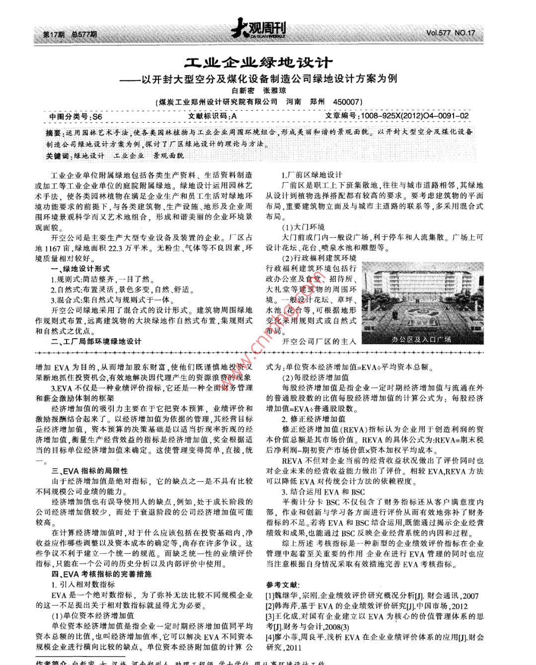 第17期觀到577NO17工業(yè)企業(yè)綠地設計以開封大型空分及煤化設備制造公司綠地設計方案為例白新密張雅瓊(煤炭工業(yè)鄭州設計研究院有限公司河南鄭州450007)中圖分類號:S6文獻標識碼:A文章編號:1008-925X(2012)O40091-02摘要:運用園林藝末手法,使各類園林植物與工業(yè)企業(yè)周圍環(huán)境組合,形成美麗和諧的景觀面貌。以開封大型空分及煤化設備川造公司綠地設計方案為例,探討了廠區(qū)綠地設計的理論與方法。關鍵詞:綠地設計工業(yè)企業(yè)景觀面貌工業(yè)企業(yè)單位附屬綠地包括各類生產資料、生活資料制造1.廠前區(qū)綠地設計或加工等工業(yè)企業(yè)單位的庭院附屬綠地。綠地設計運用園林藝廠前區(qū)是職工上下班集散地,往往與城市道路相鄰,其綠地術手法,使各類園林植物在滿足企業(yè)生產和員工生活對綠地環(huán)從設計到植物選擇搭配都有較高的要求。要考慮建筑物的平面境功能要求的前提下,與各類建筑物、生產設施、地形及企業(yè)周布局,重要建筑物立面及與城市主道路的聯系等,多采用混合式圍環(huán)境景觀科學而又藝術地組合,形成和諧美麗的企業(yè)環(huán)境景布局。觀面貌(1)大門環(huán)境開空公司是主要生產大型專業(yè)設備及裝置的企業(yè)。廠區(qū)占大門前或門內一般設廣場,利于停車和人流集散。廣場上可地1167畝,綠地面積223萬平米。無粉塵、氣體等不良因素,環(huán)設計花壇、花臺、噴泉水池和雕塑等。境質量相對較好。(2)行政福利建筑環(huán)境綠地設計形式行政福利建筑環(huán)境包括行1規(guī)則式簡潔整齊,一目了然政辦公室及食堂、招待所2自然式布置靈活,景色多變,自然、舒適。大禮堂等建筑物的周圍環(huán)3混合式集自然式與規(guī)則式于一體境。一般設計花壇、草坪開空公司綠地采用了混合式的設計形式。建筑物周圍綠地水池、花臺等,可根據地形作規(guī)則式布置,遠離建筑物的大塊綠地作自然式布置,集規(guī)則式變化采用規(guī)則式或自然式和自然式之優(yōu)點布局。二、工廠局部環(huán)境綠地設計開空公司廠區(qū)的主入辦公區(qū)及入口廣場一““++++“+“+“++-+“+““十+++十“十“十“十“+十增加EVA為目的,從而增加股東財富,使他們既謹慎地投資又式為:單位資本經濟增加值=EⅤA÷平均資本總額。果斷地抓住投資機會有效地解決因代理產生的資源浪費的現象(2)每股經濟增加值3EVA不僅是一種業(yè)績評價指標,它還是一種全面財務管理每股經濟增加值是指企業(yè)一定時期經濟增加值與流通在外和薪金激勵體制的框架的普通股股數的比值每股經濟增加值的計算公式為:每股經濟經濟增加值的吸引力主要在于它把資本預算,業(yè)績評價和增加值=EVA÷普通股股數。激勵報酬結合起來了。以經濟增加值為依據的管理,其經營目標2.修正經濟增加值是經濟增加值,資本預算的決策基礎是以適當折現率折現的經修正經濟增加值(REvA)指標認為企業(yè)用于創(chuàng)造利潤的資濟增加值,衡量生產經營效益的指標是經濟增加值,獎金根據適本價值總額是其市場價值。REVA的具體公式為REVA=期未稅當的目標單位經濟增加值來確定。這使管理變得簡單,直接,統后凈利潤-期初資產市場價值ⅹ資本加權平均成本。REVA不但對企業(yè)當前的經營收益狀況做出了評價同時也三、EVA指標的局限性對企業(yè)未來的經營收益能力做出了評價。相較EVA,REⅤA方法由于經濟增加值是絕對指標,它的缺點之一是不具有比較可以降低EVA對傳統會計方法的依賴程度。不同規(guī)模公司業(yè)績的能力。3.結合運用EVA和BSC經濟增加值也有誤導使用人的缺點,例如,處于成長階段的平衡計分卡BSC不僅包含了財務指標還從客戶滿意度內公司經濟增加值較少,而處于衰退階段的公司經濟增加值可能部,作業(yè)和創(chuàng)新與學習各方面進行評價從而有效地彌補了財務較高。指標的不足。若將EVA和BSC結合運用,既能通過揭示企業(yè)經營在計算經濟增加值時,對于什么應該包括在投資基礎內,凈績效和成果,也能通過BSC反映企業(yè)經營系統的內因和過程收益應作哪些調整以及資本成本的確定等,尚存在許多爭議。這綜上所述考核指標是一種新型的企業(yè)績效評價指標在企業(yè)些爭議不利于建立一個統一的規(guī)范。而缺乏統一性的業(yè)績評價管理中起著至關重要的作用企業(yè)在進行EⅤA管理的同時也應指標,只能在一個公司的歷史分析以及內部評價中使用。當注意根據自身情況采取有效措施完善EVA考核指標。四、EVA考核指標的完善措施1.引入相對數指標參考文獻:EVA是一個絕對數指標,為了彌補無法比較不同規(guī)模企業(yè)[魏繼華,宗剛企業(yè)績效評價研究概況分析財會通訊,2007的這一不足提出關于相對數指標就顯得尤為必要。[2]韓海芹基于EⅤA的企業(yè)績效評價研究U中國市場,2012(1)單位資本經濟增加值[3]王化成對國有企業(yè)建立以EⅤA為核心的價值管理體系的思單位資本經濟增加值是指企業(yè)一定時期經濟增加值同平均考U財務與會計,2008(3)資本總額的比值,也叫經濟增加值率,它可以解決EVA不同資本4廖小菲周良平淺析EVA在企業(yè)業(yè)績評價體系的應用財會規(guī)模企業(yè)進行橫向比較的缺點。單位資本經濟附加值的計算公研究,2011