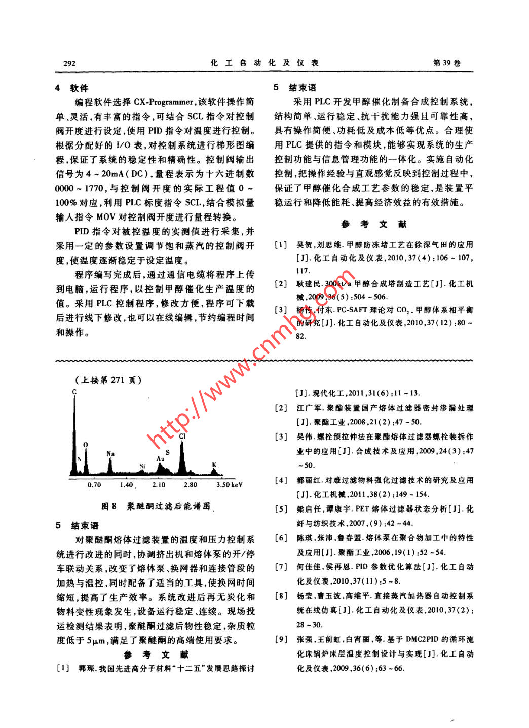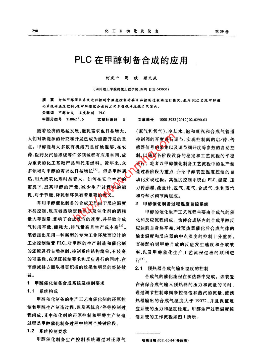 290化工自動(dòng)化及儀表第39卷PLC在甲醇制備合成的應(yīng)用.何慶中周鐵顧文武(四川理工學(xué)院機(jī)械工程學(xué)院,四川自貢643000)摘要介紹甲醇催化系統(tǒng)過程控制中溫度控制的要求和控制過程的運(yùn)行情況,采用 PLC實(shí)現(xiàn)甲酵催化系統(tǒng)的溫度控制,使甲醇催化合成的工藝參數(shù)保持在穩(wěn)定范圍內(nèi)。關(guān)鍵詞甲醇合成 溫度控制PLC中圖分類號(hào)TH862*.6文獻(xiàn)標(biāo)識(shí)碼1文章編號(hào)1000-3932(2012)02-0290-03隨著經(jīng)濟(jì)的迅猛發(fā)展,能耗需求也8益增大,(氮?dú)夂蜌錃?、冷卻水、飽和蒸汽和合成氣管道人們對新能源的研究和開發(fā)已成為能源開發(fā)的重控制閥的開度進(jìn)行調(diào)節(jié),實(shí)現(xiàn)控制閥的啟/停、傳點(diǎn)。甲醇能與大多數(shù)有機(jī)溶劑良好地混溶,在農(nóng)感器信號(hào)的采集以及調(diào)節(jié)閥開度等參數(shù)的自動(dòng)控藥、醫(yī)藥及汽油摻燒等許多領(lǐng)域都有應(yīng)用空間,成制,以滿足各階段設(shè)備的穩(wěn)定和工藝流程的平穩(wěn)為重要的化工基礎(chǔ)產(chǎn)品和代用燃料。近年來,眾進(jìn)行。筆者以甲醇催化制備工藝流程中的生產(chǎn)制多領(lǐng)域?qū)状嫉男枨笠踩找嬖鲩L"。但是甲醇遇造過程階段為重點(diǎn),介紹甲醇裝置溫度控制的自熱、明火或氧化劑時(shí)易著火。如何在安全生產(chǎn)的.動(dòng)化實(shí)現(xiàn)過程。其溫度控制系統(tǒng)由PLC,溫度、壓前提下,提高甲醇的產(chǎn)量,減少生產(chǎn)過程中的能力傳感器,流量計(jì),氫氣、氮?dú)?、合成氣、飽和蒸?耗,對于節(jié)能、降耗和環(huán)保有著重要的意義。和冷卻水調(diào)節(jié)閥組成。常用甲醇催化制備的合成工藝由于反應(yīng)溫度2甲醇催化制備過程溫度自控系統(tǒng)不易控制,反應(yīng)器熱穩(wěn)定性差以及催化劑的消耗甲醇的催化生產(chǎn)工藝流程主要由合成氣的催量大等因素,影響了合成反應(yīng)的速度,并導(dǎo)致合成化和反應(yīng)流程組成。為使合成塔內(nèi)的合成甲醇反氣利用率低、能耗大、排氣量高且生產(chǎn)成本高(2]。應(yīng)達(dá)到自身熱平衡,對預(yù)熱器催化后合成氣體的筆者提出采用一種新型的專為工業(yè)環(huán)境而設(shè)計(jì)的輸出溫度和反應(yīng)器的中點(diǎn)溫度的控制十分重要,工業(yè)控制裝置PLC,對甲醇的生產(chǎn)制造和催化劑直接影響到甲醇合成的反應(yīng)發(fā)生速度和合成效的還原進(jìn)行自動(dòng)控制,控制系統(tǒng)結(jié)構(gòu)簡單,有較高率,以及甲醇催化生產(chǎn)工藝流程過程的順利進(jìn).的可靠性,在保證控制要求和反應(yīng)進(jìn)行的同時(shí),在行叫。節(jié)能減排方面取得更積極的效果和明顯的經(jīng)濟(jì)效2.1預(yù)熱器合成氣輸出溫度的控制益合成氣的催化流程在預(yù)熱器中完成。該裝置甲醇催化制備合成系統(tǒng)及控制要求在確保合成氣輸人預(yù)熱器的壓力和流量的同時(shí),1.1 系統(tǒng)構(gòu)成通過調(diào)節(jié)控制球閥來控制飽和蒸汽的流量,使預(yù)甲醇催化制備的生產(chǎn)工藝由催化劑的還原控?zé)崞鬏敵龅暮铣蓺鉁囟却笥?90心,并且保證反制和甲醇生產(chǎn)制造過程,以及系統(tǒng)啟/停等控制過應(yīng)系統(tǒng)的壓力和溫度穩(wěn)定。甲醇生產(chǎn)過程溫度控程組成,其中催化劑的還原控制和甲醇生產(chǎn)制造制系統(tǒng)的工作流程如圖1所示。過程是甲醇催化制備過程中的兩個(gè)關(guān)鍵階段。1.2 系統(tǒng)控制要求甲醇催化制備生產(chǎn)控制系統(tǒng)通過對還原氣收稿日期:2011-10-24(修改稿).第2期何慶中等.PLC在甲醇制備合成的應(yīng)用291的生產(chǎn)制造甲醇催化合|甲醉的生產(chǎn)制造成反應(yīng)運(yùn)行山藝流程溫度控制」廠球閥最 大流一啟動(dòng)]參數(shù)設(shè)置個(gè)成運(yùn)行結(jié)預(yù)熱器合成(I反成器合成輸出調(diào)性控制溫度控制眾成反應(yīng)運(yùn)行挖制點(diǎn)溫度設(shè)置控制界面調(diào)節(jié)飽和調(diào)節(jié)合成”(流址 心系統(tǒng)運(yùn)彳結(jié)束督>系數(shù)沒界合理空之介成達(dá)行結(jié)熱器合成’NN/ 反應(yīng)器中點(diǎn)Y輸出溫度滿足2溫度滿足 10min| 束系統(tǒng)停機(jī)圖1甲醇生產(chǎn)過程溫度控制系統(tǒng)的工作流程2.2反應(yīng)器甲醇合成工藝流程溫度的控制使設(shè)備中點(diǎn)的溫度穩(wěn)定。如果調(diào)節(jié)蒸汽水流量還甲醇合成工序就是把天然氣經(jīng)造氣、凈化和是無法使溫度穩(wěn)定,可再控制合成氣輸人控制閥,壓縮后制得的主要含有CO .CO2和H2的合成氣,調(diào) 節(jié)合成氣的流量,從而保證反應(yīng)器溫度穩(wěn)定,滿通過加壓并在一定溫度下合成反應(yīng)生成粗甲醇。足甲醇合成反應(yīng)的要求。合成氣流量調(diào)節(jié)如圖2其化學(xué)反應(yīng)式為:所示。( )PID溫度調(diào)司企成(控制球閥升閔區(qū)應(yīng)器CO + 2H2 - =CH,0HMD轉(zhuǎn)換]-CO2 +3H2一=CH,OH + H2O .為了確保反應(yīng)器甲醇合成的溫度穩(wěn)定,通過圖2合成氣流量調(diào)節(jié)采集反應(yīng)器中點(diǎn)溫度,在確保反應(yīng)器的合成氣輸為了盡量克服蒸汽的擾動(dòng)對塔內(nèi)溫度的影入壓力和流量.輸入/輸出溫度的前提下,調(diào)節(jié)控響,可采用溫度-流量串級(jí)調(diào)節