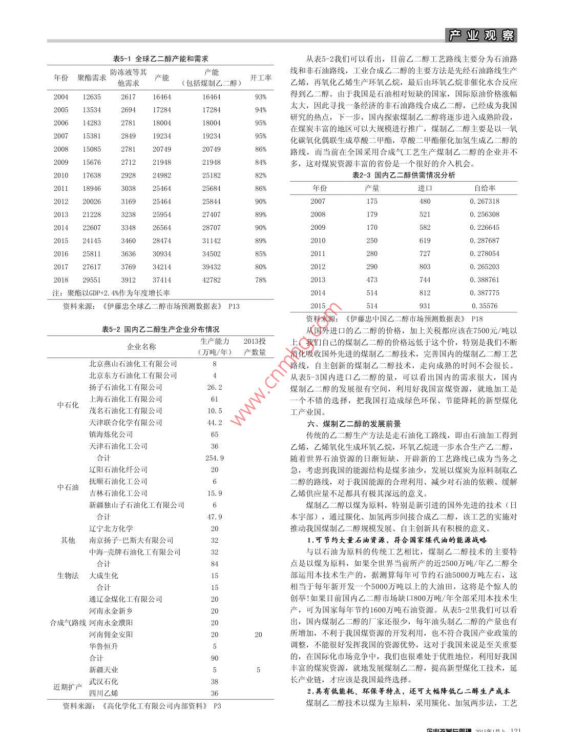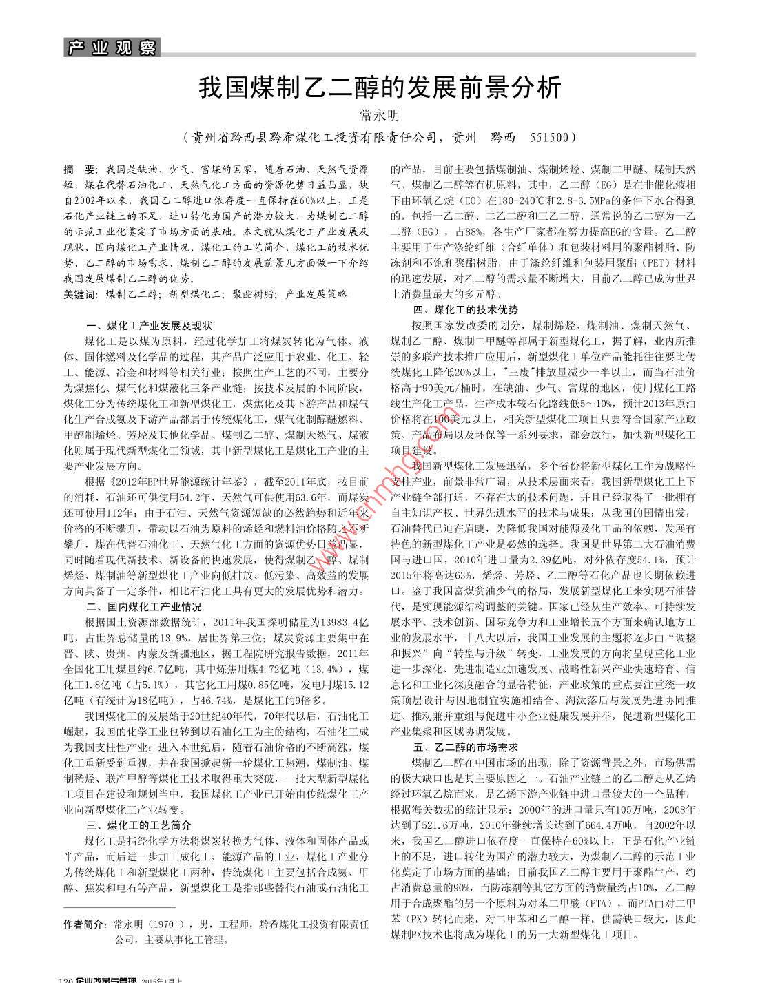 產(chǎn)業(yè)觀察我國(guó)煤制乙二醇的發(fā)展前景分析常永明(貴州省黔西縣黔希煤化工投資有限責(zé)任公司,貴州黔西5150摘要:我國(guó)是缺油、少氣、富煤的囯家,隨著石油、夭然氣資源的產(chǎn)品,目前主要包括煤制油、煤制烯烴、煤制二甲醚、煤制天然短,煤在代替石油化工、天然氣化工方面的資源優(yōu)勢(shì)日益凸顯,缺氣、煤制乙二醇等有機(jī)原料,其中,乙二醇(EG)是在非催化液相自2002年以來(lái),我國(guó)乙二醇進(jìn)口依存度一直保持在60%以上,正是下由環(huán)氧乙烷(EO)在180-240℃和2.8-3.5MPa的條件下水合得到石化產(chǎn)業(yè)鏈上的不足,進(jìn)口轉(zhuǎn)化為國(guó)產(chǎn)的潛力較大,為煤制乙二醇的,包括一乙二醇、二乙二醇和三乙二醇,通常說(shuō)的乙二醇為一乙的示范工業(yè)化奠定了市場(chǎng)方面的基礎(chǔ),本文就從煤化工產(chǎn)業(yè)發(fā)展及二醇(EG),占88%,各生產(chǎn)廠家都在努力提高EG的含量。乙二醇現(xiàn)狀、國(guó)內(nèi)煤化工產(chǎn)業(yè)情況、煤化工的工藝簡(jiǎn)介、煤化工的技術(shù)優(yōu)主要用于生產(chǎn)滌綸纖維(合纖單體)和包裝材料用的聚酯樹(shù)脂、防勢(shì)、乙二醇的市場(chǎng)需求、煤制乙二醇的發(fā)展前景幾方面做一下介紹凍劑和不飽和聚酯樹(shù)脂,由于滌綸纖維和包裝用聚酯(PET)材料我國(guó)發(fā)展煤制乙二醇的優(yōu)勢(shì)的迅速發(fā)展,對(duì)乙二醇的需求量不斷增大,目前乙二醇已成為世界關(guān)鍵詞:煤制乙二醇;新型煤化工;聚酯樹(shù)脂;產(chǎn)業(yè)發(fā)展策略上消費(fèi)量最大的多元醇。四、煤化工的技術(shù)優(yōu)勢(shì)、煤化工產(chǎn)業(yè)發(fā)展及現(xiàn)狀按照國(guó)家發(fā)改委的劃分,煤制烯烴、煤制油、煤制天然氣煤化工是以煤為原料,經(jīng)過(guò)化學(xué)加工將煤炭轉(zhuǎn)化為氣體、液煤制♂二醇、煤制二甲醚等都屬于新型煤化工,據(jù)了解,業(yè)內(nèi)所推體、固體燃料及化學(xué)品的過(guò)程,其產(chǎn)品廣泛應(yīng)用于農(nóng)業(yè)、化工、輕崇的多聯(lián)產(chǎn)技術(shù)推廣應(yīng)用后,新型煤化工單位產(chǎn)品能耗往往要比傳工、能源、冶金和材料等相關(guān)行業(yè):按照生產(chǎn)工藝的不同,主要分統(tǒng)煤化工降低20%以上,″三廢"排放量減少一半以上,而當(dāng)石油價(jià)為煤焦化、煤氣化和煤液化三條產(chǎn)業(yè)鏈:按技術(shù)發(fā)展的不同階段,格高于90美元/桶時(shí),在缺油、少氣、富煤的地區(qū),使用煤化工路煤化工分為傳統(tǒng)煤化工和新型煤化工,煤焦化及其下游產(chǎn)品和煤氣線(xiàn)生產(chǎn)化工產(chǎn)品,生產(chǎn)成本較石化路線(xiàn)低5~10%,預(yù)計(jì)2013年原油化生產(chǎn)合成氨及下游產(chǎn)品都屬于傳統(tǒng)煤化工,煤氣化制醇醚燃料、價(jià)格將在100美元以上,相關(guān)新型煤化工項(xiàng)目只要符合國(guó)家產(chǎn)業(yè)政甲醇制烯烴、芳烴及其他化茡品、煤制乙二醇、煤制天然氣、煤液策、產(chǎn)品布局以及環(huán)保等一系列要求,都會(huì)放行,加快新型煤化工化則屬于現(xiàn)代新型煤化工領(lǐng)域,其中新型煤化工是煤化工產(chǎn)業(yè)的主項(xiàng)目建設(shè)。要產(chǎn)業(yè)發(fā)展方向。我國(guó)新型煤化工發(fā)展迅猛,多個(gè)省份將新型煤化工作為戰(zhàn)略性根據(jù)《2012年BP世界能源統(tǒng)計(jì)年鑒》,截至2011年底,按目前支柱產(chǎn)業(yè),前景非常廣闊,從技術(shù)層面來(lái)看,我國(guó)新型煤化工上下的消耗,石油還可供使用54.2年,天然氣可供使用63.6年,而煤炭產(chǎn)業(yè)鏈全部打通,不存在大的技術(shù)問(wèn)題,并且已經(jīng)取得了一批擁有還可使用112年;由于石油、天然氣資源短缺的必然趨勢(shì)和近年來(lái)自主知識(shí)產(chǎn)權(quán)、世界先進(jìn)水平的技術(shù)與成果:從我國(guó)的國(guó)情出發(fā)價(jià)格的不斷攀升,帶動(dòng)以石油為原料的烯烴和燃料油價(jià)格隨之不斷石油替代已迫在眉睫,為降低我國(guó)對(duì)能源及化工品的依賴(lài),發(fā)展有攀升,煤在代替石油化工、天然氣化工方面的資源優(yōu)勢(shì)日益凸顯,特色的新型煤化工產(chǎn)業(yè)是必然的選擇。我國(guó)是世界第二大石油消費(fèi)同時(shí)隨著現(xiàn)代新技術(shù)、新設(shè)備的快速發(fā)展,使得煤制乙二醇、煤制國(guó)與進(jìn)口國(guó),2010年進(jìn)口量為2.39億噸,對(duì)外依存度54.1%,預(yù)計(jì)烯烴、煤制油等新型煤化工產(chǎn)業(yè)冋低排放、低污染、髙效益的發(fā)展Σ015年將髙達(dá)63%,烯烴、芳烴、乙二醇等石化產(chǎn)品也長(zhǎng)期依賴(lài)進(jìn)方向具備了一定條件,相比石油化工具有更大的發(fā)展優(yōu)勢(shì)和潛力???。鑒于我國(guó)富煤貧油少氣的格局,發(fā)展新型煤化工來(lái)實(shí)現(xiàn)石油替、國(guó)內(nèi)煤化工產(chǎn)業(yè)情況代,是實(shí)現(xiàn)能源結(jié)構(gòu)調(diào)整的關(guān)鍵。國(guó)家已經(jīng)從生產(chǎn)效率、可持續(xù)發(fā)根據(jù)國(guó)土資源部數(shù)據(jù)統(tǒng)計(jì),2011年我國(guó)探明儲(chǔ)量為13983.4億展水平、技術(shù)創(chuàng)新、國(guó)際競(jìng)爭(zhēng)力和工業(yè)增長(zhǎng)五個(gè)方面來(lái)確認(rèn)地方工噸,占世界總儲(chǔ)量的13.9%,居世界