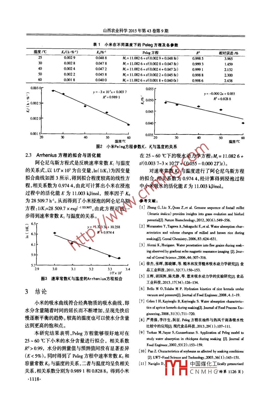 西農(nóng)業(yè)科學(xué)2015,43(9):116-111,1126Journal of Shanxi Agricultural Sciencesdoi:10.3969/iss1002-2481.201509.12小米吸水動力學(xué)研究單璐,冀佩雙,吳桐,呂國濤,張麗珍(山西大學(xué)生命科學(xué)學(xué)院山西太原030006摘要:運用 Peleg模型研究了小米在不同溫度和時間浸泡條件下的吸水性質(zhì),并對其吸水動力學(xué)進行了分析。結(jié)果表明在浸泡的初始階段小米以很高的速率吸收水分隨后小米含水量的變化逐漸趨于平緩最后小米含水量達到平衡; Peleg方程對小米在不同溫度下的吸水過程能夠較好地擬合,R均大于099,且相對誤差均小于5%其中,速率常數(shù)K1與容量常數(shù)K2均隨溫度的升高而降低;將溫度與其對應(yīng)的速率常數(shù)K進行阿尼烏斯方程擬合,R2為097,擬合度較高并得到小米在浸泡過程中的活化能為11.003 kJ/mol關(guān)鍵詞:小米;水分吸收;Peeg方程;活化能中圖分類號:S515文獻標識碼:A文章編號:1002-2481(2015)09-111604Study on the Water absorption during the Steeping of MilletSHAN Lu, JI Pei-shuang, WU Tong, LYU Guo-tao, ZHANG Li-zhenCollege of Life Sciences, Shanxi University, Taiyuan 030006, China)Abstract: Using the model of Peleg, absorption properties and kineties of millet were studied under diferent soaking temperatures(25-60C)and times(10 g-150 min). The results showed that millet absorbed water with a high rate at the initial stage of soaking, thenthe change of water content tended to flatten gradually, and finally millet moisture reached to balance. The millet water absorption curvefit the Peleg equation very well, different temperature correlation coefficients were above 0.99, and the relative errors were less than 5%In the Peleg model, the rate constant K, and capacity constant K, decreased with increasing of temperature. Furthermore, temperature andrate constant fitted the Arrhenius equation very well, the correlation coefficient was 0.97, at the same time, getting the millet activationenergy in soaking which was 11.003 kJ/moL.Key words: millet; water absorption; Peleg equation; activation energy谷子( Setaria italica(L) Beauv.)屬禾本科狗尾學(xué)進行研究,為小米深加工時的浸泡過程提供理論草屬植物叫小米是谷子脫殼后的產(chǎn)物,營養(yǎng)價值很依據(jù)。高且各種營養(yǎng)元素比例適宜,消化率很高,在我國北方常被加工成稀飯食用深受人們的喜愛浸泡可1材料和方法以使水分進入小米的內(nèi)部,對加工過程中小米淀粉1.1試驗材料及儀器的糊化和制成品的口感產(chǎn)生一定的影響,其是小小米為市售的“汾珍”牌晉谷21號;去離子水;米在加工制作時必不可少的步驟,而合理的浸泡時ME204電子天平,梅特勒-托利多儀器(上海)有間與溫度則可以使小米充分吸水并減少小米水溶限公司;DHG-9040s電熱恒溫鼓風(fēng)干燥箱,寧波東性物質(zhì)的損失。 Peleg方程是描述農(nóng)副產(chǎn)品吸水浸南儀器有限公司;HH4數(shù)顯恒溫水浴鍋,江蘇金泡時最常用的經(jīng)驗性模型,國內(nèi)外學(xué)者運用 Peleg壇市環(huán)宇科學(xué)儀器廠。方程對糙米和發(fā)芽糙米、薏米水稻杏仁干1.2水分吸收面條以及不同豆類P1等材料的吸水動力學(xué)進行取150mL的去離子水于250mL的錐形瓶,將研究,結(jié)果表明,方程能對吸水過程進行較好擬合。錐形瓶置于水浴鍋中,在預(yù)設(shè)溫度下平衡05h準本試驗運用 Peleg方程模擬小米的水分吸附曲確稱取顆粒完整飽滿的10000g小米置于錐形瓶線,以確定小米的吸水特性,并對小米的吸水動力中,溫度分別設(shè)置為25,30,40,50,60℃,在10s收稿日期:201506-09中國煤化工基金項目:“十二五”國家科技支撐計劃課題(2014BAD07B01);山西省國際科技合作項目作者簡介:單璐(190-),女,山西古交人在讀碩士,研究方向植物功能成分研究及利見。CNMHG1116單璐等:小米吸水動力學(xué)研究150min時間內(nèi)定期取出小米,用濾紙吸干表面水溫度為60℃時,小米含水量明顯高于其他溫度浸分,迅速稱量,精確到00001g,重復(fù)3次,水分含泡;同一浸泡溫度下,小米的水分含量在0~20min量以樣品干基計。內(nèi)快速增加,20~60min內(nèi)水分含量變化逐漸平13Peeg方程的建立與參數(shù)的分析緩,60min后,小米的水分含量基本維持穩(wěn)定。Peleg于1988年提出如下2個參數(shù)非指數(shù)的經(jīng)驗性方程式。M1=M±K+K,其中,M6(%)為110826,是樣品的初始含水25℃量;M(%)為樣品在t時刻的含水量;K1為速率常數(shù)(h·%1);K2為容量常數(shù)(%-)。式中的±取+,表示吸水,取-表示失水。將式(1)變形得到式(2),以t為自變量,(M-6080100120140160M)為因變量得到線性方程,該方程的截距和斜率圖1不同時間、溫度浸泡對小米水分含量的影響分別為速率常數(shù)K1與容量常數(shù)K2。探究不同溫度22小米吸水動力學(xué)方程的建立與參數(shù)分析下 Peleg方程中2個參數(shù)與溫度的關(guān)系。從表1可以看出,不同溫度下,小米浸泡過程t=k1+k(2)中水分的吸收可以用 Peleg方程較好擬合,R2均大M1-M014 Arrhenius方程的擬合與活化能的計算于0.99,且相對誤差均小于5%。另外, Peleg方程中阿侖尼烏斯方程是一個反映化學(xué)反應(yīng)速率常的參數(shù)K1與K2,隨著溫度升高呈下降的趨勢,以溫數(shù)隨溫度變化關(guān)系的經(jīng)驗型公式。度為自變量,分別以2個參數(shù)為因變量擬合曲線,可以得到K1與K2關(guān)于溫度良好的線性曲線(圖I=KexpI-E(3)2),線性方程分別如下。將式(3)變形得到式(4),以1T為自變量,hny=-3×105x+0.0037(R2=09891)(6)(1/K1)為因變量得到線性方程,可以得到小米