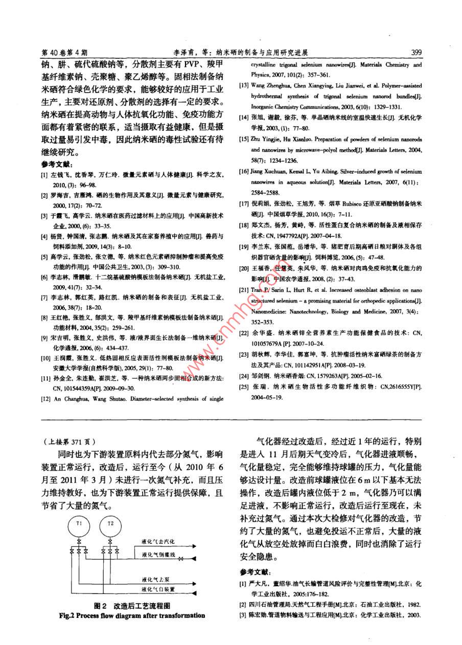 第40卷第4期當(dāng)代化1V0o1.40, No.42011年4月Contemporary Chemical IndustryApril, 2011氣化器的應(yīng)用與改進(jìn)措施王宏發(fā)',竇軍查',劉亞峰(1.延安石油化工廠(chǎng),陜西洛川727406; 2. 延安煉油廠(chǎng),陜西洛川727406)摘要:從工藝設(shè)計(jì)、實(shí)際操作及儀表控制等方面分析指出氣化器氣化量小的原因是氣化器液相入口線(xiàn)設(shè)計(jì)不合理,蒸汽減壓閥減壓效果差,蒸汽回水管線(xiàn)阻力大,換熱效果差,氣化器選型較小等,并從工藝管線(xiàn)設(shè)計(jì),管線(xiàn)抽出位置改造,運(yùn)行參數(shù)修改,操作精度等方面提出改進(jìn)措施。關(guān)鍵詞:氣化器;液相;氣相;蒸汽中圖分類(lèi)號(hào): TE 64文獻(xiàn)標(biāo)識(shí)碼: A文章編號(hào): 1671-0460 ( 20r ) 04-0370-03Application and Improvement Measures of CarburetorsWANG Hong-fa', DOUJun cha',LIU Ya-feng?(1.Yan'an Petroleum Chemical University, Shaanxi Luochuan 727406, China;2.Yan' an Petroleum Refinery, Shaanxi Luochuan 727406, China)Abstract: Reasons resulting in small gasification amount of carburetors were analyzed fom the aspects of processdesign, actual mechanical process and instrumentation control, and main causes were pointed out as follows: designdefect of the carburetor liquid entrance line, poor effect of steam reducing valve, poor heat exchange , big resistance insteam backwater pipeline ,unsuitable selection of carburetor types. Then some improvement measures were putforward from the aspects of design of process pipeline, modification of operation parameters and accuracy ofoperations.Key words: Carburetor, Liquid; Gas phase; Steam延安石油化工廠(chǎng)儲(chǔ)運(yùn)車(chē)間現(xiàn)有2 000 m2液化氣方式把熱量傳遞給管外的液態(tài)液化氣,液化氣經(jīng)加球罐20座,共有5種介質(zhì),其中氣分原料罐4座熱后蒸發(fā)、氣化,經(jīng)調(diào)壓后輸送至球罐頂部達(dá)到增使用一臺(tái)氣化器,精制丙烯罐4座使用1臺(tái)氣化器,壓目的。丙烯罐2座使用1臺(tái)氣化器,民用液化氣罐7座、1.2氣化器的作用MTBE原料罐(碳4餾分) 3座共用1臺(tái)氣化器,給球罐增壓,使罐內(nèi)壓力達(dá)設(shè)定值,各種介質(zhì)氣化器由天津奧利達(dá)生產(chǎn)的VSP- -5000氣化器,單有自己不同的飽和蒸汽壓和裝置要求的反應(yīng)壓力,臺(tái)設(shè)計(jì)氣化能力為5000kg/h。汽化器自投運(yùn)以來(lái),根據(jù)這兩項(xiàng)確定該介質(zhì)的儲(chǔ)存壓力,氣分原料罐壓由于設(shè)計(jì)原因以及現(xiàn)場(chǎng)工藝條件的變化,導(dǎo)致汽化力在0.7-1.0 MPa,設(shè)定操作壓力0.86 MPa;丙烯罐器持續(xù)出現(xiàn)故障,不能滿(mǎn)足正常生產(chǎn)要求。針對(duì)這壓力在1.5~1.8 MPa,設(shè)定操作壓力為1.6 MPa;球一情況,對(duì)汽化器的結(jié)構(gòu)、原理及工藝條件進(jìn)行了罐的儲(chǔ)存壓力必須高于該介質(zhì)在儲(chǔ)存溫度下的飽細(xì)致的分析和排查,并進(jìn)行了一系列的改進(jìn),取得和蒸汽壓,當(dāng)壓力低于該壓力值時(shí),給裝置付量的了預(yù)期的效果,保證了裝置的正常運(yùn)行。泵將出現(xiàn)抽空現(xiàn)象,當(dāng)泵抽空時(shí),備用泵也很難啟1汽化器的工作原理和結(jié)構(gòu)特點(diǎn)動(dòng),嚴(yán)重影響裝置正常運(yùn)行。1.3結(jié)構(gòu)特點(diǎn)問(wèn)1.1 氣化器工作原理"汽化器的設(shè)計(jì)具有以下幾個(gè)特點(diǎn):該氣化器是- -種蒸汽加熱式氣化器,采用同軸①氣化器內(nèi)的換熱器采用同軸套管結(jié)構(gòu),換套管式蒸發(fā)器,內(nèi)管中的飽和蒸汽由下而上的過(guò)程熱效率高;中加熱外層中的冷凝水,而冷凝水則以相對(duì)溫和的②氣化器本體設(shè)有液化氣液位、氣化壓力、收稿日期:2010-01-25作者簡(jiǎn)介:王宏發(fā)(1970-), 男,陜西吳起人,工程師,1995年畢業(yè)于延安大學(xué)有機(jī)化工專(zhuān)業(yè)。長(zhǎng)期從事設(shè)備技術(shù)管理工作。E-mail: whf663212163.com. 電話(huà): 0911-381 5423。第40卷第4期王宏發(fā),等:氣化器的應(yīng)用與改進(jìn)措施371冷凝水溫度和壓力的現(xiàn)場(chǎng)顯示;本體壓力,保證氣化器液位的調(diào)節(jié),確保氣化器的③控制點(diǎn)設(shè)有液位高限、低限,氣體溫度高正常投運(yùn)。限、低限,出口壓力高限、低限;(2)球罐頂部平衡線(xiàn)距離氣化器出口距離過(guò)④氣化器還設(shè)有液化氣安全放散、液化氣排污、長(zhǎng)( > 200 m),在最低處容易積液,積液后無(wú)法汽冷凝水排污等?;?,該處積液將氣化器與球罐頂部分開(kāi),造成氣化器無(wú)法正常工作,給這段管線(xiàn)增加蒸汽伴熱,利用2原因分析外部熱量使管線(xiàn)內(nèi)的液相氣化,不會(huì)造成積液,保(1)設(shè)計(jì)缺陷證管線(xiàn)內(nèi)壓力同罐頂壓力平衡”。設(shè)計(jì)氣化器液態(tài)液化氣引入口同泵人口在一(3)更換良好的蒸汽減壓閥,減低進(jìn)人氣化條管線(xiàn),這樣在球罐內(nèi)液位較高時(shí)(6-11 m),氣器的蒸汽壓力,保證與液化氣表面管線(xiàn)接觸的是溫化器投運(yùn)較為正常,氣化量也可以達(dá)設(shè)計(jì)值,但當(dāng)和的凝結(jié)水,而不是蒸汽直接加熱液化氣管壁,設(shè)液位在6m以下后,液化氣液相進(jìn)口壓力同罐頂壓計(jì)蒸汽進(jìn)入氣化器壓力為0.4 MPa,可以保證氣化器力相差較少,泵入口吸入量較大,很容易造成罐頂?shù)恼_\(yùn)行。與氣化器內(nèi)壓差變小,這樣進(jìn)入氣化器的液態(tài)液化(4)將從氣