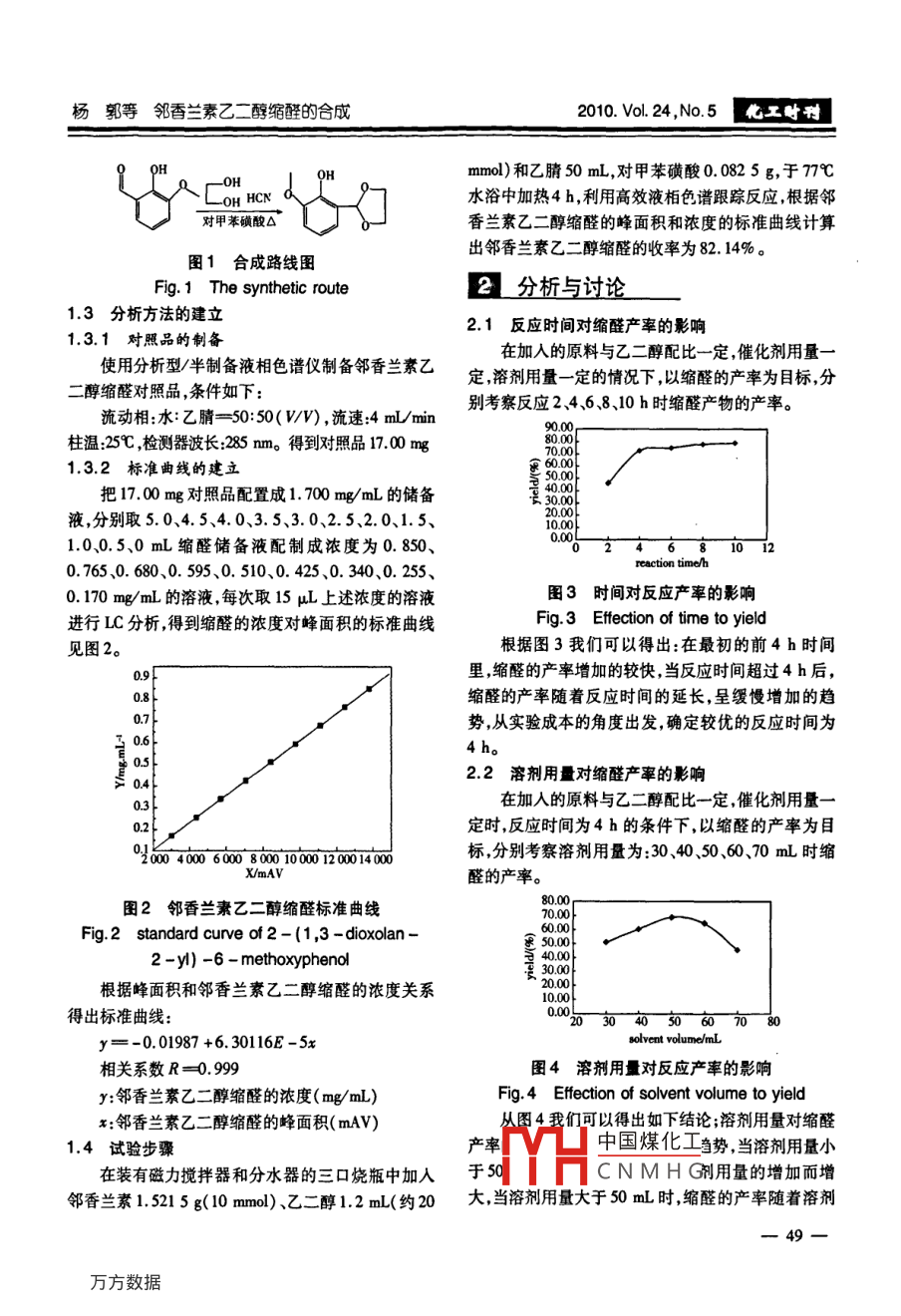 第24卷第5期化工時刊vo.24,No.52010年5月Chemical Industry TimesMay.5.2010dol:10.3969/Jisn.1002-154X2010.05.015鄰香蘭素乙二醇縮醛的合成楊郭顏杰李莉譚文淵(四川理工學(xué)院,四川自貢643000)摘要討論了影響鄰香蘭素乙二醇縮醛的合成工藝影響因素。利用單因素實(shí)驗(yàn)方法,分別研究了反應(yīng)時間溶劑用量,乙二醇用量對鄰香蘭素乙二醇縮醛的收率的影響。以鄰香蘭素乙二醇縮醛的收率為指標(biāo)結(jié)果表明較優(yōu)的合成條件是:反應(yīng)時間為4h,溶劑用量為50mL,乙二醇用量為20mL。為鄰香蘭素的進(jìn)一步開發(fā)和利用提供了參考,同時也為鄰香蘭素的醛基保護(hù)提供了一種可以參考的途徑。關(guān)鍵詞鄰香蘭素縮醛醛基保護(hù)高效液相色譜Synthesis of o-Vanillin ethylene glycol AcetalYang Guo Yan Jie Li Li Tan WenyuanSichuan University Of Science and Engineering)Abstract The affected factors on synthesis of o-vanillin ethylene glycol Acetal were discussed. The single fac-tor method was applied in the experiment, and the reaction time, the volume of solvent and ethylene glycol were alsoresearched. With the aim of yields of o-vanillin ethylene glycol, the result indicated that the optimum reaction con-dition as follows the reaction time was 4 hours, the volume of solvent was 50 mL and the amount of ethylene glycolwas 20 mL. This study provided a reference about utilization and development of o-vanillin further more, although itoffered a referent way about the aldehyde group protection of o-vanillin.Keywords o-vanillin acetal aldehyde group protection HPLC鄰香蘭素具有濃郁的芳香性,純度較高的鄰事實(shí)驗(yàn)部分香蘭紊呈淡綠色的針形晶體溶于乙腈,甲醇,乙醚等有機(jī)溶劑也溶于水21。鄰香蘭素主要用于藥物中11試劑與儀器間體的合成以及電鍍行業(yè)。由于鄰香蘭素上有醛鄰香蘭素(分析純),乙二醇(分析純),對甲苯磺基羥基,甲氧基3個基團(tuán),當(dāng)以鄰香蘭素作為原料在酸(分析純),乙腈(分析純)鄰香蘭素乙二醇縮醛對照品(自制),薄層層析板G(青島海洋化工廠)其基礎(chǔ)之上合成藥物中間體的時候,往往需要考電熱鼓風(fēng)干燥箱(上海和良電子科技有限公慮對其上的醛基進(jìn)行保護(hù)。本文以鄰香蘭素和乙二司),電子天平(梅特勒-托利多儀器有限公司),三醇為原料對甲苯磺酸作為催化劑,乙腈作為溶劑同用紫外分析儀(天津市光學(xué)儀器廠),分析型/半制備時乙腈也為帶水劑以鄰香蘭素乙二醇縮醛的收率為液相色譜儀(美國安捷倫公司)指標(biāo),考察了反應(yīng)時間溶劑用量,乙二醇用量對反應(yīng)1.2反應(yīng)原理以鄰香蘭素和乙二醇為原料,乙腈作為溶劑,對的影響。甲苯催化劑在77℃的條件下反應(yīng)4h,得到中國煤化工示收稿日期:2010-04-14CNMHG作者簡介:楊郭(1980-),男,實(shí)驗(yàn)師,主要從事天然產(chǎn)物的修飾與分離楊郭等鄰香蘭素乙二醇縮醛的合成2010.Vo.24,N5工慰刊mmol)和乙腈50mL,對甲苯磺酸0.0825g,于77℃水浴中加熱4h,利用高效液栢色譜跟蹤反應(yīng),根據(jù)鄰對甲苯磺酸△香蘭素乙二醇縮醛的峰面積和濃度的標(biāo)準(zhǔn)曲線計(jì)算出鄰香蘭素乙二醇縮醛的收率為8214%。圖1合成路線圖Fig. 1 The synthetic route2分析與討論13分析方法的建立21反應(yīng)時間對縮醛產(chǎn)率的影響.3.1對照品的制備在加入的原料與乙二醇配比一定催化劑用量使用分析型/半制備液相色譜儀制備鄰香蘭素乙定溶劑用量一定的情況下以縮醛的產(chǎn)率為目標(biāo)分醇縮醛對照品,條件如下:別考察反應(yīng)2468、10h時縮醛產(chǎn)物的產(chǎn)率。流動相:水:乙腈=50:50(V/V),流速:4mLmn柱溫25℃檢測器波長:5m。得到對照品17.00mg1.3.2標(biāo)準(zhǔn)曲線的建立把1700mg對照品配置成1.700mg/mL的儲備液,分別取50、4.5、4.0、3.5、3.0、2.5、2.0、1.51.0、0.5、0mL縮醛儲備液配制成濃度為0.850、0.765、0.680、0.595、0.510、0.425、0.340、0.255、0.170mg/mL的溶液每次取15μL上述濃度的溶液圖3時間對反應(yīng)產(chǎn)率的影響進(jìn)行LC分析得到縮醛的濃度對峰面積的標(biāo)準(zhǔn)曲線Fig 3 Effection of time to yield見圖2根據(jù)圖3我們可以得出:在最初的前4h時間里縮醛的產(chǎn)率增加的較快,當(dāng)反應(yīng)時間超過4h后,縮醛的產(chǎn)率隨著反應(yīng)時間的延長,呈緩慢增加的趨勢,從實(shí)驗(yàn)成本的角度出發(fā),確定較優(yōu)的反應(yīng)時間為22溶劑用量對縮醛產(chǎn)率的影響在加人的原料與乙二醇配比一定,催化劑用量定時,反應(yīng)時間為4h的條件下,以縮醛的產(chǎn)率為目0204006008001000標(biāo),分別考察溶劑用量為:30、40、50、60、70mL時縮醛的產(chǎn)率圖2鄰香蘭素乙二醇縮醛標(biāo)準(zhǔn)曲線Fig 2 standard curve of 2-(1, 3-dioxolan2-y)-6-methoxyphenol00000根據(jù)峰面積和鄰香蘭素乙二醇縮醛的濃度關(guān)系1000得出標(biāo)準(zhǔn)曲線:y=-0.01987+6.30116E-5x相關(guān)系數(shù)R=0.999圖4溶劑用量對反應(yīng)產(chǎn)率的影響y:鄰香蘭素乙二醇縮醛的濃度(mg/mLFig 4 Effection of solvent volume to yieldx:鄰香蘭素乙二醇縮醛的峰面積(mAv)從圖4我們可以得出如下結(jié)論;溶劑用量對縮醛1.4試驗(yàn)步驟產(chǎn)率中國煤化工當(dāng)勢,當(dāng)溶劑用量小在裝有磁力攪拌器和分水器的三口燒瓶中加人于CNMHG用量的增加而增鄰香蘭素1.5215g(10mmo)、乙二醇12m(約20大當(dāng)溶劑用量大于50mL時,縮醛的產(chǎn)率隨著溶劑七工咐背2010.vl24,No5工藝·試驗(yàn)《 Technology& Experiment用