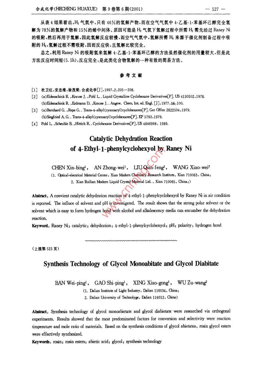合成化學(HECHENG HUAXUE)第9卷第6期(2001)521樅酸乙二醇單酯與雙酯的合成工藝研究班衛(wèi)平1,高世萍1,那效功1,吳祖望2(1.大連輕工業(yè)學院化工系,遼寧大連116034;2大連理工大學化工學院遼寧大連116012摘要:采用L3正交實驗研究了樅酸乙二醇單酯與雙酯的合成工藝探討了反應溫度、催化劑用量、反應物料摩爾比、反應時間等諸因素對轉化率及選擇性的影響。結果表明:反應溫度與反應物料摩爾比分別對轉化率及選擇性具有最顯的影響實驗提供了樅酸乙二醇單酯與雙酯的優(yōu)化合成條件,在此基礎上以松香為原料進行了驗證關鍵詞:松香;松香酯;乙二醇;樅酸;合成工藝中分類號:0629文獻標識碼:A文章編號:1005-1511(2001)06-521-03松香主要由樹脂酸組成,樹脂酸為多種同分異構體的混合物,主要分為樅酸型與海松酸型兩種類型。其中酸型組份在樹脂酸中含量高達80%~90%,是樹脂酸的主要成分,代表了松香的主要特性。樅酸型樹脂酸包括樅酸、左旋海松酸、長葉松酸與新樅酸四種組份。在加熱或酸催化條件下,左旋海松酸、長葉松酸及新樅酸均經異構化反應向樅酸轉化2,最終樅酸型樹脂酸主要以樅酸的結構型式存在。因此,樅酸(Abietic acid),又名松香酸(Rosin acid),代表了松香的基本組份與特性,在對松香的研究中通常以樅酸作為研究基礎。近年來,國際上研究應用松香衍生物作為中性施膠劑是主要發(fā)展方向之一,其中最重要的是對松香酯的研究。在諸多報道松香酯合成與應用于中性施膠的文獻6中主要為多元醇松香酯,由于產物為各種酯的混合物,在產物結構與應用性能間難以建立準確的關系本文設計用乙二醇作為酯化劑合成樅酸及松香乙二醇酯,研究合成工藝與產物結構的規(guī)律關系,以期進一步探討施膠劑結構與應用性能的關系。該化合物用于中性施膠劑的研究尚未見報道。合成反應式如下:實驗部分1.合成方法稱取500g松香按文獻[7~方法進行樅酸的分離與提純,最終得純樅酸28.4g,mp.170℃~172℃,[a]106(文獻值:[a]-106°),經氣相色譜分析純度為97%面積歸一法計算)經R分析并與 Sadtler標準譜圖對比,確證樅酸結構無誤。稱取樅酸10g,設計量乙二醇及催化劑,置于裝有攪拌器、分水器、冷凝器及氮氣導管的四頸燒瓶中,在氮氣保護下于設計溫度下反應至規(guī)定時間,GB2895-82測定產物酸值。收稿日期:2000-05-18基金項目:遼寧省自然科學基金資助項目(972150)作者簡介:班衛(wèi)平(1956一),男,漢族,河北人,大連輕工業(yè)學院化工系教授,博士,主要從事纖維素化學品及造紙精細化學品的研究522合成化學(HECHENG HUAXUE)第9卷第6期(2001)2.轉化率與選擇性的定義產物酸值轉化率(%)=1-反應物酸值100%單、雙酯選擇性(%)=產物中單、雙酯的相對百分含量(色譜分析面積歸一法計算)3.產物的分析鑒定合成的樅酸乙二醇單酯與雙酯產物經分離提純(LDC Milton--roy液相色譜儀,20 cm ODS-18反相柱)后,經IR分析和HNMR(FX90Q JBOL核磁共振儀Ms為內標,CDC3為溶劑)以確證產物的結構。樅酸乙二醇單酯IR:=2939,2927,2868(C2,CH3),1727(C=O),1459(CH3),1386,1362,1239(c--c),1148,1066(-oh)cm-1hnmr:8=0.82~1.00(s,9h,ch3),1.24(s,3h,h3),1.20~2.20(s,14h, terpinylbone),3.70(s,2h,ch2)4.18(s,2h,ch2),5.30~5.70(s,2h,ch)樅酸乙二醇雙酯IR:U=2932,2870(CH2),724(CH3),1461(CH3),1386,1364,1240(-0-C),1149cm-hnmr:=0.82~1.00(s,18hch3),1.24(s,6h,ch3),1.20~2.20(s,28h, terpinylbone),4.18(s,4h,ch2),5.30~5.70(s,4h,ch結果與討論1.樅酸乙二醇酯合成正交試驗采用L3正交實驗對樅酸乙二醇酯合成中反應溫度反應時間反應物料摩爾比及催化劑用量對酯化反應轉化率及單、雙酯產物的選擇性進行研究。正交試驗結果見表1 Table The Orthogonal Experiments of Glycol Abietates Synthesize Entry molbicse molyed T(C) t(h) Cat. Doses() Conversion() Diabietate(%)(A)(B)(C(D)CS1:0.51604.00.557.963.71:0.52006.01.089.672.61:0.52408.02.098.795.41:11606.02.082.411.62345678。RR1:12008.00.586.921.61:12404.01.093.024.91:21608.01.080.26.41:22004.00.583.08.71:22406.02.091.311.582.173.580.078.787.486.587.887.684.894.388.688.177.227.232.432.319.434.331.934.68.944.041.138.65.320.88.59.468.316.89.26.3合成化學(HECHENG HUAXUE)第9卷第6期(2001)523一通過極差分析可以看到,合成中諸工藝因素對酯化反應轉化率的影響程度依次為:反應溫度B(極差C=20.8),催化劑用量D(極差C=9.3,反應時間C(極差CA=5.3)。由于樅酸分子的結構特性產生較大的空間位阻,造成其羧基進行反應的活性降低這是松香酯化需要在較劇烈的反應條件下進行的主要原因,因此,反應溫度與催化劑的活性成為影響樅酸酯化的最關鍵因素。進而考察諸因素對縱酸乙二醇酯中單酯與雙酯的相對含量的影響,在諸工藝條件中,對酯類型選擇性最主要的影響在于反應物料比(SA=68.3)。由表1可以看到,在反應物料 molg molz二=1:2的水平下,其雙酯含量最高也不超過25%,只有在10.5時,才大部分生成雙酯。表明乙二醇優(yōu)先與樅酸生成單酯,由于樅酸龐大分子體積的引入,致使乙二醇的第二個羥基再與樅酸酯化難度增大需要在較強的條件下進行,極差分析表明的反應溫度對酯的選擇性具有較大的影響(S=16.8)即說明這一點。而催化劑較小的作用(S=6.3)表明催化劑對樅酸的酯化反應幾乎不具有選擇性。實驗結果表明:樅酸乙二醇單酯合成的優(yōu)化條件為: molg molz二=1:2,反應溫度160℃,反應時間6h,催化劑用量0.5%。在上述條件下合成樅酸乙二醇單酯,轉化率78.6%,單酯選擇性95.7%樅酸乙二醇雙酯合成的優(yōu)化條件為:反應物料mol:molz二=1:0.5,反應溫