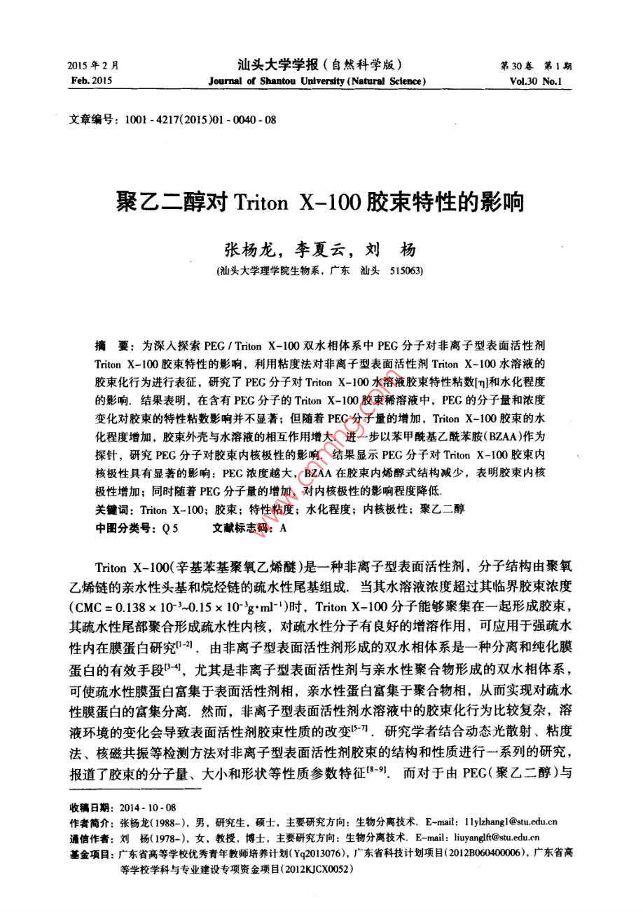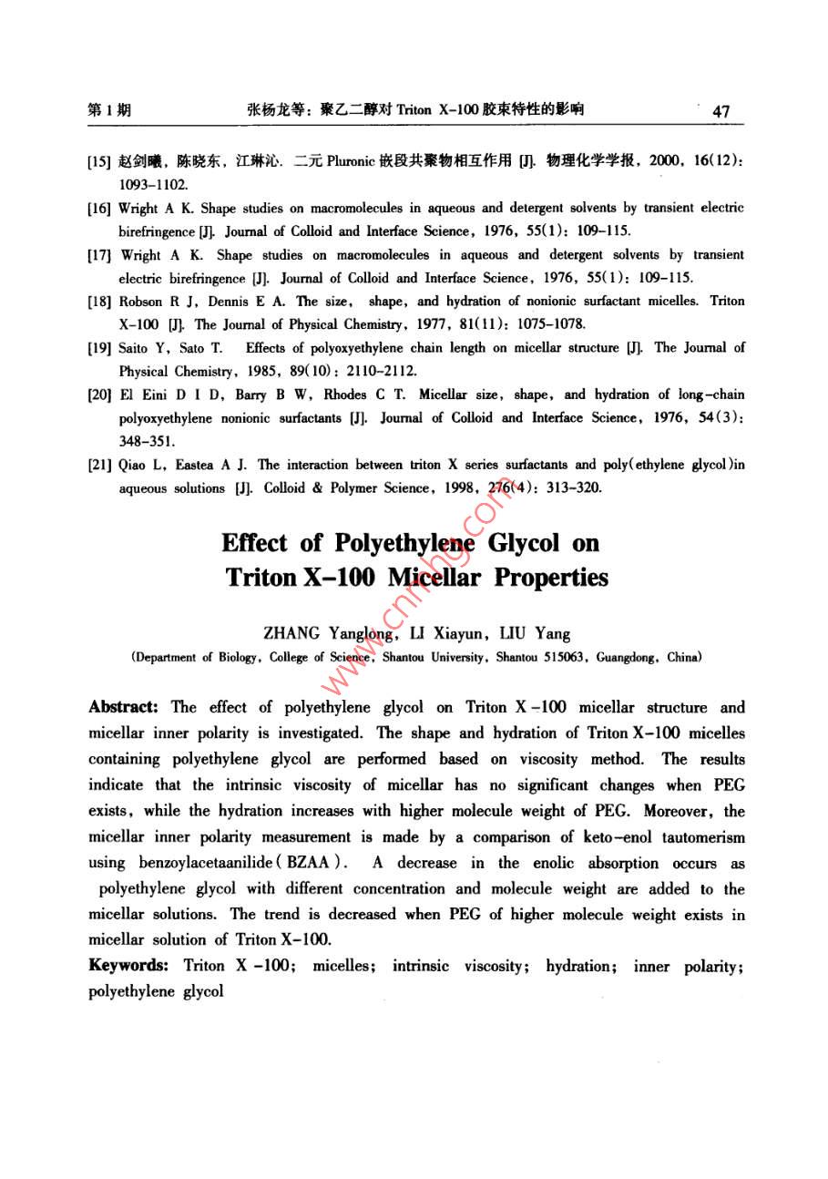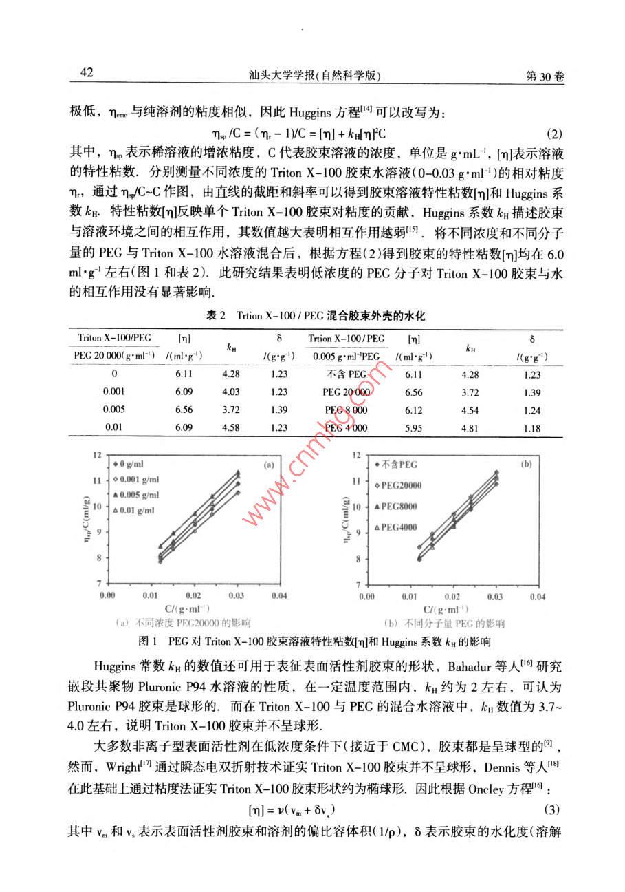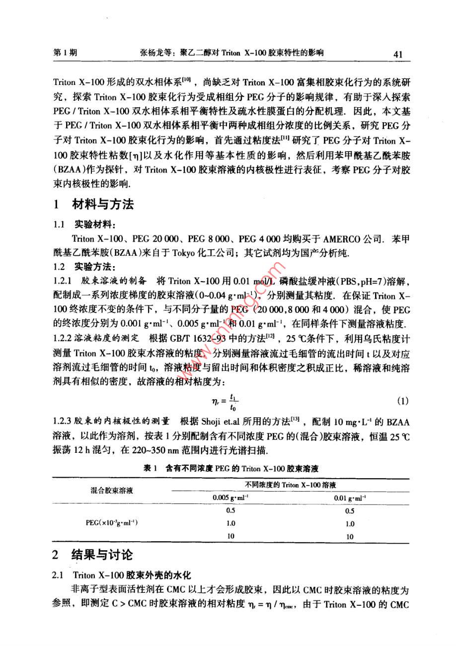 2015年2月汕頭大學(xué)學(xué)報(bào)(自然科學(xué)版)第30卷第1期Feb.2015Journal of Shantou Untversity(Natural Science)Vol 30 No. 1文章編號(hào):1001-4217(2015)01-0040-聚乙二醇對(duì) Triton X-100膠束特性的影響張楊龍,李夏云,劉楊(汕頭大學(xué)理學(xué)院生物系,廣東汕頭515063)摘要:為深入探索PEG/ Triton X-100雙水相體系中PEG分子對(duì)非離子型表面活性劑Triton X-100膠束特性的影響,利用粘度法對(duì)非離子型表面活性劑 Triton x-100水溶液的膠束化行為進(jìn)行表征,研究了PEG分子對(duì) Triton X-100水溶液膠束特性粘數(shù)q]和水化程度的影響.結(jié)果表明,在含有PEG分子的 Triton X-100膠束稀溶液中,PEG的分子量和濃度變化對(duì)膠束的特性粘數(shù)影響并不顯著;但隨著PEG分子量的增加, Triton X-100膠束的水化程度增加,膠束外殼與水溶液的相互作用增大.進(jìn)一步以苯甲?;阴1桨?BZA)作為探針,研究PEG分子對(duì)膠束內(nèi)核極性的影響.結(jié)果顯示PEG分子對(duì) Triton X-100膠束內(nèi)核極性具有顯著的影響:PEC濃度越大,BZA在膠束內(nèi)烯醇式結(jié)構(gòu)減少,表明膠束內(nèi)核極性增加;同時(shí)隨著PEG分子量的增加,對(duì)內(nèi)核極性的影響程度降低關(guān)鍵詞: Triton X-100;膠束;特性粘度;水化程度;內(nèi)核極性;聚乙二醇中圖分類號(hào):Q5文獻(xiàn)標(biāo)志碼:ATriton X-100(辛基苯基聚氧乙烯醚)是一種非離子型表面活性劑,分子結(jié)構(gòu)由聚氧乙烯鏈的親水性頭基和烷烴鏈的疏水性尾基組成.當(dāng)其水溶液濃度超過(guò)其臨界膠束濃度(CMC=0138×103-015×10gml-1)時(shí), Triton x-100分子能夠聚集在一起形成膠束其疏水性尾部聚合形成疏水性內(nèi)核,對(duì)疏水性分子有良好的增溶作用,可應(yīng)用于強(qiáng)疏水性內(nèi)在膜蛋白研究.由非離子型表面活性劑形成的雙水相體系是一種分離和純化膜蛋白的有效手段,尤其是非離子型表面活性劑與親水性聚合物形成的雙水相體系,可使疏水性膜蛋白富集于表面活性劑相,親水性蛋白富集于聚合物相,從而實(shí)現(xiàn)對(duì)疏水性膜蛋白的富集分離.然而,非離子型表面活性劑水溶液中的膠束化行為比較復(fù)雜,溶液環(huán)境的變化會(huì)導(dǎo)致表面活性劑膠束性質(zhì)的改變.研究學(xué)者結(jié)合動(dòng)態(tài)光散射、粘度法、核磁共振等檢測(cè)方法對(duì)非離子型表面活性劑膠束的結(jié)構(gòu)和性質(zhì)進(jìn)行一系列的研究,報(bào)道了膠束的分子量、大小和形狀等性質(zhì)參數(shù)特征-9.而對(duì)于由PEG(聚乙二醇)與收稿日期:2014-10-08作者簡(jiǎn)介:張楊龍(1988-),男,研究生,碩士,主要研究方向:生物分離技術(shù).E-mal:1lylzhangl@Pstu.edu.cn通信作者:劉楊(1978-),女,教授,博士,主要研究方向:生物分離技術(shù)E-mil:liuyanglft@stu.edu.cn基金項(xiàng)目:廣東省高等學(xué)校優(yōu)秀青年教師培養(yǎng)計(jì)劃(Yq2013076),廣東省科技計(jì)劃項(xiàng)目(2012B060000廣東省高等學(xué)校學(xué)科與專業(yè)建設(shè)專項(xiàng)資金項(xiàng)目(2012KJCX0052)第1期張楊龍等:聚乙二醇對(duì) Triton X-100膠束特性的影響Triton X-100形成的雙水相體系,尚缺乏對(duì) Triton x-100富集相膠束化行為的系統(tǒng)研究,探索 Triton X-100膠束化行為受成相組分PEG分子的影響規(guī)律,有助于深入探索PEG/ Triton x-100雙水相體系相平衡特性及疏水性膜蛋白的分配機(jī)理.因此,本文基于PEG/ Triton X-100雙水相體系相平衡中兩種成相組分濃度的比例關(guān)系,研究PEG分子對(duì) Triton x-100膠束化行為的影響,首先通過(guò)粘度法研究了PEG分子對(duì) Triton X100膠束特性粘數(shù)[q]以及水化作用等基本性質(zhì)的影響,然后利用苯甲?;阴1桨?BZAA)作為探針,對(duì) Triton X-100膠束溶液的內(nèi)核極性進(jìn)行表征,考察PEG分子對(duì)膠束內(nèi)核極性的影響1材料與方法11實(shí)驗(yàn)材料Triton X-100、PEG20000、PEG8000、PEG4000均購(gòu)買于 AMERCO公司.苯甲?;阴1桨?BZAA)來(lái)自于 Tokyo化工公司;其它試劑均為國(guó)產(chǎn)分析純12實(shí)驗(yàn)方法1.2.1膠束溶液的制備將 Triton X-100用0.01mol/L磷酸鹽緩沖液(PBS,pH=7)溶解,配制成一系列濃度梯度的膠束溶液(0-004gm-1),分別測(cè)量其粘度.在保證 Triton X100終濃度不變的條件下,與不同分子量的PEG(2000,.8000和4000)混合,使PEG的終濃度分別為001gml-1、0.005gml1和00lgml,在同樣條件下測(cè)量溶液粘度1.22溶液粘度的測(cè)定根據(jù)GB1632-93中的方法,25℃條件下,利用烏氏粘度計(jì)測(cè)量 Triton X-100膠束水溶液的粘度.分別測(cè)量溶液流過(guò)毛細(xì)管的流出時(shí)間t以及對(duì)應(yīng)溶劑流過(guò)毛細(xì)管的時(shí)間t,溶液粘度與留出時(shí)間和體積密度之積成正比,稀溶液和純?nèi)軇┚哂邢嗨频拿芏?故溶液的相對(duì)粘度為t(1)1.23膠柬的內(nèi)核極性的測(cè)量根據(jù) Shoji et al所用的方法,配制10mgL4的BZAA溶液,以此作為溶劑,按表1分別配制含有不同濃度PEG的(混合)膠束溶液,恒溫25℃振蕩12h混勻,在220-350nm范圍內(nèi)進(jìn)行光譜掃描.表1含有不同濃度PEG的 Triton X-100膠束溶液混合膠束溶液不同濃度的 Triton X-100溶液0.005 g"ml-0.01 gml0.5PEG(x10'g'ml2結(jié)果與討論2.1 Triton X-100膠束外殼的水化非離子型表面活性劑在CMC以上才會(huì)形成膠束,因此以CMC時(shí)膠束溶液的粘度為參照,即測(cè)定C>CMC時(shí)膠束溶液的相對(duì)粘度n=η/nm,由于 Triton X-1