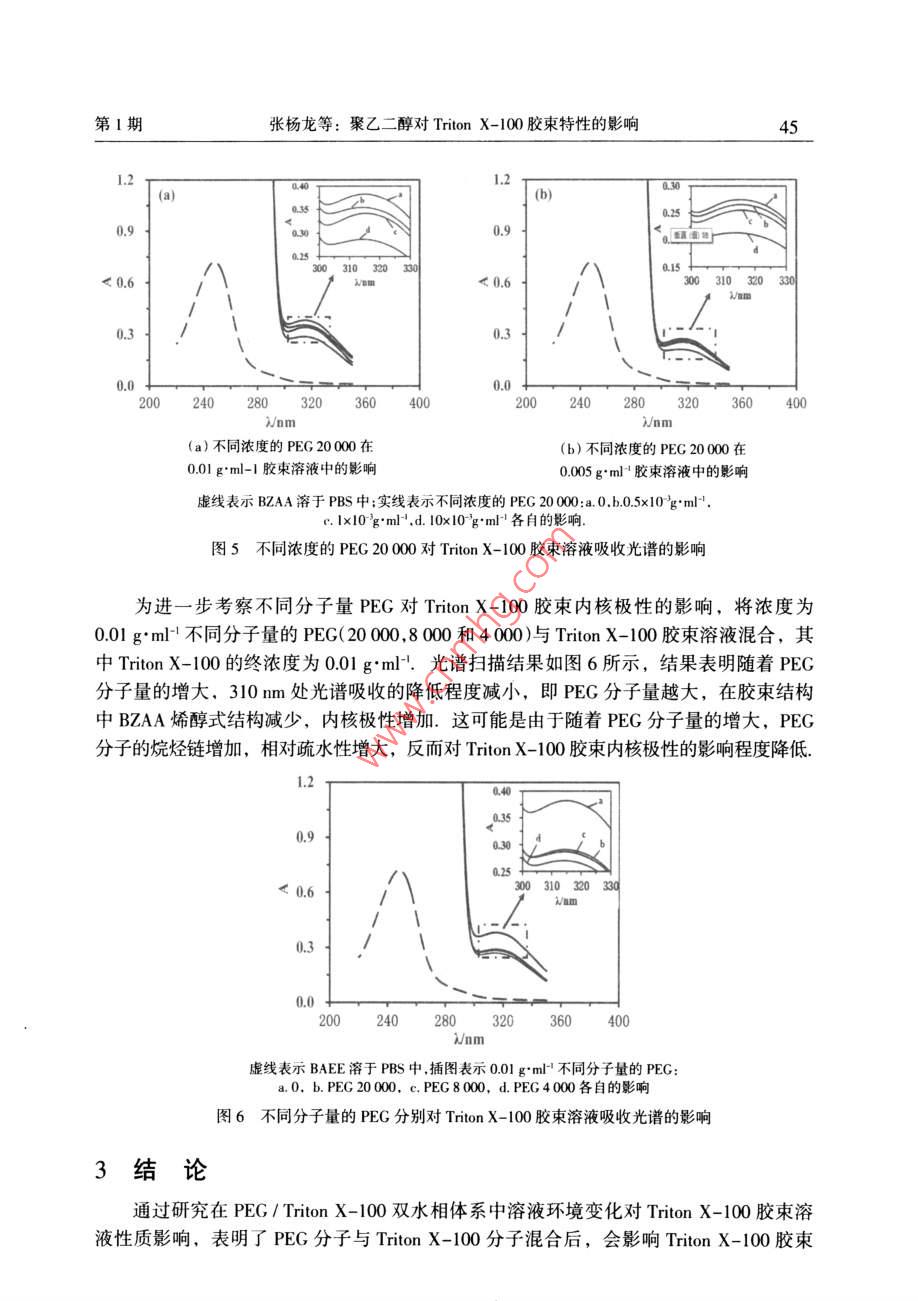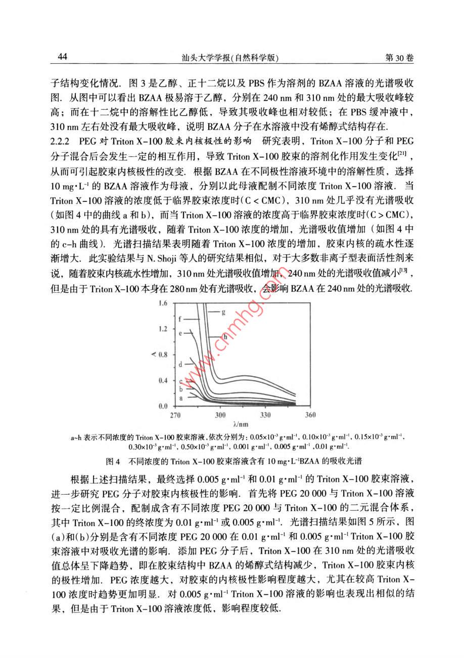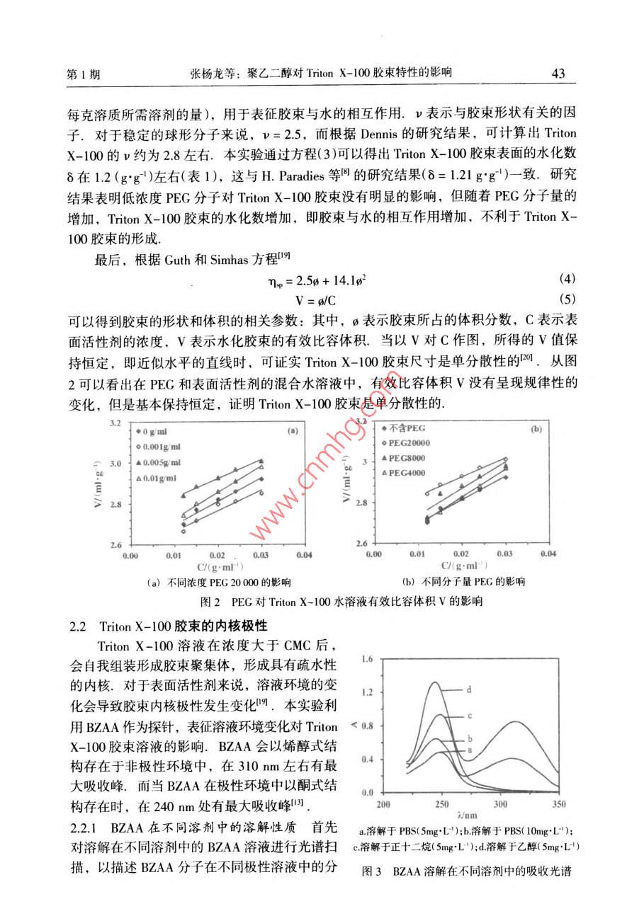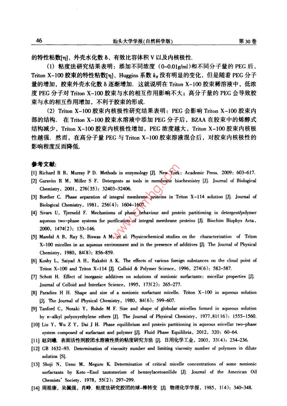 2015年2月汕頭大學(xué)學(xué)報(bào)(自然科學(xué)版)第30卷第1期Feb.2015Journal of Shantou Untversity(Natural Science)Vol 30 No. 1文章編號(hào):1001-4217(2015)01-0040-聚乙二醇對(duì) Triton X-100膠束特性的影響張楊龍,李夏云,劉楊(汕頭大學(xué)理學(xué)院生物系,廣東汕頭515063)摘要:為深入探索PEG/ Triton X-100雙水相體系中PEG分子對(duì)非離子型表面活性劑Triton X-100膠束特性的影響,利用粘度法對(duì)非離子型表面活性劑 Triton x-100水溶液的膠束化行為進(jìn)行表征,研究了PEG分子對(duì) Triton X-100水溶液膠束特性粘數(shù)q]和水化程度的影響.結(jié)果表明,在含有PEG分子的 Triton X-100膠束稀溶液中,PEG的分子量和濃度變化對(duì)膠束的特性粘數(shù)影響并不顯著;但隨著PEG分子量的增加, Triton X-100膠束的水化程度增加,膠束外殼與水溶液的相互作用增大.進(jìn)一步以苯甲?;阴1桨?BZA)作為探針,研究PEG分子對(duì)膠束內(nèi)核極性的影響.結(jié)果顯示PEG分子對(duì) Triton X-100膠束內(nèi)核極性具有顯著的影響:PEC濃度越大,BZA在膠束內(nèi)烯醇式結(jié)構(gòu)減少,表明膠束內(nèi)核極性增加;同時(shí)隨著PEG分子量的增加,對(duì)內(nèi)核極性的影響程度降低關(guān)鍵詞: Triton X-100;膠束;特性粘度;水化程度;內(nèi)核極性;聚乙二醇中圖分類號(hào):Q5文獻(xiàn)標(biāo)志碼:ATriton X-100(辛基苯基聚氧乙烯醚)是一種非離子型表面活性劑,分子結(jié)構(gòu)由聚氧乙烯鏈的親水性頭基和烷烴鏈的疏水性尾基組成.當(dāng)其水溶液濃度超過(guò)其臨界膠束濃度(CMC=0138×103-015×10gml-1)時(shí), Triton x-100分子能夠聚集在一起形成膠束其疏水性尾部聚合形成疏水性內(nèi)核,對(duì)疏水性分子有良好的增溶作用,可應(yīng)用于強(qiáng)疏水性內(nèi)在膜蛋白研究.由非離子型表面活性劑形成的雙水相體系是一種分離和純化膜蛋白的有效手段,尤其是非離子型表面活性劑與親水性聚合物形成的雙水相體系,可使疏水性膜蛋白富集于表面活性劑相,親水性蛋白富集于聚合物相,從而實(shí)現(xiàn)對(duì)疏水性膜蛋白的富集分離.然而,非離子型表面活性劑水溶液中的膠束化行為比較復(fù)雜,溶液環(huán)境的變化會(huì)導(dǎo)致表面活性劑膠束性質(zhì)的改變.研究學(xué)者結(jié)合動(dòng)態(tài)光散射、粘度法、核磁共振等檢測(cè)方法對(duì)非離子型表面活性劑膠束的結(jié)構(gòu)和性質(zhì)進(jìn)行一系列的研究,報(bào)道了膠束的分子量、大小和形狀等性質(zhì)參數(shù)特征-9.而對(duì)于由PEG(聚乙二醇)與收稿日期:2014-10-08作者簡(jiǎn)介:張楊龍(1988-),男,研究生,碩士,主要研究方向:生物分離技術(shù).E-mal:1lylzhangl@Pstu.edu.cn通信作者:劉楊(1978-),女,教授,博士,主要研究方向:生物分離技術(shù)E-mil:liuyanglft@stu.edu.cn基金項(xiàng)目:廣東省高等學(xué)校優(yōu)秀青年教師培養(yǎng)計(jì)劃(Yq2013076),廣東省科技計(jì)劃項(xiàng)目(2012B060000廣東省高等學(xué)校學(xué)科與專業(yè)建設(shè)專項(xiàng)資金項(xiàng)目(2012KJCX0052)第1期張楊龍等:聚乙二醇對(duì) Triton X-100膠束特性的影響Triton X-100形成的雙水相體系,尚缺乏對(duì) Triton x-100富集相膠束化行為的系統(tǒng)研究,探索 Triton X-100膠束化行為受成相組分PEG分子的影響規(guī)律,有助于深入探索PEG/ Triton x-100雙水相體系相平衡特性及疏水性膜蛋白的分配機(jī)理.因此,本文基于PEG/ Triton X-100雙水相體系相平衡中兩種成相組分濃度的比例關(guān)系,研究PEG分子對(duì) Triton x-100膠束化行為的影響,首先通過(guò)粘度法研究了PEG分子對(duì) Triton X100膠束特性粘數(shù)[q]以及水化作用等基本性質(zhì)的影響,然后利用苯甲?;阴1桨?BZAA)作為探針,對(duì) Triton X-100膠束溶液的內(nèi)核極性進(jìn)行表征,考察PEG分子對(duì)膠束內(nèi)核極性的影響1材料與方法11實(shí)驗(yàn)材料Triton X-100、PEG20000、PEG8000、PEG4000均購(gòu)買于 AMERCO公司.苯甲?;阴1桨?BZAA)來(lái)自于 Tokyo化工公司;其它試劑均為國(guó)產(chǎn)分析純12實(shí)驗(yàn)方法1.2.1膠束溶液的制備將 Triton X-100用0.01mol/L磷酸鹽緩沖液(PBS,pH=7)溶解,配制成一系列濃度梯度的膠束溶液(0-004gm-1),分別測(cè)量其粘度.在保證 Triton X100終濃度不變的條件下,與不同分子量的PEG(2000,.8000和4000)混合,使PEG的終濃度分別為001gml-1、0.005gml1和00lgml,在同樣條件下測(cè)量溶液粘度1.22溶液粘度的測(cè)定根據(jù)GB1632-93中的方法,25℃條件下,利用烏氏粘度計(jì)測(cè)量 Triton X-100膠束水溶液的粘度.分別測(cè)量溶液流過(guò)毛細(xì)管的流出時(shí)間t以及對(duì)應(yīng)溶劑流過(guò)毛細(xì)管的時(shí)間t,溶液粘度與留出時(shí)間和體積密度之積成正比,稀溶液和純?nèi)軇┚哂邢嗨频拿芏?故溶液的相對(duì)粘度為t(1)1.23膠柬的內(nèi)核極性的測(cè)量根據(jù) Shoji et al所用的方法,配制10mgL4的BZAA溶液,以此作為溶劑,按表1分別配制含有不同濃度PEG的(混合)膠束溶液,恒溫25℃振蕩12h混勻,在220-350nm范圍內(nèi)進(jìn)行光譜掃描.表1含有不同濃度PEG的 Triton X-100膠束溶液混合膠束溶液不同濃度的 Triton X-100溶液0.005 g"ml-0.01 gml0.5PEG(x10'g'ml2結(jié)果與討論2.1 Triton X-100膠束外殼的水化非離子型表面活性劑在CMC以上才會(huì)形成膠束,因此以CMC時(shí)膠束溶液的粘度為參照,即測(cè)定C>CMC時(shí)膠束溶液的相對(duì)粘度n=η/nm,由于 Triton X-1