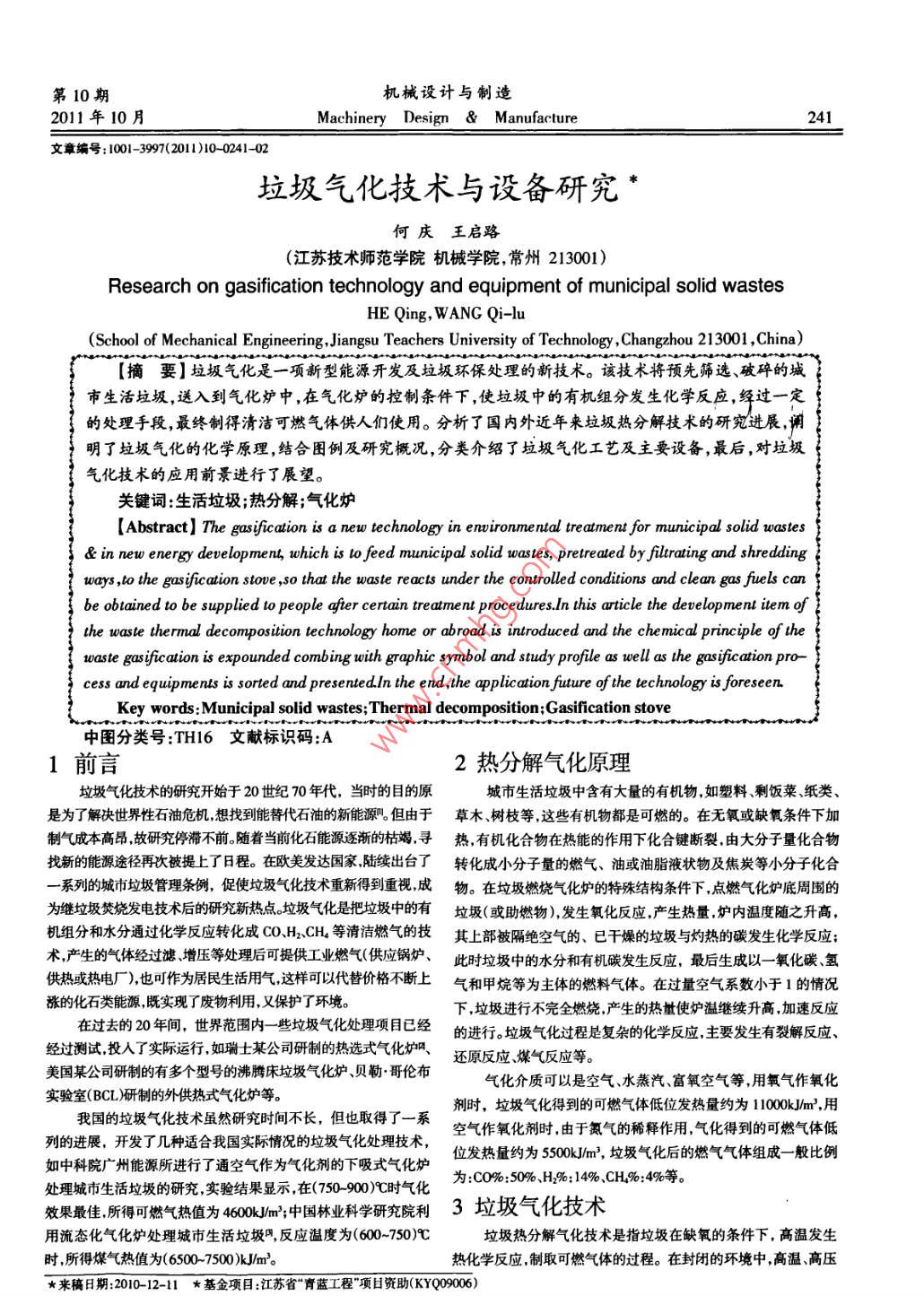 第10期機(jī)械設(shè)計(jì)與制造2011年10月MachineryDesign & Manufacture241文章編號(hào): 1001 399(2011)10-0241-02垃圾氣化技術(shù)與設(shè)備研究*何慶王啟路(江蘇技術(shù)師范學(xué)院機(jī)械學(xué)院,常州213001)Research on gasification technology and equipment of municipal solid wastesHE Qing, WANG Qi-lu(School of Mechanical Engineering,Jiangsu Teachers University of Technology ,Changzhou 213001 ,China)[摘要]垃圾氣化是一項(xiàng)新型能源 開發(fā)及垃圾環(huán)保處理的新技術(shù)。該技術(shù)將預(yù)先篩選破碎的城市生活垃圾,送入到氣化爐中,在氣化爐的控制條件下,使垃圾中的有機(jī)組分發(fā)生化學(xué)反應(yīng),經(jīng)過一定的處理手段,最終制得清潔可燃?xì)怏w供人們使用。分析了國內(nèi)外近年來垃圾熱分解技術(shù)的研究進(jìn)展,闡明了垃圾氣化的化學(xué)原理,結(jié)合圖例及研究概況,分類介紹了垃圾氣化工藝及主要設(shè)備,最后,對(duì)垃圾氣化技術(shù)的應(yīng)用前景進(jìn)行了展望。關(guān)鍵詞:生活垃圾;熱分解;氣化爐[ Abstract] The gasificaion is a new technology in enwironmental treatment for municipal solid wastes& in new energy development, which is 1o feed municipal solid wastes, pretreated by filtrating and shreddingways. ,to the gasification stove ,s0 that the waste reacts under the controlled conditions and clean gas fiuels canbe obtained to be supplied to people after certain treatment procedures.In this article the development item ofthe uwaste thermal decomposition technology home or abroad is introduced and the chemical principle of thewaste gasification is expounded combing with graphic symbol and study profile as well as the gasification pro-cess and equipments is sorted and presentedIn the end ,the application future of the technology is foreseenKey words:Municipal solid wastes;Thermal decomposition;Gasification stove中圖分類號(hào):TH16文獻(xiàn)標(biāo)識(shí)碼:A1前言2熱分解氣化原理垃圾氣化技術(shù)的研究開始于20世紀(jì)70年代,當(dāng)時(shí)的目的原城市生活垃圾中含有大量的有機(jī)物,如塑料、剩飯菜、紙類、是為了解決世界性石油危機(jī),想找到能替代石油的新能源。但由于草木、樹枝等,這些有機(jī)物都是可燃的。在無氧或缺氧條件下加制氣成本高昂,故研究停滯不前。隨著當(dāng)前化石能源逐漸的枯竭,尋熱, 有機(jī)化合物在熱能的作用下化合鍵斷裂,由大分子量化合物找新的能源途徑再次被提上了日程。在歐美發(fā)達(dá)國家,陸續(xù)出臺(tái)了轉(zhuǎn)化成小分子量的燃?xì)?、油或油脂液狀物及焦炭等小分子化合一系列的城市垃圾管理?xiàng)l例,促使垃圾氣化技術(shù)重新得到重視,成 物。在垃圾燃燒氣化爐的特殊結(jié)構(gòu)條件下,點(diǎn)燃?xì)饣癄t底周圍的為繼垃圾焚燒發(fā)電技術(shù)后的研究新熱點(diǎn)。垃圾化是把垃圾中的有垃圾(或助燃物),發(fā)生氧化反應(yīng),產(chǎn)生熱量,爐內(nèi)溫度隨之升高,機(jī)組分和水分通過化學(xué)反應(yīng)轉(zhuǎn)化成CO.H2CH4等清潔燃?xì)獾募计渖喜勘桓艚^空氣的、已干燥的垃圾與灼熱的碳發(fā)生化學(xué)反應(yīng);術(shù),產(chǎn)生的氣體經(jīng)過濾、增壓等處理后可提供工業(yè)燃?xì)?供應(yīng)鍋爐、此時(shí)垃圾中的水分和有機(jī)碳發(fā)生反應(yīng),最后生成以- -氧化碳、氫供熱或熱電廠),也可作為居民生活用氣,這樣可以代替價(jià)格不斷上氣和甲烷等為主體的燃料氣體。在過量空氣系數(shù)小于1的情況漲的化石類能源,既實(shí)現(xiàn)了廢物利用,又保護(hù)了環(huán)境。下,垃圾進(jìn)行不完全燃燒,產(chǎn)生的熱量使?fàn)t溫繼續(xù)升高,加速反應(yīng)在過去的20年間,世界范圍內(nèi)一些垃圾 氣化處理項(xiàng)目已經(jīng)的進(jìn)行。垃圾氣化過程是復(fù)雜的化學(xué)反應(yīng),主要發(fā)生有裂解反應(yīng)、經(jīng)過測試,投入了實(shí)際運(yùn)行,如瑞士某公司研制的熱選式氣化爐風(fēng)、還原反應(yīng)煤氣反應(yīng)等。美國某公司研制的有多個(gè)型號(hào)的沸騰床垃圾氣化爐、貝勒.哥倫布?xì)饣橘|(zhì)可以是空氣、水燕汽、富氧空氣等,用氧氣作氧化實(shí)驗(yàn)室(BCL)研制的外供熱式氣化爐等。我國的垃圾氣化技術(shù)雖然研究時(shí)間不長,但也取得了一系劑時(shí),垃圾氣化得到的可燃?xì)怏w低位發(fā)熱量約為1000k J/m?,用列的進(jìn)展,開發(fā)了幾種適合我國實(shí)際情況的垃圾氣化處理技術(shù),空氣作氧化劑時(shí),由于氮?dú)獾南♂屪饔?,氣化得到的可燃?xì)怏w低如中科院廣州能源所進(jìn)行了通空氣作為氣化劑的下吸式氣化爐位發(fā)熱量約為50kJ/m?,垃圾氣化后的燃?xì)鈿怏w組成一般比例處理城市生活垃圾的研究,實(shí)驗(yàn)結(jié)果顯示,在(750-900)9C時(shí)氣化為:CO%:50%、H2%: 14% .CH%:4%等。效果最佳.所得可燃?xì)鉄嶂禐?0Jm';中國林業(yè)科學(xué)研究院利3 垃圾氣化技術(shù)用流態(tài)化氣化爐處理城市生活垃圾用,反應(yīng)溫度為(600~750)心垃圾熱分解氣化技術(shù)是指垃圾在缺氧的條件下,高溫發(fā)生時(shí),所得煤氣熱值為(6500-7500)kJm’。熱化學(xué)反應(yīng),制取可燃?xì)怏w的過程。在封閉的環(huán)境中,高溫、高壓*來稿日期:2010-12-11★ 基金項(xiàng)目:江蘇省“青藍(lán)工程”項(xiàng)目資助(KYQ09006)242何慶等:垃圾氣化技術(shù)與設(shè)備研究第10期及較長的駐留時(shí)間甚