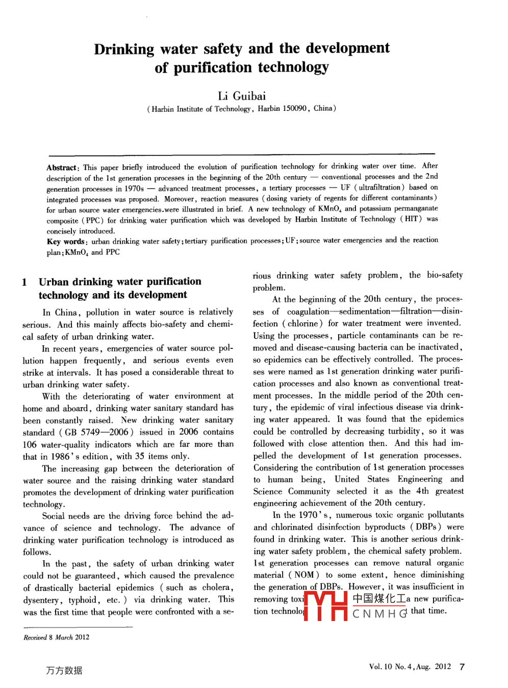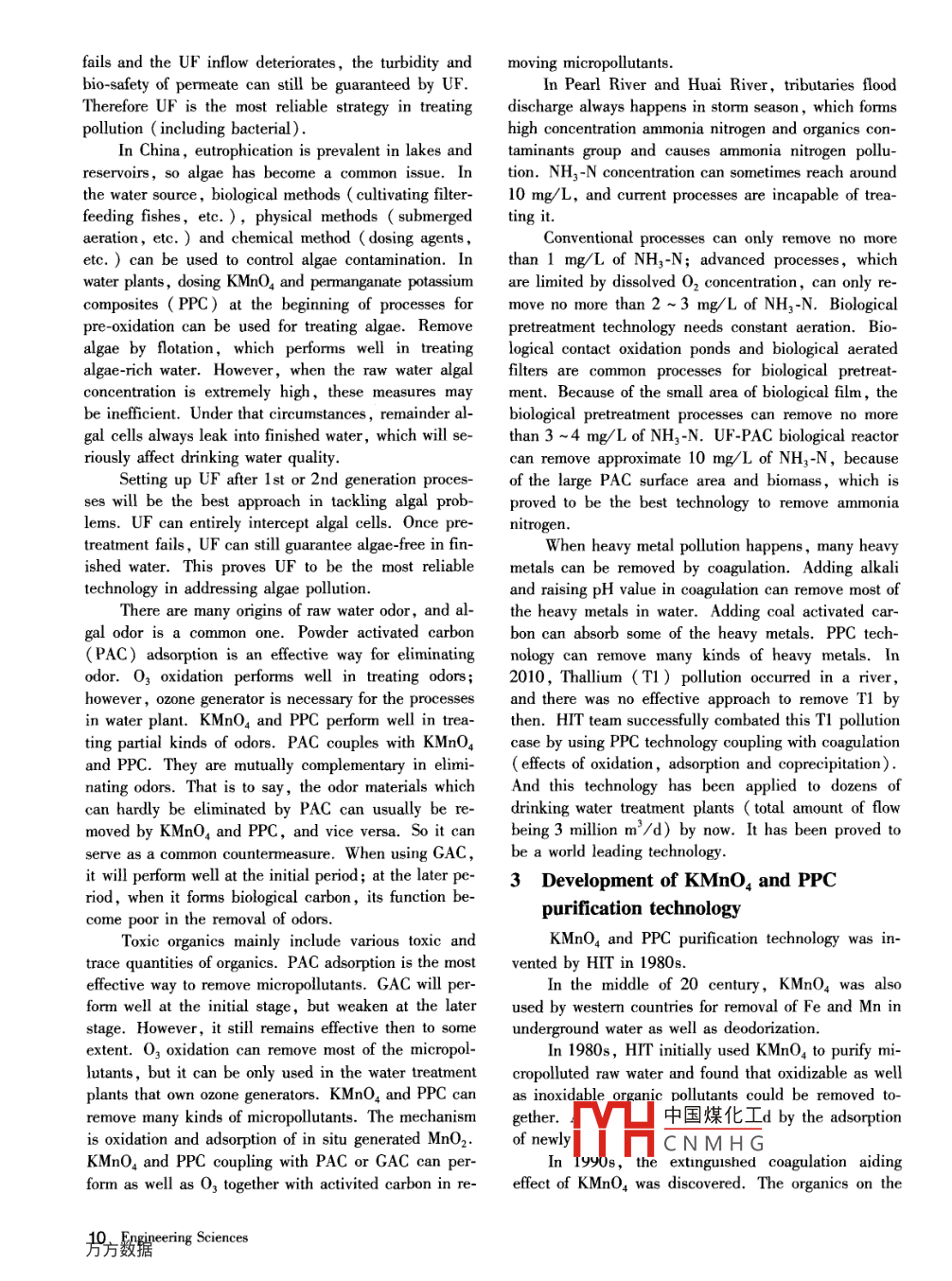 Drinking water safety and the developmentof purification technologyLi Guibai( Harbin Institute of Technology,Harbin 150090, China)Abstract: This paper briely introduced the evolution of purification technology for drinking water over time. Afterdescription of the 1st generation processes in the beginning of the 20th centuryconventional processes and the 2ndgeneration processes in 1970sintegrated processes was proposed. Moreover ,reaction measures ( dosing variety of regents for different contaminants)for urban source water emergencies.were ilustrated in brief. A new technology of KMnO, and potassium permanganatecomposite (PPC) for drinking water purification which was developed by Harbin Institute of Technology (HT) wasconcisely introduced.Key words: urban drinking water safety ;tertiary purifcation processes; UF ;source water emergencies and the reactionplan;KMnO4 and PPCrious drinking water safety problem, the bio-safetylUrban drinking water purificationproblem.technology and its developmentAt the beginning of the 20th century, the proces-In China,pollution in water source is relativelysef coagulation- -sedimentation- -filtration- -disin-serious. And this mainly affects bio-safety and chemi-fection ( chlorine ) for water treatment were invented.cal safety of urban drinking water.Using the processes,particle contaminants can be reIn recent years,emergencies of water source pol-moved and disease-causing bacteria can be inactivated,lutionhappen frequently, and serious events evenso epidemics can be efectively controlled. The proces-strike at intervals. It has posed a considerable threat toses were named as 1st generation drinking water purifi-urban drinking water safety.cation processes and also known as conventional treat-With the deteriorating of water environment atment processes. In the middle period of the 20th cen-home and aboard,drinking water sanitary standard hastury, the epidemic of viral infectious disease via drink-been constantly raised. New drinking water sanitarying water appeared. It was found that the epidemicsstandard ( GB 5749- 2006) issued in 2006 containscould be controlled by decreasing turbidity, so it was106 water-quality indicators which are far more thanfollowed with close attention then. And this had im-that in 1986 ' s edition, with 35 items only.pelled the development of 1st generation processes.The increasing gap between the deterioration oConsidering the contribution of 1 st generation processeswater source and the raising drinking water standardo human being, United States Engineering andpromotes the development of drinking water purificationScience Community selected it as the 4th greatesttechnology.engineering achievement of the 20th century.Social needs are the driving force behind the ad-In the 1970' s, numerous toxic organic pollutantsvance of science and technology. The advance ofand chlorinated disinfection byproducts ( DBPs) weredrinking water purification technology is introduced asfound in drinking water. This is another serious drink-follows.ing water safety problem, the chemical safety problem.In the past, the safety of urban drinking waterst generation processes can remove natural organiccould not be guaranteed,which caused the prevalencematerial ( NOM) to some extent, hence diminishingof drastically bacterial epidemics ( such as cholera ,the generation of DBPs. However, it was insufficient indysentery,typhoid, etc. ) via drinking water. Thisremoving to)中國煤化工a new purifica-was the first time that people were confronted with a se-tion technoloMCNMHGthattime.Receited 8 March 2012Vol. 10 No. 4,Aug.2012 7It is found that 03 oxidation and activated carbonlows: virus being 20 ~ several hundred nm,bacteriumadsorption perform well in treating toxic micropolluta-being several hundred nm ~ several μum, protozan be-nts. The 1 st generation processes coupling with O3-ing several μm ~ umpty μm,algae being severalGAC ( granular activated carbon) have the advantageμum ~ several hundred μm.of removing toxic micropollutants ,thus controlling theThe pore size of microfiltration ( MF) is 100 ~DBPs. The processes are referred as advanced treat-200 nm which is not small enough to intercept bacteriamenor 2nd generation processes. 2nd generationand virus. The pore size of nanofiltration( NF) isprocesses have been commonly used aboard, while it is1 nm or so,and this size of ultrafiltration ( UF) isgradually applied at home.several nm. Both of them can almost remove all the mi-At the end of the 20th century, the major drinkingcroorganisms in water, so they are considered as thewater safety problem which was represented by giardia-best method for enhancing bio-safety. It is suggestedsis and cryptosporidium appeared. This was consideredthat the pore size of UF membrane used for drinkingas new bio-safety problem.water treatment should not be bigger than 20 nm. NFGiardiasis and cryptosporidium are pathogenicmembrane is expensive and high energy-consuming,protozoa with wide distribution in nature, and they canwhile the price of UF membrane has been reduced toparasitize in animals or human. The cyst cell of giar-an acceptable level, so that UF has become the mostdiasisisovate,8~12μminlength,7~10μminsuitable processes for large-scale urban water treatmentwidth; the oocyst of cryptosporidium is globular inlant.shape, 4 ~6 μm in length.UF processes can almost remove all the microor-The aforementioned cyst or oocyst cells will con-ganisms in water, which will surely enhance bio-safetytaminate the raw water through the excretion of ani-of drinking water. And this will bring about a greatmals. When water treatment processes fail, the cellsrevolution for drinking water purification processes.can penetrate through the filter bed. With strong chlo-The application of UF in drinking water plant canrine resistance,the cyst has drastic pathogenicity asreplace 1 st generation processes:well. This disease happened frequentlyaround theRaw water-→UF-→disinfection- + fin