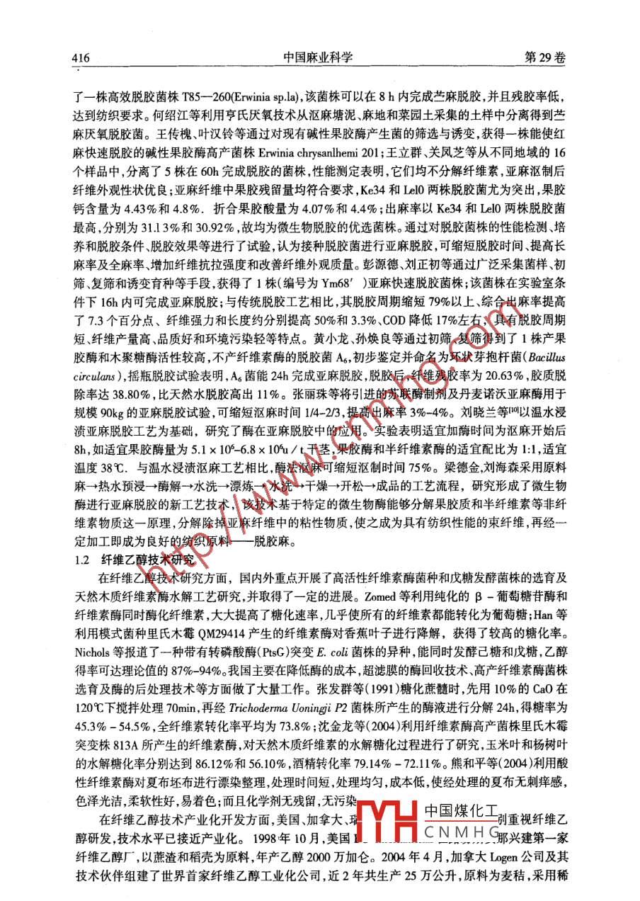 2007年第29卷增刊2中國(guó)麻業(yè)科學(xué) PLANT FIBER SCIENCES IN CHINA415文章編號(hào):1673-7636(2007)增刊2-0415-05莖纖維生物提取和發(fā)酵燃料乙醇技術(shù)研究進(jìn)展彭源德(中國(guó)農(nóng)業(yè)科學(xué)院麻類研究所湖南長(zhǎng)沙410205)摘要:利用微生物及其酶技術(shù),提取莖纖維和發(fā)酵燃料乙醇是解決環(huán)境污染嚴(yán)重與能源短缺的有效途徑之一。本文通過對(duì)莖纖維生物提取和發(fā)酵燃料乙醇的國(guó)內(nèi)外研究現(xiàn)狀和最新進(jìn)展進(jìn)行綜述,針對(duì)莖纖維生物提取和發(fā)酵燃料乙醇研究的問題,提出了積極引進(jìn)國(guó)外先進(jìn)技術(shù);建立規(guī)范化的生物脫膠示范工廠,開展生物脫膠精干麻的梳紡工藝技術(shù)研究和低木質(zhì)素和高纖維素能源品種的選育及其高效生產(chǎn)技術(shù)研究等建議。關(guān)鍵詞:莖纖維;生物提取;發(fā)酵;燃料乙醇中圖分類號(hào):S188文獻(xiàn)標(biāo)志碼:B隨著全球經(jīng)濟(jì)的高速發(fā)展作為經(jīng)濟(jì)引擎的石油能源,正在加速走向枯竭。統(tǒng)計(jì)結(jié)果表明:按照目前已探明的世界石油儲(chǔ)量和開采速度,全球石油的平穩(wěn)供應(yīng)只能維持40年左右能源危機(jī)已經(jīng)成為擺在我們面前的重大難題。發(fā)展可再生能源特別是生物能源是解決能源危機(jī)的重要出路。燃料乙醇由于其成熟的生產(chǎn)應(yīng)用技術(shù)和豐富的原料來源成為世界各國(guó)首選的石油替代品,目前國(guó)內(nèi)外燃料乙醇的生產(chǎn)原料主要包括三大類第一大類是含糖類,包括甘蔗、甜菜和甜高粱等;第二大類是含淀粉類,包括谷物、薯類等;第三大類是纖維素類,包括秸桿、薪柴、農(nóng)業(yè)廢棄物、有機(jī)生活垃圾等。以淀粉類和含糖類為原料生產(chǎn)燃料乙醇,雖然工藝技術(shù)基本成熟但存在糧食安全問題,現(xiàn)已叫停。為此,全世界都將燃料乙醇的原料集中在產(chǎn)量大、來源廣的纖維質(zhì)上。莖纖維質(zhì)生產(chǎn)燃料乙醇包括纖維提取(預(yù)處理)糖化和乙醇發(fā)酵等主要工序。現(xiàn)有的莖纖維提取的傳統(tǒng)方法(天然水漚制法或以燒堿蒸煮為中心的化學(xué)方法)和酸水解糖化工藝,均存在加工成本高纖維產(chǎn)量低、纖維品質(zhì)差、環(huán)境污染嚴(yán)重等突出問題。特別是在“節(jié)能節(jié)水、降耗減排”的今天,將纖維質(zhì)通過生物轉(zhuǎn)化得到乙醇部分替代石油既有利于人們的身心健康和社會(huì)的可持續(xù)發(fā)展,又是當(dāng)前國(guó)內(nèi)外研究的熱點(diǎn)。1國(guó)內(nèi)外研究現(xiàn)狀1.1莖纖維生物提取研究為了解決莖纖維質(zhì)化學(xué)提取方法存在的加工成本高、纖維產(chǎn)量低、纖維品質(zhì)差、環(huán)境污染嚴(yán)重等突出問題,國(guó)內(nèi)外廣泛開展了利用微生物及其酶降解非纖維素提取麻類等莖纖維的研究。 Fredi等篩選出一株嗜堿性細(xì)菌 Amycolata sp,該菌株在苧麻脫膠過程中產(chǎn)生的果膠裂解酶,作用效率遠(yuǎn)遠(yuǎn)高于它所產(chǎn)生的木聚糖酶的作用效率。美國(guó)的 Foulk-JA等開展了亞麻酶法脫膠的條件研究,亞麻原料經(jīng)加壓處理后,有利于脫膠酶的吸收,加快脫膠的速度。20世紀(jì)80年代,歐洲的諾維信公司(丹麥)利用酶 Flaxzyme進(jìn)行亞麻脫膠研究,已形成了幾項(xiàng)專利( Van Sumer,1992)。 Van Sumer和Sharma(1991)報(bào)道 Flaxzyme(含果膠酶、半纖維素酶及纖維素酶)在濃度為3g/L,酶液與莖的比例為10:1時(shí),脫膠產(chǎn)生的纖維細(xì)度、強(qiáng)度顏色和柔軟度可與最好的水浸脫膠纖維相當(dāng)。盡管 Flaxzyme的脫膠效果明顯,但因酶的成本較高限制了工業(yè)化酶中國(guó)煤化工國(guó)內(nèi)有幾十多家單位開展了生物提取莖纖維微生CNMHG彭源德等師選收稿日期:2007-1005基金項(xiàng)目:國(guó)家“948”項(xiàng)目(2006-C18-2-2);國(guó)家“十一五”支撐計(jì)劃項(xiàng)目(2006AD06B03);公益性行業(yè)(農(nóng)業(yè))科研專項(xiàng)(nyby 2x07-018)作者簡(jiǎn)介:彭源德(1965-),男,研究員,從事農(nóng)產(chǎn)品生物加工與生物能源研究。416中國(guó)麻業(yè)科學(xué)第29卷了一株高效脫膠菌株T85-260( Erwinia sp Ia),該菌株可以在8h內(nèi)完成苧麻脫膠,并且殘膠率低,達(dá)到紡織要求。何紹江等利用亨氏厭氧技術(shù)從漚麻塘泥、麻地和菜園土采集的土樣中分離得到苧麻厭氧脫膠菌。王傳槐、葉漢鈴等通過對(duì)現(xiàn)有堿性果膠酶產(chǎn)生菌的篩選與誘變,獲得一株能使紅麻快速脫膠的堿性果膠酶高產(chǎn)菌株 Erwinia chrysanthemi201;王立群、關(guān)鳳芝等從不同地域的16個(gè)樣品中,分離了5株在60h完成脫膠的菌株,性能測(cè)定表明,它們均不分解纖維素,亞麻漚制后纖維外觀性狀優(yōu)良;亞麻纖維中果膠殘留量均符合要求Ke34和Iel0兩株脫膠菌尤為突出,果膠鈣含量為443%和48%.折合果膠酸量為407%和44%;出麻率以Ke34和Lel0兩株脫膠菌最高,分別為31.13%和3092%,故均為微生物脫膠的優(yōu)選菌株。通過對(duì)脫膠菌株的性能檢測(cè)、培養(yǎng)和脫膠條件、脫膠效果等進(jìn)行了試驗(yàn),認(rèn)為接種脫膠菌進(jìn)行亞麻脫膠,可縮短脫膠時(shí)間、提高長(zhǎng)麻率及全麻率、增加纖維抗拉強(qiáng)度和改善纖維外觀質(zhì)量。彭源德、劉正初等通過廣泛采集