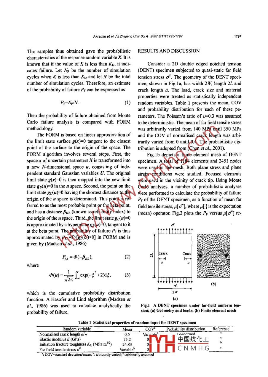 Akramin et al. 1J Zhejiang Unv SciA 2007 811):1795-17991795ISSN 1673-565X (Prit); ISSN 1862-1775 (Online)www. zu edu. cnjzus; www springerink. comE-mail: jzus@zju.edu.cnProbabilistic analysis of linear elastic cracked structuresAKRAMIN M.R.M., ALSHOAIBI Abdulnaser, HADI M.S.A., ARIFFIN A.K, MOHAMED N.A.N.(Department of Mechanical and Materials Engineering, Universiti Kebangsan Malaysia, Bangi 43600 Selangor Danu! Ehsan, Malaysia)E-mail: md. akramin@yahoo.comReceived Feb. 10, 2007; revision acepted June 23, 2007Abstract; This paper presents a probabilistic methodology for linear fracture mechanics analysis of cracked structures. The mainfocus is on probilistic aspect related to the nature of crack in matenial. The methodology involves finite element analysis; sta-tistical models for uncertainty in material properties, crack size, fracture toughness and loads; and standard reliablity methods forevaluating probabilistic characteristics of linear elastic fracture parameter. The uncertainty in the crack size can have a significanteffect on the probability of failure, particularly when the crack size has a large cofficient of variation. Numerial example ispresented to show that probabilistic methodology based on Monte Carlo simulation provides accurate estimates of failure prob-ability for use in linear elastic fracture mechanics.Key words: Probabilitic facture mechanics, Linear elastic fracture mechanics, Failure probability, First-order reiabilitymethodsdoi:10.1631/jzus.2007.A1795Document code: ACLC oumber: R683INTRODUCTIONA number of methods have been developed orimplemented for estimating statistics of variousProbabilistic fracture mechanics is becomingfracture response and reliability. Most of theseincreasingly popular for realistic evaluation of frac-methods are based on linear elastic fracture mechan-ture response and reliability of cracked structures.ics and finite element method (FEM) that employs theUsing probabilistic fracture mechanics, statisticalstress intensity factor as the primary crack drivinguncertainties can be incorporated in engineering de-force (Bestrfield et al, 1990). Although finite ele-sign and evaluation (Rahman, 2001). The theory ofment based methods are well developed, research infracture mechanics provides a mechanistic relation-probabilistic analysis has not been widespread and isship between the maximum permissible load actingonly currently gaining attention. Grigoriu et al.(1990)on a structural component to the size and location ofaapplied first- and second-order reliability methodscrack in that component. Cutrently, there are many(FORM/SORM) to predict the probability of fracturemethods and applications for probabilistic fractureinitiation and a confidence interval of the direction ofmechanics in oil and gas, nuclear, automotive, naval,crack extension, The methods can account for randomaerospace, and other industries, nearly all of whichloads, material properties, and crack geometry.have been developed based on linear elastic fractureHowever, the randomness in crack geometry wasmechanics models (Rahman and Kim, 2001). Prob-modelled by response surface approximations ofability theory determines bow the uncertainties instress intensity factor as explicit functions of crackcrack size, loads, and material properties, whengeometry. Furthemmore, the usefulness of responsemodelled accurately, affect the integrity of cracked surface based methods is limited, since they cannot bestructures. Probabilistice fracture mechanics providesapp中國(guó)煤化工ics analysis (Chena more rational means to describe the actual behav-et aMHE(2001) developediour and reliability of structures than traditional dePROc N M H Garlo with impor-terministic methods (Provan, 1987).tance sampling to calculate the probability of failure1796Akramin et el.1J Zhejiang Univ SciA 2007 8(1):1795-1799based on initiation of crack growth.shape became highly distorted due to large displace-This paper presents a computational methodol-ment. After a few deformnation increments, the wholeogy for probabilistic characterization of fracture ini-domain was remeshed based on a stress error normn.tiation in cracked structures. The methodology isThe strategy used to refine the mesh during analysisbased on linear FEM for deterministic stress analysis,process is adopted fom (Alshoaibi et al, 2007).statistical models for loads and materiai properties andMonte Carlo method for probabilistic analysis. E:ample is presented to ilustrate the proposed method-PROBABILISTIC ANALYSIS AND RELIABILITYology for 2D cracked structures. The results fromConsider a linear elastic cracked structure underthese examples show that the methodology is capableuncertain mechanical and geometric characteristicsof predicting deterministic and probabilistic charac-subject to random loads. Denote by X, anteristics for use in linear elastic fracture mechanics.N-dimensional random vector with components X,x....v characterizing uncertainties in the load,FINITE ELEMENT CALCULATIONcrack geometry and material properties. For example,if the crack size a, elastic modulus E, far field appliedIn order to perform linear elastic analysis, thestress magnitude o", and mode I fracture toughness atfinite element analysis needs to be well developedcrack intation Kie, are modelled as input random(Tada et al, 2000). In this study triangular meshvariables, then X={a, E, o", Klc}. Let stress intensitygeneration using the advancing front method wasfactor K be a relevant crack driving force that can beused (Zienkiewicz and Zhu, 1987). The mesh finallycalculated using standard finite element analysis.optimised by smoothing and associated boundarySuppose that the structure fails when K> Kie (Guineaconditions are found by interpolation from the initialet al, 2000). This requirement cannot be satisfiedgeometry conditions, then finally producing the out-with certainty, since K is dependent on the inputput files. The remeshing algorithms place a rosette ofvector X which