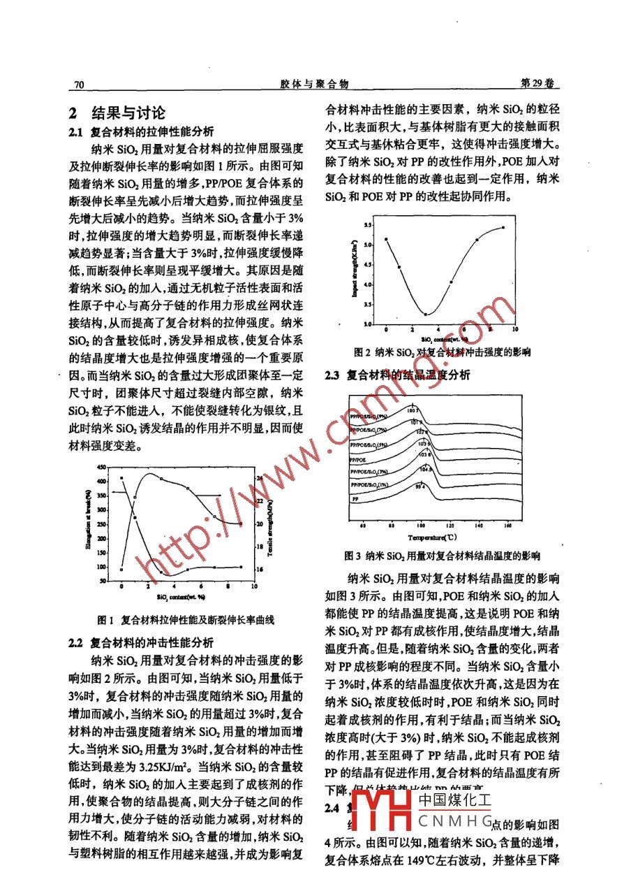 第29卷第2期膠體與聚合物VoL29 No 2011年6月Chinese Jourmal of Colloid polymerJun.2011DO:l0.3969fiss009-1815.201.02007聚丙烯/聚烯烴彈性體/納米SO2復合材料的制備與性能研究鄧志1蔡芳昌12楊莉1胡萍1廖和興1劉志偉1文勝(1湖北大學材料科學與工程學院武漢430062;2功能材料綠色制備與應用教育部重點實驗室武漢4300623孝感學院化學與材料科學學院湖北孝感432000摘要通過熔融擠出法制備了一系列聚丙烯Py聚烯烴彈性體 (POEy納米SiO2復合材料,利用差熱掃描量熱儀(DSC、電子拉伸機、懸臂梁沖擊試驗機等對復合材料進行了表征,分析了聚烯烴彈性體和納米SO2對聚丙烯的熱性能和力學性能的影響。結果表明:當納米SiO2的用量為3%時, PP/POE/納米SO2復合材料的拉伸強度達到最大,此時的沖擊強度是最低;POE和納米SiO2對PP均有成核作用,兩者的加入提高了PP的結晶溫度,但納米SO2的加入使 PP/POE復合體系的熔點略有降低。關鍵詞:聚丙烯;聚烯烴彈性體;納米SiO2中圖分類號:TQ325文獻標識碼:A文章編號:10091815(2011)2006903聚丙烯(PP)是一種產(chǎn)量大、價格低廉、綜合12樣品的制備性能好的通用塑料,應用范圍廣泛。但是如將聚首先將納米SO2母料在溫度為80℃的恒溫丙烯作為結構材料使用,其強度和模量就明顯不千燥箱中干燥4h,然后與PP混合均勻后加入雙如工程塑料。因此世界各國對聚丙烯的改性研螺桿式擠出機料斗,經(jīng)雙螺桿加熱擠出后,經(jīng)過究十分活躍,相繼開發(fā)了通過不同方法制備的、水槽冷卻后牽引至塑料切粒機切成顆粒,然后放具有不同特性的改性P,以在一定場合替代工程人80℃恒溫箱中干燥4h塑料。在眾多的PP改性技術中,采用納米材料改13測試與表征性為近年來P改性的研究熱點。將納米級的1.31拉伸性能測試利用U3B1-500KB萬能材填料通過各種手段均勻地分散到PP基體中,利料試驗機測定,樣條規(guī)格為寬度x厚度=4mmx用納米粒子的小尺寸效應、大的比表面積以及強1mm,樣品夾距為30mm,測試條件:拉伸速率為的界面作用力,將填料的剛性、尺寸穩(wěn)定性和熱50mm/min,室溫環(huán)境相對濕度為60%~80穩(wěn)定性與聚合物的韌性加工性及介電性完美地132沖擊強度的測定按GB/T164201996方法,結合起來,可望獲得優(yōu)異的綜合性能。采用XCJ50 CHARPY型懸臂梁沖擊機進行測由于納米SiO2、CaCO3等一些無機納米材料試,試樣為帶有型缺口的標準樣條。比較便宜在適當添加聚烯烴彈性體(POE)的同133熔點和結晶溫度的測試采用DSCQ100時添加少量納米Sio2對聚丙烯進行增韌增強,可差熱掃描量熱儀測定。N2保護下,以20℃/min升顯著提高聚丙烯的綜合性能。本文研究了納米溫速率從40℃升至200℃,以消除熱歷史;淬火SiO2的用量對PPOE納米SO2復合材料性能后再以10℃/min的升溫速率從40℃升至200℃的影響。記錄復合材料的熔融曲線;最后,從200℃以1實驗部分10cm的產(chǎn)中圍在和掃描圖譜作為結晶由11主要原料CNMHG聚丙烯樹脂(P),工業(yè)級,韓國LG;聚烯烴彈性體(POE),工業(yè)級,韓國LG;納米SO2,工業(yè)收稿日期:2010112級,江西省新余市思遠礦業(yè)有限公司。膠體與聚合物第29卷2結果與討論合材料沖擊性能的主要因素,納米SiO2的粒徑21復合材料的拉伸性能分析小,比表面積大,與基體樹脂有更大的接觸面積納米SO2用量對復合材料的拉伸屈服強度交互式與基休粘合更牢,這使得沖擊強度增大。及拉伸斷裂伸長率的影響如圖1所示。由圖可知除了納米S2對PP的改性作用外,POE加人對隨著納米SO2用量的增多,PPOE復合體系的復合材料的性能的改善也起到一定作用,納米斷裂伸長率呈先減小后增大趨勢,而拉伸強度呈SiO2和POE對PP的改性起協(xié)同作用。先增大后減小的趨勢。當納米SO2含量小于3%時,拉伸強度的增大趨勢明顯,而斷裂伸長率遞減趨勢顯著;當含量大于3%時,拉伸強度緩慢降低,而斷裂伸長率則呈現(xiàn)平緩增大。其原因是隨著納米SO2的加入,通過無機粒子活性表面和活性原子中心與高分子鏈的作用力形成絲網(wǎng)狀連接結構,從而提高了復合材料的拉伸強度。納米siO2的含量較低時,誘發(fā)異相成核,使復合體系的結晶度增大也是拉伸強度增強的一個重要原圖2納米Sio2對復合材料沖擊強度的影響因。而當納米SO2的含量過大形成團聚體至一定23復合材料的結晶溫度分析尺寸時,團聚體尺寸超過裂縫內部空隙,納米siO2粒子不能進入,不能使裂縫轉化為銀紋,且此時納米SiO2誘發(fā)結晶的作用并不明顯,因而使材料強度變差。圖3納米SiO2用量對復合材料結品溫度的影響納米sO2用量對復合材料結晶溫度的影響如圖3所示。由圖可知,POE和納米SO2的加人圖1復合材料拉伸性能及斷裂伸長率曲線都能使PP的結晶溫度提高,這是說明POE和納米SiO2對PP都有成核作用,使結晶度增大,結晶22復合材料的沖擊性能分析溫度升高。但是,隨著納米Sio2含量的變化,兩者納米SiO2用量對復合材料的沖擊強度的影對PP成核影響的程度不同。當納米SO2含量小響如圖2所示。由圖可知當納米SO2用量低于于3%時體系的結晶溫度依次升高這是因為在3%時,復合材料的沖擊強度隨納米SO2用量的納米SO2濃度較低時時,POE和納米S2同時增加而減小,當納米So2的量超過3%時復合起著成核劑的作用,有利于結晶;而當納米SO2材料的沖擊強度隨著納米SO2用量的增加而增濃度高時(大于3%)時納米SO2不能起成核劑大。當納米SO2用量為3%時復合材料的沖擊性的作用,甚至阻礙了PP結晶,此時只有POE結能