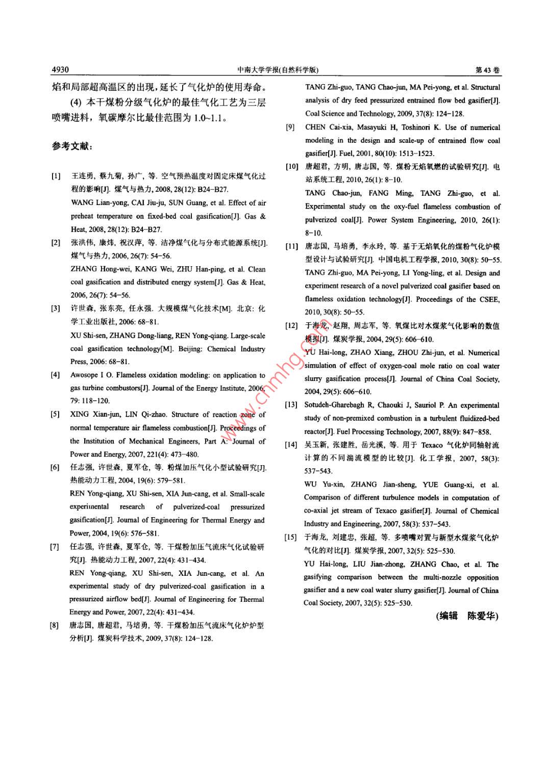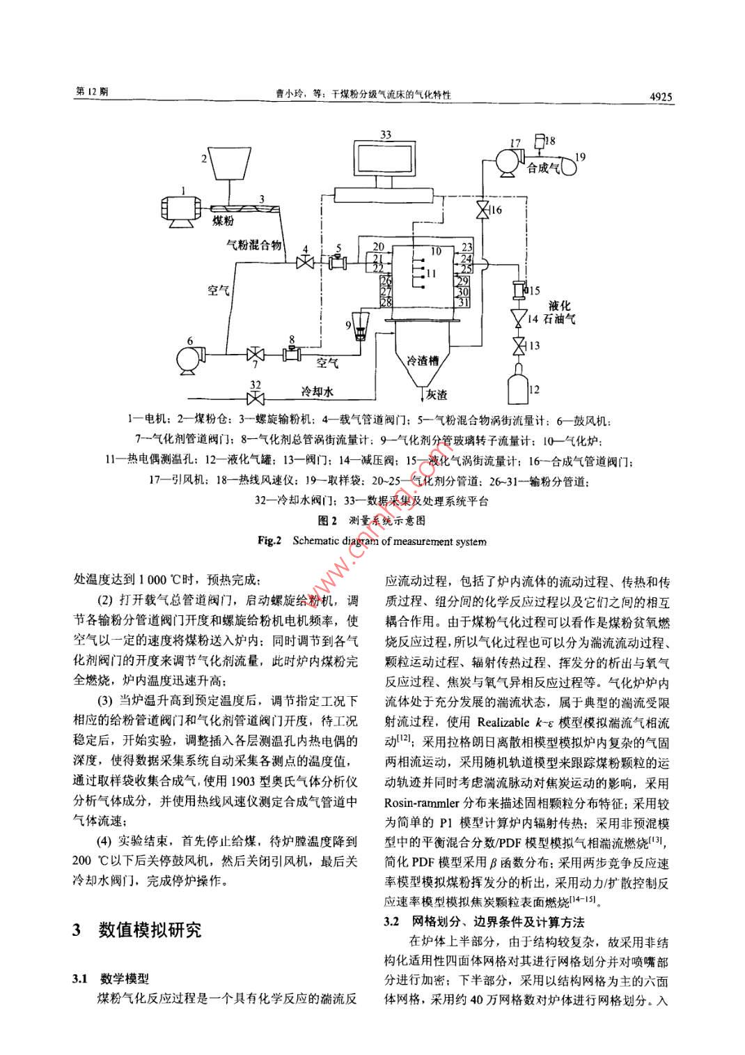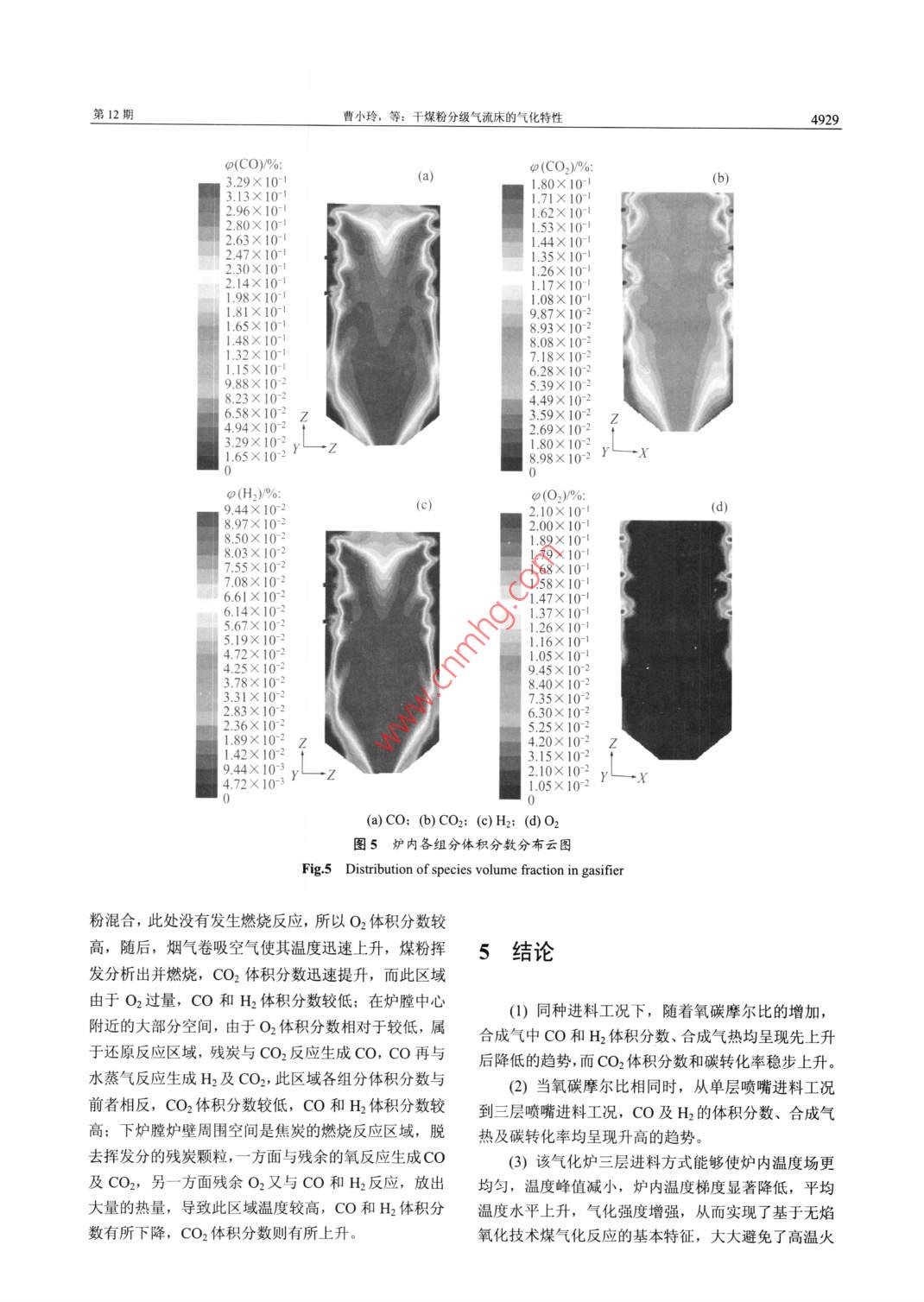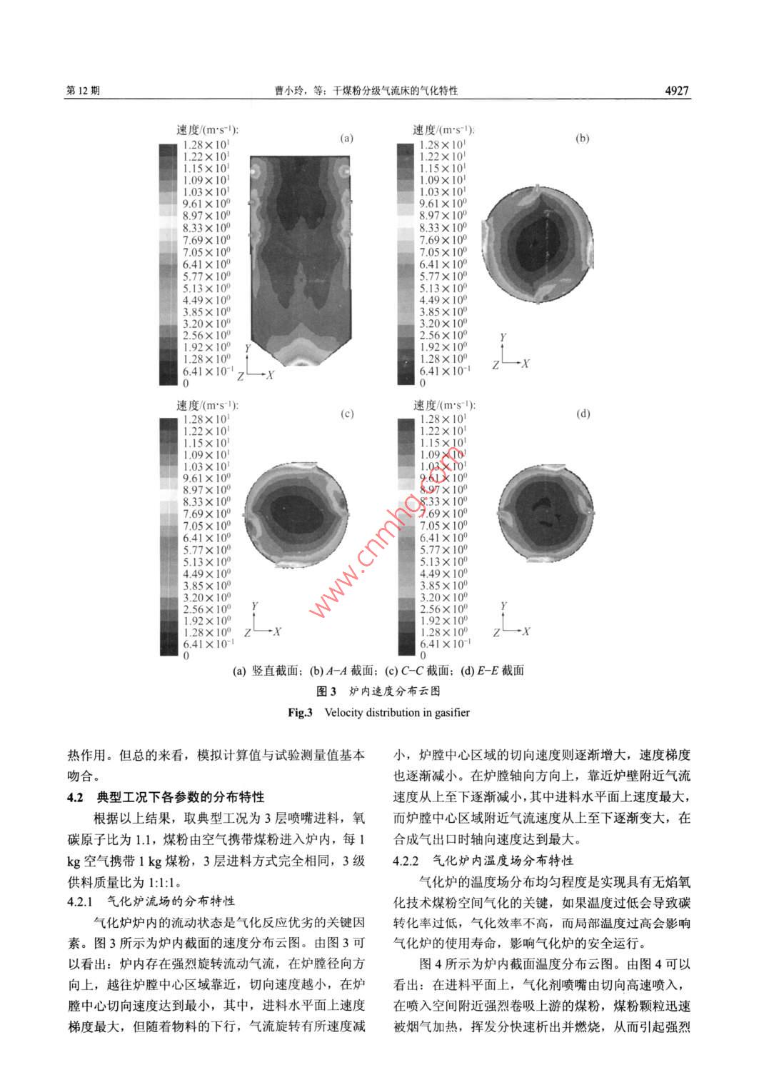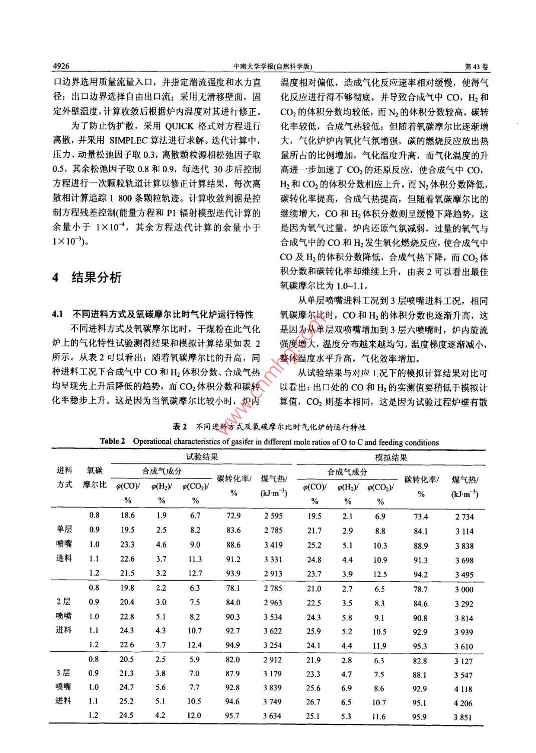 第43卷第12期中南大學(xué)學(xué)報(bào)(自然科學(xué)版)Vol.43 No.122012年 12月.Journal of Central South University (Science and Technology)Dec.2012干煤粉分級氣流床的氣化特性曹小玲',皮正仁',彭好義”,蔣紹堅(jiān)(1. 長沙理工大學(xué)能源與動(dòng)力工程學(xué)院,湖南長沙,410076;2.中南大學(xué)能源科學(xué)與工程學(xué)院,湖南長沙,410083)摘要:針對根據(jù)無焰氧化技術(shù)設(shè)計(jì)的分級氣流床氣化爐,運(yùn)用試驗(yàn)和數(shù)值模擬計(jì)算的方法對F煤粉在爐內(nèi)的氣化過程進(jìn)行研究,分析不同進(jìn)料方式及氧碳摩爾比對合成氣中Co, H2 和CO2體積分?jǐn)?shù)、合成氣熱及碳轉(zhuǎn)化率的影響。研究結(jié)果表明:實(shí)驗(yàn)結(jié)果與模擬結(jié)果基本吻合:相同進(jìn)料方式F隨著氧碳摩爾比的增大,合成氣中co和H2體積分?jǐn)?shù)、合成氣熱先增大后減小,而CO2體積分?jǐn)?shù)和碳轉(zhuǎn)化率-直上升;相對于另外2種進(jìn)料方式,三層噴嘴進(jìn)料方式能使?fàn)t內(nèi)溫度場更均勻,平均溫度提高,氣化強(qiáng)度增加,由此表明氣化爐結(jié)構(gòu)和進(jìn)料方式使?fàn)t內(nèi)實(shí)現(xiàn)了基于無焰氧化技術(shù)煤粉空間氣化反應(yīng)的基本特征:同時(shí),氧碳摩爾比最佳范圍為1.0-1.1。關(guān)鍵詞:無焰氧化;分級氣流床氣化爐;干煤粉:氣化特性中圖分類號: TK224文獻(xiàn)標(biāo)志碼: A .文章編號: 1672-7207(2012)12- 4923- 05Gasification characteristics of dry pulverized coal instaged entrained flow gasifierCAO Xiao-ling', PI Zheng ren', PENG Hao-yit, JIANG Shao-jian2(1. School of Energy and Power Engineering, Changsha University of Science and Technology, Changsha 410076, China;2. School of Energy Science and Engrneering, Central South University, Changsha 410083, China)Abstract: Experimental research and numerical simulation of staged entained-low gasifier for dry pulverized coalwhich was proposed based on flameless oxidtion technology were conducted. The infuence of changing mole ratio ofOto c and feeding condition on syngas components concentration of Co, H2 and CO2, calorific value of syngas, carbonconversion was analyzed. Results indicate that the simulations results are basically in agreement with the experimentallymeasured results. With the increase of mole ratio ofO to C, syngas components concentration of CO and H2, and calorificvalue of syngas increase frstly, then decrease, and components concentation of CO2 and carbonconversion ratioincrease continuously. The feeding condition of symmetrically staged feding nozzles on three layers can promote thetemperature field in the gasifier to be more even, the average temperature of gasifier increases, and the gasifcaionintensity can be boost up, which shows the structure and feeding way of the gasfier can realize gasification reaction ofpulverized coal with flameless oxidant characteristic. Moreover, the optimal range of mole ratio ofO to C is fom 1.0 tol.1.Key words: flameless oxidation; staged entrained- flow gasifier, dry pulverized coal; gasification characteritics煤氣化技術(shù)作為潔凈煤技術(shù)的重要研究方向之同時(shí)極大地改觀對環(huán)境的污染狀況1-21。氣流床氣化技一,是減少環(huán)境污染、節(jié)約能源的重要途徑,我國適術(shù)具有煤種與粒度適應(yīng)性廣、碳轉(zhuǎn)化率高、單爐容量合于氣化的煤炭資源非常豐富,占全國煤炭總儲量的大、變負(fù)荷能力強(qiáng)等優(yōu)點(diǎn),是今后煤氣化技術(shù)發(fā)展的70%左右,通過煤炭氣化可有效地提高熱能利用效率,方向之一_BI。 根據(jù)無焰氧化技術(shù)的形成機(jī)理及實(shí)現(xiàn)條收稿日期: 2012 02 22:修回日期: 2012-06- 08基金項(xiàng)目:國家自然科學(xué)基金資助項(xiàng)目(51276023);湖南省高校創(chuàng)新平臺基金資助項(xiàng)目(09K069);湖南省科技廳計(jì)劃項(xiàng)目(011GK3111)通信作者:彭好義(1974-), 男, 湖南邵陽人,博士,副教授,從事燃料燃燒與氣化研究:電話: 13107488345; E-mail; pengay@csu edu.cn4924中南大學(xué)學(xué)報(bào)(自然科學(xué)版)第43卷件14-5),本文作者自行設(shè)計(jì)了一種新型干煤粉分級氣流5~80 um之間,顆粒直徑大于80 μm的占10 %左右。床氣化爐,并搭建一套粉煤氣化實(shí)驗(yàn)系統(tǒng), 在對現(xiàn)有氣化爐氣化特征進(jìn)行分(681的基礎(chǔ)上,設(shè)計(jì)不同進(jìn)料方式,氣化劑B代運(yùn)用試驗(yàn)與數(shù)值模擬計(jì)算19相結(jié)合的方法來考察不同2氧碳摩爾比時(shí)爐內(nèi)干煤粉的氣化特性,探索實(shí)現(xiàn)具有無2A煤整煤粉焰氧化特征的高效粉煤氣化反應(yīng)的最佳運(yùn)行參數(shù)。c廠門E1分級 氣流床結(jié)構(gòu)及煤粉特性A-A截面1.1 分級氣流床結(jié)構(gòu)及爐內(nèi)煤粉氣化過程簡述分級氣流床氣化爐采用立式結(jié)構(gòu),如圖1所示。體內(nèi)徑480 mm,上部氣化室高875 mm,下端收縮部分高125mm,下口直徑160mm,該氣化爐共布置的C-C截面、E-E截面3層噴嘴,分別位于A-A,C-C和E E截面上,每層:圖1分級氣流床結(jié)構(gòu)示意圖包括2個(gè)對置布置的徑向煤粉噴嘴和2個(gè)平行于煤粉噴嘴且等距離偏置的錯(cuò)位切向氣化劑噴嘴,為保證爐Fig,1 Structure profile of staged entrained-flow gasifier膛內(nèi)流場分布均勻,中層噴嘴、下層噴嘴 與上層噴嘴成錯(cuò)向90°布置。此布置方式將煤粉和氣化劑噴嘴置表1煤的工業(yè)分析與元素分析(質(zhì)量分?jǐn)?shù))于爐體上部同一高度水平面上,煤粉由一定速度的載lable 1 Coal industrial and el