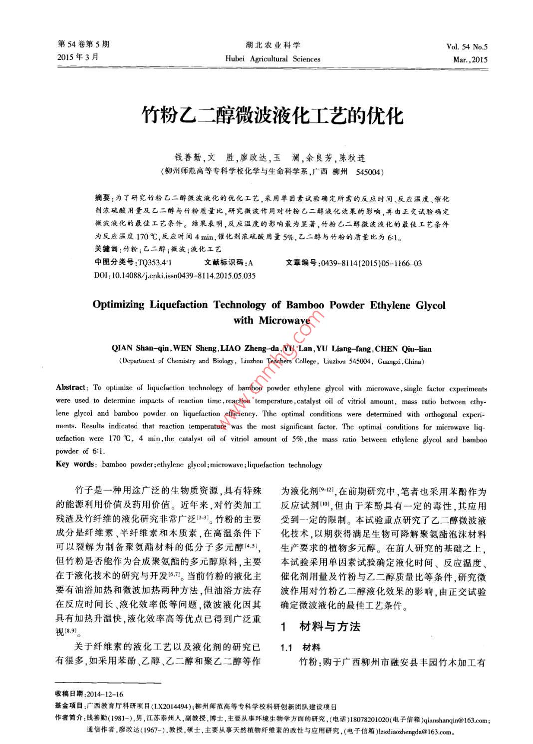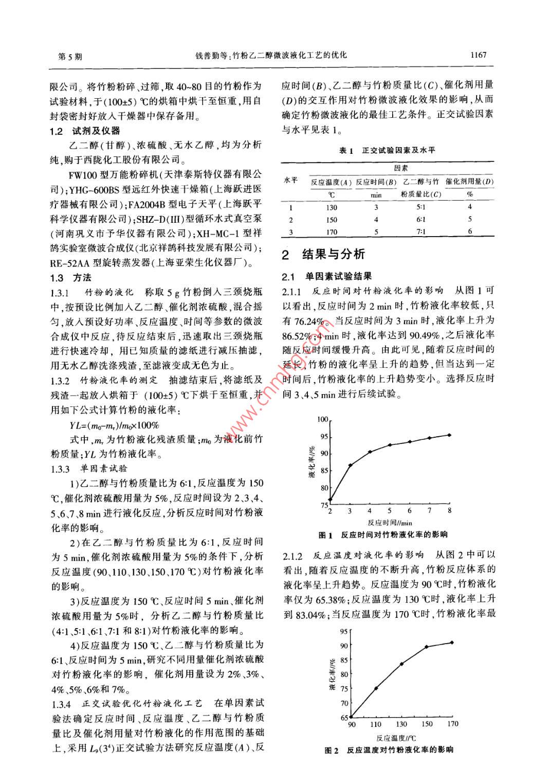 第54卷第5期湖北農(nóng)業(yè)科學(xué)Vol. 54 No52015年3月Hubei Agricultural SciencesMar.,2015竹粉乙二醇微波液化工藝的優(yōu)化錢善勤,文勝,廖政達(dá),玉瀾,余良芳,陳秋連(柳州師范高等專科學(xué)?;瘜W(xué)與生命科學(xué)系,廣西柳州545004摘要:為了研究竹粉乙二醇微波液化的優(yōu)化工藝,采用單因素試驗確定所需的反應(yīng)時間、反應(yīng)溫度、催化劑濃硫酸用量及乙二醇與竹粉質(zhì)量比,研究微波作用對竹粉乙二醇液化效果的影響,再由正交試驗確定微波液化的最佳工藝條件。結(jié)果表明,反應(yīng)溫度的影響最為罡著,竹粉乙二醇微波液化的最佳工藝條件為反應(yīng)溫度170℃,反應(yīng)時間4min,催化劑濃硫酸用量5%,乙二醇與竹粉的質(zhì)量比為6;1關(guān)鍵詞:竹粉;乙二醇;微波;液化工藝中圖分類號:TQ35341文獻(xiàn)標(biāo)識碼:A文章編號:0439-8114(2015)05-1166-03DOl:10.14088/ j cnki. issn0439-8114.2015.05035Optimizing Liquefaction Technology of Bamboo Powder Ethylene Glycolwith miQIAN Shan-qin, WEN Sheng, LIAO Zheng-da, YU Lan, YU Liang-fang, CHEN Qiu-lian(Department of Chemistry and Biology, Liuzhou Teachers College, Liuzhou 545004, Guangxi, China)Abstract: To optimize of liquefaction technology of bamboo powder ethylene glycol with microwave, single factor experimentswere used to determine impacts of reaction time, reaction temperature, catalyst oil of vitriol amount, mass ratio between ethlene glycol and bamboo powder on liquefaction efficiency. Tthe optimal conditions were determined with orthogonal experiments. Results indicated that reaction temperature was the most significant factor. The optimal conditions for microwave liq-uefaction were 170 C, 4 min, the catalyst oil of vitriol amount of 5%, the mass ratio between ethylene glycol and bambooKey words: bamboder;ethylene glycol; microwave liquefaction techi竹子是一種用途廣泛的生物質(zhì)資源,具有特殊為液化劑1,在前期研究中,筆者也采用苯酚作為的能源利用價值及藥用價值。近年來,對竹類加工反應(yīng)試劑,但由于苯酚具有一定的毒性,其應(yīng)用殘渣及竹纖維的液化研究非常廣泛1-3。竹粉的主要受到一定的限制。本試驗重點研究了乙二醇微波液成分是纖維素、半纖維素和木質(zhì)素,在高溫條件下化技術(shù),以期獲得滿足生物可降解聚氨酯泡沫材料可以裂解為制備聚氨酯材料的低分子多元醇,生產(chǎn)要求的植物多元醇。在前人研究的基礎(chǔ)之上但竹粉是否能作為合成聚氨酯的多元醇原料,主要本試驗采用單因素試驗確定液化時間、反應(yīng)溫度、在于液化技術(shù)的研究與開發(fā)6。當(dāng)前竹粉的液化主催化劑用量及竹粉與乙二醇質(zhì)量比等條件,研究微要有油浴加熱和微波加熱兩種方法,但油浴方法存波作用對竹粉乙二醇液化效果的影響,由正交試驗在反應(yīng)時間長、液化效率低等問題,微波液化因其確定微波液化的最佳工藝條件具有加熱升溫快,液化效率高等優(yōu)點已得到廣泛重視③.9。1材料與方法關(guān)于纖維素的液化工藝以及液化劑的研究已1.1材料有很多,如采用苯酚、乙醇、乙二醇和聚乙二醇等作竹粉:購于廣西柳州市融安縣豐園竹木加工有收稿日期:014-12-16基金項目:廣西教育廳科研項目(LX204494);柳州師范高等專科學(xué)??蒲袆?chuàng)新團(tuán)隊建設(shè)項目作者簡介錢善勤(191),男,江蘇秦州人,副教授博士,主要從事環(huán)境生物學(xué)方面的研究,(電話)1800信箱)qianshanqin@163.com通信作者,廖政達(dá)(1967-)教授,碩士,主要從事天然植物纖維素的改性與應(yīng)用研究,(電子信箱 )lzszliaozhengda@163com。第5期錢善勤等:竹粉乙二醇微波液化工藝的優(yōu)化1167限公司。將竹粉粉碎、過篩,取40-80目的竹粉作為應(yīng)時間(B)、乙二醇與竹粉質(zhì)量比(C)、催化劑用量試驗材料,于(1005)℃的烘箱中烘干至恒重,用自(D)的交互作用對竹粉微波液化效果的影響,從而封袋密封好放入干燥器中保存?zhèn)溆?。確定竹粉微波液化的最佳工藝條件。正交試驗因素1.2試劑及儀器與水平見表1。乙二醇(甘醇)、濃硫酸、無水乙醇,均為分析表1正交試驗因素及水平純,購于西隴化工股份有限公司。FW100型萬能粉碎機(jī)(天津泰斯特儀器有限公因素司);YHC-600BS型遠(yuǎn)紅外快速干燥箱(上海躍進(jìn)醫(yī)水平反應(yīng)溫度(A)反應(yīng)時間(B)乙三醇與竹催化劑用量(D)℃粉質(zhì)量比(C)療器械有限公司);FA2004B型電子天平(上海躍平科學(xué)儀器有限公司);SHZ-D(I型循環(huán)水式真空泵(河南鞏義市予華儀器有限公司);XH-MC-1型祥3l1鵠實驗室微波合成儀(北京祥鵠科技發(fā)展有限公司);RE-52AA型旋轉(zhuǎn)蒸發(fā)器(上海亞榮生化儀器廠)。2結(jié)果與分析13方法21單因素試驗結(jié)果131竹粉的液化稱取5g竹粉倒入三頸燒瓶2.11反應(yīng)時間對竹粉液化率的影響從圖1可中,按預(yù)設(shè)比例加入乙二醇、催化劑濃硫酸,混合搖以看出,反應(yīng)時間為2min時,竹粉液化率較低,只勻,放入預(yù)設(shè)好功率反應(yīng)溫度、時間等參數(shù)的微波有76.24%。當(dāng)反應(yīng)時間為3min時,液化率上升為合成儀中反應(yīng),待反應(yīng)結(jié)束后,迅速取出三頸燒瓶86.52%;4min時,液化率達(dá)到9049%,之后液化率進(jìn)行快速冷卻,用已知質(zhì)量的濾紙進(jìn)行減壓抽濾,隨反應(yīng)時間緩慢升高。由此可見,隨著反應(yīng)時間的用無水乙醇洗滌殘渣,至濾液變成無色為止。延長,竹粉的液化率呈上升的趨勢,但當(dā