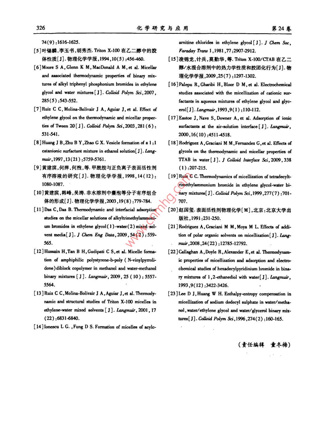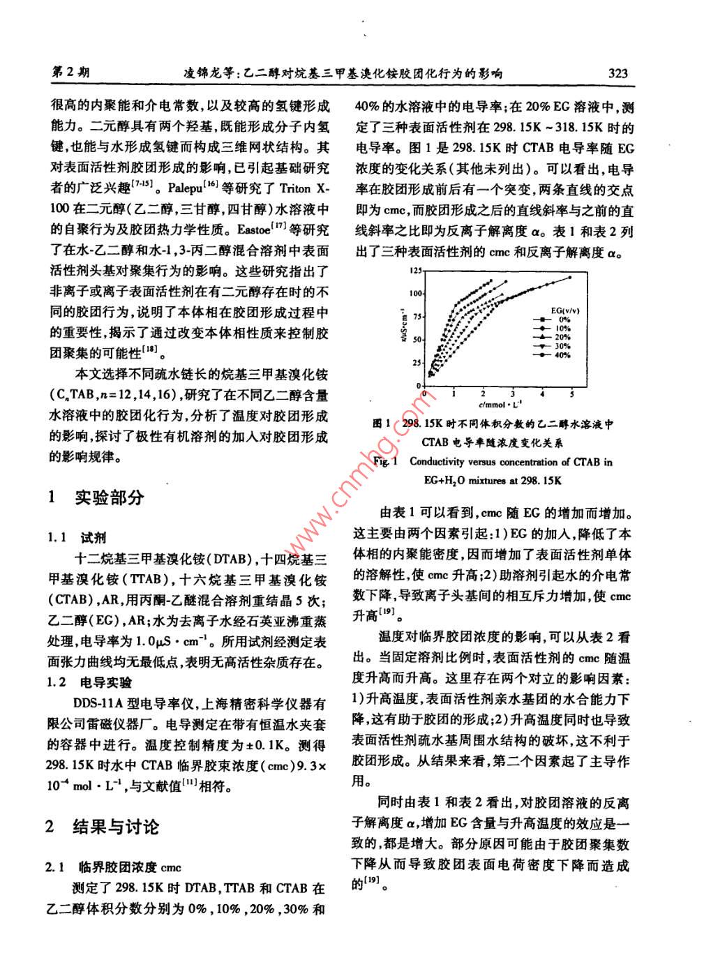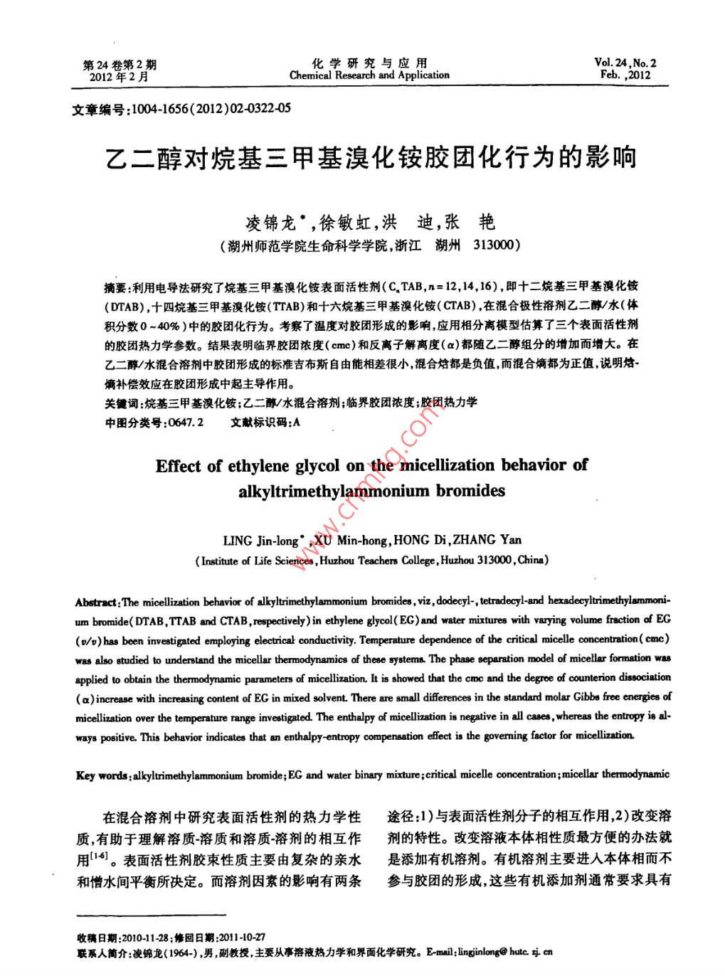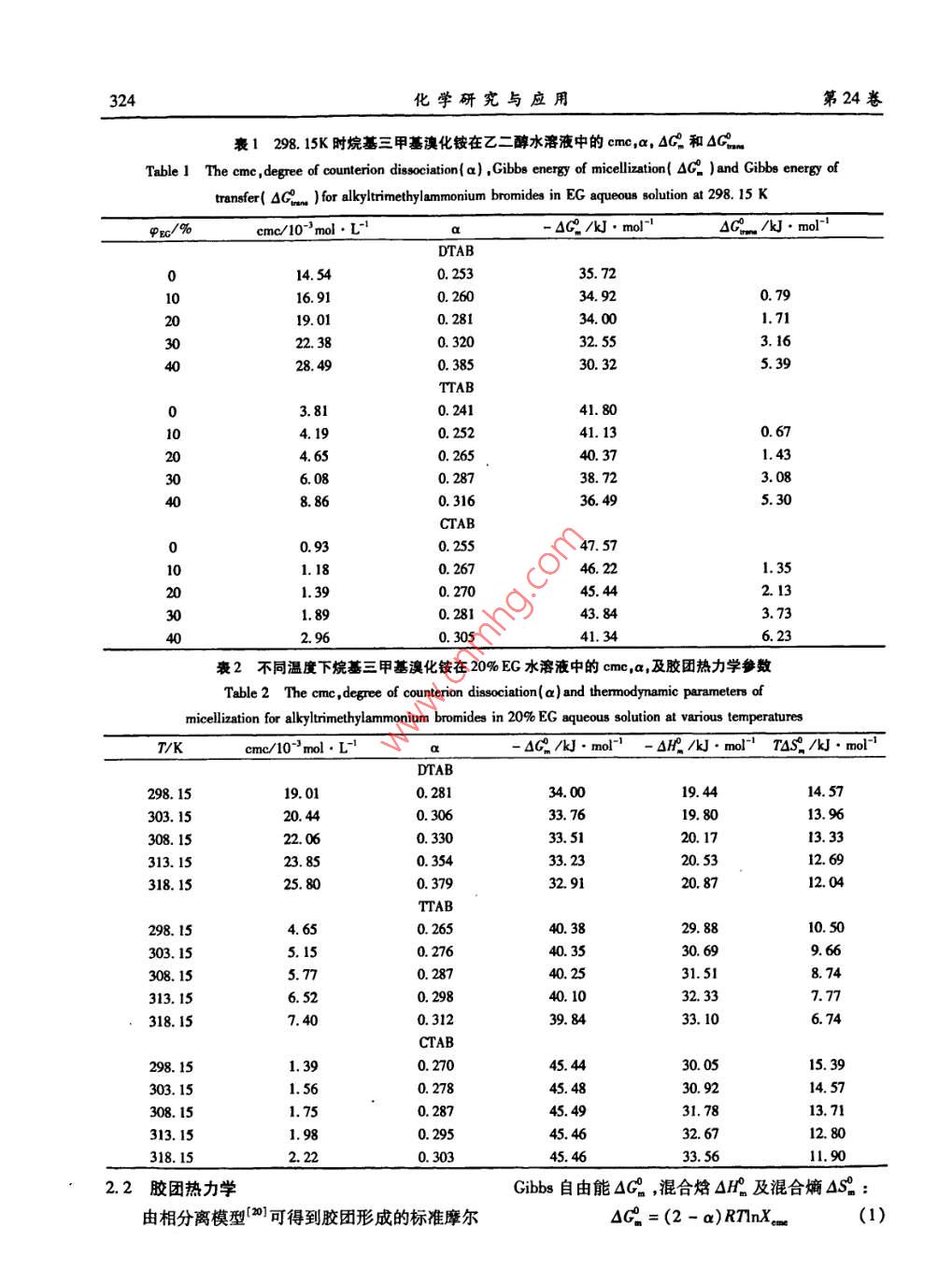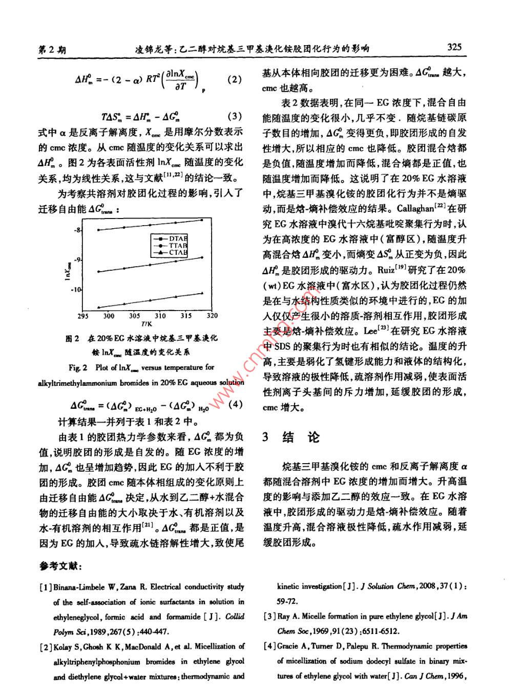 第24卷第2期化學(xué)研究與應(yīng)用 Vol.24, No.22012年2月 Chemical Research and Application Feb.,2012文章編號:1004-1656(2012)020322-05乙二醇對烷基三甲基溴化銨膠團化行為的影響凌錦龍,徐敏虹,洪迪,張艷(湖州師范學(xué)院生命科學(xué)學(xué)院,浙江湖州313000)摘要:利用電導(dǎo)法研究了烷基三甲基溴化銨表面活性劑(CTAB,n=12,14,16),即十二烷基三甲基溴化銨(TAB),十四烷基三甲基溴化銨(TTAB)和十六烷基三甲基溴化銨(CTAB),在混合極性溶劑乙二醇/水(體積分?jǐn)?shù)0~40%)中的膠團化行為。考察了溫度對膠團形成的影響,應(yīng)用相分離模型估算了三個表面活性劑的膠團熱力學(xué)參數(shù)。結(jié)果表明臨界膠團濃度(cmc)和反離子解離度(a)都隨乙二醇組分的增加而增大。在乙二醇/水混合溶劑中膠團形成的標(biāo)準(zhǔn)吉布斯自由能相差很小混合焓都是負(fù)值而混合都為正值說明補償效應(yīng)在膠團形成中起主導(dǎo)作用。關(guān)鍵詞:烷基三甲基溴化銨;乙二醇/水混合溶劑臨界膠團濃度;膠團熱力學(xué)中圖分類號:0647.2文獻標(biāo)識碼:A Effect of ethylene glycol on the micellization behavior of alkyltrimethylammonium bromides LING Jin-long', XU Min-hong, HONG Di, ZHANG Yan Abstract: The micellization behavior of alky um bromide( DTAB, TAB and CTAB, respectively) in ethylene glycol(EG) and water mixtures with varying volume fraction of EG (/)has been investigated employing electrical conductivity. Temperature dependence of the critical micelle concentration() was also studied to understand the micellar thermodynamics of these systems. The pha odel of micellar formation was applied to obtain the ther of micellization. It is showed that the cmc and the degree of counterion dissociation (a) increase with increasing content of EG in mixed solvent. all differences in the standard molar Gibba free energies of micellization over the temper ated. The enthalpy of micellization is negative in all cases, whereas the entropy is al- ways positive. This behavior indicates that an enthalpy-entropy compensation effect is the governing factor for micellization. Key words alkyltrimethylammonium bromide; EG and water binary mixture; critical micelle concentration; micellar thermodynamic在混合溶劑中研究表面活性劑的熱力學(xué)性途徑:1)與表面活性劑分子的相互作用,2)改變?nèi)苜|(zhì),有助于理解溶質(zhì)溶質(zhì)和溶質(zhì)溶劑的相互作劑的特性。改變?nèi)芤罕倔w相性質(zhì)最方便的辦法就用。表面活性劑膠束性質(zhì)主要由復(fù)雜的親水是添加有機溶劑。有機溶劑主要進入本體相而不和僧水間平衡所決定。而溶劑因素的影響有兩條參與膠團的形成,這些有機添加劑通常要求具有收稿日期:2010-11-28修回日期:2011-10-27聯(lián)系人簡介:凌錦龍(1964-),男,副教授,主要從事溶液熱力學(xué)和界面化學(xué)研究-mail: lingjinlong hute.c第2期凌錦龍等:乙二醇對烷基三甲基溴化銨膠團化行為的影響323很高的內(nèi)聚能和介電常數(shù),以及較高的氫鍵形成40%的水溶液中的電導(dǎo)率;在20%E溶液中,測能力。二元醇具有兩個羥基,既能形成分子內(nèi)氫定了三種表面活性劑在298.15K~318.15K時的鍵,也能與水形成氫鍵而構(gòu)成三維網(wǎng)狀結(jié)構(gòu)。其電導(dǎo)率。圖1是298.15K時CTAB電導(dǎo)率隨EG對表面活性劑膠團形成的影響,已引起基礎(chǔ)研究濃度的變化關(guān)系(其他未列出)??梢钥闯?電導(dǎo)者的廣泛興趣 PalepuTriton6等研究了率在膠團形成前后有一個突變,兩條直線的交點100在二元醇(乙二醇,三甘醇,四甘醇)水溶液中即為cmc,而膠團形成之后的直線斜率與之前的直的自聚行為及膠團熱力學(xué)性質(zhì)。 Eastoe等研究線斜率之比即為反離子解離度a表1和表2列了在水乙二醇和水-1,3丙二醇混合溶劑中表面出了三種表面活性劑的cmc和反離子解離度a活性劑頭基對聚集行為的影響。這些研究指出了125非離子或離子表面活性劑在有二元醇存在時的不1同的膠團行為,說明了本體相在膠團形成過程中 EG(v/v]的重要性,揭示了通過改變本體相性質(zhì)來控制膠20%團聚集的可能性本文選擇不同疏水鏈長的烷基三甲基溴化銨(CTAB,n=12,14,16),研究了在不同乙二醇含量水溶液中的膠團化行為,分析了溫度對膠團形成圖1298.15K時不同體積分?jǐn)?shù)的乙二醇水溶液中的影響,探討了極性有機溶劑的加入對膠團形成CTAB電導(dǎo)率隨濃度變化關(guān)系的影響規(guī)律。 Fig 1 Conductivity versus concentration of CTAB in EG+H2O mixtures at 298. 15K1實驗部分由表1可以看到,cmc隨EG的增加而增加。.1試劑這主要由兩個因素引起:1)EG的加入,降低了本十二烷基三甲基溴化銨(DTAB),十四烷基三體相的內(nèi)聚能密度,因而增加了表面活性劑單體甲基溴化銨(TTAB),十六烷基三甲基溴化銨的溶解性,使cmc升高;2)助溶劑引起水的介電常(CTAB),AR,用丙酮-乙醚混合溶劑重結(jié)晶5次;數(shù)下,導(dǎo)致離子頭基間的相互斥力增加,使cm乙二醇(EG),AR;水為去離子水經(jīng)石英亞沸重蒸升高。處理,電導(dǎo)率為1.0us·cm-1。所用試劑經(jīng)測定表溫度對臨界膠團濃度的影響,可以從表2看面張力曲線均無最低點,表明無高活性雜質(zhì)存在。出。固定溶劑比例時,表面活性劑的cmc隨溫1.2電導(dǎo)實驗度升高而升高。這里存在兩個對立的影響因素:DDS-11A型電導(dǎo)率儀,上海精密科學(xué)儀器有1)升高溫度,表面活性劑親水基團的水合能力下限公司雷磁儀器廠。電導(dǎo)測定在帶有恒溫水夾套降,這有助于膠團