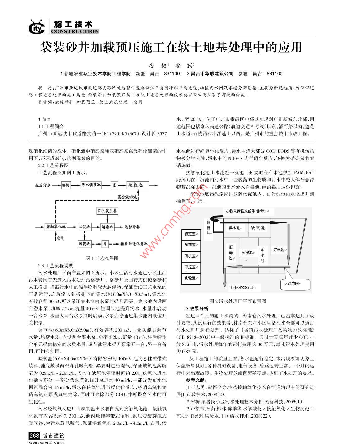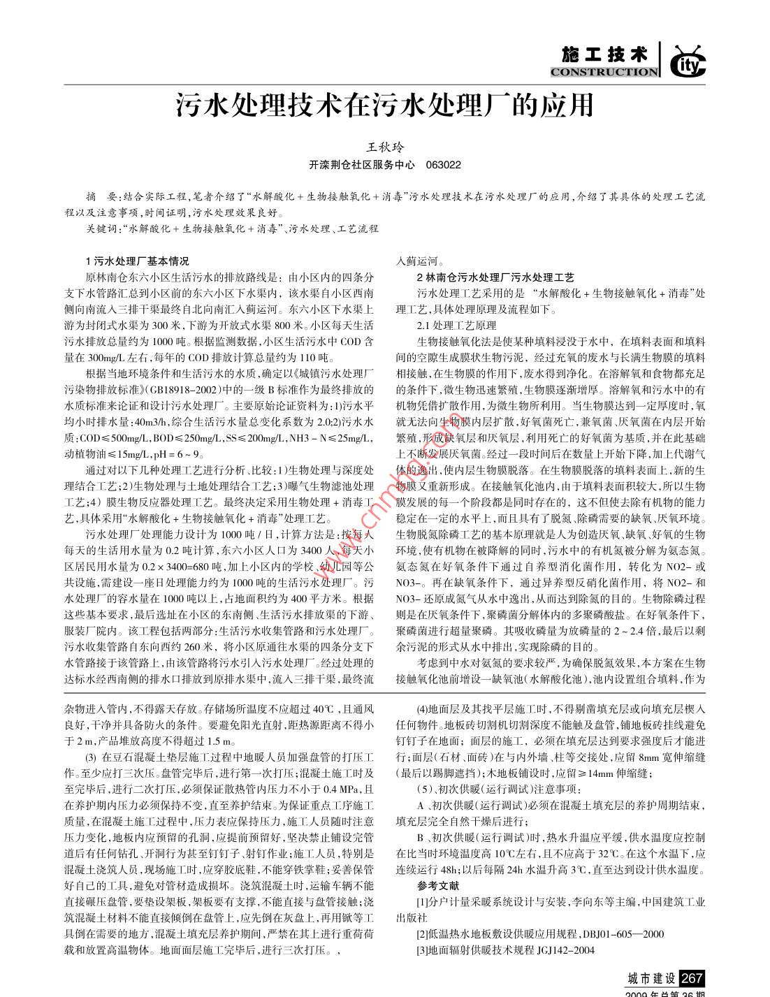 施工技術(shù)CONSTRUCTIONc污水處理技術(shù)在污水處理廠的應(yīng)用王秋玲開灤荊倉社區(qū)服務(wù)中心063022摘要:結(jié)合實際工程,筆者介紹了¨水解酸化生物接觸氧化+消毒″污水處理技術(shù)在污水處理廠的應(yīng)用,介紹了其具體的處理工藝流程以及注意事項,時間證明,污水處理效果良好。關(guān)鍵詞:“水解酸化十生物接觸氧化十消毒”、污水處理、工藝流程1污水處理廠基本情況入薊運河原林南倉東六小區(qū)生活污水的排放路線是:由小區(qū)內(nèi)的四條分2林南倉污水處理廠污水處理工藝支下水管路匯總到小區(qū)前的東六小區(qū)下水渠內(nèi),該水渠自小區(qū)西南污水處理工藝采用的是“水解酸化+生物接觸氧化+消毒”處側(cè)向南流入三排干渠最終自北向南匯人薊運河。東六小區(qū)下水渠上理工藝,具體處理原理及流程如下游為封閉式水渠為300米,下游為開放式水渠800米。小區(qū)每天生活2.1處理工藝原理污水排放總量約為1000噸。根據(jù)監(jiān)測數(shù)據(jù),小區(qū)生活污水中COD含生物接觸氧化法是使某種填料浸沒于水中,在填料表面和填料量在300mg/左右,每年的COD排放計算總量約為110噸。間的空隙生成膜狀生物污泥,經(jīng)過充氧的廢水與長滿生物膜的填根據(jù)當?shù)丨h(huán)境條件和生活污水的水質(zhì),確定以《城鎮(zhèn)污水處理廠相接觸,在生物膜的作用下,廢水得到凈化。在溶解氧和食物都充污染物排放標準》(GBl8918-2002)中的一級B標準作為最終排放的的條件下,微生物迅速繁殖,生物膜逐漸增厚。溶解氧和污水中的有水質(zhì)標準來論證和設(shè)計污水處理廠。主要原始論證資料為:1)污水平機物憑借擴散作用,為微生物所利用。當生物膜達到一定厚度時,氧均小時排水量:40m3h,綜合生活污水量總變化系數(shù)為2.02)污水水就無法向生物膜內(nèi)層擴散,好氧菌死亡,兼氧菌厭氧菌在內(nèi)層開始質(zhì):COD≤500mg,BOD≤25mg/,SS≤200mg,NH3-N≤25mg/,繁殖,形成缺氧層和厭氧層,利用死亡的好氧菌為基質(zhì),并在此基礎(chǔ)動植物油≤15mg/L,pH=6~9。上不斷發(fā)展厭氧菌。經(jīng)過一段時間后在數(shù)量上開始下降,加上代謝氣通過對以下幾種處理工藝進行分析、比較:1)生物處理與深度處體的逸出,使內(nèi)層生物膜脫落。在生物膜脫落的填料表面上,新的生理結(jié)合工藝;2)生物處理與土地處理結(jié)合工藝;3)曝氣生物濾池處理物膜又重新形成。在接觸氧化池內(nèi),由于填料表面積較大,所以生物工藝;4)膜生物反應(yīng)器處理工藝。最終決定采用生物處理+消毒工膜發(fā)展的每一個階段都是同時存在的,這不但使去除有機物的能力藝,具體采用“水解酸化+生物接觸氧化+消毒”處理工藝。穩(wěn)定在一定的水平上,而且具有了脫氮、除磷需要的缺氧、厭氧環(huán)境。污水處理廠處理能力設(shè)計為1000噸/日,計算方法是:按每人生物脫氮除磷工藝的基本原理就是人為創(chuàng)造厭氧、缺氧、好氧的生物每天的生活用水量為0.2噸計算,東六小區(qū)人口為3400人,每天小環(huán)境,使有機物在被降解的同時,污水中的有機氮被分解為氨態(tài)氮。區(qū)居民用水量為0.2×3400=680噸加上小區(qū)內(nèi)的學校、幼兒園等公氨態(tài)氮在好氧條件下通過自養(yǎng)型消化菌作用,轉(zhuǎn)化為NO2-或共設(shè)施,需建設(shè)一座日處理能力約為1000噸的生活污水處理廠。污NO3-。再在缺氧條件下,通過異養(yǎng)型反硝化菌作用,將NO2-和水處理廠的容水量在I000噸以上,占地面積約為400平方米。根據(jù)NO3-還原成氮氣從水中逸出,從而達到除氮的目的。生物除磷過程這些基本要求,最后選址在小區(qū)的東南側(cè)、生活污水排放渠的下游、則是在厭氧條件下,聚磷菌分解體內(nèi)的多聚磷酸鹽。在好氧條件下,裝廠院內(nèi)。該工程包括兩部分:生活污水收集管路和污水處理廠。聚磷菌進行超量聚磷。其吸收磷量為放磷量的2-2.4倍,最后以污水收集管路自東向西約260米,將小區(qū)原通往水渠的四條分支下余污泥的形式從水中排出,實現(xiàn)除磷的目的水管路接于該管路上,由該管路將污水引人污水處理廠。經(jīng)過處理的考慮到中水對氨氮的要求較嚴,為確保脫氮效果,本方案在生物達標水經(jīng)西南側(cè)的排水口排放到原排水渠中,流入三排干渠,最終流接觸氧化池前增設(shè)一缺氣池(水解酸化池),池內(nèi)設(shè)置組合填料,作為雜物進入管內(nèi),不得露天存放。存儲場所溫度不應(yīng)超過40℃,且通風4)地面層及其找平層施工時,不得剔鑿填充層或向填充層楔入良好,干凈并具備防火的條件。要避免陽光直射,距熱源距離不得小任何物件。地板磚切割機切割深度不能觸及盤管,鋪地板磚掛線避免于2m,產(chǎn)品堆放高度不得超過1.5m。釘釘子在地面;面層的施工,必須在填充層達到要求強度后才能進3)在豆石混凝土墊層施工過程中地暖人員加強盤管的打壓工行;面層(石材、面磚)在與內(nèi)外墻、柱等交接處,應(yīng)留8mm寬伸縮縫作。至少應(yīng)打三次壓。盤管完畢后,進行第一次打壓;混凝土施工時及(最后以踢腳遮擋);木地板鋪設(shè)時,應(yīng)留≥14mm伸縮縫至完畢后,進行二次打壓,必須保證散熱管內(nèi)壓力不小于04MPa,且(5)、初次供暖(運行調(diào)試)注意事項:在養(yǎng)護期內(nèi)壓力必須保持不變,直至養(yǎng)護結(jié)束。