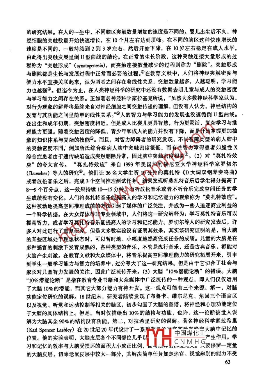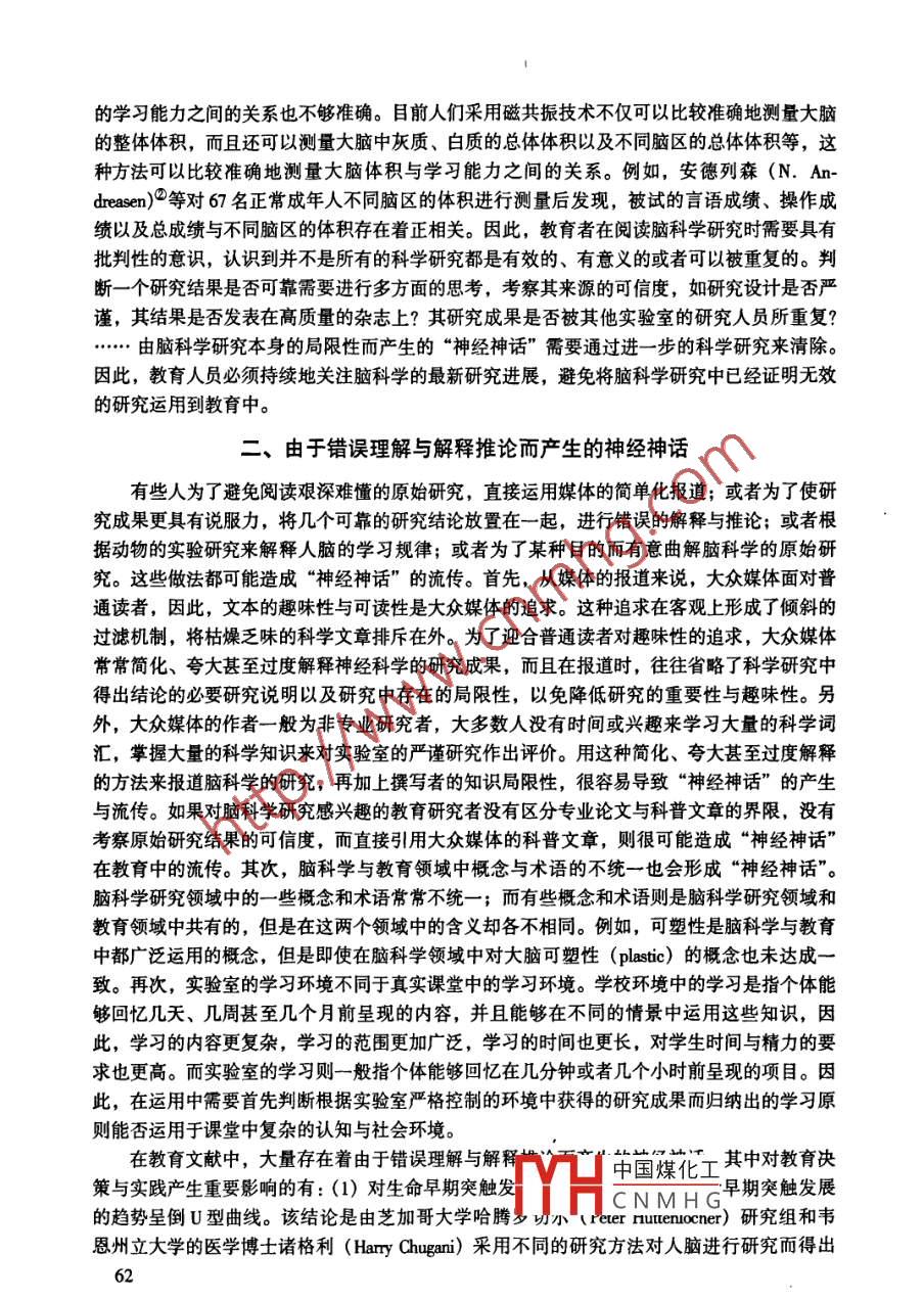 第26卷第3期華東師范大學(xué)學(xué)報(教育科學(xué)版)2008年9月Vol.26, No.3Joumal of East China Normal University( Educaional Sciences)Sep. 2008神經(jīng)神話”的成因分析周加仙(北京師范大學(xué)認(rèn)知神經(jīng)科學(xué)與學(xué)習(xí)國家重點實驗室,北京100875)摘要:神經(jīng)神話是廣泛流傳的觀念,它來源于神經(jīng)科學(xué)的研究,但是在演化的過程中偏離了神經(jīng)科學(xué)的原始研究,在神經(jīng)科學(xué)以外的領(lǐng)城中傳播與穩(wěn)定下來。本文從腦科學(xué)的原始研究以及對腦科學(xué)研究成果的錯誤理解與解釋推論的角度分析了教育文獻中存在的神經(jīng)神話及其成因。關(guān)鍵詞:神經(jīng)神話、腦科學(xué)、教育中圖分類號:文獻標(biāo)識碼: A文章編號: 1000- 5560 (2008) 03 - 0060- 05腦科學(xué)是在試誤的過程中通過遷回曲折的道路不斷前進的。在實驗與觀察基礎(chǔ)上得到的結(jié)論需要經(jīng)過多方面證據(jù)的證實、否定或者修正。但是,由于研究方法、研究對象以及對研究數(shù)據(jù)的解釋等多方面存在的局限性,- -些在后來的研究中被證明無效的研究假設(shè)通過各種媒體傳人大眾的腦海中。如果這些假設(shè)切合了大眾的想象力,就會深深地印刻在人們的腦海中,成為根深蒂固的“神經(jīng)神話”。所謂“神經(jīng)神話”(neuromythologies) 是指來源于神經(jīng)科學(xué)但是在演化過程中偏離了神經(jīng)科學(xué)的原始研究,在神經(jīng)科學(xué)以外的領(lǐng)域中傳播與穩(wěn)定下來的廣泛流傳的觀念?!吧窠?jīng)神話”運用科學(xué)的權(quán)威、增加合理的細(xì)節(jié)、引用科學(xué)研究或者科學(xué)家的話語等增加其“可信度”。目前,教育界存在的許多神經(jīng)神話不僅阻礙了人們對科學(xué)規(guī)律的正確認(rèn)識,更為重要的是,神經(jīng)神話還可能使教育者形成錯誤的判斷,做出錯誤的決策,進而影響到對學(xué)生的教育。因此,分析教育界存在的“ 神經(jīng)神話”,澄清人們的錯誤認(rèn)識,具有重要的意義。- -、由于腦科學(xué)研究本身存在的局限性而產(chǎn)生的“神經(jīng)神話”首先,人類大腦是非常復(fù)雜的器官。為了揭示人腦的奧秘,腦科學(xué)研究往往采用多種方法來對所搜集到的數(shù)據(jù)進行分析。例如,在腦成像研究中常常采用減法來處理兩種不同認(rèn)知條件的圖像,即用完成A任務(wù)的掃描圖像減去無A任務(wù)的掃描圖像,得到A任務(wù)的激活圖。這是對腦與認(rèn)知科學(xué)數(shù)據(jù)進行處理的重要方法之- -。但是這一方法假定 被試在完成認(rèn)知任務(wù)時完全執(zhí)行實驗要求,毫不分心,而且完成該任務(wù)的腦結(jié)構(gòu)與其它心理活動的腦結(jié)構(gòu)沒有關(guān)收稿日期: 2008-04 .中國煤化工基金項目:本研究得到第41批中國博士后基金(一等)面上項YHCNMHG京市教育科學(xué)“十一五”規(guī)劃重點項目(項目編號ABA07015)的資助。作者簡介:周加仙(1966- ), 女,浙江人,北京師范大學(xué)認(rèn)知神經(jīng)科學(xué)與學(xué)國家重點實驗室,副教授。60的學(xué)習(xí)能力之間的關(guān)系也不夠準(zhǔn)確。目前人們采用磁共振技術(shù)不僅可以比較準(zhǔn)確地測量大腦的整體體積,而且還可以測量大腦中灰質(zhì)、白質(zhì)的總體體積以及不同腦區(qū)的總體體積等,這種方法可以比較準(zhǔn)確地測量大腦體積與學(xué)習(xí)能力之間的關(guān)系。例如,安德列森(N. An-dreasen)等對67名正常成年人不同腦區(qū)的體積進行測量后發(fā)現(xiàn),被試的言語成績、操作成績以及總成績與不同腦區(qū)的體積存在著正相關(guān)。因此,教育者在閱讀腦科學(xué)研究時需要具有批判性的意識,認(rèn)識到并不是所有的科學(xué)研究都是有效的、有意義的或者可以被重復(fù)的。判斷一個研究結(jié)果是否可靠需要進行多方面的思考,考察其來源的可信度,如研究設(shè)計是否嚴(yán)謹(jǐn),其結(jié)果是否發(fā)表在高質(zhì)量的雜志上?其研究成果是否被其他實驗室的研究人員所重復(fù)?....由腦科學(xué)研究本身的局限性而產(chǎn)生的“神經(jīng)神話”需要通過進一- 步的科學(xué)研究來清除。因此,教育人員必須持續(xù)地關(guān)注腦科學(xué)的最新研究進展,避免將腦科學(xué)研究中已經(jīng)證明無效的研究運用到教育中。二、由于錯誤理解與解釋推論而產(chǎn)生的神經(jīng)神話有些人為了避免閱讀艱深難懂的原始研究,直接運用媒體的簡單化報道;或者為了使研究成果更具有說服力,將幾個可靠的研究結(jié)論放置在-起, 進行錯誤的解釋與推論;或者根據(jù)動物的實驗研究來解釋人腦的學(xué)習(xí)規(guī)律;或者為了某種目的而有意曲解腦科學(xué)的原始研究。這些做法都可能造成“神經(jīng)神話”的流傳。首先,從媒體的報道來說,大眾媒體面對普通讀者,因此,文本的趣味性與可讀性是大眾媒體的追求。這種追求在客觀上形成了傾斜的過濾機制,將枯燥乏味的科學(xué)文章排斥在外。為了迎合普通讀者對趣味性的追求,大眾媒體常常簡化、夸大甚至過度解釋神經(jīng)科學(xué)的研究成果,而且在報道時,往往省略了科學(xué)研究中得出結(jié)論的必要研究說明以及研究中存在的局限性,以免降低研究的重要性與趣味性。另外,大眾媒體的作者一
