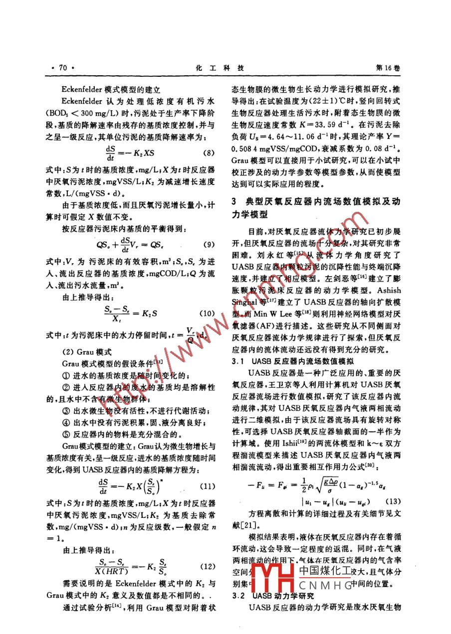 綜述專論化工科技,200816(5):68~71SciENCE TECHNOLOGY IN CHEMICAL INDUSTRY厭氧生物處理的動(dòng)力學(xué)綜述胡成亮1,馮權(quán)莉1,寧平2,任友昌3(1.昆明理工大學(xué)化學(xué)工程學(xué)院云南昆明650224:2.昆明理工大學(xué)環(huán)境科學(xué)與工程學(xué)院,云南昆明6500933昆明冶金高等??茖W(xué)校環(huán)境與化工學(xué)院,云南昆明650033)要:綜逑了有機(jī)物厭氧生物處理的動(dòng)力學(xué)模型,對(duì)厭氧生物的降解機(jī)理、生物處理技術(shù)的特點(diǎn)了概括性論逑,并對(duì)典型的UASB厭氧生物處理反應(yīng)器的流場(chǎng)數(shù)值和動(dòng)力學(xué)進(jìn)行了模擬關(guān)鍵詞:厭氧;生物;動(dòng)力學(xué);UASB;敷值模擬中圖分類號(hào):X703.1文獻(xiàn)標(biāo)識(shí)碼:A文章編號(hào):1008-0511(2008)05-006804目前,國(guó)內(nèi)外對(duì)有機(jī)廢水的治理主要有物理泥的費(fèi)用,厭氧生物處理不需要供氧設(shè)備,因而能法化學(xué)法和生物法12。其中生物法中的厭氧生耗較少。其最終產(chǎn)物為甲烷、二氧化碳(沼氣)等物技術(shù)又是應(yīng)用非常廣泛的技術(shù)。厭氧生物處理可作能源利用是在既無氧又無硝酸鹽存在的條件下,通過兼性微(2)厭氧法所需營(yíng)養(yǎng)成分較少生物及專性厭氧微生物的作用,使復(fù)雜有機(jī)物分解厭氧生物處理所需營(yíng)養(yǎng)成分比值(質(zhì)量分?jǐn)?shù)成無機(jī)物,最終產(chǎn)物是CH4、CO2以及少量的H2S、比,下同)為:BOD3:N:P=100:2.5:0.5,處NH3、H2等,從而使廢水得到凈化處理。理一般有機(jī)污水時(shí)可不必投加營(yíng)養(yǎng)成分。而好氧生物處理所需的需營(yíng)養(yǎng)成分比值:BOD3:N:P1厭氧生物處理技術(shù)=100:5:1。1.1有機(jī)物的厭氧生物降解過程(3)負(fù)荷高厭氧生物反應(yīng)大致可分為三個(gè)階段:水解通常,好氧法的容積負(fù)荷為(2~4) kg bOd3/發(fā)酵階段;產(chǎn)酸脫氫階段;產(chǎn)甲烷階段(m3·d)。高速厭氧生物法的容積負(fù)荷約為(5~厭氧反應(yīng)的三個(gè)階段以產(chǎn)甲烷階段的反應(yīng)15) kg COD(m3·d),甚至高達(dá)50 kg COD/(m3速度最慢,產(chǎn)甲烷細(xì)菌將乙酸、乙酸鹽、二氧化碳·d和氫氣等轉(zhuǎn)化為甲烷。此過程由兩組生理上不同1.22厭氧生物處理技術(shù)的缺點(diǎn)的產(chǎn)甲烷菌完成,一組把氫和二氧化碳轉(zhuǎn)化成甲(1)處理程度低,一般不能達(dá)到排放標(biāo)準(zhǔn),需烷另一組從乙酸或乙酸鹽脫羧產(chǎn)生甲烷前者約好氧法或其它處理法作補(bǔ)充占總量的1/3,后者約占2/31,這也是厭氧消化(2)厭氧生物處理技術(shù)不能除磷的限制階段。與好氧氧化相比,厭氧消化的產(chǎn)能(3)厭氧生物處理過程反應(yīng)速度較慢,反應(yīng)量是很少的,所產(chǎn)生的能量大部分用于細(xì)菌自身產(chǎn)能也較少。所以合成新細(xì)胞的速度也慢,故厭的活動(dòng),只有少量用于合成新細(xì)胞,厭氧生物處理氧處理的啟動(dòng)與處理時(shí)間較好氧法要長(zhǎng)產(chǎn)生的能量少于好氧氧化2厭氧生物反應(yīng)的動(dòng)力學(xué)模型1.2厭氧生物處理技術(shù)的特點(diǎn)1.2.1厭氧生物處理技術(shù)的優(yōu)點(diǎn)2.1厭氧生物反應(yīng)的動(dòng)力學(xué)模型的研究進(jìn)展(1)運(yùn)行成本與能耗較低厭氧過程動(dòng)力學(xué)涉及底物的降解、微生物的厭氧生物處理的污泥產(chǎn)率低,可節(jié)省處理污生長(zhǎng)和甲烷的生成等三方面的關(guān)系式。雖然研究厭氧棧中國(guó)煤化工計(jì)有意義的范收稿日期:2008-06-10圍內(nèi),作者簡(jiǎn)介:胡成亮(1984-),男,安徵巢湖人,昆明理工大學(xué)CNMHG性污泥法的Monod刀在理人戰(zhàn)丑性的降解和微生碩士研究生,主要從事環(huán)境污染治理方面的研究基金項(xiàng)目:云南省教育廳重點(diǎn)基金項(xiàng)目(14036076)物的生長(zhǎng),用化學(xué)計(jì)量學(xué)的方法計(jì)算甲烷的生成第5期胡成亮,等厭氧生物處理的動(dòng)力學(xué)綜述具有足夠的準(zhǔn)確性。對(duì)于厭氧生物反應(yīng)的動(dòng)力學(xué)研究最有代表性和可擴(kuò)展性的模型是2002年3月國(guó)際水質(zhì)學(xué)會(huì)式中為微生物比增值速率,d;pm為基質(zhì)達(dá)(IWA)推出的針對(duì)厭氧消化反應(yīng)的厭氧消化模到飽和濃度時(shí),微生物的最大比增值速率,d;型 ADMll(The Anaerobic Digestion Model No.Ks為飽和常數(shù)數(shù)值上等于在H=k/2時(shí)的基1)。ADM1主要描述了厭氧消化中的生化過質(zhì)濃度,mg/L程,將厭氧消化過程的生化反應(yīng)分為胞內(nèi)和胞外與微生物的比增值速率H相對(duì)應(yīng)的底物比降兩大類,共涉及厭氧體系中的7大類微生物26個(gè)解速率v也可以用莫諾模式描述:組分,包括14個(gè)可溶性組分和12個(gè)不溶性組分19個(gè)生化動(dòng)力學(xué)過程,共有在ADM1模型中各Ks+s種生化過程的反應(yīng)速率方程是用形如M6nod方式中:v為基質(zhì)比降解速率,d;-m為基質(zhì)的最程的基質(zhì)降解動(dòng)力學(xué)方程來描述。對(duì)于每一個(gè)組大比降解速率,d。分,根據(jù)物料衡算,可以得到如下的微分方程對(duì)于污水處理,有機(jī)物的降解是基本目的,根據(jù)實(shí)驗(yàn)1),新細(xì)胞的產(chǎn)生數(shù)量對(duì)某種給定基質(zhì)具ds=。.s-45“分n(1)有重現(xiàn)行,所以上式更有實(shí)際意義式中:V為液相或氣相的體積;S=,S=,為組分i