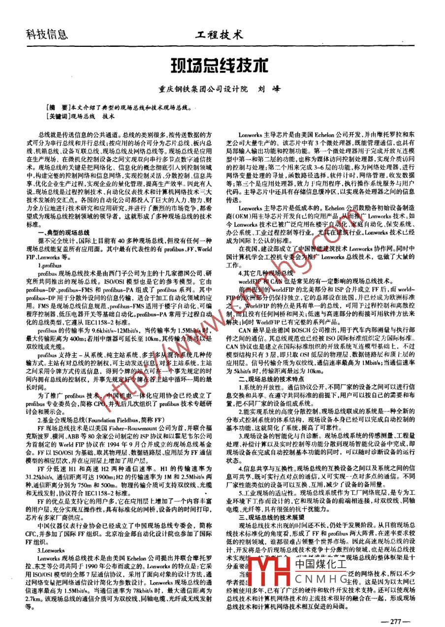 科技信息工程技術(shù)現(xiàn)場(chǎng)總線技術(shù)重慶鋼鐵集團(tuán)公司設(shè)計(jì)院劉峰[摘 要]本文介紹了典型的現(xiàn)場(chǎng)總線和技術(shù)現(xiàn)場(chǎng)總線。[關(guān)鍵詞]現(xiàn)場(chǎng)總線技術(shù)總線就是傳送信息的公共通道。總線的類別很多,按傳送數(shù)據(jù)的方Lonworks主導(dǎo)芯片是由美國(guó)Echelon 公司開發(fā).并由麋托羅拉和東式可分為串行總線和并行總線;按應(yīng)用的場(chǎng)合可分為芯片總線、板內(nèi)總藝公司大量生產(chǎn)的。該芯片中有3個(gè)微處理器、既能管理通信,也具有線機(jī)箱總線.設(shè)備互.聯(lián)總線.現(xiàn)場(chǎng)總線及網(wǎng)絡(luò)總線等?,F(xiàn)場(chǎng)總線是應(yīng)用局部輸人輸出功能和挖制功能。第-一個(gè)微處理器用于完成開放互連模在生產(chǎn)現(xiàn)場(chǎng)、在微機(jī)化控制設(shè)備之間實(shí)現(xiàn)雙向串行多節(jié)點(diǎn)數(shù)字通信技型中第--和第二層的功能,也稱為媒體訪問挖制處理器,實(shí)現(xiàn)介質(zhì)訪問術(shù)。現(xiàn)場(chǎng)總線的關(guān)鍵是把網(wǎng)絡(luò)化、信息化的概念徹底引入到挖制領(lǐng)城的控制與處理;第二個(gè)用來完成3-6層的功能,稱為網(wǎng)絡(luò)處理器,進(jìn)行中,構(gòu)建光整的控制網(wǎng)絡(luò)和信息網(wǎng)絡(luò).實(shí)現(xiàn)控制靈活、分散控制、信息共網(wǎng)絡(luò)變量處理的尋址,麗數(shù)路徑選擇.軟件計(jì)時(shí),網(wǎng)絡(luò)管理.收發(fā)數(shù)據(jù).享、優(yōu)化企業(yè)生產(chǎn)過程,實(shí)現(xiàn)企業(yè)的量化管理,提高生產(chǎn)效率。因此有人等;第三個(gè)是應(yīng)用處理器,致力于應(yīng)用程序.執(zhí)行操作系統(tǒng)服務(wù)與用戶說,現(xiàn)場(chǎng)總線是過程控制技術(shù).自動(dòng)化儀表技術(shù)和計(jì)算機(jī)網(wǎng)絡(luò)技術(shù)三大代碼。主導(dǎo)芯片中還具有存儲(chǔ)信息緩沖區(qū),以實(shí)現(xiàn)各處理器之間的信息技術(shù)發(fā)展的交匯點(diǎn)。各國(guó)的自動(dòng)化公司都投入了巨大的人力、物力財(cái)傳送。力全方位地進(jìn)彳i技術(shù)研究和應(yīng)用研究.并進(jìn)行了激烈的市場(chǎng)競(jìng)爭(zhēng),都希Lonworks 主導(dǎo)芯片是低成本的。Echelon公司鼓勵(lì)各初始設(shè)備制造望成為現(xiàn)場(chǎng)總線控制領(lǐng)域的領(lǐng)導(dǎo)者,這就形成S多種現(xiàn)場(chǎng)總線的技術(shù)商(OEM )用主導(dǎo)芯片開發(fā)自己的應(yīng)用產(chǎn)品,從而推廣Loworks 技術(shù)。如標(biāo)準(zhǔn)。今Lonworks技術(shù)已被廣泛應(yīng)用在樓宇自動(dòng)化家庭自動(dòng)化、保安系統(tǒng)、-.典型的現(xiàn)場(chǎng)總線辦公系統(tǒng).工業(yè)過程控制等行業(yè)。尤其在建筑行業(yè), Lonworks技術(shù)已經(jīng)據(jù)不完全統(tǒng)計(jì),國(guó)際上目前有40多種現(xiàn)場(chǎng)總線,但沒有任何一種成為國(guó)際上公認(rèn)的標(biāo)準(zhǔn)?,F(xiàn)場(chǎng)總線能復(fù)蓋所有應(yīng)用面。其中最有代表性的有profibus .FF .World在我國(guó),建設(shè)部成立了中國(guó)智能建筑技術(shù)Lonworks協(xié)作網(wǎng)。同時(shí)中FIP .Lomworks等。國(guó)計(jì)算機(jī)學(xué)會(huì)工控機(jī)專委會(huì)為推廣Lonworke 總線技術(shù),也做了大量的1.profibusprofbus現(xiàn)場(chǎng)總線技術(shù)是由西門子公司為主的十幾家德國(guó)公司研4.其它幾種現(xiàn)場(chǎng)總線究所共同推出的現(xiàn)場(chǎng)總線。ISO/OSI 模型也是它的參考模型。它由wordFIP和CAN也是常見的有一-定影響的現(xiàn)場(chǎng)總線技術(shù)。profihus-DP .rofbus-FMS和profibus-PA組成了profibus 系列。其中前面提到的worldFIP的北美部分和ISP合并成立FF后.而world-FIP的歐洲部分仍保持獨(dú)立,它的總部設(shè)在法國(guó),已經(jīng)成為歐洲標(biāo)準(zhǔn)用。FMS是現(xiàn)場(chǎng)總線信息規(guī)范.profibus-FMS適用于樓宇自動(dòng)化,可編之一。WorldFIP的特點(diǎn)是具有單- -的總線,可用于過程挖制和離散控程序控制器低壓電器開關(guān)等基礎(chǔ)自動(dòng)化。profibus-PA常用于過程自動(dòng)制,而且沒有任何網(wǎng)橋和網(wǎng)關(guān);低速與高速部分的銜接可用軟件方法來化的總線類型,它遵從IEC1158- -2標(biāo)準(zhǔn)。解決;同時(shí)WorldFIP 已有完整的系列產(chǎn)品。prfilus 的傳輸率為96khi/s-12Mbi/s,當(dāng)傳輸率為1.5MbiUs時(shí),CAN最早是由德國(guó)BOSCH公司推出,用于汽車內(nèi)部測(cè)量與執(zhí)行部最大傳輸距離為400m;若用中繼器可延長(zhǎng)至10km,其傳輸介質(zhì)可以是件之間的通信。其總線規(guī)范也已經(jīng)被Iso國(guó)際標(biāo)準(zhǔn)組織定為國(guó)際標(biāo)準(zhǔn)。雙紋線或光纜。pruibus 支持主-從系統(tǒng)純主站系統(tǒng),多主多從混合系統(tǒng)幾種傳.CAN協(xié)議也是建立在國(guó)際標(biāo)準(zhǔn)組織的開放系統(tǒng)瓦連模型基礎(chǔ)上。不過模型結(jié)構(gòu)只有3層,即只取(OSI低層的物理層.數(shù)據(jù)鏈路層和頂1:)層的輸方式。主站有對(duì)總線的控制權(quán),可主動(dòng)發(fā)送信息。對(duì)多主站系統(tǒng)。主站應(yīng)用層。信號(hào)傳輸介質(zhì)為雙絞線,通信速率最高為1Mbiv/s; 當(dāng)通信速率之間采用令牌方式傳送信息,得到令牌的站點(diǎn)可在- -個(g