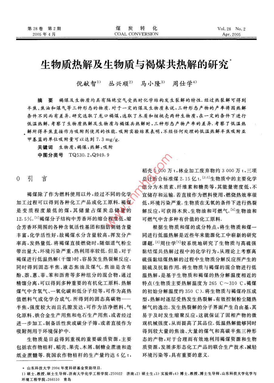 第28卷第2期煤炭轉(zhuǎn)化Vol. 28 No. 22005年4月COAL CONVERSIONApr. 2005生物質(zhì)熱解及生物質(zhì)與褐煤共熱解的研究倪獻智)叢 興順2)馬小隆3) 周 任學”)摘要褐煤及生物質(zhì)均具有隔絕空氣受熱時化學結構發(fā)生裂解的特性.經(jīng)過熱裂解可得到半焦、焦油和煤氣等三種形態(tài)的物質(zhì)。對于一定的煤及生物質(zhì)來說,三種形態(tài)產(chǎn)物的產(chǎn)率將因熱解條件不同而有差異。研究選取了龍口褐煤,選取了木屑和核桃殼兩種生物質(zhì),在一定的條件下進行低溫熱解.考察了生物質(zhì)熱解及生物質(zhì)與褐煤共熱解時,三種形態(tài)產(chǎn)物產(chǎn)率的差異.考察了低溫熱解所得半焦直接作為吸附劑使用的性能.吸附實驗結果表明,不經(jīng)任何處理的低溫熱解半焦吸附亞甲基藍的單位吸附量可以達到7.3 mg/g.關鍵詞生物質(zhì),褐煤, 熱解,吸附:中圖分類號TQ530. 2,Q949. 9稻殼5 000萬t,林業(yè)加工廢棄物約3000萬t,三項0引言總計折合標準煤2.15億t.L.3)生物質(zhì)中的主要化學組分為木質(zhì)素、纖維素和糖類等,其能量密度低,不褐煤除了作為燃料使用以外,經(jīng)過不同的化學宜儲存和運輸.若直接作為燃料使用,燃燒熱效率很加工過程可以得到各種化工產(chǎn)品或化工原料.褐煤低,環(huán)境污染嚴重.生物質(zhì)在無氧的條件下進行熱裂是變質(zhì)程度最低的煤,其儲量占煤炭總儲量的解反應,可獲得木炭、生物油和可燃氣.[中生物油和12.5%.[1]褐煤分子結構中芳香環(huán)的縮合程度低,縮可燃氣中含多種有價值的化工原料.合芳香環(huán)周圍的各種含氧活性基團和脂肪側鏈含量根據(jù)生物質(zhì)和煤的成分特點,將生物質(zhì)和煤一豐富,化學活性好,故褐煤水分含量較高,揮發(fā)分產(chǎn)同進行低溫熱解是近些年來能源化工中嶄新的研究率高,發(fā)熱量低.將褐煤直接燃燒時,隨煙道氣粉塵課題.[2]周仕學[°]較系統(tǒng)地研究了生物質(zhì)與高硫強帶出量大,環(huán)境污染嚴重,熱利用率較低.但是,對于黏結煤共熱解過程中的化學行為,從理論上考察高褐煤進行低溫熱解(干餾)時,容易發(fā)生熱裂解反應,硫強黏結煤熱解的過程中生物質(zhì)分解反應所產(chǎn)生的同時得到固態(tài)半焦、液態(tài)焦油及煤氣.焦油是含有脫硫及抗黏作用.將生物質(zhì)與褐煤的混合物進行低酚、蔡、蒽、菲、苯和瀝青等多種組分的混合物,通過溫熱解,是基于生物質(zhì)和褐煤的熱分解溫度相近的精餾分離,可以得到多種重要的有機化工原料.熱解特點(生物質(zhì)主要熱解溫度為265 C~310 C,褐煤煤氣中含氫氣、一氧化碳和低分子烴等,可作為高熱的初始分解溫度約350C).將生物質(zhì)與褐煤冷壓成值燃料氣或化學合成氣.所得到的固態(tài)高碳物型,熱解時逐層受熱發(fā)生熱裂解,有效控制粉塵隨熱半焦,強度較大而且孔隙發(fā)達,可作為潔凈燃料、氣解氣的逸出.發(fā)生熱裂解的分子界面產(chǎn)生自由基,其化原料、鐵合金生產(chǎn)用焦和電石生產(chǎn)用焦,或者經(jīng)過易于及時發(fā)生縮聚反應,這就保證了固相產(chǎn)物的微進一步加工,制備活性炭或碳分子篩,或者直接作為觀機械強度,從而提高了其品位.低溫熱解能夠同時吸附劑用于環(huán)境保護中.得到較大量的焦油、大量的煤氣和高碳半焦三種形生物質(zhì)是日益得到重視的重要碳質(zhì)資源,主要態(tài)的產(chǎn)物,對于合理而有效地利用褐煤資源和生物包括農(nóng)作物秸稈、稻殼、果殼.木屑.制糖業(yè)蔗渣和造質(zhì)資源,發(fā)展多形態(tài)化工產(chǎn)品的聯(lián)合生產(chǎn)技術,減輕紙業(yè)蔗髓等.我國農(nóng)作物秸桿的生產(chǎn)量約達6億t,環(huán)境污染等,具有重要的意義.*山東科技大學2004年度科研基金資助項目.1)碩士、教授、碩士生導師.濟南大學化學工程學院,250022濟南;2) 碩士生;3)實驗師;4)博士、教授、博士生導師,山東科技大學化學與環(huán)境工程學院,266510青島4煤炭轉(zhuǎn)化2005年兩種粒度級的煤樣,煤樣1粒度<0.9 mm,煤樣21實驗部分粒度<0.45 mm.生物質(zhì)選取了兩種:一種是木屑,粒度<0.9 mm;另一種是核桃殼,粒度<0.45 mm.按照煤炭分析國際方法GB212- 1991和GB/1476-1.1實驗 煤樣和生物質(zhì)樣的制備1991,進行了煤樣和生物質(zhì)樣的工業(yè)分析和元素分選擇龍口褐煤,進行煤樣縮分,破碎過篩.制成析,分析結果見表1.表1 煤和生物質(zhì)樣的工業(yè)分析和元素分析Table 1 Proximate and ultimate analysis of coal and biomass sampleProximate analysis/ %”Ultimate analysis/%* ,dafSamplesMusAd_VanlNOdiff.)Brown coal13.748.2848. 2175.185.201.220.9117. 49Sawdust7. 303.1484. 5354.355.99.0.3039. 36Shell of walnut9.652. 5177.4169.423. 860. 3526.37+ Percent of weight.1.3.2半焦吸附性 能測定實驗方法1.2實驗儀器熱解實驗所得半焦參照木炭及活性炭吸附亞甲控溫管式爐熱解裝置、焦油水分測定裝置.HY一基藍測定的國標方法步驟,按照國標方法GB/4型多用調(diào)頻振蕩器.721型分光光度計和電子天平.T12496.10-1999配制出亞甲基藍原液和標準溶液取濃度co=400mg/L的亞甲基藍標準溶液2501.3實驗方 法mL,放人M= 300 mg的半焦試樣,在振動蕩器上振1.3.1 低溫熱解實驗方法蕩30 min發(fā)生吸附.進行過濾收焦濾液,在721型參照煤炭低溫熱解測定的國標方法步驟,起始分光光計上(在654nm波長時吸光度可達到最大溫度、升溫速度和終溫等參數(shù)按照本實驗的研究目