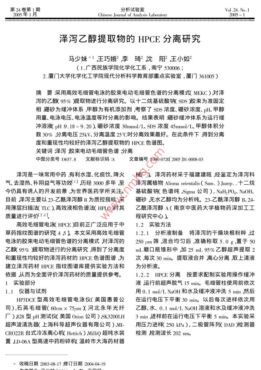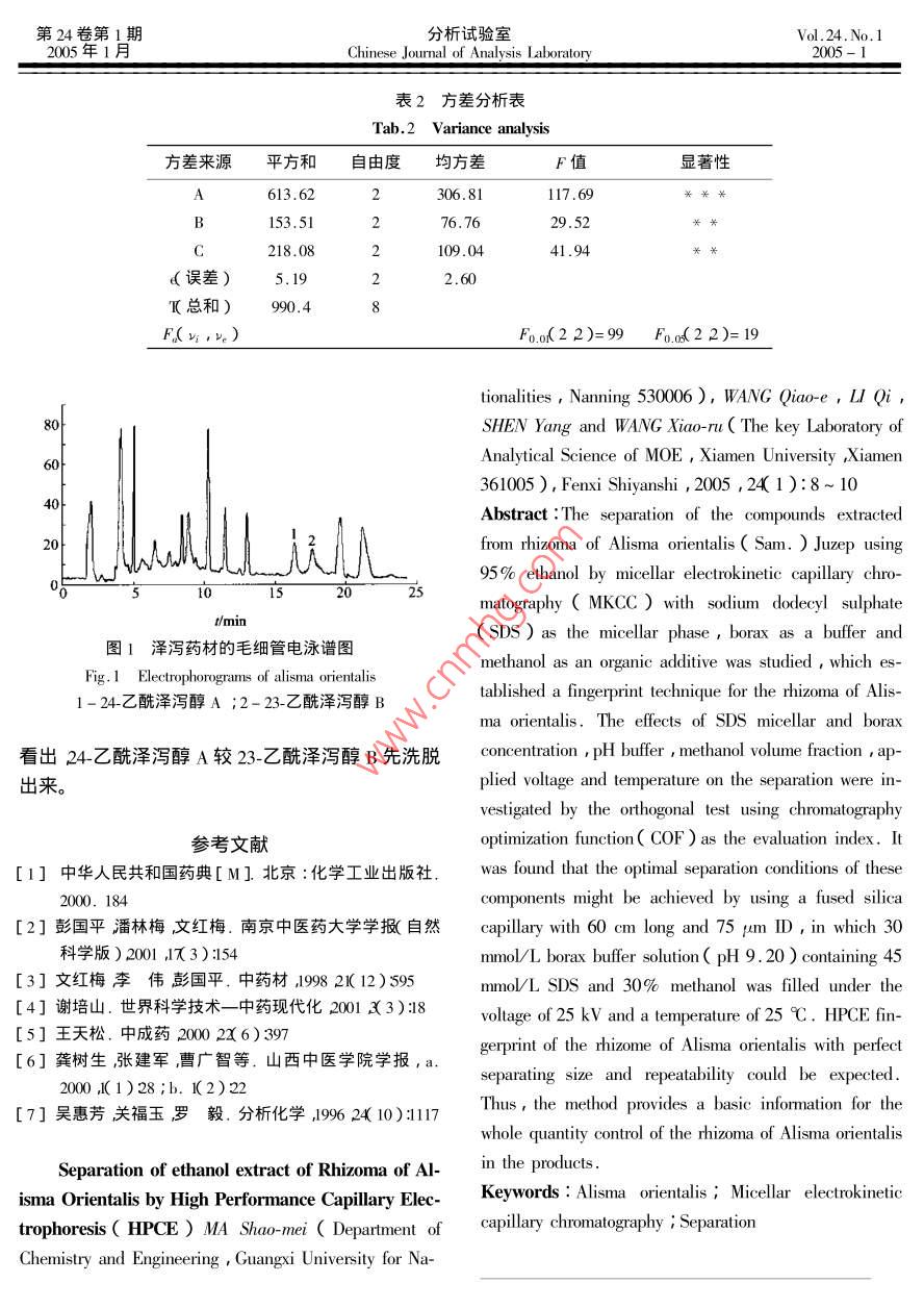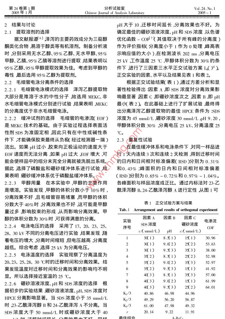 第24卷第1期分析試驗(yàn)室Vol 24. No. 1Chinese Journal of Analysis laboratory澤瀉乙醇提取物的HPCE分離研究馬少妹“1王巧娥2李琦沈陽2王小如21廣西民族學(xué)院化學(xué)化工系,南寧53000602.廈門大學(xué)化學(xué)化工學(xué)院現(xiàn)代分析科學(xué)教育部重點(diǎn)實(shí)驗(yàn)室,廈門361005)摘要采用高效毛細(xì)管電泳的膠束電動(dòng)毛細(xì)管色譜的分離模式MEKC)對澤瀉的乙釀95%湜取物進(jìn)行分離研究。以十二烷基硫酸鈉SS腋束為準(zhǔn)固定相硼砂為緩沖體系甲醇為有機(jī)添加劑,考察了Ss濃度、硼砂濃度、p甲醇用量、電泳電壓、電泳溫度等對分離的影響。結(jié)果表明:硼砂緩沖體系為運(yùn)行緩沖溶液pH⑨.18~9,20)硼砂濃度3mm/lSs濃度45mmo/1甲醇體積分?jǐn)?shù)30%分離電壓25kV分離溫度25℃時(shí)分離效果最好。在此條件下得到分離度和重現(xiàn)性均較好的澤瀉乙醇提取物的HPCE色譜圖。關(guān)鍵詞澤瀉膠束電動(dòng)毛細(xì)管色譜汾離中圖分類號(hào)x657.8文獻(xiàn)標(biāo)識(shí)碼:文章編號(hào):0072200501-000603澤瀉是一味常用中藥有利水濕、化痰飲、降火械廠)澤瀉藥材采于福建建甌經(jīng)鑒定為澤瀉科氣、去濕熱、補(bǔ)陰益氣等功效門歷經(jīng)300多年至澤瀉屬植物 Alisma orientalis(Sam.) Juzep.十二烷今仍具有誘人的開發(fā)前景,為世界醫(yī)藥學(xué)所關(guān)注?;蛩徕c(色譜純, sigma公司),NaH2PO4NaOh目前澤瀉主要以23-乙酰澤瀉醇B為質(zhì)控指標(biāo)采硼砂無水♂醇均為分析純。23-乙酰澤瀉醇B24用薄層掃描泫LCλ高效液相色譜汯HC對其乙酰澤瀉醇A〔南京中醫(yī)藥大茡植物藥深加工工質(zhì)量進(jìn)行評(píng)價(jià)23程研究中心高效毛細(xì)管電泳HPCE)前正廣泛應(yīng)用于中1.2實(shí)驗(yàn)方法草藥指紋圖譜的研究45廴本文采用高效毛細(xì)管1.2.Ⅰ分析液制備將澤瀉的干燥塊根粉粹過電泳的膠束電動(dòng)毛細(xì)管色譜的分離模式對澤瀉的250{m篩混合均勻后準(zhǔn)確稱取5.0g,置于50乙釀95%湜取物進(jìn)行的分離研究得到了分離度mL曆口瓶錐形中加25mL95%乙醇超聲提取2和重現(xiàn)性均較好的澤瀉藥材的HPCE色譜圖譜,為次每次30min。提取液合并離心分離取上清液建立澤瀉藥材HPCE指紋圖譜庫提供實(shí)驗(yàn)方法和為分析液。依據(jù)從而為全面評(píng)價(jià)澤瀉藥材的質(zhì)量提供參考。1.2.2HE分離按要求配制實(shí)驗(yàn)用操作緩沖實(shí)驗(yàn)部分液運(yùn)行前超聲脫氣15min。毛細(xì)管柱使用前依次1.1儀器與試劑用0.1mol/ L NaOH和水及緩沖液沖洗5min然后HP3DCE型高效毛細(xì)管電泳儀(美國惠普公在運(yùn)行電壓下平衡30min以后每次進(jìn)樣依次用司),石英毛細(xì)管(60cmⅹ巧5ⅧmX河北永年光纖乙醇、水、0.1mo/ L NaOH溶液和水及緩沖液沖洗廠)828型pH測試儀美國 Orion公司)SK320H3min進(jìn)樣前在運(yùn)行電壓下平衡5min本實(shí)驗(yàn)采超聲波清洗器(上??茖?dǎo)超聲儀器有限公司),M-用壓力進(jìn)檥(250kPa),二極管陣列DAD)檢測器CRO2R臺(tái)式冷凍離心機(jī) Hettich ) MilliQ超純水裝檢測檢測波長202mm置JD-06A型高速中藥粉碎機(jī)溫嶺市大海藥材器收稿日期2003-08-17修訂日期2004-04-19第24卷第1期分析試驗(yàn)室ol.24.No.12005年1月Chinese Journal of Analysis laboratory2005-12結(jié)果與討論pH大于10,遷移時(shí)間延長分離效果也不好。為2.1提取溶劑的選擇確定最佳的硼砂溶液濃度、pH和SDs濃度以色譜據(jù)文獻(xiàn)報(bào)道6澤瀉的主要藥效成分為三萜醇優(yōu)化函數(shù)-COμ7(其值取決于所有峰的分離度)酮類化合物易溶于醇類等有機(jī)溶劑。制備分析液作為評(píng)價(jià)指標(biāo)分離度小于1作為0處理峰高表時(shí)分別采用無水乙醇、95%乙醇無水甲醇、95%示響應(yīng)值的大小)在檢測波長202mm,分離電壓甲醇、乙腈、95%乙腈等溶劑進(jìn)行提取結(jié)果表明以25kⅤ工作溫度25℃,甲醇體積分?jǐn)?shù)為30%的條95%乙醇、95%甲醇提取效果為佳。考慮到甲醇的件下進(jìn)行了三因素三水平正交試驗(yàn)方案I34)毒性最后選用95%乙醇為提取劑。正交實(shí)驗(yàn)的因素、水平以及結(jié)果見表1和表2。2.2毛細(xì)管電泳分離條件的選擇根據(jù)正交試驗(yàn)結(jié)果表1)通過方差分析和顯2.2.1毛細(xì)管電泳模式的選擇澤瀉乙醇提取物著性檢驗(yàn)得岀因素A即SS濃度對分離效果影大部分是難溶于水的中性分子故選用MEKC非響最顯著因素C即硼砂濃度次之因素B即pH水毛細(xì)管電泳模式分別進(jìn)行試驗(yàn)結(jié)果表明MEKC最小表2)在此基礎(chǔ)上進(jìn)行了擴(kuò)展試驗(yàn)最終得的分離度優(yōu)于非水毛細(xì)管電泳。出分離澤瀉乙醇提取物的最佳HPCE條件為:SDS2.2.2緩沖試劑的選擇毛細(xì)管的電滲流EOF)濃度為45mmo/L硼砂濃度30mmol/LH9.20,是MEKC技術(shù)的基礎(chǔ)。由于實(shí)驗(yàn)過程選擇表面活甲醇體積分?jǐn)?shù)30%分離電壓25kV、分離溫度2性劑Ss為準(zhǔn)固定相因此只有在中性或堿性條℃。件下才能確保膠束最終從負(fù)極經(jīng)過檢測器一端)2.3重復(fù)性試驗(yàn)流出。如果p過小膠束向正極運(yùn)動(dòng)的速度大于在最佳緩沖體系和電泳條件下對同一樣品進(jìn)EOF速度而無法分離如果pH過大EOF增大,可行1天內(nèi)連續(xù)3次和連續(xù)2天檢測得到遷移時(shí)間能會(huì)使樣品中的組分未完全分離就被洗脫出系統(tǒng)。的日內(nèi)和日間相對標(