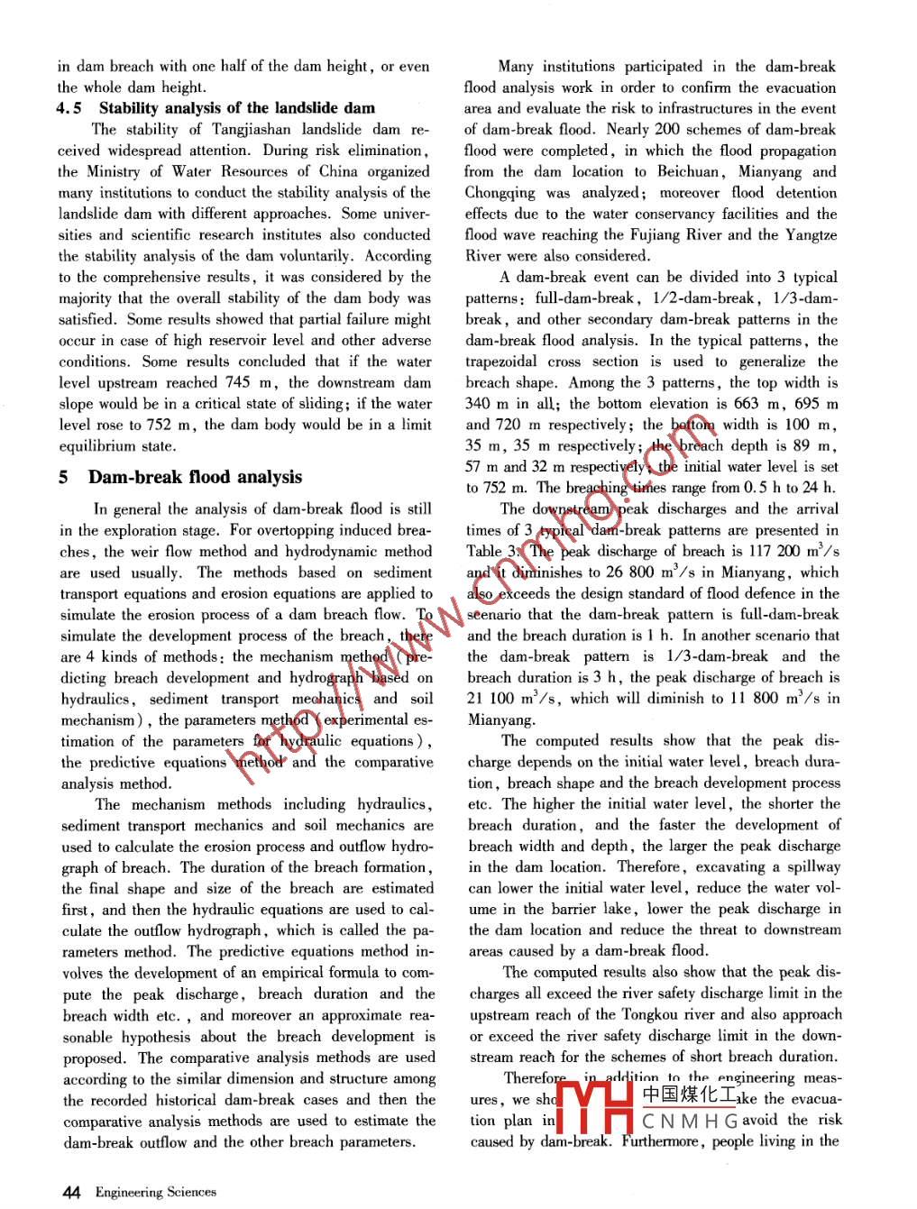 Technical analysis on the emergency handling of Tangjiashanbarrier lakeLiu Ning,Yang Qigui2(1. The Ministry of Water Resources of China, Beijing 100053,China;2. Design Institute of Changjiang W ater Resources Commission, Wuhan 430010, China)Abstract:This paper gives a brief introduction to the emergency handling of Tangiashan barrier lake. Some technologiesfor the application of geological and topographical data are summarized and the mechanism of formnation of a barrier lakeis analyzed. Based on the safety status evaluation, the dam breach flood point is calculated. The paper concludes withdiscussion of the practical effects of emergency handling scenarios and diferent drainage channel designs.Key words:earthquake; Tangjiashan barrier lake; landslide; dam breach1 Introduction2 Technologies for the data acquisition andapplicationTangjiashan barrier lake is located in the Kuzhureservoir, upstream of Tongkou River, 3. 2 km away2.1 Topographical data acquisition and applicationfrom Beichuan County of Sichuan Province. It is theTangjiashan landslide was an abrupt event. Theremost dangerous landslide dam triggered by the Wen-is no systematic topographical data with high accuracychuan earthquake, presenting a great peril to over 1.3of the lake itself or the downstream affected area. Themillion people and threatening strategic assets such asfirst stage of the emergency handling was to get accu-the Ianzhou- -Chengdu oil pipeline and Baoji- Chengdurate data such as the total storage capacity , the storagerailway.variation, and affected area etc. For that purpose siteTangjiashan section of the Tongkou River runssurveys were carried out including collection othrough a steep and entrenched valley where the watertopographical and image data utilzing remote sensinglevel was about 665 m before the earthquake occurred.technology.The barrier lake runs approximately 803 m along the2.1.1 Handling of multi-sourced datariver channel with width of about 611 m resulting in aAll of the collected data were used for the emer-total area of the dam of about 0.3 million m'. The damgency handling after a digital processing appropriate toheight is 82 ~ 124 m with a volume of 20. 37 million m'. .different sources including: verification of the elevationThe dam top elevation varies greatly with the highestsystem,cloud deletion for the remote sensing data ,point at 793.9 m on the left side and 775 m on theand re-construction with interpolated data.right side. There is an arcuate channel through the2.1.2 Storage curve of the barrier lakedam on the right side with a bed width of 20 ~40 mThe storage curve of a barrier lake is importantand the highest point at 752.2 m in the middle. Thedata for dam breach analysis, flood mitigation, andelevation at the bottom of the barrier lake upstream theplanning of technical measures for emergency manage-dam is 663 m and the lake has the maximum storagement. Based on maps with scale of 1: 50000,digitalcapacity of 316 million m' .elevation model (DEM) data with scale of 1:50 000,On May 14, 2008 ,Tangiashan barrier lake wasthe storage curve of Xuanping power station, the topo-found out on an aerial map taken after the earthquake.graphical data with scale of 1:2 000,a number ofOn May 21 , with the help of the helicopters of People'sresearch institutes offered different storage curves foLiberation Army ( PLA), technical experts were sent toTangjiashan barrier lake. After a comprehensive analy-Tangjiashan dam site. After a field survey they identifiedsis, a storage curve based on the data from Xuanpingthat the barrier lake was highly dangerous, and it waspower station, and the tnnoranhical data with scale ofpossible to take technical measures to reduce the danger.1:2 000中國(guó)煤化工handling and floodYHCNMHGReeived 15 July 201138 Engineering Sciencesobservation and forecasting.Although these databroken stones. Some eluvia soil of the original moun-reflected the situation before the earthquake, which wastain is covered on the surface of the right side of theslightly changed due to the landslide influence, thedam. The dam material is composed of 14 % of eluviaaccuracy was still enough for emergency management.soil and 86 % of broken stone. It is believed, after2.1. 3 Topographical data acquisition for flood miti-analysis of the dam form, that the stability is good andgation calculationa sliding collapse of the entire dam is impossible.Accuracy priority was given to field survey data forSite investigation and geological analysis showedwhich identical elevation system ( datum) had been es-that the possibility of comprehensive seepage damagetablished. Where there was no available data from awas small, because the huge pushing force of landslidelarge scale mapping, the data from DEM was used.caused the deposit and heaping of fine sands with soil2.2 Elevation system standardizationfrom Kuzhu area at the upstream face of dam,perform-A local elevation datum was set on May 21 ,ing certain seepage-prevention function and stabilizing2008. Based on this system dam site topography wasthe seepage condition of the dam. The concem is thatsurveyed and hydrological data was observed. Butne phenomenon of partial overhanging of broken rocksthese data based on a local elevation system cannot becannot be excluded. When water level rises to certaindirectly used for flood forecasting and flood impact cal-elevation, it is possible to have concentrated seepage,culations. After a comprehensive analysis of the riverwhich may cause partial collapse of downstream face ofslope and water surface, it was recognized that the wa-the dam. .ter level of Zhicheng hydrological station upstream ofThe right section of the dam has a relatively lowTangjiashan barrier lake is about 0.4 m different to theelevation. The top of right section is composed of bro-level at the dam. Based on that fact a relationship be-ken rocks and soils from the original mountain slope.tween the elevation of Tangjashan barrier lake and theUnder natura