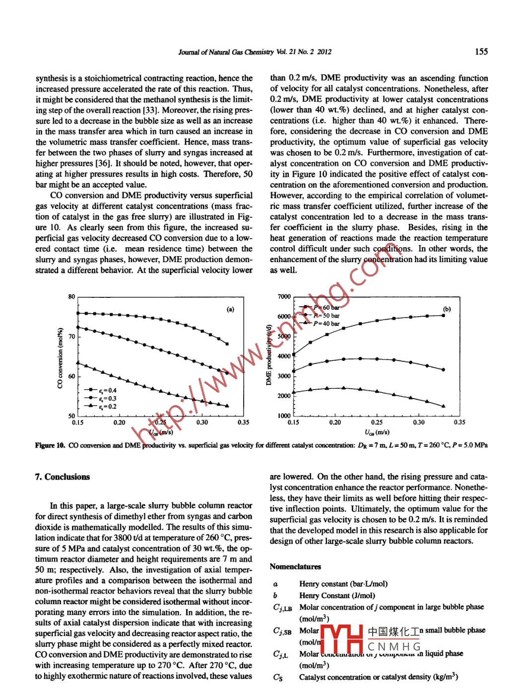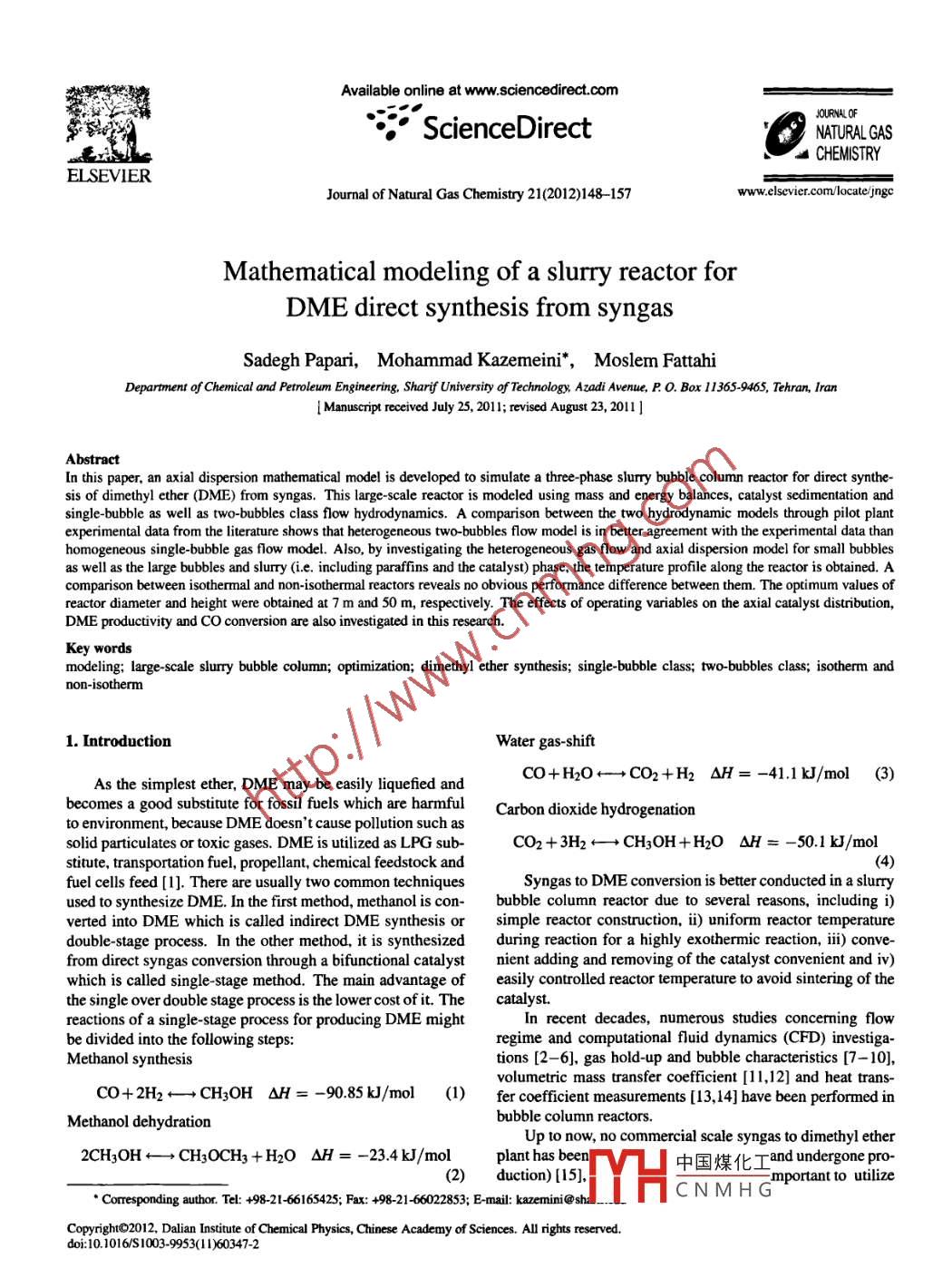Available online at www.sciencedirect.comJOURMULOFScienceDirectNATURALGASCHEMISTRYEL SEVIERJournal of Natural Gas Chemistry 21(2012)148-157www.elsevier.com/locate/jingcMathematical modeling of a slurry reactor forDME direct synthesis from syngasSadegh Papari,Mohammad Kazemeini*,Moslem FattahiDepartment of Chemical and Petroleum Engineering, Sharif University of Technology, Azadi Avenue, P. O. Box 11365-9465, Tehran, lranl Manuscript reeived July 25, 2011; revised August 23, 2011 ]Abstractsis of dimethyl ether (DME) from syngas. This large- scale reactor is modeled using mass and energy balances, catalyst sedimentation andsingle-bubble as well as two-bubbles class flow hydrodynamics. A comparison between the two hydrodynamic models through pilot plantexperimental data from the literature shows that heterogeneous two-bubbles flow model is in better agreement with the experimental data thanhomogeneous single-bubble gas flow model. Also, by investigating the heterogeneous gas flow and axial dispersion model for small bubblesas well as the large bubbles and slurry (i.e. including paraffins and the catalyst) phase, the temperature profile along the reactor is obtained. Acomparison between isothermal and non-isothermal reactors reveals no obvious performance difference between them. The optimum values ofreactor diameter and height were obtained at 7 m and 50 m, respectively. The effects of operating variables on the axial catalyst distribution,DME productivity and CO conversion are also investigated in this research.Key wordsmodeling; large scale slurry bubble column; optimization; dimethyl ether synthesis; single-bubble class; two bubbles class; isotherm andnon-isotherm1. IntroductionWater gas -shiftCO+H2O←- +CO2+H2△H= -41.1 kJ/mol (3)As the simplest ether, DME may be easily liquefied andbecomes a good substitute for fossil fuels which are harmfulCarbon dioxide hydrogenationto environment, because DME doesn't cause pollution such assolid particulates or toxic gases. DME is utilized as LPG sub-CO2 +3H2←+ CH3OH+H2O NH = - 50.1 kJ/molstitute, transportation fuel, propellant, chemical feedstock and4)fuel cells feed [1]. There are usually two common techniquesSyngas to DME conversion is better conducted in a slurryused to synthesize DME. In the first method, methanol is con-bubble column reactor due to several reasons, including i)verted into DME which is called indirect DME synthesis orsimple reactor construction, i) uniform reactor temperaturedouble-stage process. In the other method, it is synthesizedduring reaction for a highly exothermic reaction, ii) conve-from direct syngas conversion through a bifunctional catalystnient adding and removing of the catalyst convenient and iv)which is called single-stage method. The main advantage ofeasily controlled reactor temperature to avoid sintering of thethe single over double stage process is the lower cost of it. Thecatalyst.reactions of a single-stage process for producing DME mightIn recent decades, numerous studies concerning flowbe divided into the following steps:regime and computational fluid dynamics (CFD) investiga-Methanol synthesistions [2-6], gas hold-up and bubble characteristics [7- 10],volumetric mass transfer coefficient [1I,12] and heat trans-CO+2H2←→ CH3OH QH = - -90.85 kJ/mol (1)fer coefficient measurements [13,14] have been performed inMethanol dehydrationbubble column reactors.Up to now, no commercial scale syngas to dimethyl ether2CH3OH←+ CH3OCH3 +H2O AH = -23.4 kJ/molplant has beer中國煤化Iand undergone pro-2)duction) [15],:mportant to utilize●Corresponding author. Tel: +98-21-66165425; Fax: +98-21-66022853; E-mail: kazemini@shMYHCNMH GCopyrightO2012, Dalian Instiute ofChemical Physics,hinese Academy of Sciences. All rights reserved.doi:10.1016/S1003-9953(1 1)60347-2150Sadegh Papari et al/ Journal of Natural Gas Chemistry Vol. 21 No.2 20123. Mathematical modellingCsLarge bubbles are presented by the fllowing equaion:(1-εc)EsS + [(1- ec)Up - UsL]Cs+(14)8C,B]_ 8(ULBC;LB)_UsLCwve = 08zELBELBθz」(68TpsLUsLT-(1 - ec)psLEsL- = (psLUsLT)o (15)kal8(C; -C;L) = ELB8Cj,LBThe boundary conditions at the outlet of the slurry bubblewhile the small bubbles are presented by:column reactor include:aC;uB = 0(16)8esB EsB8CjisB]_ 8(UsBCjisB)_Oz(7)8C.sB = o(17)8Cj,sBhasB(C; -C;L)=εsB n8CjsL = o(18)and the slury phase is determined through:δzaCs=o(19)8C,sL]_ 8(UsLCj,sL) +元[(0-- sc)EsS0z 」二2+(20)hqauB(Cj - Cg,sL)+ kas(C; - Ci,sL)+(8)and the initial conditions are taken to be:CjLB= Cj,0(21)(1-eo)藝Mmv,r.= (1-eo)0GsLoCj,sB = Cj,0(22)in addition, the particle mass balance is given by: .CjL =Cj(23)Cs=Cave.(24):[(1-E)Es0Cs Iz()z ]T = Tool(25)(9)a-f(1 - ec)Up-UsL]Cs}= (1-εc)aCsThe empirical correlations utilized for the gas hold-up,Ftvolumetric mass transfer coefficient, superficial gas velocityof small bubbles, hindered sedimentation velocity of particles,while the energy balance is provided through:dispersion coffcient of small and large bubbles, as well asfor liquid for predictions of DME production and CO conver-sion in large-scale slurry bubble column reactor are summa-8z ]rized in Table 1.The inlet feed composition were set to YH2 =0.65,UHea(T - Too)+(1-εc), OHDME,i"DME,iyco = 0.32 and YCO2 = 0.03. Temperature of the cooling pipeswas taken to be 503 K. Other slurry bubble column reactorrparameters are provided in Table 2.= (1-ec)At(10)4. Kineticswhere, j =H2, CO, CO2, H2O, CH3OH, CH3OCH3.The boundary conditions at the inlet of the slurry bubbleIn the present study, the chemical kinetics of methanolcolumn reactor are Danckwertz's types, i.e:synthesis, water gas shift and DME synthesis as independentreactions were all taken from the Guo et al. [32]. CommercialULBCG;LaB -ELBELB2= ULBC,o(11)Cu-based methanol synthesis catalyst C301 and dehydrationcatalyst gamma alumina ware nsed [371_ In other words, reac-tion rate of me中國煤化工n the current model8C;sBUspC;sB - esB EsBixsB= UsBCj.o(12)is given by:YHCNMHGki PlL954 P9:91