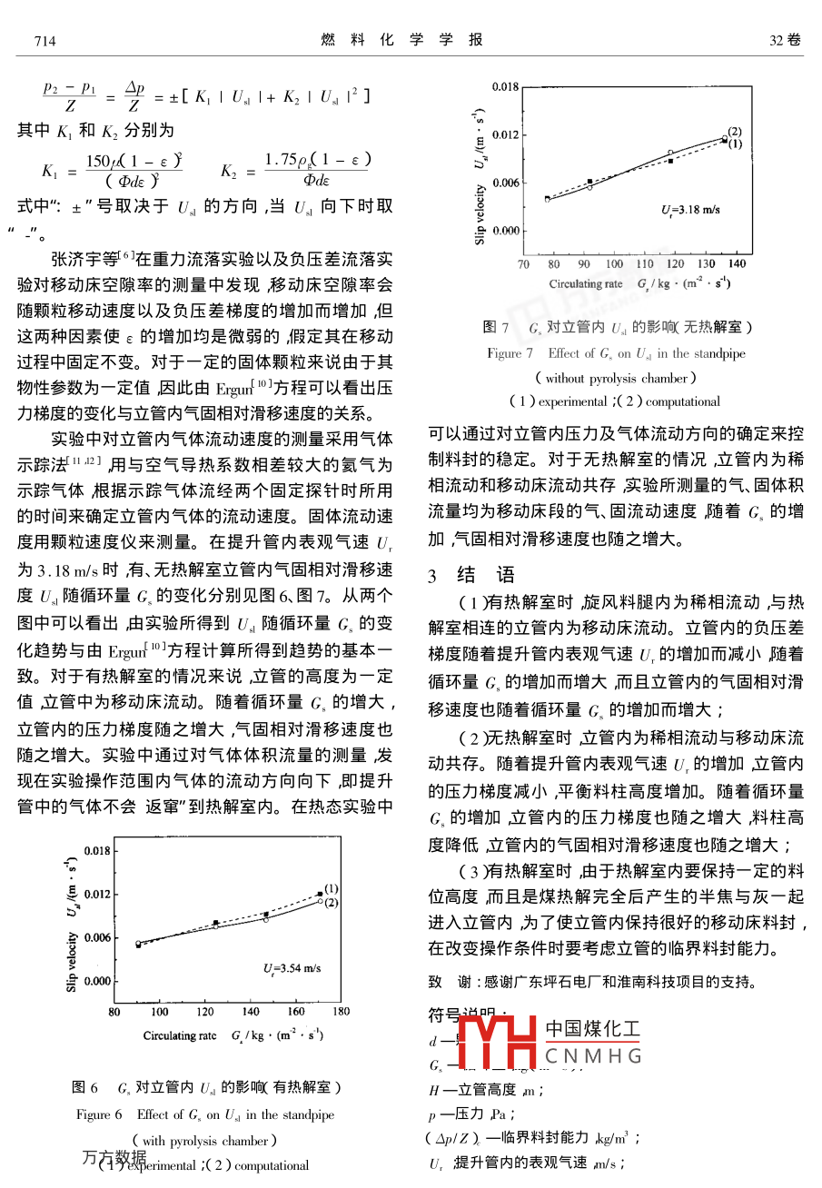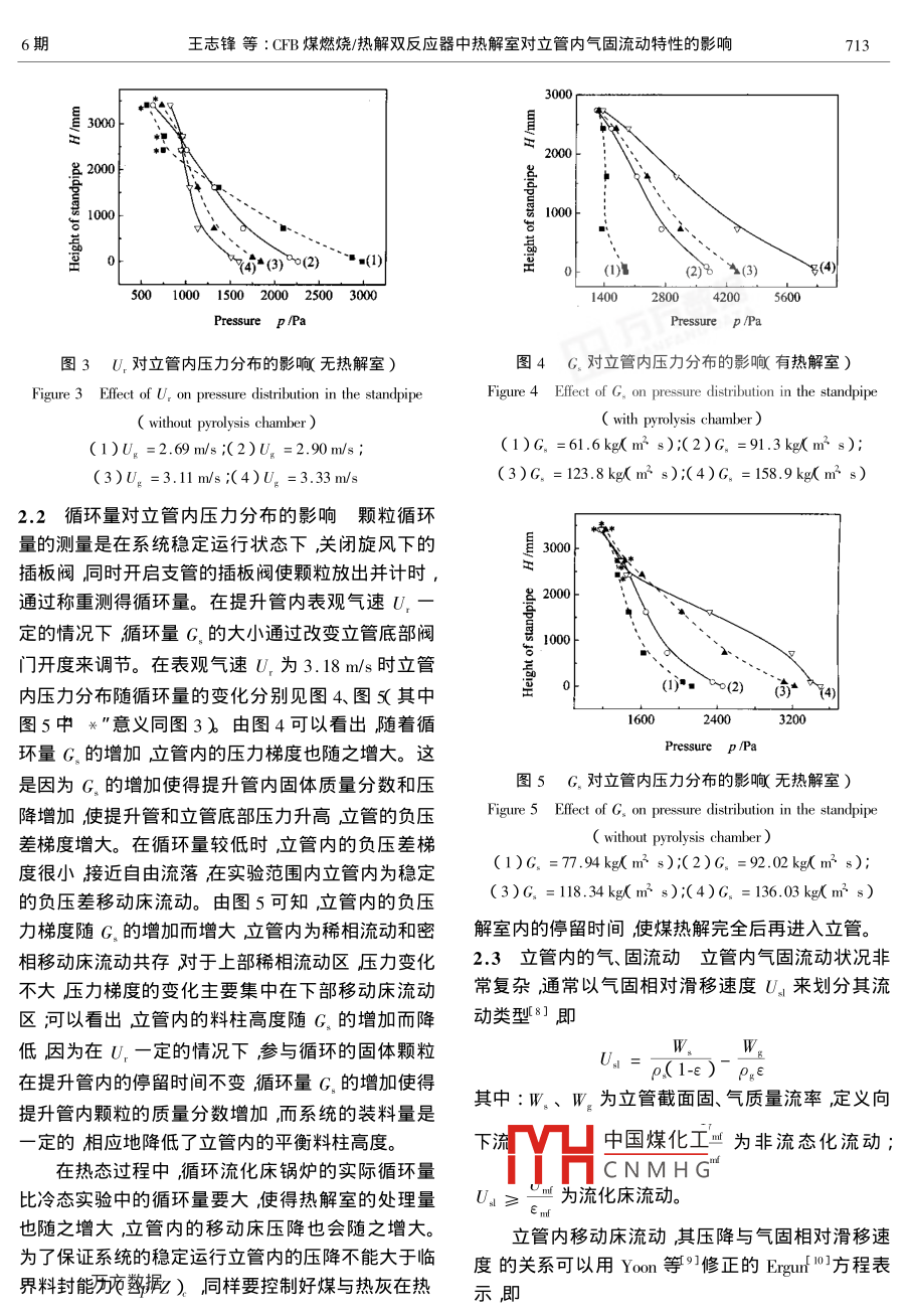 第32卷第6期燃料化學(xué)學(xué)報(bào)Vol 32 No 6204年12OURNAL OF FUEL CHEMISTRY AND TECHNOLOGY文章編號:0253-240X2004)6-071106CFB煤燃燒/熱解雙反應(yīng)器中熱解室對立管內(nèi)氣固流動(dòng)特性的影響王志鋒12,梁鵬2,董眾兵3,畢繼誠(1.中國科學(xué)院山西煤炭化學(xué)研究所煤轉(zhuǎn)化國家重點(diǎn)實(shí)驗(yàn)室,山西太原032.中國科學(xué)院研究生院,北京100039;3.安徽理工大學(xué)化工系,安徽淮南摘要∶考察了循環(huán)流化床煤燃燒/熱解雙反應(yīng)器系統(tǒng)中熱解室的存在對立管內(nèi)的壓力分布及氣固流動(dòng)狀況的影響。提升管的內(nèi)徑100mm高6m立管的內(nèi)徑44m高3m熱解室的截面積200mm×200mm高770mm結(jié)果表明隨著提升管內(nèi)表觀氣速U的增加有無熱解室立管內(nèi)均為負(fù)壓差流動(dòng)負(fù)壓差梯度隨著U,的增加而減小。有熱解室時(shí)熱解室內(nèi)要保持一定的料位高度整個(gè)立管內(nèi)固體顆粒的流動(dòng)為負(fù)壓差移動(dòng)床流動(dòng)沒有熱解室時(shí)立管內(nèi)為稀相流動(dòng)和移動(dòng)床流動(dòng)冋時(shí)存在立管內(nèi)平衡料柱高度隨U的增加而升高。隨著循環(huán)量G.的増加兩種類型的立管內(nèi)負(fù)壓差梯度均隨之增大也存在著流動(dòng)形態(tài)的差別。循環(huán)量G.的増加會(huì)引起立管內(nèi)平衡料柱高度的降低。立管內(nèi)氣固相對滑移速度也隨著循環(huán)量G的增加而增大。關(guān)鍵詞:循環(huán)流化床CFB0;煤熱解;立管;氣固流動(dòng)中圖分類號:TQ52文獻(xiàn)標(biāo)識碼:A循環(huán)流化床〔CFB)廣泛應(yīng)用于氣固接觸過程,大類即非流態(tài)化流動(dòng)又稱移動(dòng)床流動(dòng)、填充床流如燃燒、煤氣化以及催化反應(yīng)等,尤其是CFB燃燒動(dòng)或粘附滑移流動(dòng)湘流態(tài)化流動(dòng)。立管內(nèi)顆粒流技術(shù)作為一種新型高效低污染清潔煤技術(shù),備受研動(dòng)的復(fù)雜性主要表現(xiàn)在有時(shí)兩種不同類型的流動(dòng)方究者關(guān)注。將煤直接燃燒是對煤中高附加烴類資式共存如稀相-填充床共存、稀相-密相共存以及源的浪費(fèi)直接燃燒過程中煤中污染物稀釋在體積密相-填充床共存等。郭天民等、IHo龐大的煙氣中污染物是爐中脫除還是爐后脫除都hong3、張濟(jì)宇等對單一立管移動(dòng)床中的氣固流會(huì)帶來熱效率的低下或動(dòng)力的大量消耗給污染物動(dòng)規(guī)律都做了大量的研究, LI Hong-hong還繪制了脫除帶來困難將煤的燃燒與熱解有杋地耦合起立管移動(dòng)床氣固流動(dòng)相圖并對理想料封狀態(tài)做了來利用循環(huán)流化床的熱灰作為熱載體對煤進(jìn)行低系統(tǒng)闡述。為了掌握該系統(tǒng)中流體的流動(dòng)特性,為溫?zé)峤忉尫艑缃褂秃蜔峤鈿鉄峤夂蟮陌虢古c熱灰熱態(tài)過程的開發(fā)和設(shè)計(jì)提供必要旳參數(shù)在實(shí)驗(yàn)室再返回到循環(huán)流化床進(jìn)行燃燒產(chǎn)生蒸氣用來發(fā)電建立了一套循環(huán)流化床燃燒熱解冷模實(shí)驗(yàn)裝置重和供熱實(shí)現(xiàn)熱、電、油、氣四聯(lián)產(chǎn)將煤中高附加值點(diǎn)考察該系統(tǒng)中熱解室對立管內(nèi)氣、固流動(dòng)狀況的的烴類提取出來而且顯著提高了整個(gè)過程的熱效影響率同時(shí)降低了治污成本。循環(huán)流化床燃燒/熱解系統(tǒng)是在循環(huán)流化床的旋風(fēng)分離器與立管間加入了熱1實(shí)驗(yàn)裝置實(shí)驗(yàn)裝置見圖1提升管的內(nèi)徑為100mm、高為解反應(yīng)器將循環(huán)灰引入熱解反應(yīng)器與煤混合進(jìn)行6m立管的內(nèi)徑為44m、高為3m熱解室的截面熱解后再通過立管返回床內(nèi)。立管作為連接循環(huán)流積為200m×200m、高為770mm。提升管中固體化床與熱解反應(yīng)器的通道既要使熱解后的半焦和顆粒由氣體夾帶進(jìn)入旋風(fēng)分離器經(jīng)氣固分離后進(jìn)入熱灰順暢返回循環(huán)流化床又要防止循環(huán)流化床中底部帶有錐形氣體分布板的熱解室中再經(jīng)由底部的含氧氣體竄入熱解反應(yīng)器以免發(fā)生危險(xiǎn)即立管裝有閘板閥的立管返回提升管中。為了考察熱解室要起到足夠的料封作用因而立管的設(shè)計(jì)與操作對對立管內(nèi)氣固流動(dòng)狀況的影響將熱解室用與立管燃燒/熱解系統(tǒng)旳穩(wěn)定運(yùn)行至關(guān)重要。而通常立管內(nèi)的氣固流動(dòng)型式非常復(fù)雜 ,Leung等3對立管內(nèi)的冷運(yùn)V中國煤化工顆粒經(jīng)旋風(fēng)分離器分流動(dòng)形態(tài)提出了劃分標(biāo)準(zhǔn)概括起來主要可分成兩離后CNMHG閥控制再返回到提升管中其他組件的位置均不變。圖1熱解室上有為收稿日期:2004-06-09;修回日期:2004-10-16基金項(xiàng)目:國家重點(diǎn)基礎(chǔ)研究發(fā)展規(guī)劃項(xiàng)目(G1990221-02)作者簡介萬韓挹972-)男山西運(yùn)城人博士研究生化學(xué)工藝專業(yè)。 E-mail wang@ sicc,e712化模擬釋放熱解氣而設(shè)的出口為了比較二者的差別,轉(zhuǎn)子流量計(jì)來改變提升管內(nèi)的表觀氣速U的大小在取代熱解室的立管相同高度的位置上也設(shè)有開立管內(nèi)的壓力分布隨U變化分別見圖2圖注口。立管內(nèi)的壓力分布由壓力自動(dòng)采集系統(tǒng)來完實(shí)驗(yàn)所測的壓力為表壓,下同)有熱解室時(shí),熱解成。在