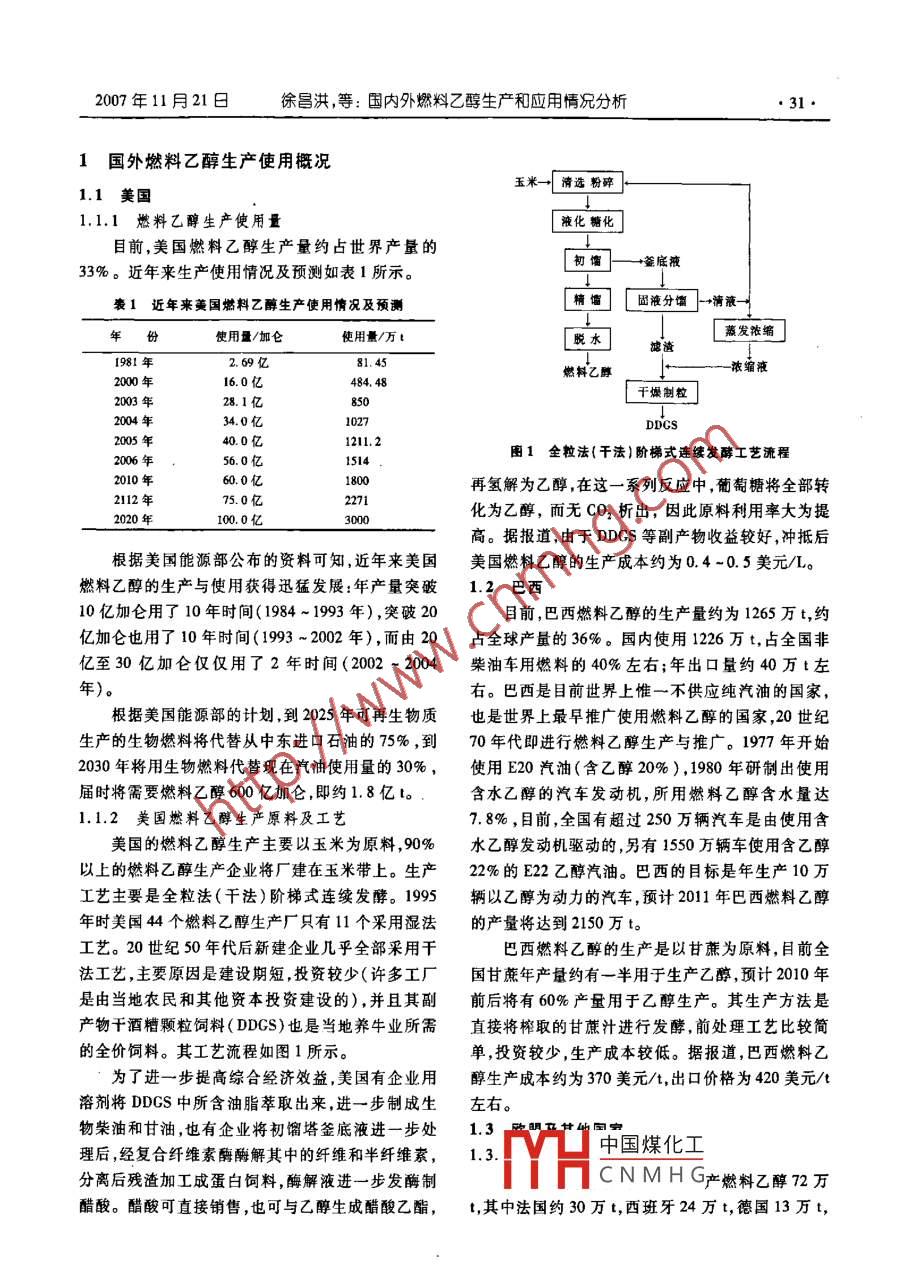 o.15,No.22精細(xì)與專用化學(xué)品第15卷第22期Fine and Specialty Chemicals200年11月21日市場(chǎng)資訊國(guó)內(nèi)外燃料乙醇生產(chǎn)和應(yīng)用情況分桁徐昌洪·方家驥(南京綠天源生物化工工程有限公司,江蘇南京210003)摘要:介紹國(guó)內(nèi)外燃料乙醇的生產(chǎn)和應(yīng)用情況。美國(guó)和巴西的燃料乙醇產(chǎn)量占世界總產(chǎn)量69%,其中美國(guó)約占33%,2006年美國(guó)的使用量為1514萬(wàn)t;巴西約占36%,巴西的產(chǎn)量為1265萬(wàn)t。同時(shí),還簡(jiǎn)介了歐盟加拿大、日本、印度和泰國(guó)的燃料乙醇的應(yīng)用情況。2006年我國(guó)燃料乙醇的使用量約110萬(wàn)t,截至2006年底,我國(guó)燃料乙醇的總產(chǎn)能達(dá)163萬(wàn)v/a。按不同的原料介紹了我國(guó)燃料乙醇的生產(chǎn)工藝,即玉米、木暮、糖蜜、甜高粱和秸稈。最后對(duì)我國(guó)燃料乙醇的發(fā)展提出了幾點(diǎn)建議。關(guān)鍵詞:燃料;乙醇;玉米;木薯;秸稈Analysis on Production and Application Situation ofFuel ethanol at Home and abroadXU Chang-hong, FANG Jia-jiNanjing Lutianyuan Biochemical Engineering Co., Ltd., Nanjing 210003, China)Abstract: The production and application situation of fuel ethanol at home and abroad were introduced. The total out-put of fuel ethanol in America and Brazil accounted for 69% of global total output. Thereinto, the share of America accoun-ted for 33 %, consumption of fuel ethanol in 2006 was 15. 14 million tons in the United States: Brazil accounted for 36%its output was 12. 65 million tons. Meanwhile, the application situation of fuel ethanol in European Union, Canada, JapanIndia and Thailand were introduced in brief. In 2006, China's consumption of fuel ethanol was 1. 1 million tons, up to theend of 2006, the domestic capacity of fuel ethanol was 1. 63 million tons per year. The technologies for production of fuelethanol based on different raw materials namely, corn, cassava, molasses, sweet grain sorghum and straw were introducedseparately. Finally, gome suggestions on development of Chinas fuel ethanol werKey words: fuel; ethanol; corn; cassava;straw自20世紀(jì)中期以來(lái),石油成為世界上最重要的尾氣CO排放量的30%,烴類排放量的40%,同時(shí)能源物資。但當(dāng)前世界石油供應(yīng)比較充裕的狀況難減少CO2和氮氧化合物的排放。以持久,新發(fā)現(xiàn)的石油儲(chǔ)量越來(lái)越少,產(chǎn)量也日漸減世界各國(guó)對(duì)可再生能源的發(fā)展給予了高度重少。近年來(lái),中東局勢(shì)動(dòng)蕩,尤其是日漸減少的石油視,競(jìng)相開(kāi)發(fā)。美國(guó)、巴西走在世界前列,兩國(guó)燃料資源和日益增加的開(kāi)采費(fèi)用,使得石油價(jià)格持續(xù)攀升,給世界經(jīng)濟(jì)的發(fā)展投下濃重的陰影,從而使以可乙醇產(chǎn)量占世界產(chǎn)量的69%。我國(guó)從20世紀(jì)80再生物質(zhì)生產(chǎn)代用能源成為大勢(shì)所趨。汽車尾氣對(duì)年代起即考慮用可再生物質(zhì)生產(chǎn)能源產(chǎn)品以應(yīng)對(duì)能環(huán)境的污染日益嚴(yán)重,環(huán)境的惡化是人類共同面對(duì)源危機(jī),國(guó)內(nèi)第一套以玉米為原料生產(chǎn)乙烯/環(huán)氧乙的一大難題。添加10%的燃料乙醇可以減少汽車烷聯(lián)合裝置在19%5年正式立項(xiàng)1992年開(kāi)工建設(shè)。中國(guó)煤化工收稿日期:20070829CNMHG作者簡(jiǎn)介:徐昌洪,教授級(jí)高工,中國(guó)國(guó)際咨詢公司專家,長(zhǎng)期從事發(fā)酵和化工產(chǎn)品開(kāi)發(fā)。2007年11月21日徐昌洪,等:國(guó)內(nèi)外燃料乙醇生產(chǎn)和應(yīng)用情況分析311國(guó)外燃料乙醇生產(chǎn)使用概況1.1美國(guó)玉米→清選粉碎1.1.1燃料乙醇生產(chǎn)使用量液化糖化」目前,美國(guó)燃料乙醇生產(chǎn)量約占世界產(chǎn)量的餾釜底液33%。近年來(lái)生產(chǎn)使用情況及預(yù)測(cè)如表1所示。表1近年來(lái)美國(guó)燃料乙醇生產(chǎn)使用情況及預(yù)測(cè)精」[固液分館清液年份使用量/加侖使用量萬(wàn)t濃濾渣2.69億81.45燃料乙醇濃縮液16.0億1億燥制粒34.0億40.0億1211.22006年56.0億圖1全粒法(干法)階梯式連續(xù)發(fā)酵工藝流程60.0億再氫解為乙醇,在這一系列反應(yīng)中,葡萄糖將全部轉(zhuǎn)2020年100.0億3000化為乙醇,而無(wú)CO2析出,因此原料利用率大為提高。據(jù)報(bào)道,由于DDGS等副產(chǎn)物收益較好,沖抵后根據(jù)美國(guó)能源部公布的資料可知近年來(lái)美國(guó)美國(guó)燃料乙醇的生產(chǎn)成本約為04-05美元/L燃料乙醇的生產(chǎn)與使用獲得迅猛發(fā)展:年產(chǎn)量突破1.2巴西10億加侖用了10年時(shí)間(1984~1993年),突破20目前,巴西燃料乙醇的生產(chǎn)量約為1265萬(wàn)t,約億加侖也用了10年時(shí)間(1993~2002年),而由20古全球產(chǎn)量的36%。國(guó)內(nèi)使用1226萬(wàn)t,占全國(guó)非億至30億加侖僅僅用了2年時(shí)間(2002-2004柴油車用燃料的40%左右;年出口量約40萬(wàn)t左年)。右。巴西是目前世界上惟一不供應(yīng)純汽油的國(guó)家,根據(jù)美國(guó)能源部的計(jì)劃,到2025年可再生物質(zhì)也是世界上最早推廣使用燃料乙醇的國(guó)家,20世紀(jì)生產(chǎn)的生物燃料將代替從中東進(jìn)囗石油的75%,到70年代即進(jìn)行燃料乙醇生產(chǎn)與推廣。1977年開(kāi)始2030年將用生物燃料代替現(xiàn)在汽油使用量的30%,使用E20汽油(含乙醇20%),1980年研制出使用屆時(shí)將需要燃料乙醇600億加侖,即