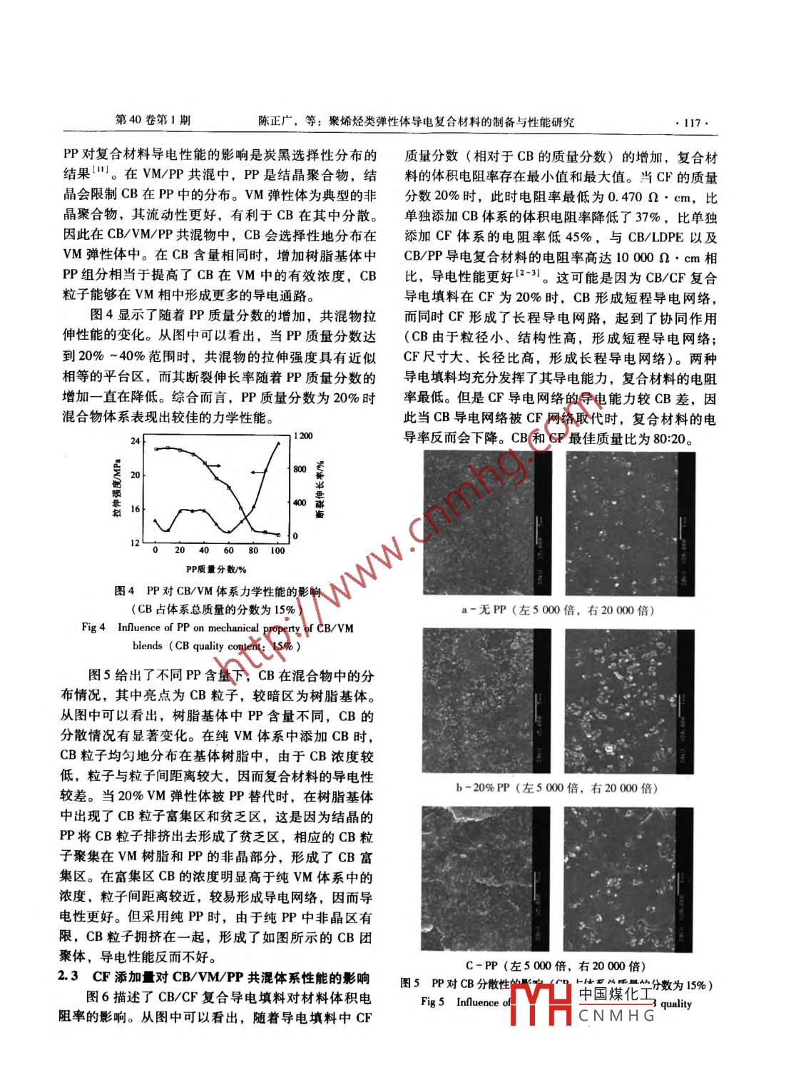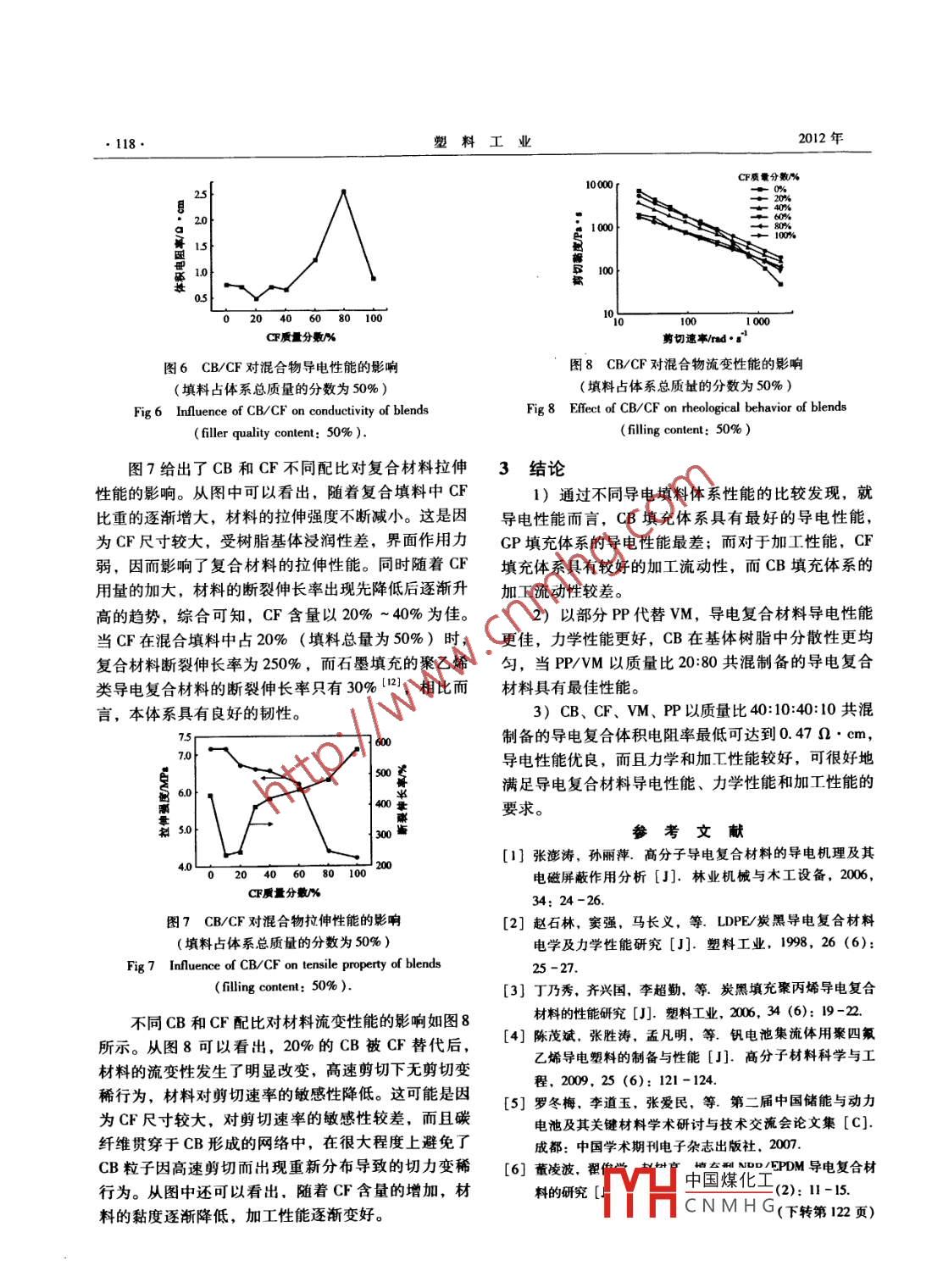 第40卷第1期塑料工業(yè)2012年1月CHINA PLASTICS INDUSTRY115·聚烯烴類彈性體導(dǎo)電復(fù)合材料的制備與性能研究陳正廣,周濤,武建勛,夏利平,惠江濤,李林,張愛民(高分子材料工程國(guó)家重點(diǎn)實(shí)驗(yàn)室,四川大學(xué)高分子研究所,四川成都610065)摘要:將炭黑(CB)和碳纖維(CF)導(dǎo)電粒子加入到新型聚丙烯彈性體( Vistamaxx)與聚丙烯(PP)基體樹脂中,共混制備導(dǎo)電復(fù)合材料。通過體積電阻率測(cè)試、力學(xué)性能測(cè)試和加工流變性能測(cè)試,得到了體積電阻率最低為047·cm,拉伸強(qiáng)度為66MPa,斷裂伸長(zhǎng)率為250%,具有良好加工性能的導(dǎo)電復(fù)合材料。關(guān)鍵詞:炭黑;碳纖維;石墨;新型聚丙烯彈性體;導(dǎo)電復(fù)合材料中圖分類號(hào):TQ325.14文獻(xiàn)標(biāo)識(shí)碼:A文章編號(hào):1005-5770(2012)01-0115-04Study on Reparation and Properties of Polyolefin Elastomeric Conductive CompositesCHEN Zheng"guang, ZHOU Tao, WU Jian-xun, XIA Li-ping, HUl Jiang-tao, LI Lin, ZHANG Ai-minState Key Laboratory of Polymer Materials Engineering, Polymer Research Institute of SichuanUniversity, Chengdu 610065, China)Abstract: By adding the carbon black (CB)and carbon fiber( CF)conductive particles into the newpolypropylene elastomer Vistamaxx) and polypropylene( PP) matrix resin blend, a conductivewas prepared. Through the volume resistivity test, mechanical test, processing rheology test, we can get theconductive composite with the low volume resistivity of 0. 47 n. cm, the tensile strength of 6. 6 MPa, elongation at break of 250%, and good processing propertiesKeywords: Carbon Black; Carbon Fiber; Graphite; New polypropylene Elastomer; Conductive Composite高分子導(dǎo)電復(fù)合材料是導(dǎo)電材料研究的一個(gè)重要1實(shí)驗(yàn)部分分支,現(xiàn)已廣泛應(yīng)用于電子領(lǐng)域和電磁屏蔽等領(lǐng)1.1主要原料及試劑域。目前高分子導(dǎo)電復(fù)合材料基體材料主要有新型聚丙烯彈性體: Vistamaxx6202,美國(guó)??松璓E、PP、PTFE、 SEBS/PP和EPDM/PP等,常用的美孚化工公司;聚丙烯:K8303,中石化燕山石化;導(dǎo)電填料有導(dǎo)電炭黑(CB),碳纖維(CF)和石墨炭黑、碳纖維、石墨、抗氧劑等試劑:市售。(GP)等26。由這些材料制備的導(dǎo)電復(fù)合材料在某12實(shí)驗(yàn)儀器及設(shè)備些方面存在缺陷,例如由PE和PP為基材制備的導(dǎo)微機(jī)控制電子萬(wàn)能試驗(yàn)機(jī):CMT4104,深圳市新電復(fù)合材料機(jī)械性能比較差; SEBS/PP和 EPDM/PP三思材料檢測(cè)有限公司;高阻計(jì):ZC36,上海精密類的導(dǎo)電復(fù)合材料高溫流動(dòng)性較差;PTFE類的加工科學(xué)儀器有限公司第六電表廠;程控絕緣電阻測(cè)試工序比較復(fù)雜,加工性能需要進(jìn)一步改善,而且成本儀:YD980A,常州揚(yáng)子電子有限公司;四探針電阻較高。新型聚丙烯彈性體( Vistamaxx,縮寫為M,測(cè)試儀(配R48#號(hào)針頭):SDY-4,廣州半導(dǎo)體材料下同)采用茂金屬作引發(fā)劑,加入少量的乙烯單體研究所;高壓毛細(xì)管流變儀: Rosand RH7D以無(wú)規(guī)的方式插入聚丙烯主鏈中,破壞了丙烯鏈段的 BOHLIN儀器公司;掃描電子顯微鏡(SEM):JSM結(jié)晶,而使其具有優(yōu)良的彈性,可有效改善PP導(dǎo)電5900LV,日本日立公司。復(fù)合材料韌性較差的缺點(diǎn),同時(shí)還有較好的力學(xué)強(qiáng)13樣品制備度。本文首次利用VM/PP為基體材料,加人導(dǎo)電粒首先將抗氧劑加入到基體樹脂中,在雙輥筒煉塑子CB/CF通過共混制得了導(dǎo)電性能優(yōu)良,力學(xué)強(qiáng)度機(jī)上開煉使其塑化(其中ⅤM樹脂塑煉溫度為80℃,和加工性較好的導(dǎo)電復(fù)合材料。塑煉時(shí)間為3min;含P樹脂的塑爍溫度為170℃,教育部新世紀(jì)優(yōu)秀人才支持計(jì)劃”基金支持(NCET0840368)*聯(lián)系人中國(guó)煤化工作者簡(jiǎn)介:陳正廣,男,1986年,研究生,主要從事塑料合成與改性的研究。. yHCNMHG116塑料工業(yè)2012年塑煉時(shí)間為5min);然后加入CB、CF、GP,繼續(xù)混積電阻率為0.64·cm的高導(dǎo)電復(fù)合材料。煉,待各種填料混合均勻后取出;最后將混煉好的物圖2是采用高壓毛細(xì)管流變儀測(cè)得的不同導(dǎo)電填料在半自動(dòng)壓力成型機(jī)上于180℃溫度下壓制成型,料體系的流變曲線,填料添加量(占體系總質(zhì)量)制樣后進(jìn)行各種性能測(cè)試。均為50%。從圖中可以看出,相對(duì)于純VM體系抗氧劑CB、CF、GP填充體系的熔體黏度增大,且CFVM和GP/VM體系黏度的剪切速率敏感性規(guī)律與純VM基本一致。而樹脂雙輥塑化雙輥混煉一壓制成型CB填充體系的黏度對(duì)剪切速率具有較高的敏感性1.4性能測(cè)試與表征表現(xiàn)為在低剪切速率區(qū)相對(duì)于GP和CF體系要高很拉伸性能按照GB/T1040-200進(jìn)行測(cè)試,載荷多,但在高剪切速率區(qū)與CP和CF體系幾乎相等。為500N,拉伸速率為200mm/min;導(dǎo)電性能測(cè)試:這可能是由于在高填充量下CB粒子容易團(tuán)聚,在受體積電阻率超過10g·cm的樣品采用ZC36型高阻到高剪切速率作用時(shí),團(tuán)聚體被拆散導(dǎo)致CB填充體計(jì)測(cè)量體積電阻率;對(duì)于體積電阻率低于102·cm系的黏度對(duì)剪切速率具有較高的敏感性。的樣品采用SDY4型四探針測(cè)試儀測(cè)量體積電阻率;1000對(duì)于體積電阻率在102~100g·cm之間的樣品,用YD9820A型程控絕緣電阻測(cè)試儀測(cè)量其電阻率;流e變性能實(shí)驗(yàn)在雙管型高壓毛細(x