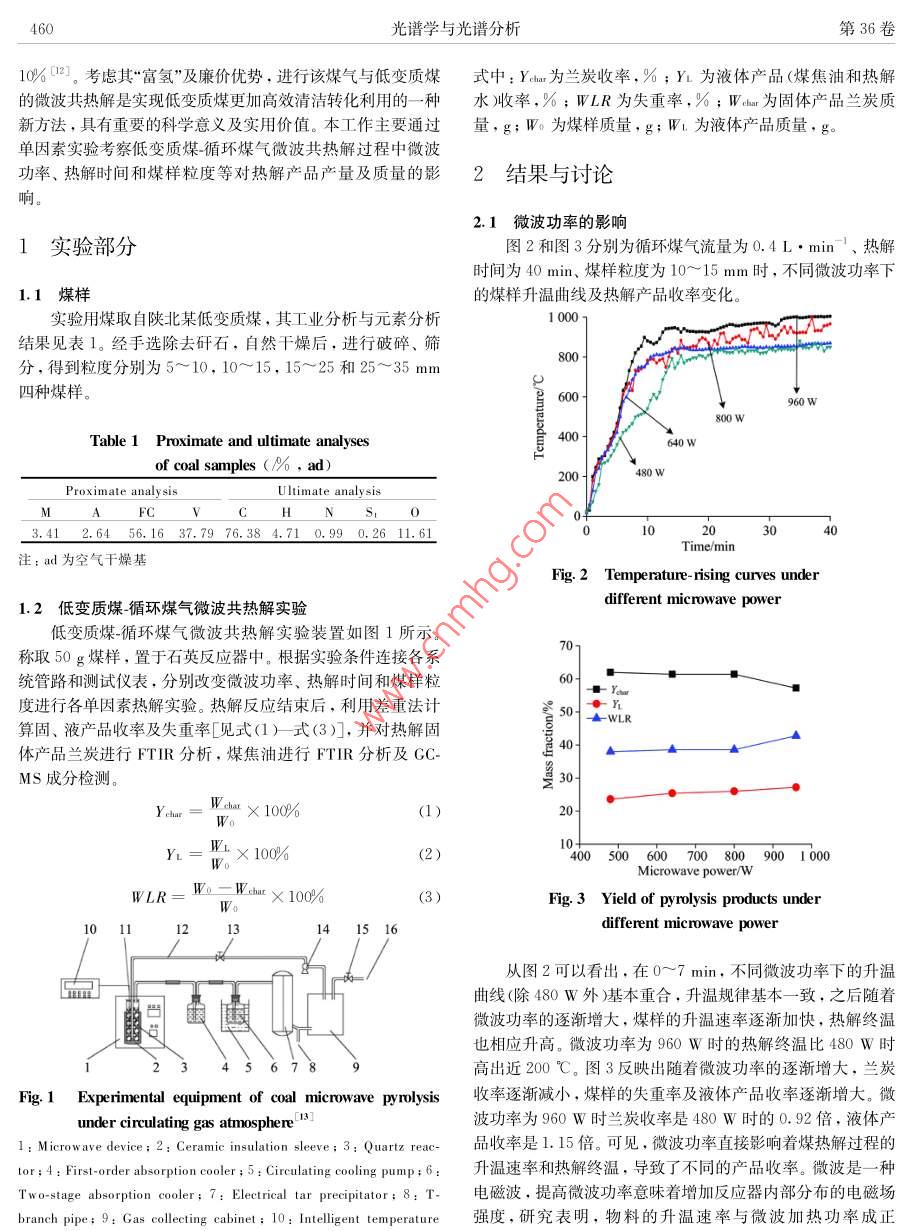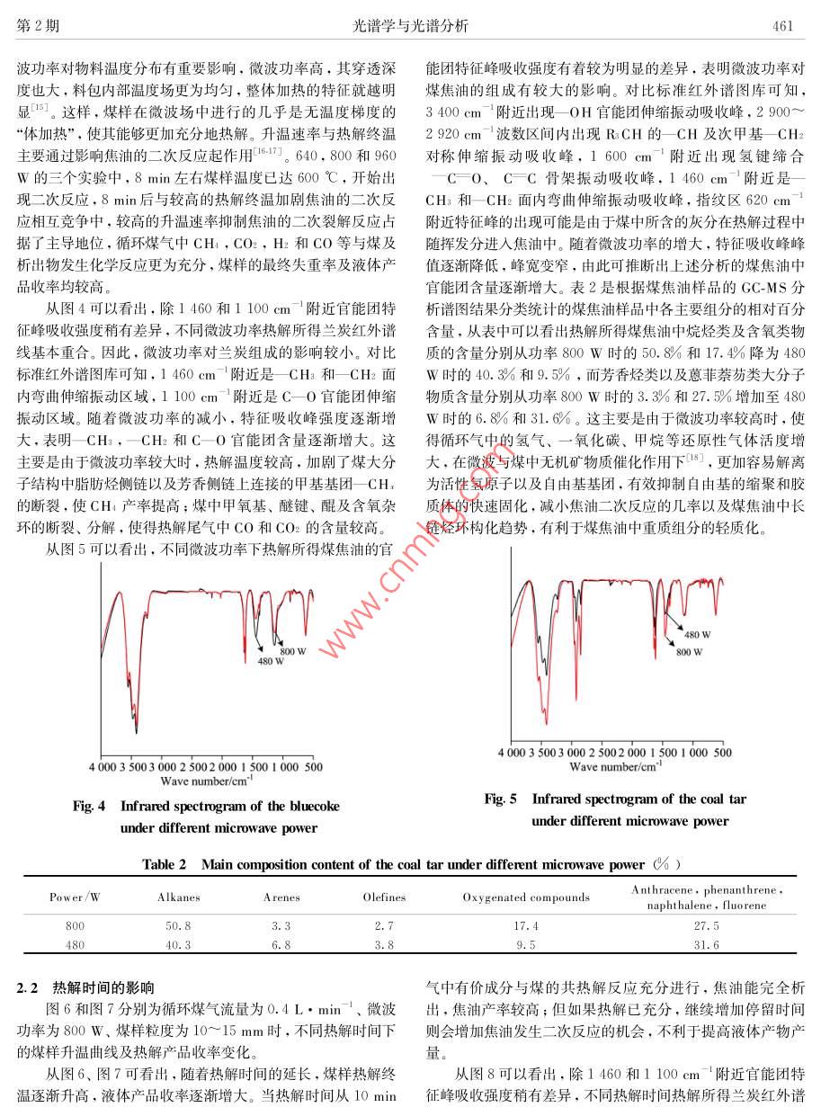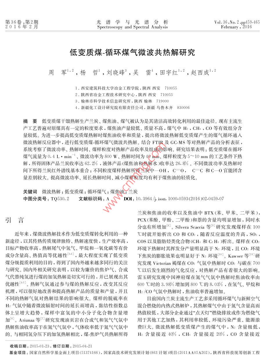第36卷,第2期光譜學(xué)與光譜分析Vol. 36.No.2 ,pp459-4652016年2月Spectroscopy and Spectral A nalysisFebruary , 2016低變質(zhì)煤~循環(huán)煤氣微波共熱解研究周軍',2,楊哲’,劉曉峰”,吳雷,田宇紅2,趙西成121.西安建筑科技大學(xué)冶金工程學(xué)院.陜西西安7100552.陜西省冶金工程技術(shù)研究中心,陜西西安7100553.榆林市科學(xué)技術(shù)信息研究所,陜西榆林7190004.新疆化工設(shè)計(jì)研究院有限責(zé)任公司,新疆烏魯木齊830006摘要低變質(zhì)煤干餾熱解生產(chǎn)蘭炭、煤焦油、 煤氣被認(rèn)為是其清潔高效轉(zhuǎn)化利用的最佳途徑?,F(xiàn)有主流生產(chǎn)工藝普遍對原煤具有一定的粒度要求.煤焦油產(chǎn)量較低、質(zhì)量不高,煤氣中Hz, CH,CO等有效組分含量較低。為進(jìn)一步提高低變質(zhì)煤熱解時(shí)煤焦油收率和質(zhì)量,提出將微波熱解低變質(zhì)煤產(chǎn)生的煤氣循環(huán)通入微波熱解反應(yīng)器中,進(jìn)行低變質(zhì)煤循環(huán)煤氣微波共熱解。結(jié)合FTIR及GC-MS等對熱解產(chǎn)品的分析表征,系統(tǒng)考察了微波功率、熱解時(shí)間、煤樣粒度對熱解產(chǎn)品收率及組成的影響。研究結(jié)果表明:低變質(zhì)煤在循環(huán)煤氣流量為0.4 L. min '、微波功率為800 w.熱解時(shí)間為40 min、煤樣粒度為5~ 10 mm的工藝條件下熱解,所得固體產(chǎn)品蘭炭收率達(dá)62.2%,液體產(chǎn)品(煤焦油和熱解水)收率達(dá)26.8%。不同微波功率及熱解時(shí)間下所得蘭炭紅外譜線基本重合;不同粒度煤樣熱解所得蘭炭中一OH,C =0,CFC和C-0官能團(tuán)含量差別較大。提高微波功率、延長熱解時(shí)間、減小煤樣粒度均有利于煤焦油的輕質(zhì)化。關(guān)鍵詞微波熱解 ;低變質(zhì)煤;循環(huán)煤氣;煤焦油;蘭炭中圖分類號: TQ530.2文獻(xiàn)標(biāo)識碼: ADOI: 10. 3964/j. ssn. 1000-0593(2016 )02-0459-07蘭炭和焦油的收率以及焦油中BTX(苯、甲苯、二甲苯),引言PCX(苯酚、甲酚、二甲酚)和萘的含量均明顯增加,同時(shí)水分也有所增加”。Silvera Seaccia等91研究發(fā)現(xiàn)煤樣在100近年來,煤微波熱解技術(shù)作為低變質(zhì)煤轉(zhuǎn)化利用的一-種°C時(shí)就開始析出CO和CO2,隨著反應(yīng)溫度的升高,SO2,新途徑,以其傳熱傳質(zhì)規(guī)律獨(dú)特、熱解速度快,生產(chǎn)效率高,COS以及脂肪烴類化合物(CH:和C2 H )析出。煤樣在CO2目標(biāo)產(chǎn)物收率高,熱解尾氣中氫氣、甲烷和一- 氧化碳等有價(jià)環(huán)境下熱解時(shí)其揮發(fā)分產(chǎn)量明顯高于N2環(huán)境,且CO2環(huán)境成分含量高、熱值高等優(yōu)越性13],最大程度實(shí)現(xiàn)了低變質(zhì)下焦炭的膨脹效果也明顯好于N2環(huán)境”0]。Kawser 等研煤分級提質(zhì)利用的目的,得到了國內(nèi)外越來越多同行的關(guān)注究發(fā)現(xiàn)Vicetorian褐煤在CO2氣氛中熱解時(shí)CO2與碳在700與研究。國內(nèi)外相關(guān)研究表明,以較為廉價(jià)的焦?fàn)t氣、合成°C以后發(fā)生劇烈的氣化反應(yīng),對熱解產(chǎn)品有著很大的影響。氣代替純氫進(jìn)行煤的加氫熱解是切實(shí)可行的,并已展現(xiàn)出其雷玉研究發(fā)現(xiàn)中國神府煤在氮?dú)鈿夥罩袩峤鈺r(shí)焦油收率由優(yōu)越性*5。熱解氣氛通過參與煤的熱解反應(yīng),改變其反應(yīng)600 C時(shí)的3. 98%增加到800 °C的8.03% , 在氫氣、甲烷和機(jī)理,可以很好地改善和提高熱解產(chǎn)品的質(zhì)量和產(chǎn)量,并且.H2 /C0氣氛中熱解時(shí),焦油收率普遍增加。不同的熱解氣氛對熱解結(jié)果的影響很大。煤樣的脫硫率在目前國內(nèi)蘭炭主流生產(chǎn)工藝多采用循環(huán)煤氣與新鮮空氣H2氣氛中隨著微波輻射時(shí)間的延長而增高,黏結(jié)性指數(shù)總混合燃燒的內(nèi)熱式熱解爐,其熱解煤氣中由于氮?dú)夂扛叨w上呈增大趨勢,煤樣中富氫的中小分子化合物含量增熱值較低,大部分企業(yè)通過“點(diǎn)天燈”燃燒排放或作為燃燒氣加”。Ariunaa等口研究發(fā)現(xiàn)油頁巖在合成氣和氫氣氣氛中用于其他工藝加熱,其利用率較低、環(huán)境污染嚴(yán)重、能源浪費(fèi)巨大。微波熱解低變質(zhì)煤產(chǎn)生的煤氣中,N2含量極低,的。與相同氫分壓下的加氫熱解相比,煤焦?fàn)t氣共熱解所得H2含量接近40%,CH4含量接近20%,C0含量接近.收稿日期: 2015-01-23.修訂日期: 2015-04-21基金項(xiàng)目:國家自然科學(xué)基金面上項(xiàng)目(51374166).國家高技術(shù)研究發(fā)展計(jì)劃(863計(jì)劃)項(xiàng)目<2011AA05A202).陜西省科技統(tǒng)籌創(chuàng)新工程460光譜學(xué)與光譜分析第36卷10%021??紤]其“富氫”及廉價(jià)優(yōu)勢.進(jìn)行該煤氣與低變質(zhì)煤式中:Yehar為蘭炭收率,%;YL為液體產(chǎn)品(煤焦油和熱解的微波共熱解是實(shí)現(xiàn)低變質(zhì)煤更加高效清潔轉(zhuǎn)化利用的- -種水)收率,% ; WLR為失重率,% ; Wahar 為固體產(chǎn)品蘭炭質(zhì)新方法,具有重要的科學(xué)意義及實(shí)用價(jià)值。本工作主要通過量,g; Wo為煤樣質(zhì)量,g; W1.為液體產(chǎn)品質(zhì)量,go單因素實(shí)驗(yàn)考察低變質(zhì)煤循環(huán)煤氣微波共熱解過程中微波功率、熱解時(shí)間和煤樣粒度等對熱解產(chǎn)品產(chǎn)量及質(zhì)量的影2結(jié)果與討論.向。2.1微波 功率的影響1實(shí)驗(yàn)部分圖2和圖3分別為循環(huán)煤氣流量為0.4L●min'、