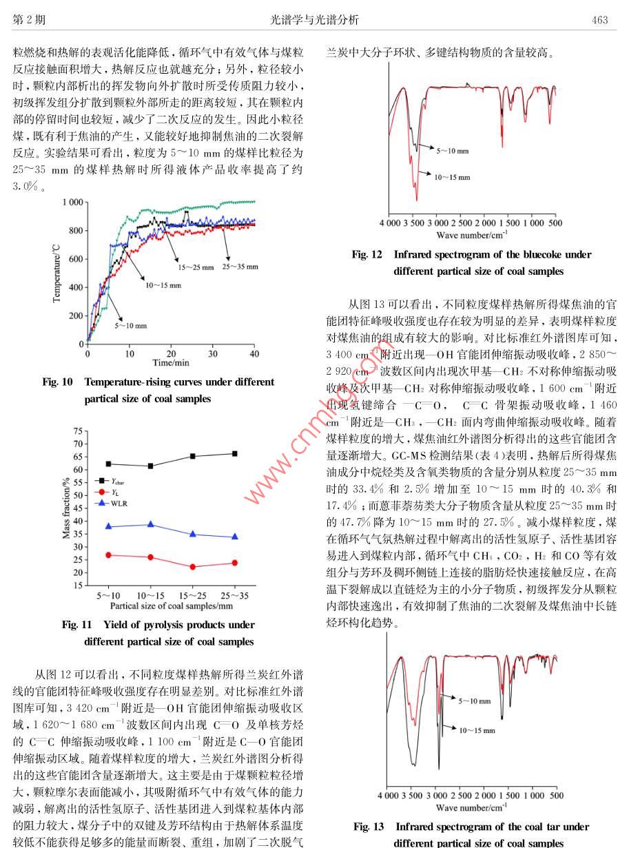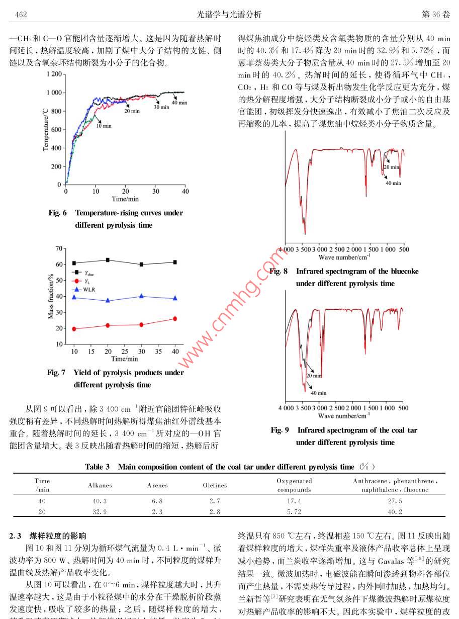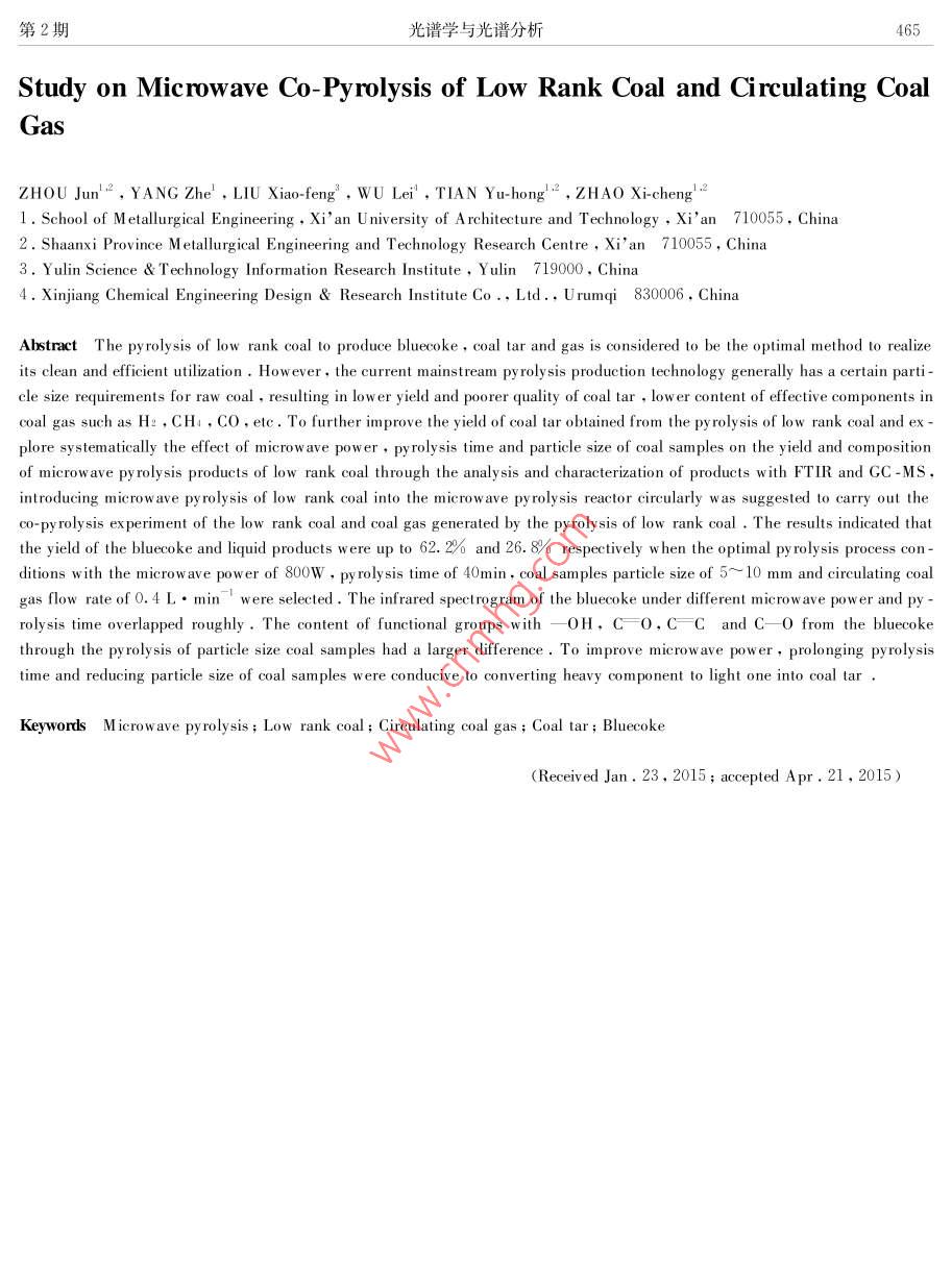 第36卷,第2期光譜學(xué)與光譜分析Vol. 36.No.2 ,pp459-4652016年2月Spectroscopy and Spectral A nalysisFebruary , 2016低變質(zhì)煤~循環(huán)煤氣微波共熱解研究周軍',2,楊哲’,劉曉峰”,吳雷,田宇紅2,趙西成121.西安建筑科技大學(xué)冶金工程學(xué)院.陜西西安7100552.陜西省冶金工程技術(shù)研究中心,陜西西安7100553.榆林市科學(xué)技術(shù)信息研究所,陜西榆林7190004.新疆化工設(shè)計(jì)研究院有限責(zé)任公司,新疆烏魯木齊830006摘要低變質(zhì)煤干餾熱解生產(chǎn)蘭炭、煤焦油、 煤氣被認(rèn)為是其清潔高效轉(zhuǎn)化利用的最佳途徑?,F(xiàn)有主流生產(chǎn)工藝普遍對原煤具有一定的粒度要求.煤焦油產(chǎn)量較低、質(zhì)量不高,煤氣中Hz, CH,CO等有效組分含量較低。為進(jìn)一步提高低變質(zhì)煤熱解時(shí)煤焦油收率和質(zhì)量,提出將微波熱解低變質(zhì)煤產(chǎn)生的煤氣循環(huán)通入微波熱解反應(yīng)器中,進(jìn)行低變質(zhì)煤循環(huán)煤氣微波共熱解。結(jié)合FTIR及GC-MS等對熱解產(chǎn)品的分析表征,系統(tǒng)考察了微波功率、熱解時(shí)間、煤樣粒度對熱解產(chǎn)品收率及組成的影響。研究結(jié)果表明:低變質(zhì)煤在循環(huán)煤氣流量為0.4 L. min '、微波功率為800 w.熱解時(shí)間為40 min、煤樣粒度為5~ 10 mm的工藝條件下熱解,所得固體產(chǎn)品蘭炭收率達(dá)62.2%,液體產(chǎn)品(煤焦油和熱解水)收率達(dá)26.8%。不同微波功率及熱解時(shí)間下所得蘭炭紅外譜線基本重合;不同粒度煤樣熱解所得蘭炭中一OH,C =0,CFC和C-0官能團(tuán)含量差別較大。提高微波功率、延長熱解時(shí)間、減小煤樣粒度均有利于煤焦油的輕質(zhì)化。關(guān)鍵詞微波熱解 ;低變質(zhì)煤;循環(huán)煤氣;煤焦油;蘭炭中圖分類號: TQ530.2文獻(xiàn)標(biāo)識碼: ADOI: 10. 3964/j. ssn. 1000-0593(2016 )02-0459-07蘭炭和焦油的收率以及焦油中BTX(苯、甲苯、二甲苯),引言PCX(苯酚、甲酚、二甲酚)和萘的含量均明顯增加,同時(shí)水分也有所增加”。Silvera Seaccia等91研究發(fā)現(xiàn)煤樣在100近年來,煤微波熱解技術(shù)作為低變質(zhì)煤轉(zhuǎn)化利用的一-種°C時(shí)就開始析出CO和CO2,隨著反應(yīng)溫度的升高,SO2,新途徑,以其傳熱傳質(zhì)規(guī)律獨(dú)特、熱解速度快,生產(chǎn)效率高,COS以及脂肪烴類化合物(CH:和C2 H )析出。煤樣在CO2目標(biāo)產(chǎn)物收率高,熱解尾氣中氫氣、甲烷和一- 氧化碳等有價(jià)環(huán)境下熱解時(shí)其揮發(fā)分產(chǎn)量明顯高于N2環(huán)境,且CO2環(huán)境成分含量高、熱值高等優(yōu)越性13],最大程度實(shí)現(xiàn)了低變質(zhì)下焦炭的膨脹效果也明顯好于N2環(huán)境”0]。Kawser 等研煤分級提質(zhì)利用的目的,得到了國內(nèi)外越來越多同行的關(guān)注究發(fā)現(xiàn)Vicetorian褐煤在CO2氣氛中熱解時(shí)CO2與碳在700與研究。國內(nèi)外相關(guān)研究表明,以較為廉價(jià)的焦?fàn)t氣、合成°C以后發(fā)生劇烈的氣化反應(yīng),對熱解產(chǎn)品有著很大的影響。氣代替純氫進(jìn)行煤的加氫熱解是切實(shí)可行的,并已展現(xiàn)出其雷玉研究發(fā)現(xiàn)中國神府煤在氮?dú)鈿夥罩袩峤鈺r(shí)焦油收率由優(yōu)越性*5。熱解氣氛通過參與煤的熱解反應(yīng),改變其反應(yīng)600 C時(shí)的3. 98%增加到800 °C的8.03% , 在氫氣、甲烷和機(jī)理,可以很好地改善和提高熱解產(chǎn)品的質(zhì)量和產(chǎn)量,并且.H2 /C0氣氛中熱解時(shí),焦油收率普遍增加。不同的熱解氣氛對熱解結(jié)果的影響很大。煤樣的脫硫率在目前國內(nèi)蘭炭主流生產(chǎn)工藝多采用循環(huán)煤氣與新鮮空氣H2氣氛中隨著微波輻射時(shí)間的延長而增高,黏結(jié)性指數(shù)總混合燃燒的內(nèi)熱式熱解爐,其熱解煤氣中由于氮?dú)夂扛叨w上呈增大趨勢,煤樣中富氫的中小分子化合物含量增熱值較低,大部分企業(yè)通過“點(diǎn)天燈”燃燒排放或作為燃燒氣加”。Ariunaa等口研究發(fā)現(xiàn)油頁巖在合成氣和氫氣氣氛中用于其他工藝加熱,其利用率較低、環(huán)境污染嚴(yán)重、能源浪費(fèi)巨大。微波熱解低變質(zhì)煤產(chǎn)生的煤氣中,N2含量極低,的。與相同氫分壓下的加氫熱解相比,煤焦?fàn)t氣共熱解所得H2含量接近40%,CH4含量接近20%,C0含量接近.收稿日期: 2015-01-23.修訂日期: 2015-04-21基金項(xiàng)目:國家自然科學(xué)基金面上項(xiàng)目(51374166).國家高技術(shù)研究發(fā)展計(jì)劃(863計(jì)劃)項(xiàng)目<2011AA05A202).陜西省科技統(tǒng)籌創(chuàng)新工程460光譜學(xué)與光譜分析第36卷10%021??紤]其“富氫”及廉價(jià)優(yōu)勢.進(jìn)行該煤氣與低變質(zhì)煤式中:Yehar為蘭炭收率,%;YL為液體產(chǎn)品(煤焦油和熱解的微波共熱解是實(shí)現(xiàn)低變質(zhì)煤更加高效清潔轉(zhuǎn)化利用的- -種水)收率,% ; WLR為失重率,% ; Wahar 為固體產(chǎn)品蘭炭質(zhì)新方法,具有重要的科學(xué)意義及實(shí)用價(jià)值。本工作主要通過量,g; Wo為煤樣質(zhì)量,g; W1.為液體產(chǎn)品質(zhì)量,go單因素實(shí)驗(yàn)考察低變質(zhì)煤循環(huán)煤氣微波共熱解過程中微波功率、熱解時(shí)間和煤樣粒度等對熱解產(chǎn)品產(chǎn)量及質(zhì)量的影2結(jié)果與討論.向。2.1微波 功率的影響1實(shí)驗(yàn)部分圖2和圖3分別為循環(huán)煤氣流量為0.4L●min'、