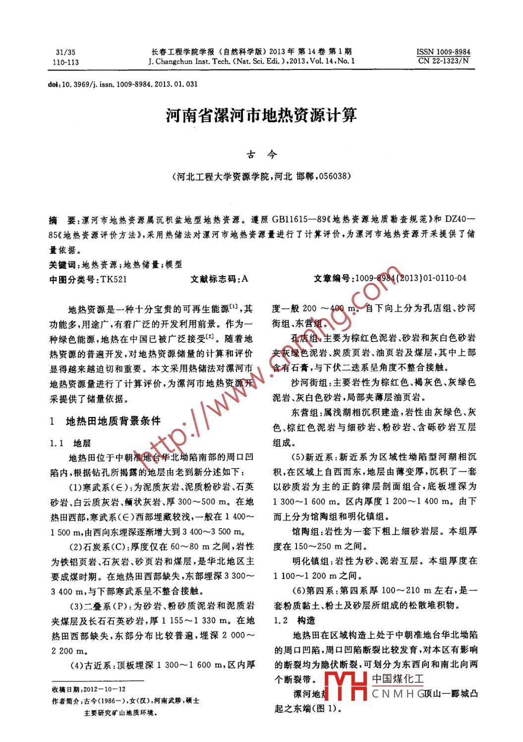 31/35長(zhǎng)春工程學(xué)院學(xué)報(bào)(自然科學(xué)版) 2013年第14卷第1期ISSN 1009-8984110-113J. Changchun Inst. Tech. (Nat. Sci. Edi. ) ,2013, Vol.14,No. 1CN 22-1323/Ndoi: 10.3969/j. issn. 1009-8984. 2013. 01. 031河南省漯河市地?zé)豳Y源計(jì)算古今(河北工程大學(xué)資源學(xué)院,河北邯鄲,056038)摘要:漯河市地?zé)豳Y源屬沉積盆地型地?zé)豳Y源。 遵照GB11615- -89《地 熱資源地質(zhì)勘查規(guī)范》和DZ40-85《地?zé)豳Y源評(píng)價(jià)方法》,采用熱儲(chǔ)法對(duì)漯河市地?zé)豳Y源量進(jìn)行了計(jì)算評(píng)價(jià),為漯河市地?zé)豳Y源開采提供了儲(chǔ)量依據(jù)。關(guān)鍵詞:地?zé)豳Y源;地?zé)醿?chǔ)量;模型中圖分類號(hào):TK521文獻(xiàn)標(biāo)志碼:A文章編號(hào):1009-8984(2013)01-0110-04地?zé)豳Y源是一種十分寶貴的可再生能源[1 ,其度一般200 ~400 m。自下向上分為孔店組、沙河功能多,用途廣,有著廣泛的開發(fā)利用前景。作為一街組、東營(yíng)組。種綠色能源,地?zé)嵩谥袊?guó)已被廣泛接受印。隨著地孔店組:主要為棕紅色泥巖、砂巖和灰白色砂巖熱資源的普遍開發(fā),對(duì)地?zé)豳Y源儲(chǔ)量的計(jì)算和評(píng)價(jià)夾灰綠色泥巖、炭質(zhì)頁(yè)巖、油頁(yè)巖及煤層,其中上部顯得越來越迫切和重要。本文采用熱儲(chǔ)法對(duì)漯河市含有石膏,與下伏二迭系呈角度不整合接觸。地?zé)豳Y源量進(jìn)行了計(jì)算評(píng)價(jià),為漯河市地?zé)豳Y源開沙河街組:主要巖性為棕紅色、褐灰色、灰綠色采提供了儲(chǔ)量依據(jù)。泥巖、灰白色砂巖,局部夾薄層油頁(yè)巖。東營(yíng)組:屬淺湖相沉積建造,巖性由灰綠色、灰1地?zé)崽锏刭|(zhì)背 景條件色、棕紅色泥巖與細(xì)砂巖、粉砂巖、含礫砂巖互層1.1地層組成。地?zé)崽镂挥谥谐瘻?zhǔn)地臺(tái)華北坳陷南部的周口凹(5)新近系:新近系為區(qū)域性坳陷型河湖相沉陷內(nèi),根據(jù)鉆孔所揭露的地層由老到新分述如下:積,在區(qū)域上自西而東,地層由薄變厚,沉積了一套(1)寒武系(∈):為泥質(zhì)灰?guī)r、泥質(zhì)粉砂巖、石英以砂質(zhì)巖為主的正韻律層剖面組合,底板埋深為砂巖、白云質(zhì)灰?guī)r、鮞狀灰?guī)r、厚300~500 m。在地1 300~1 600 m。區(qū)內(nèi)厚度1 200~1 400 m。由下熱田西部寒武系(∈)西部埋藏較淺,一般在1 400~而上分為館陶組和明化鎮(zhèn)組。1 500 m,由西向東埋深逐漸增大到3 400~3 500 m。館陶組:巖性為-套下粗上細(xì)砂巖層。本組厚(2)石炭系(C):厚度僅在60~80 m之間,巖性度在150~250 m之間。為鐵鋁頁(yè)巖.石灰?guī)r、砂頁(yè)巖和煤層,是華北地區(qū)主明化鎮(zhèn)組:巖性為砂、泥巖互層。本組厚度在.要成煤時(shí)期。在地?zé)崽镂鞑咳笔?東部埋深3300~1 100~1 200 m之間。3400m,與下部寒武系呈不整合接觸。(6)第四系:第四系厚100~210 m左右,是一(3)二疊系(P):為砂巖、粉砂質(zhì)泥巖和泥質(zhì)巖套粉質(zhì)黏土、粉土及砂層所組成的松散堆積物。夾煤層及長(zhǎng)石石英砂巖,厚1 155~1 330 m。在地1.2 構(gòu)造熱田西部缺失,東部分布比較普遍,埋深2 000~地?zé)崽镌趨^(qū)域構(gòu)造上處于中朝準(zhǔn)地臺(tái)華北坳陷2 200 m.的周口凹陷,周口凹陷斷裂比較發(fā)育,對(duì)本區(qū)有影響(4)古近系:頂板埋深1300~1 600 m,區(qū)內(nèi)厚的斷裂均為隱伏斷裂,可劃分為東西向和南北向兩個(gè)斷裂帶。中國(guó)煤化工收稿日期:2012-10-12漯河地HCNMHG碩山一郾城凸作者簡(jiǎn)介:古今(1986-),女(漢) ,河南武陟,碩士起之東端(圖1)。主要研究礦山地質(zhì)環(huán)境。古今:河南省漯河市地?zé)豳Y源計(jì)算1112地?zé)崽餆醿?chǔ)特征及其埋藏條件業(yè)上二山地?zé)崽锞哂泄嵋饬x的熱儲(chǔ)層為新近系熱儲(chǔ)層Fe平頂山邸女城凸起廊城和古近系熱儲(chǔ)層。2.1新近系熱儲(chǔ)漯河新近系由下而上分為館陶組和明化鎮(zhèn)組。橫剖面圖見圖2,縱剖面圖見圖3.館陶組熱儲(chǔ):熱儲(chǔ)層厚度為30~70 m,巖性為細(xì)砂、粉砂、中砂。明化鎮(zhèn)組熱儲(chǔ):熱儲(chǔ)層厚度為100~200 m,巖圖1郾城凸起邊界示意圉性為細(xì)砂、粉砂、中砂,溫度40~57 C._90°人民路與驗(yàn)大東海金運(yùn)京珠J莊體育中心電視臺(tái)。 軍轉(zhuǎn)站。山峰交叉口 飯店。肉食.. 高速找子路村拐張村(測(cè)點(diǎn)號(hào))10 11 12141511617181920212223巨500篆1 0o0N1 500_B2 000圄2地?zé)崽?新近系橫剖面圍.90°。3地?zé)豳Y 源計(jì)算與評(píng)價(jià)3.1概念模型豢! 00漯河市地?zé)豳Y源類型屬沉積盆地型。根據(jù)比例R0.51 kmDZ40- -85《地?zé)豳Y源評(píng)價(jià)方法》評(píng)價(jià)熱儲(chǔ)的規(guī)定,本圄3地?zé)崽镄陆悼v剖面圖次地?zé)豳Y源計(jì)算的目的層為大于40C的低溫地?zé)豳Y源儲(chǔ)層,相應(yīng)的埋藏深度為600 m以上。從上到2.2古近系熱儲(chǔ)下可劃分為新近系熱儲(chǔ)層、黏土層、古近系熱儲(chǔ)存古近系自下向上分為孔店組、沙河街組、東層。地?zé)崽锏纳w層由新近系上部多旋回厚層黏性巖土組成。新近系熱儲(chǔ)由新近系砂巖層組成,古近系營(yíng)組。熱儲(chǔ)層厚度為40~60 m,巖性為細(xì)砂、粉熱儲(chǔ)由古近系砂巖組成。熱流體通道主要為砂巖孔砂。橫剖面圖見圖4,縱剖面圖見圖5,溫度70°隙和裂隙,地?zé)崽锏臒嵩磥碓从谏畈康臒醾鲗?dǎo),屬傳導(dǎo)性地?zé)豳Y源。為方便地?zé)豳Y源計(jì)算,將新近系砂以上。
