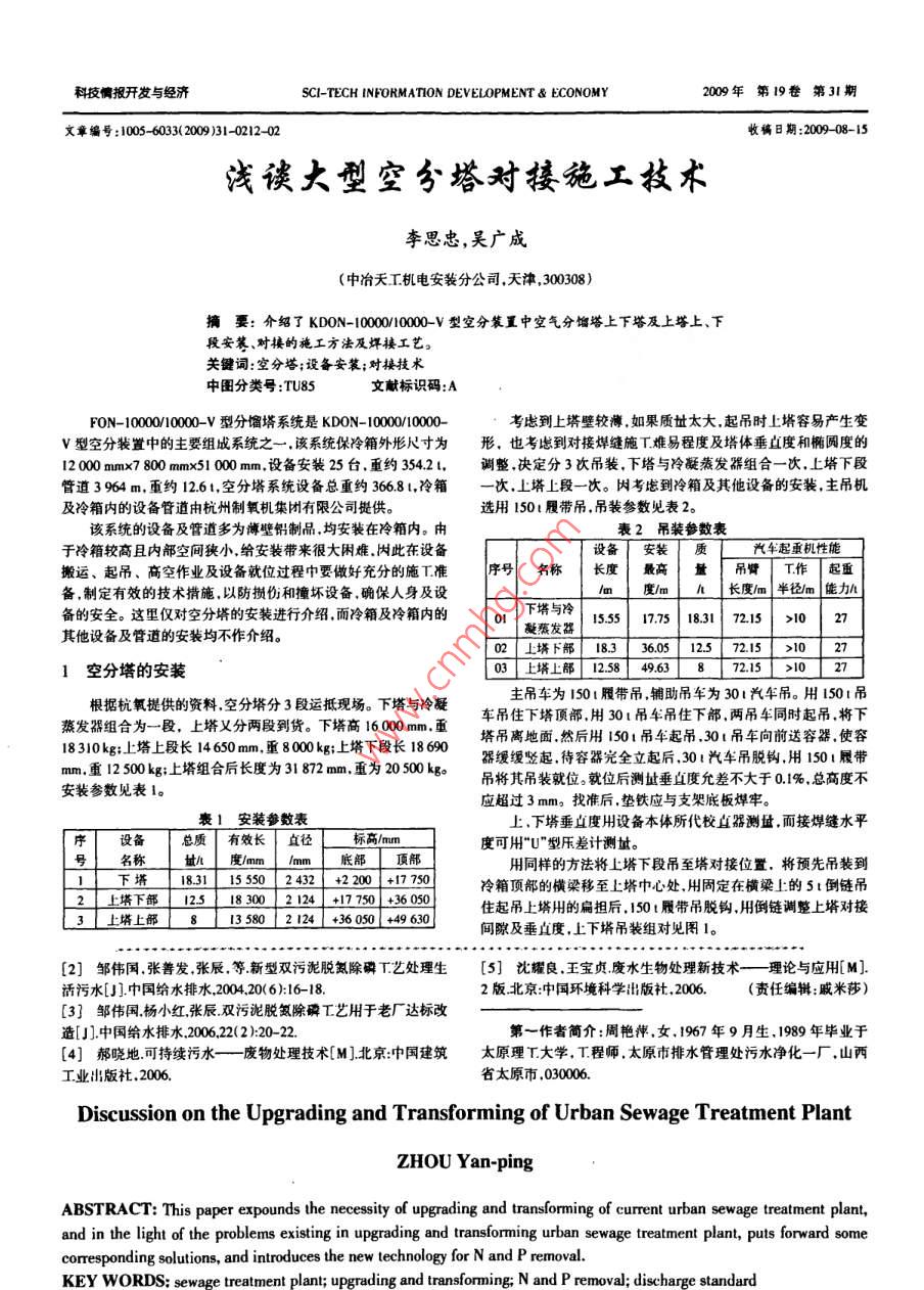 科技惴報(bào)開(kāi)發(fā)與經(jīng)濟(jì)SCI-TECH INFORM ATION DEVELOPMENT ECONOMY2009年第19卷第31期文章編號(hào):1005-6033(200)31-0212-02收稿日期:2009-08-15淺談大型空分塔對(duì)接施工技術(shù)李思忠,吳廣成中冶天工機(jī)電安裝分公司,天津,300308)摘要:介紹了KDON-1000010000V型空分裝置中空氣分餾塔上下塔及上塔上、下段安、對(duì)接的施工方法及焊揍工藝關(guān)鍵詞:空分塔;設(shè)備安裝;對(duì)接技術(shù)中圖分類(lèi)號(hào):TU85文獻(xiàn)標(biāo)識(shí)碼:AFON-100001000~v型分餾塔系統(tǒng)是KDON-000010000考慮到上塔壁較薄如果質(zhì)址太大起吊時(shí)上塔容易產(chǎn)生變Ⅴ型空分裝置中的主要組成系統(tǒng)之一,該系統(tǒng)保冷箱外形尺寸為形,也考慮到對(duì)接焊縫施T難易程度及塔體垂直度和橢園度的12000mmx7800mm×51000mm,設(shè)備安裝25臺(tái),重約3542,調(diào)整決定分3次吊裝,下塔與冷凝蒸發(fā)器組合一次,上塔下段管道3964m,重約1261,空分塔系統(tǒng)設(shè)備總重約36681,冷箱次,上塔上段一次。因考慮到冷箱及其他設(shè)備的安裝,主吊機(jī)及冷箱內(nèi)的設(shè)備管道由杭州制氧機(jī)集團(tuán)有限公司提供。選用150t履帶吊,吊裝參數(shù)見(jiàn)表2該系統(tǒng)的設(shè)備及管道多為薄壁鋁制品,均安裝在冷箱內(nèi)。由表2吊裝參數(shù)表備的安全。這里僅對(duì)空分塔的安裝進(jìn)行介組而冷箱及冷箱內(nèi)的0W/e量/趣重積性電于冷箱較高且內(nèi)部空間狹小給安裝帶來(lái)很大困難因此在設(shè)備設(shè)備安裝質(zhì)搬運(yùn)、起吊、高空作業(yè)及設(shè)備就位過(guò)程中要做好充分的施T準(zhǔn)序名稱(chēng)長(zhǎng)度T作起重備,制定有效的技術(shù)揹施,以防損傷和撞壞設(shè)備,確保人身及設(shè)能力其他設(shè)備及管道的安裝均不作介紹。凝賽發(fā)1517518317215>10|27下邸18336051257215>1027空分塔的安裝a上塔上部1258463872151>02根據(jù)杭氧提供的資料,空分塔分3段運(yùn)抵現(xiàn)場(chǎng)。下塔與冷凝主吊車(chē)為150履帶吊,輔助吊車(chē)為30t汽車(chē)吊。用150t吊蒸發(fā)器組合為一段,上塔又分兩段到貨。下塔高16000m,面車(chē)吊住下塔頂部用301吊車(chē)吊住下部?jī)傻踯?chē)同時(shí)起吊將下18310kg;上塔上段長(zhǎng)14650mm,重8000kg;上塔下段長(zhǎng)18690塔吊離地面然后用1501吊車(chē)起吊,30t吊車(chē)向前送容器使容m;重1250kg:塔組合后長(zhǎng)度為31872m,.重為2050k器緩緩豎起,待容器完全立起后301汽車(chē)吊脫鉤,用1501履帶安裝參數(shù)見(jiàn)表1。吊將其吊裝就位。就位后測(cè)量垂直度允差不大于0%,總高度不應(yīng)超過(guò)3mm。找準(zhǔn)后,墊鐵應(yīng)與支架底板焊牢安裝參數(shù)表上、下塔垂直度用設(shè)備本體所代校直器測(cè)量,而接焊縫水平序「設(shè)備「總質(zhì)「有效長(zhǎng)直徑L標(biāo)高/m度可用“U"型壓差計(jì)測(cè)量。城A度/mmhm底部頂部用同樣的方法將上塔下段吊至塔對(duì)接位置,將預(yù)先吊裝到下十183115042431+204+130冷箱頂部的橫梁移至上塔巾心處,用固定在橫梁上的5倒鏈吊上塔下部1251182302124[+177304560503塔上部8135012121+60460住起吊上塔用的扁擔(dān)后,150t履帶吊脫鉤,用倒鏈調(diào)整上塔對(duì)接間隙及垂直度,上下塔吊裝組對(duì)見(jiàn)圖1。[2]鄒偉國(guó)張善發(fā)張辰等新型雙污泥脫氮除磷T藝處理生[5]沈耀良王寶貞廢水生物處理新技術(shù)—理論與應(yīng)用M.活污水[]中國(guó)給水排水200420(6):16-182版北京中國(guó)環(huán)境科學(xué)出版社,2006.(責(zé)任編輯:戚米莎)3〕鄒偉國(guó)楊小紅張辰雙污泥脫氮除磷工藝用于老廠達(dá)標(biāo)改造[]中國(guó)給水排水200622(2):20-22第一作者簡(jiǎn)介:周艷萍,女,1967年9月生,1989年畢業(yè)于[4]郝嘵地可持續(xù)污水—一廢物處理技術(shù)[M]北京:中國(guó)建筑太原理T大學(xué)T程師,太原市排水管理處污水凈化一廠,山西工業(yè)出版社,2006省太原市,030006Discussion on the Upgrading and Transforming of Urban Sewage Treatment PlantZHOU Yan-pingABSTRACT: This paper expounds the necessity of upgrading and transforming of current urban sewage treatment plant,and in the light of the problems existing in upgrading and transforming urban sewage treatment plant, puts forward somecorresponding solutions, and introduces the new technology for N and P removal.KEY WORDS: sewage treatment plant; upgrading and transforming: N and P removal; discstandard李思忠,吳廣成淺談大型空分塔對(duì)接施T技術(shù)本刊E- mail:bjb@sxinfonet實(shí)踐與創(chuàng)新表4焊接技術(shù)參數(shù)橫梁設(shè)備名稱(chēng)厚度焊絲鎢極噴嘴山氨氣流速預(yù)熱溫焊接層次徑 mm/(U/min)度C。電流N正版反下塔12512-1412-14「1502603022對(duì)接焊維色將上下段21s12-141241026013度,并焊好襯圈清除十凈容器內(nèi)的鋁屑,起吊時(shí)焊口要用塑料布封閉(4)焊接前坡口焊絲及不小于坡口兩側(cè)各50mm范圍內(nèi)T作平臺(tái)的表面用脫脂劑擦洗十凈用不銹鋼絲刷徹底清除氧化膜。清理下坡口時(shí)應(yīng)向外刷,清理上坡口時(shí),下部容器開(kāi)口應(yīng)用塑料布封好,防止鋁屑進(jìn)入容器內(nèi)。(5)當(dāng)鎢極出現(xiàn)觸鎢現(xiàn)象時(shí)停止焊接將鎢極焊絲、溶池處理干凈爭(zhēng)后方可繼續(xù)焊接(6)焊接時(shí)采用雙人單面焊接,焊接過(guò)程中隨時(shí)檢查垂直圖1上下塔吊裝組對(duì)度,并利用焊接反變形方