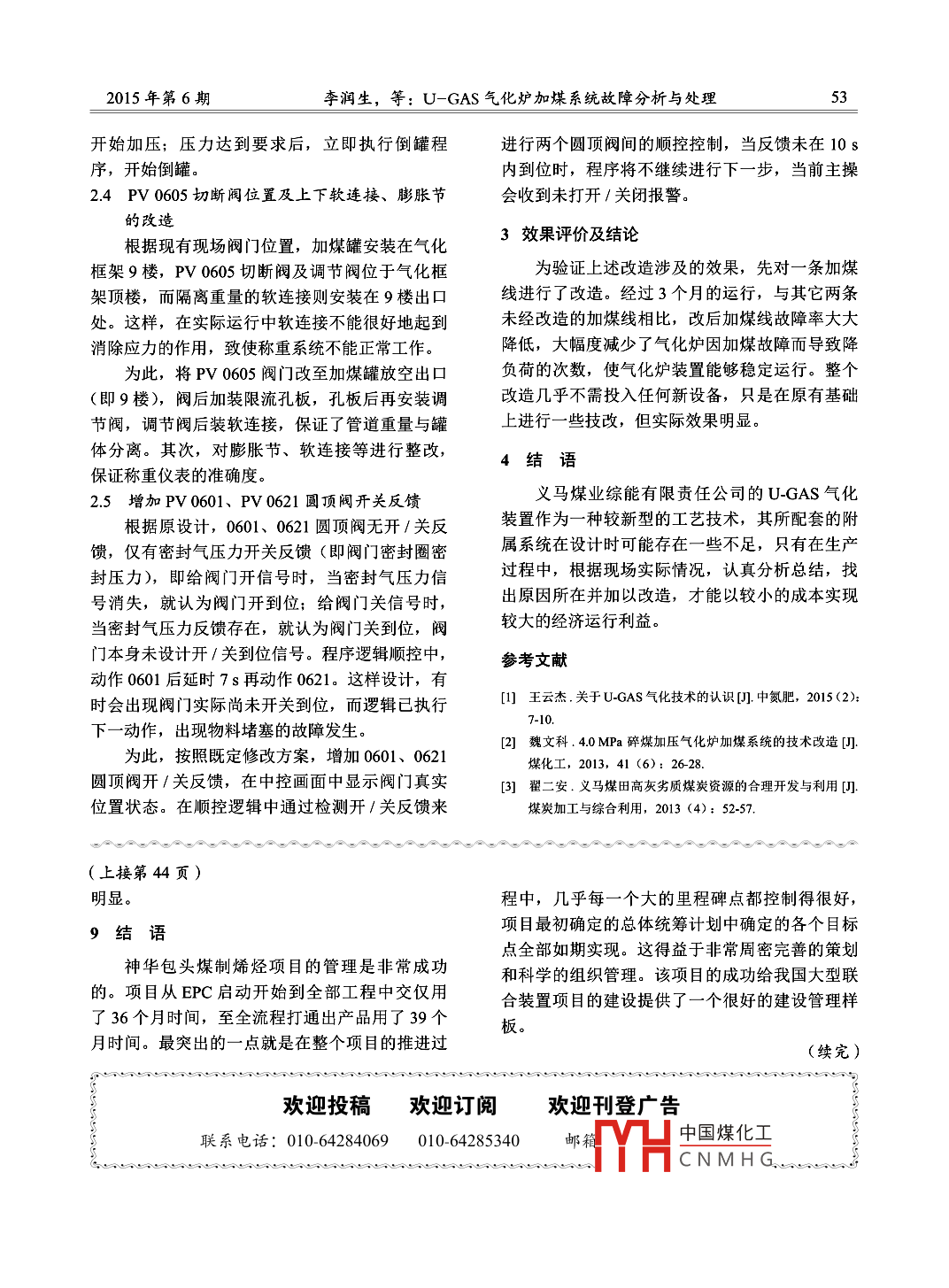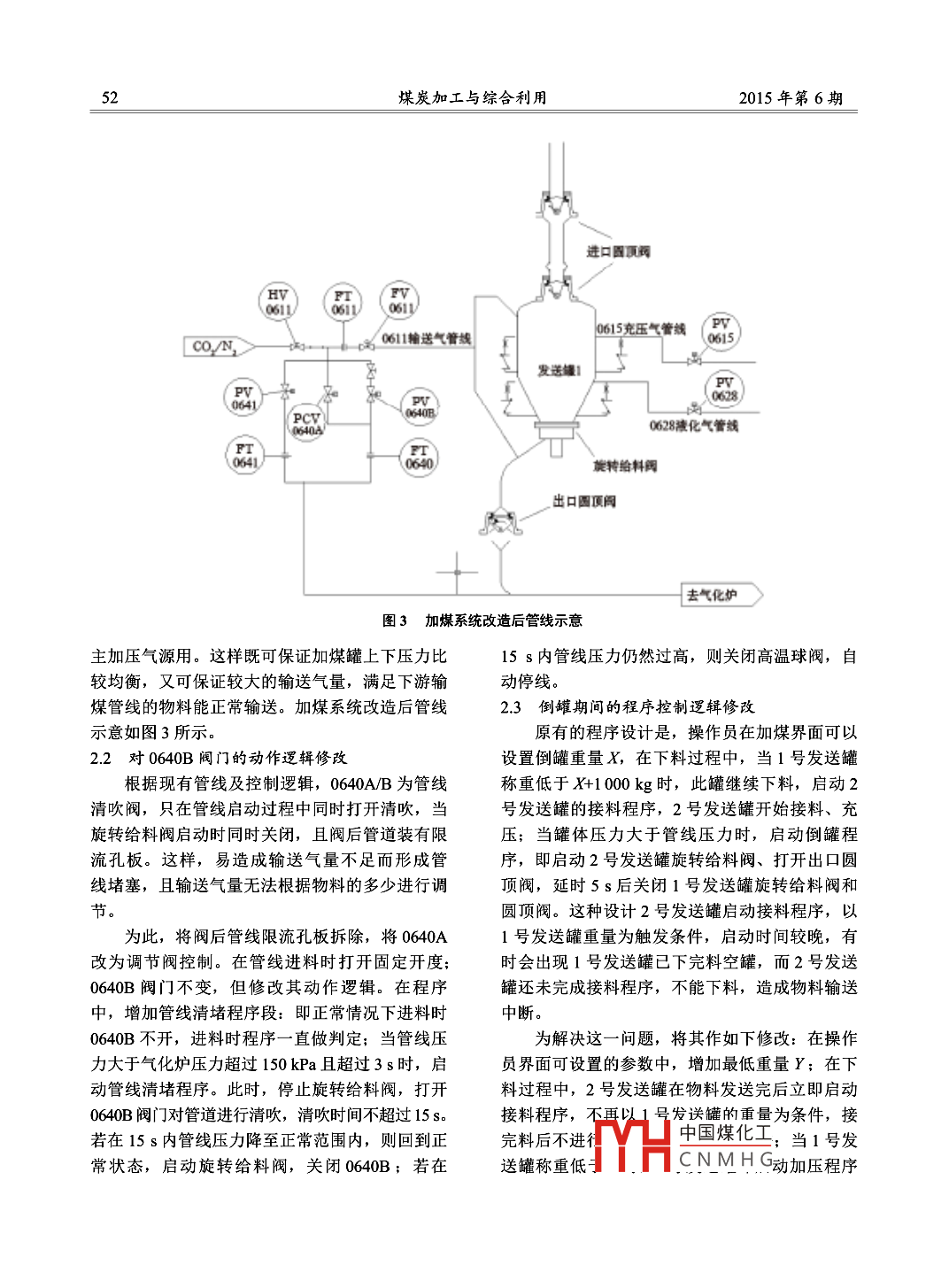 煤炭加工與綜合利用5(COAL PROCESSING & COMPREHENSIVE UTILIZATIONNo.6,2015U-GAS氣化爐加煤系統(tǒng)故障分析與處理李潤(rùn)生12,繆娟(1.河南理工大學(xué)理化學(xué)院,河南焦作454100;2.河南義馬煤業(yè)綜能公司電儀分廠,河南三門峽472300)摘要:對(duì)U-GAS氣化爐在劣質(zhì)煤轉(zhuǎn)化過(guò)程中其加煤系統(tǒng)易出現(xiàn)的故障進(jìn)行了深入分析和.研究,提出了相應(yīng)的改造方案;對(duì)充壓、泄壓系統(tǒng)管路,有關(guān)控制程序及閥門等進(jìn)行改造后,取得了較好的效果。關(guān)鍵詞:煤炭氣化; U_GAS氣化爐;加煤系統(tǒng);故障;改造中圖分類號(hào): TQ546文獻(xiàn)標(biāo)識(shí)碼: A文章編號(hào): 1005-8397 (2015) 06-0050-041 U-GAS 氣化爐及其加煤系統(tǒng)簡(jiǎn)介謀倉(cāng)義馬煤業(yè)綜能有限責(zé)任公司采用的是美國(guó)SES公司所提供的U-GAS加壓流化床氣化技術(shù)。都以義馬煤種為原料煤時(shí),U-GAS 氣化爐與其它固定床氣化爐、氣流床氣化爐相比較,主要有以下幾個(gè)特點(diǎn):(1)能氣化大多數(shù)煤種,特別是劣質(zhì)煤,具有較高的轉(zhuǎn)化率;發(fā)送罐1 |發(fā)送罐2氣化護(hù)(2) 能承受煤中一定量的細(xì)粉;(3)產(chǎn)品氣中基本不含焦油和重油,有利于后續(xù)系統(tǒng)的處理。加煤系統(tǒng)作為其中重要的-一個(gè)組成部分,該3號(hào)加煤戰(zhàn)2號(hào)加煤線氣化爐采用的是英國(guó)克萊德公司的氣體輸送系.1號(hào)加煤線_統(tǒng)。每臺(tái)氣化爐設(shè)計(jì)有三條加煤管線,每條加煤管線采用兩個(gè)發(fā)送罐并罐的形式,為氣化爐輸送物料,加煤系統(tǒng)示意見(jiàn)圖1。物料從煤倉(cāng)下來(lái),先進(jìn)入1號(hào)發(fā)送罐中;物圖1加煤系統(tǒng)示意料進(jìn)滿,關(guān)閉進(jìn)料閥,進(jìn)行充壓;待充壓至1.1 MPa新進(jìn)料。這樣兩個(gè)發(fā)送罐交替進(jìn)行進(jìn)料、充壓、時(shí)(略大于氣化爐壓力),關(guān)閉進(jìn)料閥,打開(kāi)下下料、泄壓、再進(jìn)料的過(guò)程,從而實(shí)現(xiàn)為氣化爐料閥;通過(guò)下端旋轉(zhuǎn)給料閥調(diào)節(jié)輸煤速度,給氣連續(xù)供煤的目的。單條加煤線設(shè)計(jì)能力為36 th,化爐供煤;當(dāng)1號(hào)發(fā)送罐物料輸送完畢時(shí),2號(hào)正常生產(chǎn)中兩條加煤線可滿足氣化爐45t/h的用發(fā)送罐開(kāi)始供料: 1號(hào)發(fā)送罐開(kāi)始泄至常壓,重收稿日期: 2015-04-28D0I : 10.16200jcnki.11-2627/td.2015.06.007作者簡(jiǎn)介:李潤(rùn)生(1976- -), 男,河南沁陽(yáng)人,1998 年畢業(yè)于遼寧工程技術(shù)大學(xué)計(jì)象中國(guó)煤化主義馬煤業(yè)綜能公司電儀分廠廠長(zhǎng),工程師。引用格式:李潤(rùn)生,繆娟.U_GAS氣化爐加煤系統(tǒng)故障分析與處理[]煤炭加工與綜[YHCNMHG2015年第6期李潤(rùn)生,等: U-GAS氣化爐加煤系統(tǒng)故障分析與處理51煤量。另一條加煤線作為備用。下料不暢,影響氣化爐運(yùn)行。(2)在加煤邏輯上存在缺陷。在加煤過(guò)程中,2 U-GAS 氣化爐加煤系統(tǒng)故障分析及解決方案.會(huì)因?yàn)榕及l(fā)現(xiàn)象導(dǎo)致整個(gè)加煤程序中斷。經(jīng)過(guò)-段時(shí)間的實(shí)踐,發(fā)現(xiàn)加煤系統(tǒng)存在以(3)個(gè)別管路安裝有問(wèn)題,導(dǎo)致充泄壓過(guò)程下幾個(gè)問(wèn)題。管路應(yīng)力太大,影響加煤罐的稱重系統(tǒng),從而影.(1)經(jīng)常出現(xiàn)下料不暢。當(dāng)時(shí)判斷可能是管響整個(gè)加煤系統(tǒng)。路堵塞,但將加煤管路、閥門、旋轉(zhuǎn)給料閥拆檢根據(jù)以上分析,逐條加以解決。幾次后,并未發(fā)現(xiàn)堵塞;又經(jīng)多次分析,發(fā)現(xiàn)問(wèn)2.1 充壓、 泄壓系統(tǒng)管路分析與改造題可能出在加煤系統(tǒng)的充壓、泄壓管線上,整個(gè)圖2為改造前的加煤系統(tǒng)示意(以單罐為系統(tǒng)在充壓、泄壓和輸煤時(shí),壓力不平衡,造成例)。進(jìn)口四頂閥(GBY) %)(61)0611輸送氣管線0615克壓氣管線 OY)上L品( PV06280640B040A)0628液化氣管線旋轉(zhuǎn)給料閥出口圓頂閣去氣化護(hù)>圖2加煤系統(tǒng)改造前系統(tǒng)示意目前,加煤系統(tǒng)加煤罐加壓管線為圖2所示際生產(chǎn)中,因設(shè)備狀況、煤質(zhì)變化等多種因素作0615管線,流化管線為0628管線,輸送氣管線用下,有時(shí)會(huì)發(fā)生加煤罐上、下壓力不勻衡,旋為0611管線,管線輸送氣為0640A/B和0641;轉(zhuǎn)給料閥或下游輸煤管壓力大于或等于加煤罐內(nèi)0611管線接到旋轉(zhuǎn)給料閥的輸氣口,通過(guò)旋轉(zhuǎn)給壓力,導(dǎo)致落煤不暢或不落煤。針對(duì)此問(wèn)題,對(duì)料閥,進(jìn)入到下游輸煤管線,同時(shí)再返到加煤罐管線作了如下改造。上部,起到加壓和均壓的作用; 0640A/B 只在管修改0611管線及0640A閥門。將0615由調(diào)線啟動(dòng)時(shí)吹掃管線時(shí)同時(shí)開(kāi)關(guān),正常輸煤時(shí)只有節(jié)閥改為切斷閥;0640A由切斷閥改為調(diào)節(jié)閥;0641開(kāi)啟。0615管線不再使用調(diào)節(jié)閥調(diào)節(jié); 0611 管線改至經(jīng)過(guò)分析,發(fā)現(xiàn)主要問(wèn)題出在0611輸送氣.罐體_上下均壓管道上。正常使用過(guò)程中,0615 加管線上。輸送氣管線先經(jīng)過(guò)旋轉(zhuǎn)給料閥再隨物料壓管線只用切YH中國(guó)煤化工輸送氣量靠下到輸煤管線。這樣設(shè)計(jì)理論上沒(méi)問(wèn)題,