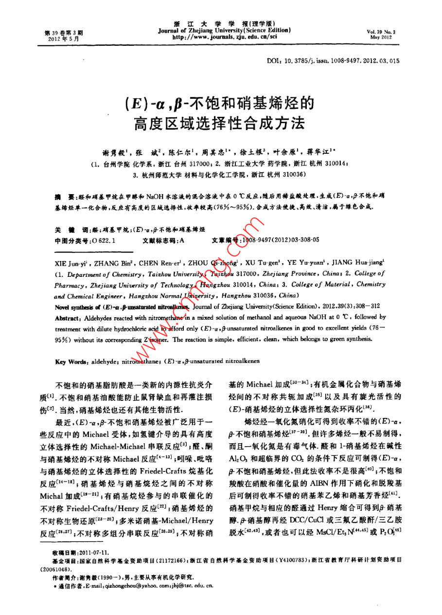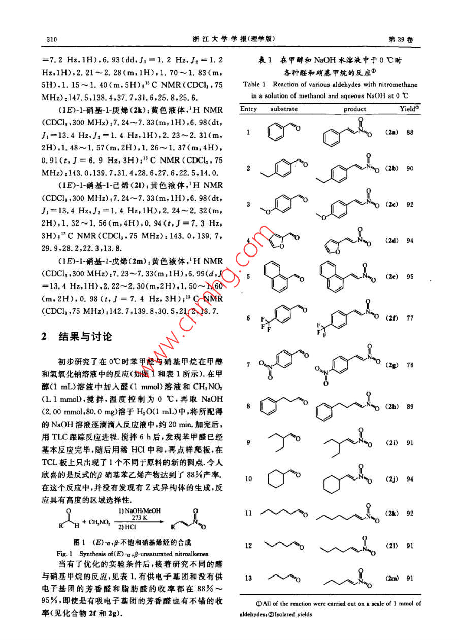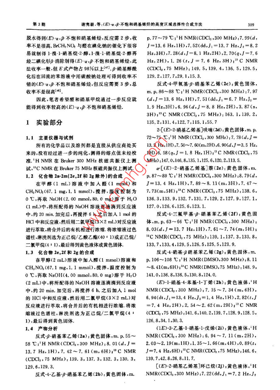 浙江大學(xué)學(xué)報(bào)(理學(xué)版)第39卷第3期.Journal of Zhejiang University( Science Edition)Vol: 39 No,3htp://www. journals. zju. edu. cn/sci2012年5月DOI: 10. 3785/j. issn, 1008-9497. 2012.03. 015(E)-a,β-不飽和硝基烯烴的高度區(qū)域選擇性合成方法謝雋毅',張斌”, 陳仁爾',周其忠",徐土根',葉余原',蔣華江'(1.臺州學(xué)院化學(xué)系,浙江臺州317000 2.浙江工業(yè)大學(xué)藥學(xué)院,浙江杭州310014;3.杭州師范大學(xué)材料與化學(xué)化工學(xué)院,浙江杭州310036)摘戛:醛和硝基甲炕在甲醇和NaOH水溶液的混合溶液中在0 C反應(yīng),隨后用稀鹽酸處理,生威(E)-a,f不飽和硝基烯烴單一化合物,反應(yīng)有高度的區(qū)域選擇性,牧率較高(76%~95%).合成方法便捷、高效、清潔,屬于綠色合咸.關(guān)鍵詞:臟;硝基甲烷;(E)-a,月不飽和硝基烯烴中圖分類號:0622.1文獻(xiàn)標(biāo)志碼:A文章編號:1008 -9497(2012)03-308-05XIE Juny4 , 2HANG Bin', CHEN Ren-er' , ZHOU Qi- zhong',XU Tugen', YE Yu yuan',JIANG Hua jiang'(1. Department of Chemistry, Taizhou University, Taizhou 317000, Zhejiang Province, China; 2. College ofPharmacy. Zhejiang University of Techmology, Hangzhou 310014, China; 3. College of Material,Chemistryand Chemical Engineer, Hangzhou Normal Uniuersity, Hangzhou 310036. China)Noel syothesis of (E)-a.f umaturated railknss Journal of Dhejiang UriesritfScene Editin), 2012,39(3):308- -312Abstract; Aldechydes reacted with nitromethane in a mixed solution of methanol and aqueous NaOH at0心,fllowed bytreatment with dilute hydrochloric acid to aford only (E)-a ,funsaturated nitralkeses in good to excllet yields (76-95%) without its corresponding Z isomer. The reaction is simple, eficient clean, which belongs to green syntheisKey Words: aldehyde; nitromethane; (E) ~a ,funsaturated ntralkenes不飽和的硝基脂肪酸是一類新的內(nèi)源性抗炎介基的Michael加成[2 -1;有機(jī)金屬化合物與硝基烯質(zhì)[1.不飽和硝基油酸能防止鼠腎缺血和再灌注損烴間的不對稱共軛加成[5]以及具有旋光活性的傷50].當(dāng)然,硝基烯烴也還有其他生物活性.(E)-硝基烯烴的立體選擇性氮雜環(huán)丙化8。.最近,(E)-a,f-不飽和硝基烯烴被廣泛用于一烯烴經(jīng)-氧化氮硝化可得到收率不錯的(E)-a.些反應(yīng)中的Michael受體,如氫鍵介導(dǎo)的具有高度ρ不飽和硝基烯烴["7- 81.但許多烯烴-般不易制得,立體選擇性的Michael-Michael 串聯(lián)反應(yīng)[);醛、酮而且一氧化氮是有毒氣體.醛和1-硝基烯烴在喊性與硝基烯烴的不對稱Michael反應(yīng)[-1] ;吲哚、吡咯AlO,和超臨界的CO2的條件下反應(yīng)可制得(E)-a,與硝基烯烴的立體選擇性的Friedel-Crafts烷基化β不飽和硝基烯烴,但此法收率不是很高[(0];不飽和反應(yīng)([-10);硝基烯烴與硝基烷烴之間的不對稱羧酸在硝酸和催化量的AIBN作用下硝化和脫羧基Michal加成["9-川;有硝基烷烴參與的串聯(lián)催化的后可制得收率不錯的硝基苯乙烯和硝基芳香烴(1]..不對稱Friedel-Crafts/Henry 反應(yīng)[};硝基烯烴的硝基甲烷與相應(yīng)的醛通過Henry縮合可得到β硝基不對稱生物還原(=-53] ;多米諾硝基-Michael/Henry醇F硝基醇再經(jīng)DCC/CuCl或三氟乙酸酐/三乙胺反應(yīng)e,2];不對稱多組分串聯(lián)反應(yīng)[820;不對稱硝脫水(2.2 ,或者也可以經(jīng)MsC/EtN..5l或P,Of#]收稱日期:2011-07-11.基金項(xiàng)目:國家自然科學(xué)基金資助項(xiàng)日21172166)1浙江省自然科學(xué)基金資助項(xiàng)目(4100783):浙江省教育廳科研計(jì)劃資助項(xiàng)目.(20061048).作者簡介:謝雋教(1990-),男,主要從事有機(jī)化學(xué)研究.●通信作者.E mail; qizhongchou@yahoo. com;jbj@txc. edu. cn.第3期謝雋毅,等:(E)-a.A-不飽和硝基烯烴的高度區(qū)域選揮性合成方法309脫水得到(E)-a,F不飽和硝基烯烴,反應(yīng)需2步,收p.77~79 C;' H NMR(CDCl ,300 MHz):7. 99(d,率不是很高. BrCH2NO2與醛在碘化鈉的催化下很容J = 13.6 Hz,1H),7. 52(dd,J=13.7 Hz,J:=8.2易就制得1-澳-1-硝基烷-2-醇,1-溴-1-硝基烷-2-醇再Hz,3H),7. 28(d,J=8.1 Hz,2H),2. 70(q,J=7. 6經(jīng)二碘化釤β-消除制得(E) -a,f不飽和硝基烯烴;此Hz,2H),1.26(t,J=7. 6 Hz, 3H);"C NMR法收率一般,但E式產(chǎn)物占98%以上[47]. F-硝基醇酰(CDCl,75 MHz):149. 5, 139. 4, 136.5, 129. 5,化后在回流的苯溶液中用碳酸鈉處理可得到收率不129. 2,127. 7,29.1,15.3.錯的(E)-a,#不飽和硝基烯烴,但反應(yīng)需要3步,總反式4-甲氧基-β-硝基苯乙烯(2c):黃色固體,收率不是很高[48].m. p. 86~88 C;'H NMR(CDCI]; . 300 MHz):7.97因此,筆者希望醛和硝基甲烷通過- -步反應(yīng)就(d,J= 13.6 Hz,1H),7. 51(dd,J1=6.7 Hz,J2=能得到收率較高的(E) -a,β-不飽和硝基烯烴.1.9 Hz,3H),6. 96(d,J=8. 8 Hz,2H),3. 87(s,3H);"C NMR (CDC12,75 MHz):163. 1,139. 2,1實(shí)驗(yàn)部分135. 2,131.4,122.7,115.1,55.72-[(E)-2- 硝基乙烯基]呋哺(2d):黃色固體,m p.1.1主要 儀器與試劑72~75 C;'H NMR(CDCl, 300 MHz):7. 78(d,J=所有的化學(xué)品以及溶劑都是直接從供應(yīng)商處買.13.2 Hz,1H) ,7.50~7. 60(m,2H),6. 90(d,J=3.5 Hz, .來的,沒有經(jīng)過進(jìn)-一步的純化,測得的熔點(diǎn)值未經(jīng)校1H),6. 58(q,J=1. 8 Hz, 1H);I C NMR(CDCl,75.準(zhǔn).'HNMR在Bruker300MHz核磁共振儀上測MHz) :147.0,146.8,135.1,125. 6,120. 2,113. 5.試,"C NMR在Bruker 75 MHz核磁共振儀上測試.ar[(E)-2-硝基乙烯基]萘(2e);黃色固體,m.1.2化合物 2a-2m(2e,2f和2g除外)的合成p.87~89 C;' H NMR(CDCI, ,300 MHz) :8. 79(d,在甲醇(1 mL)溶液中加入醛(1 mmol) 和J=13.4 Hz,1H),7. 89~8. 11(m,3H),7. 47~CH3NO2(67. 1 mg,1. 1 mmol),攪拌,溫度控制為7. 73(m,5H);"C NMR (CDCI3 ,75 MHz):138. 6,0 C,再取NaOH(2.00 mmol