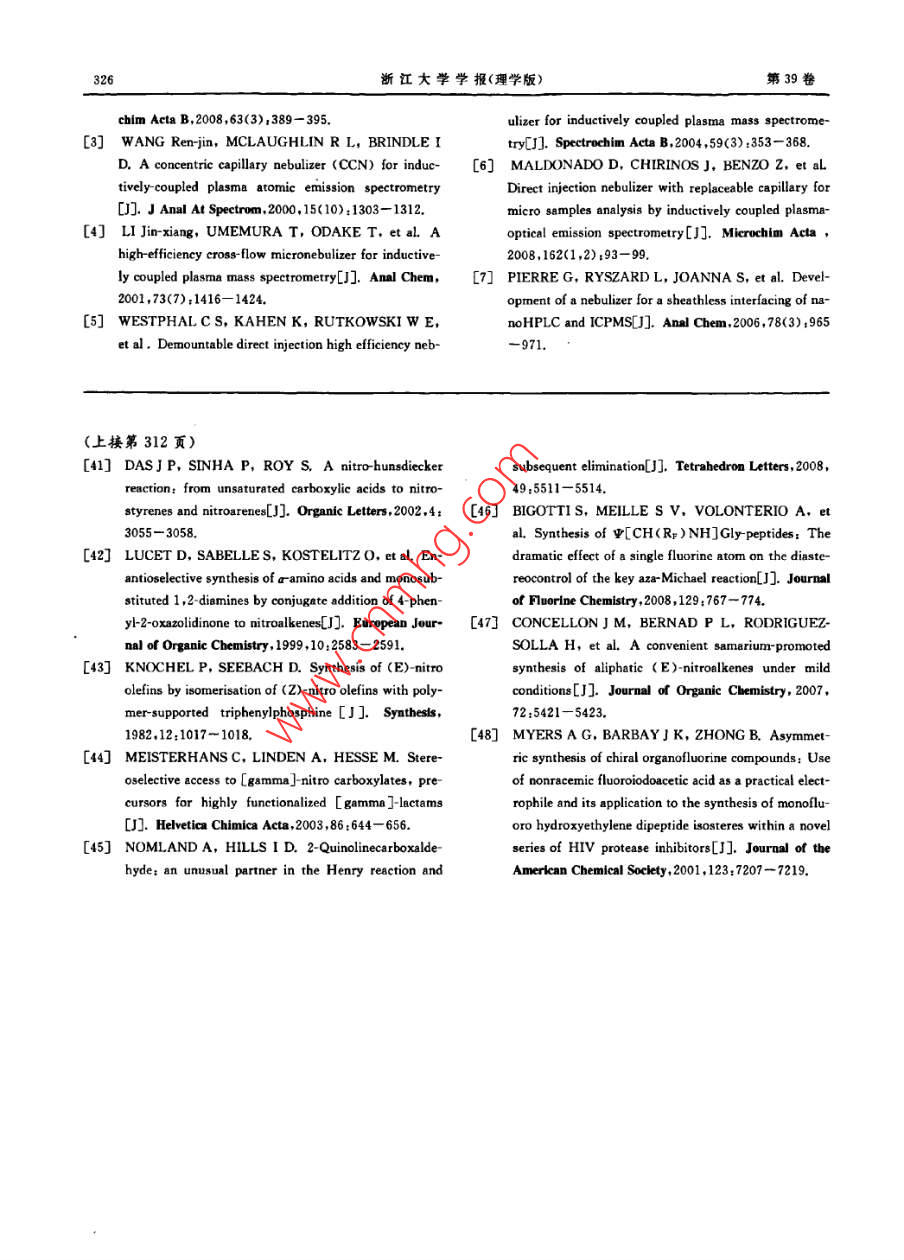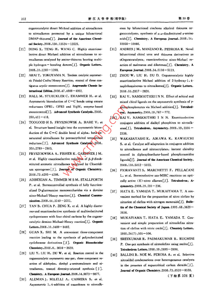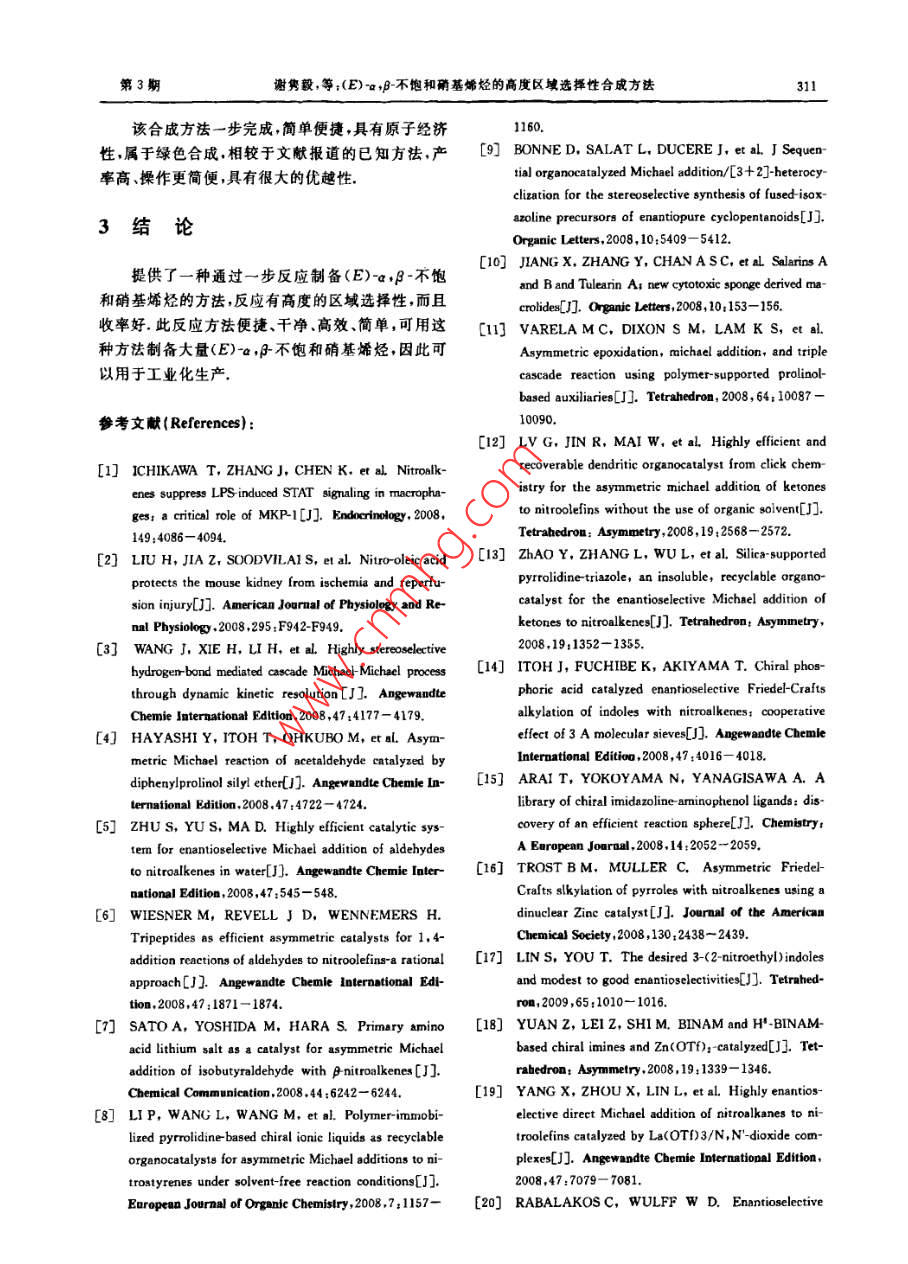 浙江大學(xué)學(xué)報(bào)(理學(xué)版)第39卷第3期.Journal of Zhejiang University( Science Edition)Vol: 39 No,3htp://www. journals. zju. edu. cn/sci2012年5月DOI: 10. 3785/j. issn, 1008-9497. 2012.03. 015(E)-a,β-不飽和硝基烯烴的高度區(qū)域選擇性合成方法謝雋毅',張斌”, 陳仁爾',周其忠",徐土根',葉余原',蔣華江'(1.臺州學(xué)院化學(xué)系,浙江臺州317000 2.浙江工業(yè)大學(xué)藥學(xué)院,浙江杭州310014;3.杭州師范大學(xué)材料與化學(xué)化工學(xué)院,浙江杭州310036)摘戛:醛和硝基甲炕在甲醇和NaOH水溶液的混合溶液中在0 C反應(yīng),隨后用稀鹽酸處理,生威(E)-a,f不飽和硝基烯烴單一化合物,反應(yīng)有高度的區(qū)域選擇性,牧率較高(76%~95%).合成方法便捷、高效、清潔,屬于綠色合咸.關(guān)鍵詞:臟;硝基甲烷;(E)-a,月不飽和硝基烯烴中圖分類號:0622.1文獻(xiàn)標(biāo)志碼:A文章編號:1008 -9497(2012)03-308-05XIE Juny4 , 2HANG Bin', CHEN Ren-er' , ZHOU Qi- zhong',XU Tugen', YE Yu yuan',JIANG Hua jiang'(1. Department of Chemistry, Taizhou University, Taizhou 317000, Zhejiang Province, China; 2. College ofPharmacy. Zhejiang University of Techmology, Hangzhou 310014, China; 3. College of Material,Chemistryand Chemical Engineer, Hangzhou Normal Uniuersity, Hangzhou 310036. China)Noel syothesis of (E)-a.f umaturated railknss Journal of Dhejiang UriesritfScene Editin), 2012,39(3):308- -312Abstract; Aldechydes reacted with nitromethane in a mixed solution of methanol and aqueous NaOH at0心,fllowed bytreatment with dilute hydrochloric acid to aford only (E)-a ,funsaturated nitralkeses in good to excllet yields (76-95%) without its corresponding Z isomer. The reaction is simple, eficient clean, which belongs to green syntheisKey Words: aldehyde; nitromethane; (E) ~a ,funsaturated ntralkenes不飽和的硝基脂肪酸是一類新的內(nèi)源性抗炎介基的Michael加成[2 -1;有機(jī)金屬化合物與硝基烯質(zhì)[1.不飽和硝基油酸能防止鼠腎缺血和再灌注損烴間的不對稱共軛加成[5]以及具有旋光活性的傷50].當(dāng)然,硝基烯烴也還有其他生物活性.(E)-硝基烯烴的立體選擇性氮雜環(huán)丙化8。.最近,(E)-a,f-不飽和硝基烯烴被廣泛用于一烯烴經(jīng)-氧化氮硝化可得到收率不錯的(E)-a.些反應(yīng)中的Michael受體,如氫鍵介導(dǎo)的具有高度ρ不飽和硝基烯烴["7- 81.但許多烯烴-般不易制得,立體選擇性的Michael-Michael 串聯(lián)反應(yīng)[);醛、酮而且一氧化氮是有毒氣體.醛和1-硝基烯烴在喊性與硝基烯烴的不對稱Michael反應(yīng)[-1] ;吲哚、吡咯AlO,和超臨界的CO2的條件下反應(yīng)可制得(E)-a,與硝基烯烴的立體選擇性的Friedel-Crafts烷基化β不飽和硝基烯烴,但此法收率不是很高[(0];不飽和反應(yīng)([-10);硝基烯烴與硝基烷烴之間的不對稱羧酸在硝酸和催化量的AIBN作用下硝化和脫羧基Michal加成["9-川;有硝基烷烴參與的串聯(lián)催化的后可制得收率不錯的硝基苯乙烯和硝基芳香烴(1]..不對稱Friedel-Crafts/Henry 反應(yīng)[};硝基烯烴的硝基甲烷與相應(yīng)的醛通過Henry縮合可得到β硝基不對稱生物還原(=-53] ;多米諾硝基-Michael/Henry醇F硝基醇再經(jīng)DCC/CuCl或三氟乙酸酐/三乙胺反應(yīng)e,2];不對稱多組分串聯(lián)反應(yīng)[820;不對稱硝脫水(2.2 ,或者也可以經(jīng)MsC/EtN..5l或P,Of#]收稱日期:2011-07-11.基金項(xiàng)目:國家自然科學(xué)基金資助項(xiàng)日21172166)1浙江省自然科學(xué)基金資助項(xiàng)目(4100783):浙江省教育廳科研計(jì)劃資助項(xiàng)目.(20061048).作者簡介:謝雋教(1990-),男,主要從事有機(jī)化學(xué)研究.●通信作者.E mail; qizhongchou@yahoo. com;jbj@txc. edu. cn.第3期謝雋毅,等:(E)-a.A-不飽和硝基烯烴的高度區(qū)域選揮性合成方法309脫水得到(E)-a,F不飽和硝基烯烴,反應(yīng)需2步,收p.77~79 C;' H NMR(CDCl ,300 MHz):7. 99(d,率不是很高. BrCH2NO2與醛在碘化鈉的催化下很容J = 13.6 Hz,1H),7. 52(dd,J=13.7 Hz,J:=8.2易就制得1-澳-1-硝基烷-2-醇,1-溴-1-硝基烷-2-醇再Hz,3H),7. 28(d,J=8.1 Hz,2H),2. 70(q,J=7. 6經(jīng)二碘化釤β-消除制得(E) -a,f不飽和硝基烯烴;此Hz,2H),1.26(t,J=7. 6 Hz, 3H);"C NMR法收率一般,但E式產(chǎn)物占98%以上[47]. F-硝基醇酰(CDCl,75 MHz):149. 5, 139. 4, 136.5, 129. 5,化后在回流的苯溶液中用碳酸鈉處理可得到收率不129. 2,127. 7,29.1,15.3.錯的(E)-a,#不飽和硝基烯烴,但反應(yīng)需要3步,總反式4-甲氧基-β-硝基苯乙烯(2c):黃色固體,收率不是很高[48].m. p. 86~88 C;'H NMR(CDCI]; . 300 MHz):7.97因此,筆者希望醛和硝基甲烷通過- -步反應(yīng)就(d,J= 13.6 Hz,1H),7. 51(dd,J1=6.7 Hz,J2=能得到收率較高的(E) -a,β-不飽和硝基烯烴.1.9 Hz,3H),6. 96(d,J=8. 8 Hz,2H),3. 87(s,3H);"C NMR (CDC12,75 MHz):163. 1,139. 2,1實(shí)驗(yàn)部分135. 2,131.4,122.7,115.1,55.72-[(E)-2- 硝基乙烯基]呋哺(2d):黃色固體,m p.1.1主要 儀器與試劑72~75 C;'H NMR(CDCl, 300 MHz):7. 78(d,J=所有的化學(xué)品以及溶劑都是直接從供應(yīng)商處買.13.2 Hz,1H) ,7.50~7. 60(m,2H),6. 90(d,J=3.5 Hz, .來的,沒有經(jīng)過進(jìn)-一步的純化,測得的熔點(diǎn)值未經(jīng)校1H),6. 58(q,J=1. 8 Hz, 1H);I C NMR(CDCl,75.準(zhǔn).'HNMR在Bruker300MHz核磁共振儀上測MHz) :147.0,146.8,135.1,125. 6,120. 2,113. 5.試,"C NMR在Bruker 75 MHz核磁共振儀上測試.ar[(E)-2-硝基乙烯基]萘(2e);黃色固體,m.1.2化合物 2a-2m(2e,2f和2g除外)的合成p.87~89 C;' H NMR(CDCI, ,300 MHz) :8. 79(d,在甲醇(1 mL)溶液中加入醛(1 mmol) 和J=13.4 Hz,1H),7. 89~8. 11(m,3H),7. 47~CH3NO2(67. 1 mg,1. 1 mmol),攪拌,溫度控制為7. 73(m,5H);"C NMR (CDCI3 ,75 MHz):138. 6,0 C,再取NaOH(2.00 mmol