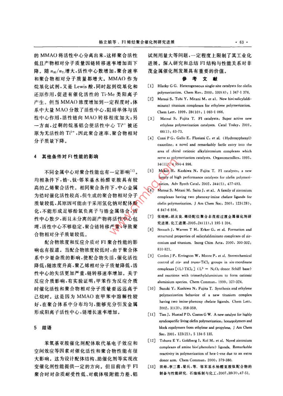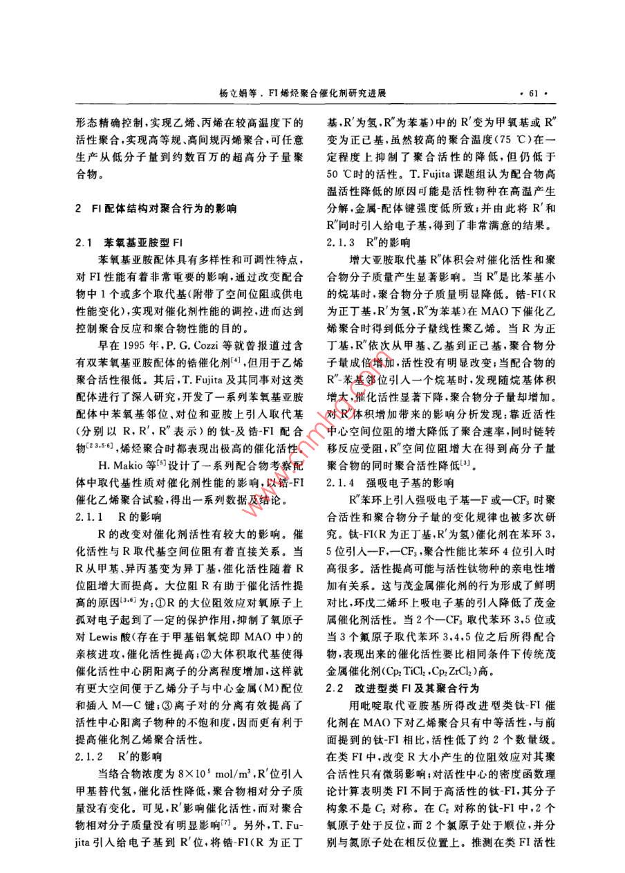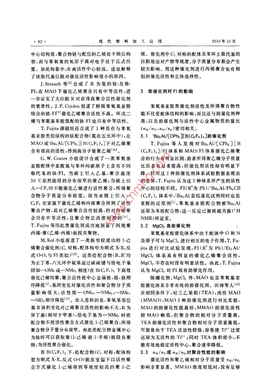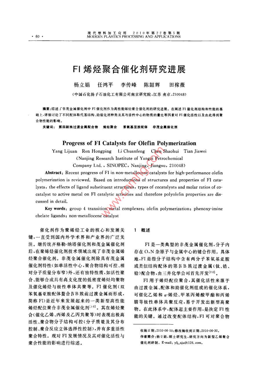 現(xiàn)代塑料加工應(yīng)用2010年第22卷第5期,60●MODERN PILASTICS PR( )CESSING AND APPLICATIONSFI烯烴聚合催化劑研究進(jìn)展楊立娟任鴻平李 傳峰陳韶輝田稼薇(中國石化揚(yáng)子石油化工有限公司南京研究院,江蘇南京,210048)摘要:綜述s非茂金屬催化劑中FI催化劑作為高性能烯烴聚合催化列的研究進(jìn)展。在闡述FI催化劑結(jié)構(gòu)和性能的基礎(chǔ)上.詳細(xì)討論了不同配體取代基結(jié)構(gòu)、助催化劑種類及其與活性中心的物質(zhì)的最比等因素對(duì)FI催化活性以及由此得到聚合物性能的影響。關(guān)鍵詞:第四副族過渡金屬配合物 爝烴聚合苯氧基亞胺配體非茂金屬催化劑Progress of FI Catalysts for Olefin PolymerizationYang Lijuan Ren Hongping Li Chuanfeng Chen Shaohui Tian Jiawei(Nanjing Research Institute of Yangzi PetrochemicalCompany L.td. , SINOPEC, Nanjing, Jiangsu, 210048)Abstract: Recent progress of FI in non- metallocene catalysts for high-performance olefinpolymerization is reviewed. Based on introductions of structures and properties of FI cata-lysts, the effects of ligand substituent structures, types of cocatalysts and molar ratios of co-catalyst to active metal on FI catalytic activities and therefore polyolefin properties are dis-cussed in detail.Key words: group 4 transition metal complexes; olefin polymerization; phenoxy-iminechelate ligands; non- metallocene catalyst催化劑作為聚烯烴工業(yè)的核心和發(fā)展關(guān)1概述鍵,一直受到國內(nèi)外學(xué)術(shù)界和產(chǎn)業(yè)界的廣泛關(guān)注。繼傳統(tǒng)齊格勒-納塔催化劑和茂金屬催化劑FI是一類典型的非茂金屬催化劑,分子內(nèi)后,在聚烯烴催化劑技術(shù)領(lǐng)域出現(xiàn)了非茂金屬烯存在0,N雜原子與金屬中心的鍵合作用。具體烴聚合催化劑。非茂金屬催化劑除具有茂金屬地,FI是指分子結(jié)構(gòu)中含有兩分子苯氧基亞胺催化劑特性(如單活性中心,聚合物結(jié)構(gòu)???、相或類似結(jié)構(gòu)配體的第IVB族過渡金屬(鈦、鋯、對(duì)分子質(zhì)量分布窄)外,還有獨(dú)特性質(zhì),如活性聚鉿)配合物,由三井化學(xué)公司首先開發(fā)[2]。合、能夠合成具有高支化度的低密度烯烴均聚物FI用于烯烴配位聚合,其催化活性來源于及催化烯烴與極性單體共聚等。FI 催化劑(雙由過渡金屬、配體和助催化劑組成的催化體系,苯氧基亞胺配體螯合NB族前過渡金屬而形成,.可催化乙烯和a烯烴、甲基丙烯酸甲酯和丙烯.簡稱FI)是近年來發(fā)展起來的一-類新型高性能腈等極性單體共聚反應(yīng),易于開發(fā)出新型高聚烯烴配位聚合非茂金屬催化劑13]。其在烯烴聚物。在此體系中,配體起主要作用,是決定FI性合(催化乙烯、丙烯及乙丙共聚等)時(shí)表現(xiàn)出極高能的關(guān)鍵。通過改變配體結(jié)構(gòu),FI可對(duì)聚合物活性.聚合物分子結(jié)構(gòu)可控(分子質(zhì)量及其分布控制、聚合反應(yīng)立體選擇性控制),并有多重活性收稿H期:2010-06 10;修改稿收到日期:2010-06-30。聚合特性。現(xiàn)對(duì)FI發(fā)展情況及其對(duì)催化活性與作者簡介:揚(yáng)立娟,碩士研究生.研究方向?yàn)樾滦鸵蚁┚酆暇酆闲阅艿挠绊戇M(jìn)行綜述。催化劑研制。E-mail: yi nju@ 126. com.楊立娟等. FI烯烴聚合催化劑研究進(jìn)展●61●形態(tài)精確控制,實(shí)現(xiàn)乙烯、丙烯在較高溫度下的基,R'為氫,R"為苯基)中的R'變?yōu)榧籽趸騌"活性聚合,實(shí)現(xiàn)高等規(guī)、高間規(guī)丙烯聚合,可任意變?yōu)檎鸦?雖然較高的聚合溫度(75 C)在一生產(chǎn)從低分子量到約數(shù)百萬的超高分子量聚.定程度上抑制了聚合活性的降低,但仍低于合物。50 C時(shí)的活性。T. Fujita課題組認(rèn)為配合物高溫活性降低的原因可能是活性物種在高溫產(chǎn)生2FI配體結(jié)構(gòu)對(duì)聚合行為的影響分解,金屬-配體鍵強(qiáng)度低所致;并由此將R'和R”同時(shí)引人給電子基,得到了非常滿意的結(jié)果。2.1 苯氧基亞胺型FI2.1.3 R"的影響苯氧基業(yè)胺配體具有多樣性和可調(diào)性特點(diǎn),增大亞胺取代基R"體積會(huì)對(duì)催化活性和聚對(duì)FI性能有著非常重要的影響,通過改變配合合物分子質(zhì)量產(chǎn)生顯著影響。當(dāng)R"是比苯基小物中1個(gè)或多個(gè)取代基(附帶了空間位阻或供電的烷基時(shí),聚合物分子質(zhì)量明顯降低。鋯-FI(R性能變化),實(shí)現(xiàn)對(duì)催化劑性能的調(diào)控,進(jìn)而達(dá)到為正丁基,R'為氫,R”為苯基)在MAO下催化乙控制聚合反應(yīng)和聚合物性能的目的。烯聚合時(shí)得到低分子量線性聚乙烯。當(dāng)R為正早在1995年,P. G. Cozzi等就曾報(bào)道過含丁基,R"依次從甲基.乙基到正已基,聚合物分:有雙苯氧基亞胺配體的鋯催化劑(4),但用于乙烯子量成倍增加,活性沒有明顯改變;當(dāng)配合物的聚合活性很低。其后,T. Fujita及其同事對(duì)這類R"苯基鄰位引入一個(gè)烷基時(shí),發(fā)現(xiàn)隨烷基體積配體進(jìn)行了深人研究,開發(fā)了一系列苯氧基亞胺增大,催化活性顯著下降,聚合物分子最卻增加。配體中苯氧基鄰位、對(duì)位和亞胺上引入取代基對(duì)R"體積增加帶來的影響分析發(fā)現(xiàn):靠近活性(分別以R,R',R"表示)的鈦-及鋯-FI配合中心空間位阻的增大降低了聚合速率,同時(shí)鏈轉(zhuǎn).物28.5.6,烯烴聚合時(shí)都表現(xiàn)出極高的催化活性。移反應(yīng)受阻,R"空間位阻增大在得