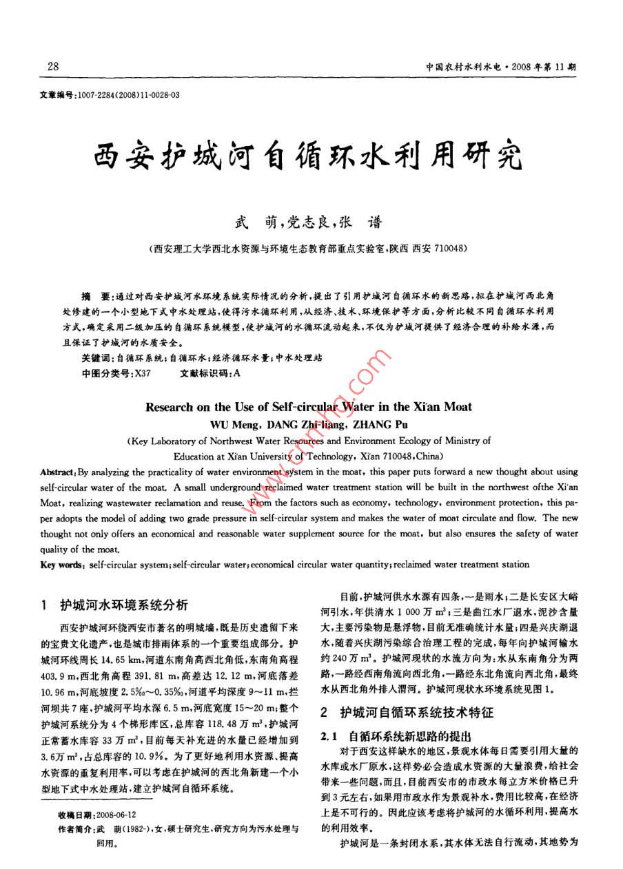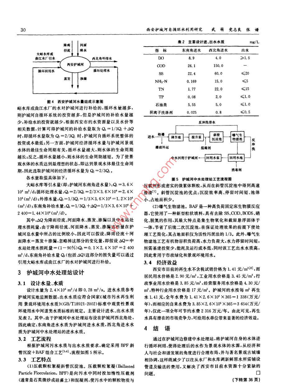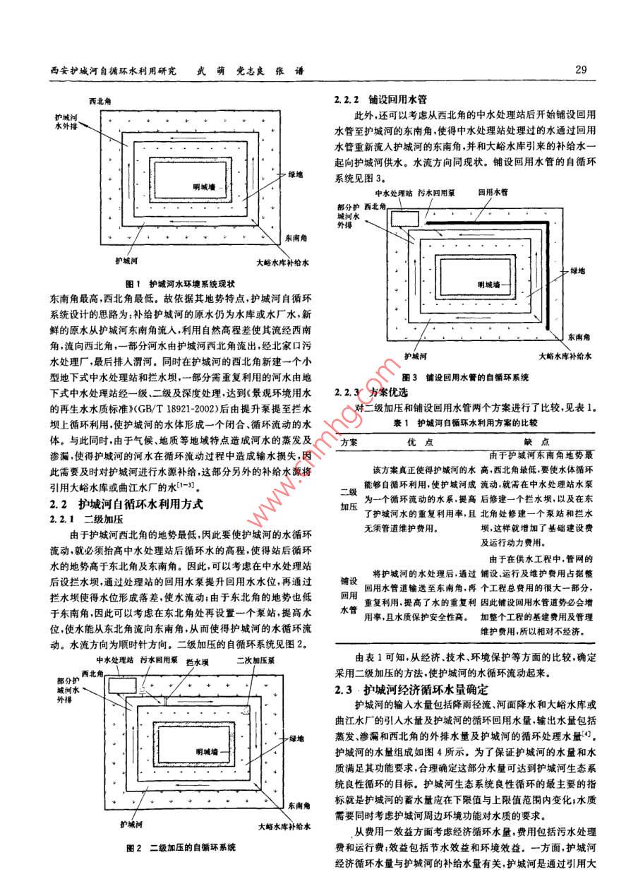 中國農(nóng)村水利水電·2008年第11期文章編號:1007-2284(2008)11-002803西安護城河自循環(huán)水利用研究武萌,黨志良,張譜(西安理工大學(xué)西北水資源與環(huán)境生態(tài)教育部重點實驗室陜西西安710048)擴要:通過對西安護城河水環(huán)境系統(tǒng)實際情況的分析,提出了引用護城河自循環(huán)水的新思路,擬在護城河西北角處修建的一個小型地下式中水處理站使得污水循環(huán)利用,從經(jīng)濟、技術(shù)、環(huán)境保護等方面,分析比較不同自循環(huán)水利用方式,確定采用二級加壓的自循環(huán)系統(tǒng)模型,使護城河的水循環(huán)流動起來,不僅為護城河提供了經(jīng)濟合理的補給水源,而且保證了護城河的水質(zhì)安全。關(guān)鍵詞;自循環(huán)系統(tǒng);自循環(huán)水;經(jīng)濟循環(huán)水量;中水處理站中圖分類號:X37文獻標(biāo)識碼:AResearch on the Use of Self-circular Water in the Xian MoatWU Meng, DANG Zhi-liang, ZHANG Pu(Key Laboratory of Northwest Water Resources and Environment Ecology of Ministry ofEducation at Xian University of Technology, Xian 710048, China)Abstract: By analyzing the practicality of water environment system in the moat, this paper puts forward a new thought aboutelf-circular water of the moat, A small underground reclaimed water treatment station will be built in the northwest oftheMoat, realizing wastewater reclamation and reuse. From the factors such as economy, technology, environment protection, this paper adopts the model of adding two grade pressure in self-circular system and makes the water of moat circulate and flow. The newthought not only offers an economical and reasonable water supplement source for the moat, but also ensures the safety of waterquality of the moat.Key words: self-circular system; self-circular water economical circular water quantity reclaimed water treatment station1護城河水環(huán)境系統(tǒng)分析目前,護城河供水水源有四條,一是雨水;二是長安區(qū)大峪河引水年供清水1000萬m3;三是曲江水廠退水,泥沙含量西安護城河環(huán)繞西安市著名的明城墻既是歷史遺留下來大,主要污染物是懸浮物目前無準(zhǔn)確統(tǒng)計水量;四是興慶湖退的寶貴文化遺產(chǎn)也是城市排雨體系的一個重要組成部分。護水,隨著興慶湖污染綜合治理工程的完成每年向護城河輸水城河環(huán)線周長14.65km,河道東南角高西北角低,東南角高程約240萬m3,護城河現(xiàn)狀的水流方向為:水從東南角分為兩403.9m西北角高程391.81m,高差達(dá)12.12m,河底落差路,一路經(jīng)西南角流向西北角,一路經(jīng)東北角流向西北角,最終10.96m,河底坡度2.5‰~0.35‰河道平均深度9~11m,攔水從西北角外排入渭河。護城河現(xiàn)狀水環(huán)境系統(tǒng)見圖1河壩共7座,護城河平均水深65m,河底寬度15-20m;整個2護城河自循環(huán)系統(tǒng)技術(shù)特征護城河系統(tǒng)分為4個梯形庫區(qū),總庫容118.48萬m3,護城河正常蓄水庫容33萬m3,目前每天補充進的水量已經(jīng)增加到2.1自循環(huán)系統(tǒng)新思路的提出3.6萬m3,占總庫容的10.9%。為了更好地利用水資源提高對于西安這樣缺水的地區(qū),景觀水體每日需要引用大量的水資源的重復(fù)利用率,可以考慮在護城河的西北角新建一個小水庫或水廠原水這樣勢必會造成水資源的大量浪費給社會型地下式中水處理站,建立護城河自循環(huán)系統(tǒng)帶來一些問題,而且,目前西安市的市政水每立方米價格已升到3元左右如果用市政水作為景觀補水費用比較高在經(jīng)濟收稿日期:2008-06-12上是不可行的。因此應(yīng)該考慮將護城河的水循環(huán)利用提高水作者簡介:武萌(1982),女,碩士研究生研究方向為污水處理與的利用效率回用護城河是一條封閉水系,其水體無法自行流動,其地勢為西安護城河自循環(huán)水利用研究武黨志良張西北角2.2.2鋪設(shè)回用水管此外還可以考慮從西北角的中水處理站后開始鋪設(shè)回用水外排水管至護城河的東南角,使得中水處理站處理過的水通過回用水管重新流入護城河的東南角并和大峪水庫引來的補給水起向護城河供水。水流方向同現(xiàn)狀。鋪設(shè)回用水管的自循環(huán)綠地系統(tǒng)見圖3。中水處理站污水網(wǎng)用泵回用水管部分護西北角大略水庫補給水圖1護城河水環(huán)境系統(tǒng)現(xiàn)狀明城墻東南角最高,西北角最低。故依據(jù)其地勢特點,護城河自循環(huán)系統(tǒng)設(shè)計的思路為:補給護城河的原水仍為水庫或水廠水,新鮮的原水從護城河?xùn)|南角流入,利用自然高程差使其流經(jīng)西南東南角角流向西北角,一部分河水由護城河西北角流出經(jīng)北家口污水處理廠,最后排入渭河。同時在護城河的西北角新建一個小護城河大略水庫補給水型地下式中水處理站和攔水壩,一部分需重復(fù)利用的河水由地圖3鋪設(shè)回用水管的自循環(huán)系統(tǒng)下式中水處理站經(jīng)一級、二級及深度處理達(dá)到《景觀環(huán)境用水2.23方案優(yōu)選的再生水水質(zhì)標(biāo)準(zhǔn)》GB/T18921-2002)后由提升泵提至攔水對二級加壓和鋪設(shè)回用水管兩個方案進行了比較見表1壩上循環(huán)利用,使護城河的水體形成一個閉合、循環(huán)流動的水表1護城河自循環(huán)水利用方案的比較體。與此同時由于氣候、地質(zhì)等地域特點造成河水的蒸發(fā)及方案滲漏,使得護城河的河水在循環(huán)流動過程中造成輸水損失,因由于護城河?xùn)|南