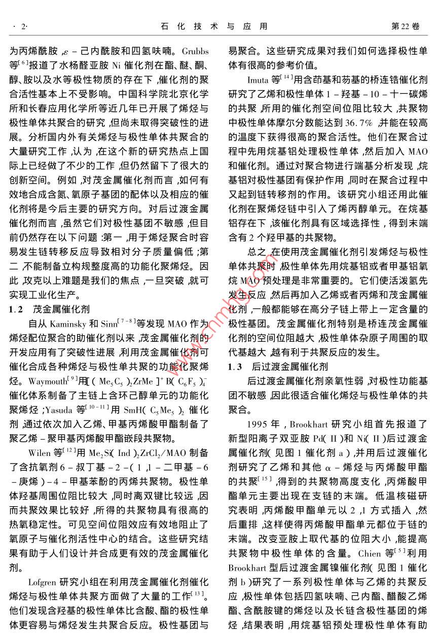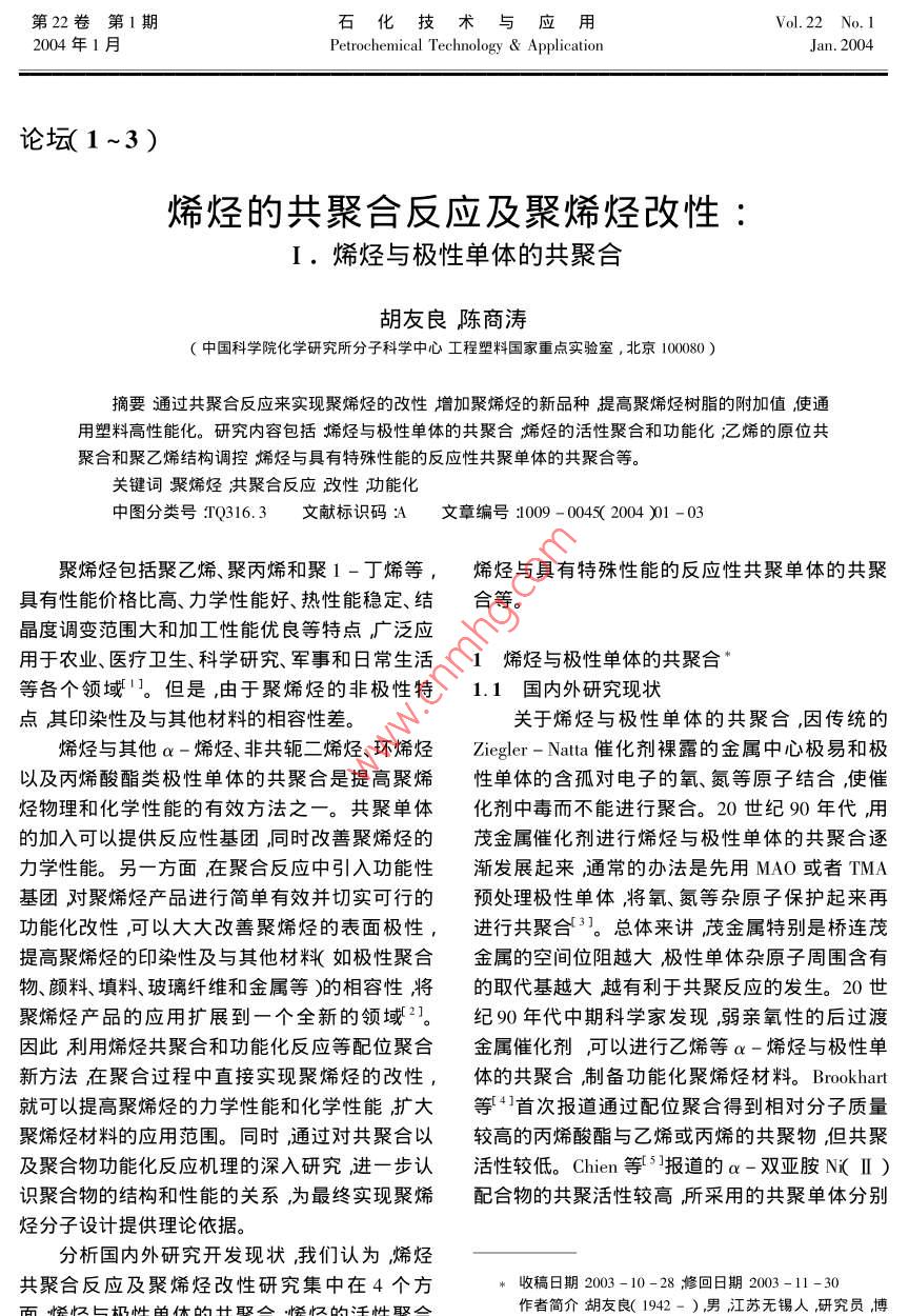 第22卷第1期石化技術(shù)與應(yīng)用Vol.22 No. 12004年1月Petrochemical Technology & ApplicationJan.2004論壇( 1~3 )烯烴的共聚合反應(yīng)及聚烯烴改性:I.烯烴與極性單體的共聚合胡友良陳商濤(中國(guó)科學(xué)院化學(xué)研究所分子科學(xué)中心工程塑料國(guó)家重點(diǎn)實(shí)驗(yàn)室, 北京100080 )摘要通過(guò)共聚合反應(yīng)來(lái)實(shí)現(xiàn)聚烯烴的改性增加聚烯烴的新品種提高聚烯烴樹(shù)脂的附加值使通用塑料高性能化。研究?jī)?nèi)容包括烯烴與極性單體的共聚合;烯烴的活性聚合和功能化;乙烯的原位共聚合和聚乙烯結(jié)構(gòu)調(diào)控烯烴與具有特殊性能的反應(yīng)性共聚單體的共聚合等。關(guān)鍵詞聚烯烴共聚合反應(yīng)改性功能化中圖分類(lèi)號(hào):TQ316.3文獻(xiàn)標(biāo)識(shí)碼A文章編號(hào):1009 - 0045( 2004 )01 -03聚烯烴包括聚乙烯、聚丙烯和聚1 -丁烯等,烯烴與具有特殊性能的反應(yīng)性共聚單體的共聚具有性能價(jià)格比高、力學(xué)性能好、熱性能穩(wěn)定、結(jié)合等。晶度調(diào)變范圍大和加工性能優(yōu)良等特點(diǎn)廣泛應(yīng)用于農(nóng)業(yè)、醫(yī)療衛(wèi)生、科學(xué)研究、軍事和日常生活1烯烴與極性單體的共聚合等各個(gè)領(lǐng)域'。但是,由于聚烯烴的非極性特1.1 國(guó)內(nèi)外研究現(xiàn)狀點(diǎn)其印染性及與其他材料的相容性差。關(guān)于烯烴與極性單體的共聚合,因傳統(tǒng)的烯烴與其他a -烯烴、非共軛二烯烴、環(huán)烯烴Ziegler-Natta催化劑裸露的金屬中心極易和極以及丙烯酸酯類(lèi)極性單體的共聚合是提高聚烯性單體的含孤對(duì)電子的氧、氮等原子結(jié)合,使催烴物理和化學(xué)性能的有效方法之一。共聚單體化劑中毒而不能進(jìn)行聚合。20世紀(jì)90年代用的加入可以提供反應(yīng)性基團(tuán),同時(shí)改善聚烯烴的茂金屬催化劑進(jìn)行烯烴與極性單體的共聚合逐力學(xué)性能。另一方面在聚合反應(yīng)中引入功能性漸發(fā)展起來(lái)通常的辦法是先用MAO或者TMA基團(tuán)對(duì)聚烯烴產(chǎn)品進(jìn)行簡(jiǎn)單有效并切實(shí)可行的預(yù)處理極性單體將氧、氮等雜原子保護(hù)起來(lái)再功能化改性,可以大大改善聚烯烴的表面極性,進(jìn)行共聚合[3]??傮w來(lái)講茂金屬特別是橋連茂提高聚烯烴的印染性及與其他材料(如極性聚合金屬的空間位阻越大極性單體雜原子周?chē)形?、顏料、填料、玻璃纖維和金屬等)的相容性將的取代基越大越有利于共聚反應(yīng)的發(fā)生。20世聚烯烴產(chǎn)品的應(yīng)用擴(kuò)展到一個(gè)全新的領(lǐng)域2]。紀(jì)90年代中期科學(xué)家發(fā)現(xiàn),弱親氧性的后過(guò)渡因此利用烯烴共聚合和功能化反應(yīng)等配位聚合金屬催化劑,可以進(jìn)行乙烯等 a-烯烴與極性單新方法在聚合過(guò)程中直接實(shí)現(xiàn)聚烯烴的改性,體的共聚合,制備功能化聚烯烴材料。Brookhart就可以提高聚烯烴的力學(xué)性能和化學(xué)性能擴(kuò)大等4]首次報(bào)道通過(guò)配位聚合得到相對(duì)分子質(zhì)量聚烯烴材料的應(yīng)用范圍。同時(shí)通過(guò)對(duì)共聚合以較高的丙烯酸酯與乙烯或丙烯的共聚物,但共聚及聚合物功能化反應(yīng)機(jī)理的深入研究,進(jìn)一步認(rèn)活性較低。Chien 等51]報(bào)道的a-雙亞胺Ni( II )識(shí)聚合物的結(jié)構(gòu)和性能的關(guān)系為最終實(shí)現(xiàn)聚烯配合物的共聚活性較高所采用的共聚單體分別烴分子設(shè)計(jì)提供理論依據(jù)。分析國(guó)內(nèi)外研究開(kāi)發(fā)現(xiàn)狀,我們認(rèn)為烯烴共聚合反應(yīng)及聚烯烴改性研究集中在4個(gè)方收稿日期2003-10-28修回日期2003-11-30面烯烴與極性單體的共聚合烯烴的活性聚合作者簡(jiǎn)介胡友良( 1942- ),男江蘇無(wú)錫人研究員,博和功i能化萬(wàn)方帶峒原位共聚和聚乙烯結(jié)構(gòu)調(diào)控;士生導(dǎo)師從事烯烴催化劑、聚合反應(yīng)及聚烯烴結(jié)構(gòu)性能研究30多年發(fā)表論文120多篇申請(qǐng)專(zhuān)利30多項(xiàng)。石化技術(shù)與應(yīng)用第22卷為丙烯酰胺;&-己內(nèi)酰胺和四氫呋喃。Grubbs易聚合。這些研究成果對(duì)我們?nèi)绾芜x擇極性單等6]報(bào)道了水楊醛亞胺Ni催化劑在酯、醚、酮、體有很高的參考價(jià)值。醇、胺以及水等極性物質(zhì)的存在下,催化劑的聚Imuta等14'用含茚基和芴基的橋連鋯催化劑合活性基本上不受影響。中國(guó)科學(xué)院北京化學(xué)研究了乙烯和極性單體1 -羥基-10-十-碳烯所和長(zhǎng)春應(yīng)用化學(xué)所等近幾年已開(kāi)展了烯烴與的共聚所用的催化劑空間位阻比較大,共聚物極性單體共聚合的研究但尚未取得突破性的進(jìn)中極性單體摩爾分?jǐn)?shù)能達(dá)到36.7%并能在較高展。分析國(guó)內(nèi)外有關(guān)烯烴與極性單體共聚合的的溫度下獲得很高的聚合活性。他們?cè)诰酆线^(guò)大量研究工作,認(rèn)為,在這個(gè)新的研究熱點(diǎn).上國(guó)程中先用烷基鋁處理極性單體然后加入MAO際上已經(jīng)做了不少的工作但仍然留下了很大的和催化劑。通過(guò)對(duì)聚合物進(jìn)行端基分析發(fā)現(xiàn)烷.創(chuàng)新空間。例如,對(duì) 茂金屬催化劑而言,如何有基鋁對(duì)極性基團(tuán)有保護(hù)作用同時(shí)在聚合過(guò)程