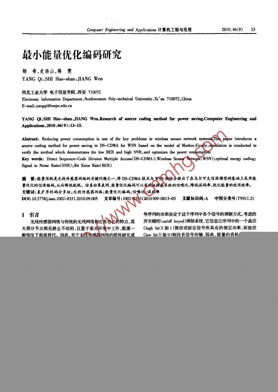 Computer Engineering and Aplicaions計(jì)算機(jī)工程與應(yīng)用2010,46(9)_ 13最小能量?jī)?yōu)化編碼研究楊奇,史浩山,蔣 雯YANG Qi,SHI Hao- shan,JIANG Wen西北工業(yè)大學(xué)電子信息學(xué)院,西安710072Elctronic Infornation Department,Northwestem Poly- technical Univernity ,Xi' an 710072,ChinaE- mail:yangqi@nwpu.edu.cnYANG QI,SHI Hao shan,JIANG Wen,Research of source coding method for power saving.Computer Engineering andApplications,2010,46(9):13-15.Abstract: Reducing power consumption is one of the key problems in wireless sensor network systems.This paper introduces asource coding method for power saving in DS- -CDMA for WSN based on the model of Markov.Finally , simulation is conducted toverify the method which demonstrates the low BER and high SNR, and optimizes the power consumption.Key words: Direct Sequence -Code Division Muliple Acese(DS- CDMA); Wireles Sensor Network( WSN);optimal energy coding;Signal to Noise Ratio(SNR);Bit Error Rate( BER)摘要:能量消耗是無(wú)線傳感器網(wǎng)絡(luò)的關(guān)鍵問(wèn)題之 一,將DS CDMA技術(shù)與WSN相結(jié)合提出了在馬爾可夫信源模型的基礎(chǔ)上采用能量?jī)?yōu)化的信源編碼,從而降低能耗。仿真結(jié)果表明,能量?jī)?yōu)化編碼可以有效地提高系統(tǒng)的信噪比、降低誤碼率、優(yōu)化能量的使用效率。關(guān)鍵詞:直擴(kuò)序列碼分多址;無(wú)線傳感器網(wǎng)絡(luò);能量?jī)?yōu)化編碼;信噪比;誤碼率DOI: 1078jis.100208331.2010.09.005文章編 號(hào): 1002- 8331(2010)09 -0013- 03文獻(xiàn)標(biāo)識(shí)碼:A 中圖分類號(hào):TN911.211引言號(hào)序列的功率決定于這個(gè)序列中各個(gè)信號(hào)的調(diào)制方式。考慮的無(wú)線傳感器網(wǎng)絡(luò)與傳統(tǒng)的無(wú)線網(wǎng)絡(luò)相比有自己的特點(diǎn),其開(kāi)關(guān)鍵控(on/off keyed)調(diào)制系統(tǒng),它信息位序列中的一個(gè)高位大部分節(jié)點(diǎn)都是靜止不動(dòng)的,且置于惡劣環(huán)境中工作,能源一(high bit)( 如1)預(yù)設(shè)成固定信號(hào)所具有的預(yù)定功率,而低位般情況下很難替代。因此,關(guān)于無(wú)線傳感器網(wǎng)絡(luò)的能耗研究成(low bit)( 如0)則沒(méi)有信號(hào)傳輸.因此,能量的消耗僅僅在高為核心問(wèn)題"。近年,在節(jié)能路由協(xié)議上的研究中-取得了一定的位的傳輸時(shí)產(chǎn)生,而傳輸?shù)臀粍t不消耗能量。 - 個(gè)開(kāi)關(guān)鍵控調(diào)成果,使得無(wú)線傳感器網(wǎng)絡(luò)的能量資源得到了很好的利用,文制系統(tǒng)的設(shè)計(jì)中,在評(píng)估能量消耗時(shí),因?yàn)楦呶坏闹芷跒跬ǔ+I(xiàn)[41在優(yōu)化幀結(jié)構(gòu)的基礎(chǔ)上采用分布式信源編碼可以提高無(wú). 都比信號(hào)的周期,大很多,所以產(chǎn)生發(fā)射信號(hào)的過(guò)渡時(shí)間可以線傳感器網(wǎng)絡(luò)的效率,從而達(dá)到節(jié)能的日的。將從信源編碼的忽略不計(jì)。因此,射頻發(fā)射器的總能耗就只有一個(gè)方面,Es,同角度出發(fā),提出了一種能量?jī)?yōu)化的信源編碼(Optimal Energy 高位的總持續(xù)時(shí)間成比例關(guān)系, 即高位的總數(shù)量nu乘以一位coding )算法,對(duì)節(jié)點(diǎn)間傳輸?shù)男盘?hào)序列進(jìn)行優(yōu)化,從而提高了的周期ts,Enc=C.tnmw,這里C是能耗系數(shù)啊。假設(shè)M是一秒鐘信噪比,降低誤碼奉。仿真結(jié)果表明,該算法大大降低信息傳輸發(fā) 送信息的數(shù)量,n是每個(gè)碼字中高位的平均數(shù)量。每個(gè)信息的誤碼率,提高了信噪比,充分利用現(xiàn)有能量資源,延長(zhǎng)了無(wú)線的平均能耗 C可以寫(xiě)為:傳感器網(wǎng)絡(luò)的生命周期。c=Ew Cnm(1)2能最優(yōu)化編碼這個(gè)等式表明發(fā)射信號(hào)序列的功率同它們所描述的信源信息無(wú)線傳感器節(jié)點(diǎn)的功能是將采集的一組信源信息序列發(fā)之間的關(guān)系。送給另一個(gè)相鄰的節(jié)點(diǎn)。這些信源信息已經(jīng)用射頻發(fā)射器通過(guò)式( 1)提供了多個(gè)能耗最優(yōu)化的路徑。節(jié)約能量可以通過(guò)-個(gè)載波信號(hào)序列進(jìn)行了調(diào)制。每-個(gè)特定的信號(hào)序列(碼字)以下方法實(shí)現(xiàn):(1)改善發(fā)射線路來(lái)減小 C;(2)堿小高位周期對(duì)應(yīng)一個(gè)特定的信源信息。無(wú)線傳感器網(wǎng)絡(luò)節(jié)點(diǎn)的能量消耗主a;(3)堿小每 個(gè)碼字的高位平均數(shù)量n。前兩個(gè)是由發(fā)射器和要來(lái)源于這些信號(hào)序列包含“1”的位數(shù)。信道的物理?xiàng)l件所決定的,因此需要對(duì)物理層進(jìn)行改進(jìn)。第三為了能夠說(shuō)明能量消耗最優(yōu)化的問(wèn)題,需要理解發(fā)送信號(hào)個(gè),是更大限度地提高能量序列的功率同信號(hào)序列所描述的信源信息之間的關(guān)系。發(fā)送信效率。中國(guó)煤化工基金項(xiàng)目:國(guó)家自然科學(xué)基金(the National Natural Seience Foundation of China under 0IYHCNMH((0800,作者簡(jiǎn)介:楊奇( 1969-).男.博士.講師,主要從事多載波適信,信號(hào)空間譜估計(jì)方面的研究;史浩山( 1946-),男教授,博導(dǎo),主要從事無(wú)線傳感器網(wǎng)絡(luò)方面的研究;蔣雯( 1974-),女,博土,副教授,主要從事信息融合,智能信息處理方面的研究工作。收稿日期:2009-11-20修回日期:2010-01-2614 2010, 46(9)Computer Eninering and Applications計(jì)算機(jī)工程與應(yīng)用現(xiàn