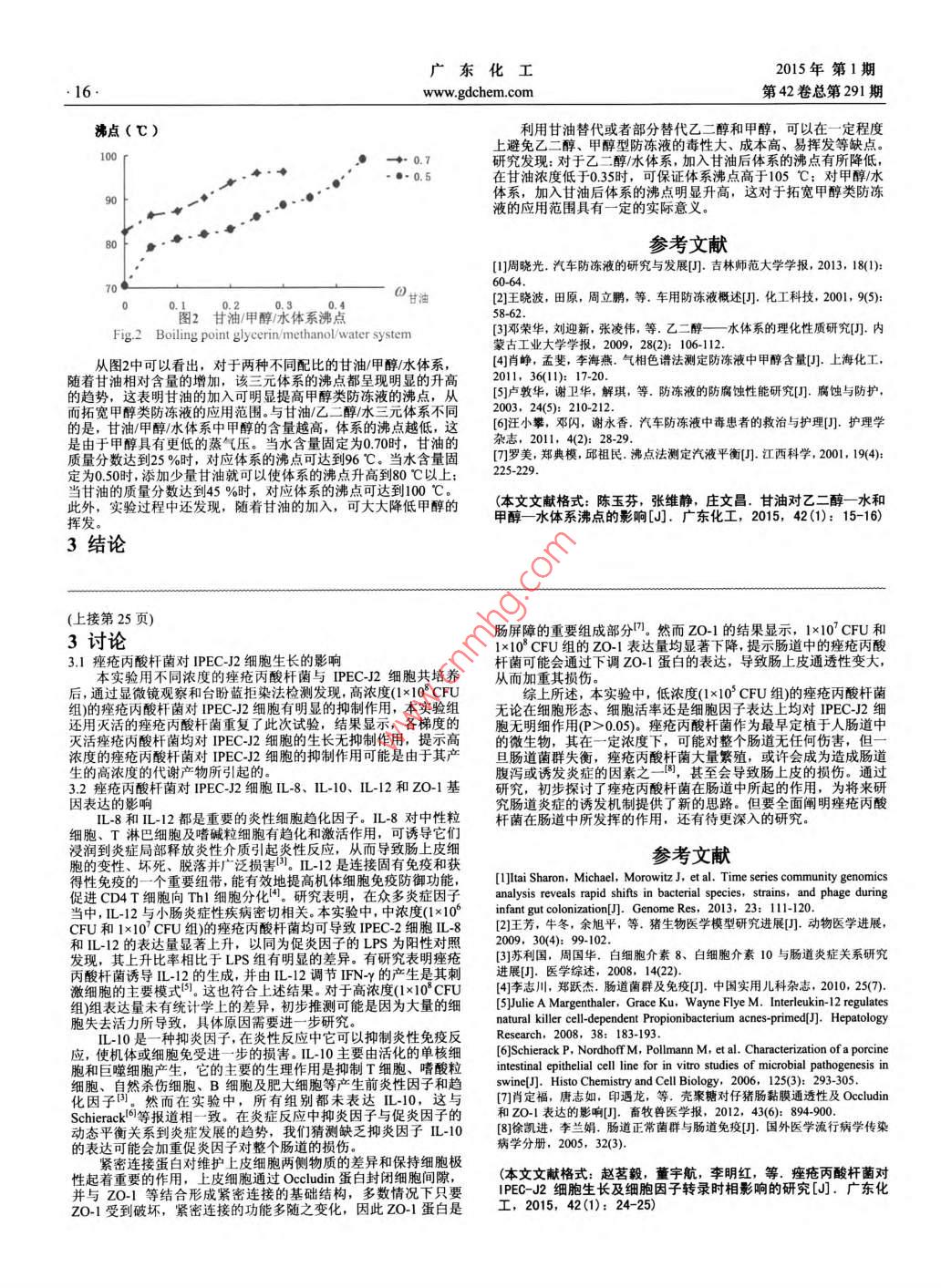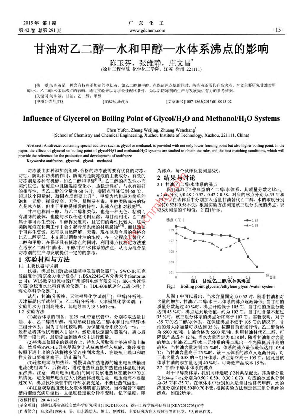 2015年第1期廣東化工第42卷總第291期www.gdchem.com15甘油對乙二醇一水和甲醇一水體系沸點的影響陳玉芬,張維靜,莊文昌(徐州工程學院化學化工學院,江蘇徐州22111)[摘要]防凍液是一種含有特殊添加劑的冷卻液,如乙二醇和甲醇。在保證冰點低的冋時,防凍液還需具有高沸點。本文主要硏究甘油對甲醇/水、乙二醇/水體系沸點的影響,通過實驗來以尋求最佳配比條件,為以后防凍劑的生產(chǎn)與發(fā)展提供有力的參考依據(jù)[關鍵詞]防凍液;甘油;乙二醇:甲醇[中圖分類號TQ[文獻標識碼]A[文章編號]007-1865(2015)01-001502Influence of Glycerol on Boiling Point of Glycol/H2O and Methanol/H2O SystemsChen Yufen, Zhang Weijing, ZI(School of Chemistry and Chemical Engineering, Xuzhou Insof TecXuzhou, 221111,Abstract: Antifreeze, containing special additives such as glycol or methanol, is provided with not only lower freezing point but also higher boiling point. In thepaper, the effects of glycerol on boiling point of glycolH2O and methanol/H2O systems are studied to obtain the rules and the best matching conditions, which willprovide the reference for the production and development of antifreeze.Keywords: antifreeze: glycerol: glycol: methanol防凍液由多種添加劑組成,合格的防凍液需要有優(yōu)良的防凍、為沸點。每個試樣反復測量6次防蝕、防垢和防沸的作用,防凍劑是防凍液的主要成分,有效的2結果與討論蒸汽壓低,粘度適中且隨溫度變化小,熱穩(wěn)定性好,與水有很好21甘油/乙二醇/水體系的沸點的相容性。當乙二醇的含量為68%時,凝固點可降低到68℃我們選取了2種典型的乙二醇/水體系,其質(zhì)量分數(shù)之比oc超過這個限量時,凝固點反而要上升的。甲醇為結構最為簡單的-:0分別為048:052.042:058,對應的冰點分別為35C和飽和一元醇,揮發(fā)度高、無色、易燃及有毒。甲醇類防凍液的特點是冰點低,但由于甲醇易揮發(fā)的特性,其沸點也相對較低保持0.52和0.58不變。根據(jù)實驗方法測定該三組分系統(tǒng)的沸點,求甘油也稱丙三醇,與乙二醇相類似,也是一種無色、粘稠而取6次測量的平均值,如圖1所示有甜味的液體,也能與水以任意比例互溶。與甘油屬于非可再生資源,甲醇揮發(fā)度高,且它們的毒性比較大,這兩沸點(℃)類防凍液在長期工作中會引起冷卻系統(tǒng)的材質(zhì)腐蝕6。而甘油屬于可再生資源,還可以自然降解,無毒,現(xiàn)在以及今后的價格會比乙二醇更低。本文通過調(diào)整甘油的濃度,在一定程度上替代乙二醇和甲醇,在保證具有低冰點的同時,利用沸點儀測定方法重點考察乙二醇/甘油/水、甲醇/甘油/水體系的沸點,從而為混合型防凍劑的生產(chǎn)與發(fā)展提供一定的的參考。1實驗材料與方法1.1主要儀器與試劑儀器:沸點儀套(鹽城建的A24SCNW分析天平 (Sartorius發(fā)玻璃儀器廠);Swc-lc貝克曼溫度計(南京桑力電子設備廠)公司):WLS數(shù)字恒流電源(廣州郵科電源有限公司):SK-1快速混°圖n甘油乙二醇冰體系沸點勻器(金壇市水北科普實驗儀器廠):TDL60B低速臺式離心機(上Fig. I Boiling point glycerin/ethylene glycol/water system海安亭科學儀器廠)試劑:甘油(分析純,天津福晨化學試劑廠):甲醇(分析純從圖1中可以看出,當水含量固定為0.52時,隨著甘油相對天津福晨化學試劑廠):乙二醇(分析純,天津福晨化學試劑廠):含量的增加,甘油/乙二醇/水三元體系的沸點逐漸降低:當甘油的實驗用水為自制高純水,其電導率為18.3MQcm。質(zhì)量分數(shù)超過40%時,沸點開始低于105℃:當甘油的質(zhì)量分數(shù)1.2實驗方法達到45%時,沸點達到最低值,約為102℃;當甘油含量不超過(1)混合體系的制備:在25mL帶塞試管中,分別稱取適量甘油、水、乙二醇或甲醇,混勻形成甘油/乙二醇水和甘油/甲醇/水35℃的乙二醇/水體系,在保證沸點不低于105℃的情況下,甘油的最大添加量可以達到35%。按照目前市場行情,乙二醇價格般都是將其他試劑倒入甘油中,然后用快速混勻器混勻,離心后為6500元/噸,甘油價格為5500元噸,利用甘油替代乙二醇,可最后添加到沸點儀中進行測量。降低產(chǎn)品成本12%當水含量固定為0.58時,隨著甘油相對含量(2)將沸點儀固定的鐵架臺上,待加入所取混合溶液后蓋上瓶的的增加,甘油/乙二醇/水三元體系的沸點現(xiàn)出一個先降低后升高的塞,然后將SwC-lc貝克曼溫度計從瓶塞處插入瓶底,將冷凝管趨勢:當甘油含量達到25%時,體系的沸點最低最低達到1054按照下進上出的方法將橡皮管連接到水龍頭,在燒瓶上端口和取℃:當甘油含量高于25%時,該三元體系的沸點又逐漸升高。對樣支管口要塞緊塞子,防止漏氣。于水含量為0.58的三組分體系,沸點始終高于105℃,因此當該(3)連接電源與加熱絲,慢慢調(diào)高加熱電源的輸出電壓或輸出體系甘油的添加量達到40%時,可降低產(chǎn)品成本15%電流(先粗調(diào)節(jié)、后微調(diào)),通過電熱絲直接加熱使液體溫度升高22甘油/甲醇/水體系的沸點對于甲醇類體系,我們同樣選取了2種典型配比,其質(zhì)量分數(shù)熱情況,避免加熱電流過大引燃液體出現(xiàn)危險:電壓最高不要超之比過20V:沸點儀冷凝管中的冷卻水要充足,不要讓蒸氣溢出為-35℃和-25℃。在該體系中分別加入適量甘油替代甲醇,水的(4注意觀察溫度變化及液體沸騰前后情況。當冷凝管下端凹濃度分別保持0.50和0.70不變,根據(jù)實驗方法測定該三組分系統(tǒng)的槽內(nèi)餾液充滿后溢出,且溫度穩(wěn)定數(shù)分鐘不變時